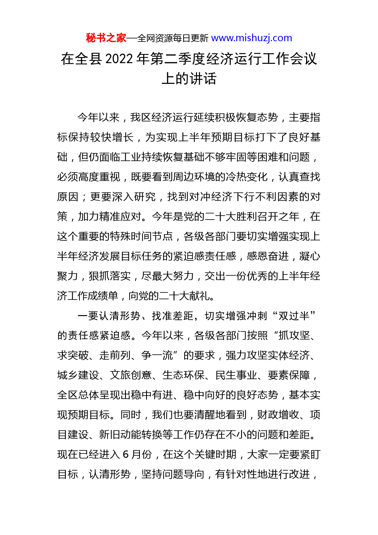 秘书之家—全网资源每日更新www.mishuzj.com在全县2022年第二季度经济运行工作会议上的讲话今年以来,我区经济运行延续积极恢复态势,主要指标保持较快增长,为实现上半年预期目标打下了良好基础,但仍面临工业持续恢复基础不够牢固等困难和问题,必须高度重视,既要看到周边环境的冷热变化,认真查找原因;更要深入研究,找到对冲经济下行不利因素的对策,加力精准应对。今年是党的二十大胜利召开之年,在这个重要的特殊时间节点,各级各部门要切实增强实现上半年经济发展目标任务的紧迫感责任感,感恩奋进,凝心聚力,狠抓落实,尽最大努力,交出一份优秀的上半年经济工作成绩单,向党的二十大献礼。一要认清形势、找准差距,切实增强冲刺“双过半”的责任感紧迫感。今年以来,各级各部门按照“抓攻坚、求突破、走前列、争一流”的要求,强力攻坚实体经济、城乡建设、文旅创意、生态环保、民生事业、要素保障,全区总体呈现出稳中有进、稳中向好的良好态势,基本实现预期目标。同时,我们也要清醒地看到,财政增收、项目建设、新旧动能转换等工作仍存在不小的问题和差距。现在已经进入6月份,在这个关键时期,大家一定要紧盯目标,认清形势,坚持问题导向,有针对性地进行改进,秘书之家—全网资源每日更新www.mishuzj.com确保圆满完成上半年各项工作任务。二要坚定信心、迎难而上,全力冲刺“双过半”。当前已经到了冲刺“双过半”的关键时刻,全区上下要立即进入冲刺状态,抓紧来一次“回头看”,逐一对照各项指标,认真进行自评自查,建立一个明白账,制定一个详细清单,逐一研究对策,精准发力,真抓实干,真正做到“一天当成两天干”,确保快见成效。要全力攻坚经济运行。加强政策学习研判,特别对新旧动能转换、“四新”企业等,要学习请教,学懂弄通,全面掌握我区真实情况,找实找准深层次原因,大力发展“四新”经济,尽快扭转被动局面;做到应统尽统,做好规上企业申报,新上工程、项目纳统,公司、商场、商铺的统计工作;做到应收尽收,促进税收依法均衡入库,着力挖掘增收潜力,切实堵塞征管漏洞,确保非税收入入库;强化对上争取、对下指导,最大限度争取上级支持理解,及时帮助解决镇街困难问题;切实发挥督导考核的“指挥棒”“风向标”作用,对市考区指标完成情况实行周调度、月通报、季点评制度,严格做到真督实查。要全力攻坚重大项目建设。坚持“项目为王”,抓住机遇,加快进度,推动各类重大项目快速开工建设、投产见效。严格落实挂图作战度,认真落实“蓝黄红”三色管理办法,按照“开工项目抓进度、前期项目抓开工、在谈项目抓落地”的要求,对照投资计秘书之家—全网资源每日更新www.mishuzj.com划,研究具体措施,压实包保责任,形成攻坚合力,确保完成投资计划;全力拼抢大项目,制定近期有望签约、已签约未落地、下半年能够落地项目的“三张清单”,并全部建立工作台账,下大气力攻坚突破,着力引进一批牵动全局的大项目、好项目;着力建强平台载体,突出抓好开发区、运河新城,发挥项目建设龙头带动作用,快速打造项目聚集效应,全力打造全区经济发展、城市建设的桥头堡。要全力攻坚生态环保建设。各级各部门要以高度的政治敏锐性,坚决克服松懈懈怠和厌战情绪,统筹好抓环保与抓发展的关系,坚持高标准、严要求,踏踏实实、扎扎实实做好生态环保各项工作。要持续做好信访稳定工作。各级各部门要进一步坚定信心决心、强化责任担当,增强“四个意识”,牢固树立“大维稳、大平安”理念,坚决克服松口气、歇歇脚的懈怠情绪和松懈思想,再接再厉、持之以恒打好维护稳定攻坚战,为全区改革发展创造安全稳定的社会环境。三要夯实责任、加压奋进,确保各项工作落到实处。完成半年各项任务目标、实现争先进位,关键靠落实、关键靠实干、关键靠大家齐心协力。距离半年时间节点,只有25天的时间了,压力很大、挑战很多,需要我们坚定敢打必胜的信心、鼓起攻坚克难的勇气、发扬务实实干的作风,切实增强责任担当,强化执行效率,主动对接,狠抓秘书之家—全网资源每日更新www.mishuzj.com落实,确保全面完成“双过半”任务。要强化责任担当,进一步强化责任意识,做到一级抓一级、一级带一级,把压力动力层层传递,务必到位;要强化执行效能,牢固树立“效率意识”,一切立足于又好又快,做到问题快解决、工程快上马、工作快推进。要强化督导检查,对重点工程项目全部实行写实性督查和“蓝黄红”三色管理,以强有力的督查转作风、抓落实、促发展,确保各项决策部署不折不扣落到实处。要强化考核奖惩,坚持为担当者担当、为负责者负责的鲜明导向,切实加大对干部的保护和激励力度,通过重奖重罚,真正在全区形成干事创业的鲜明导向,真正掀起干事创业的热潮,确保全面实现时间过半、任务过半,为完成全年任务奠定坚实基础。