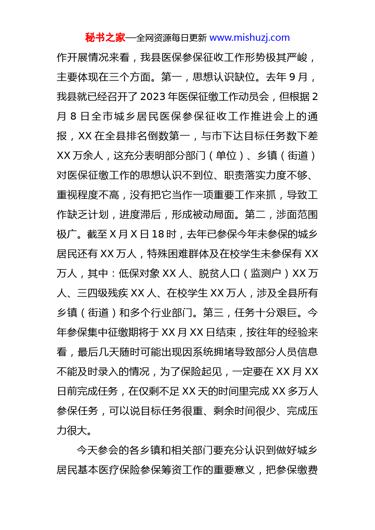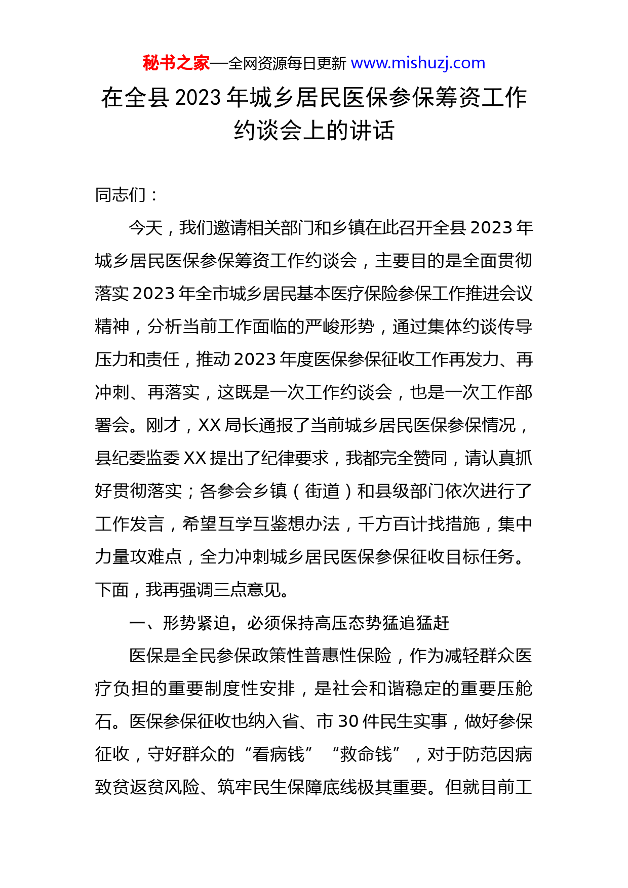 秘书之家—全网资源每日更新www.mishuzj.com在全县2023年城乡居民医保参保筹资工作约谈会上的讲话同志们:今天,我们邀请相关部门和乡镇在此召开全县2023年城乡居民医保参保筹资工作约谈会,主要目的是全面贯彻落实2023年全市城乡居民基本医疗保险参保工作推进会议精神,分析当前工作面临的严峻形势,通过集体约谈传导压力和责任,推动2023年度医保参保征收工作再发力、再冲刺、再落实,这既是一次工作约谈会,也是一次工作部署会。刚才,XX局长通报了当前城乡居民医保参保情况,县纪委监委XX提出了纪律要求,我都完全赞同,请认真抓好贯彻落实;各参会乡镇(街道)和县级部门依次进行了工作发言,希望互学互鉴想办法,千方百计找措施,集中力量攻难点,全力冲刺城乡居民医保参保征收目标任务。下面,我再强调三点意见。一、形势紧迫,必须保持高压态势猛追猛赶医保是全民参保政策性普惠性保险,作为减轻群众医疗负担的重要制度性安排,是社会和谐稳定的重要压舱石。医保参保征收也纳入省、市30件民生实事,做好参保征收,守好群众的“看病钱”“救命钱”,对于防范因病致贫返贫风险、筑牢民生保障底线极其重要。但就目前工秘书之家—全网资源每日更新www.mishuzj.com作开展情况来看,我县医保参保征收工作形势极其严峻,主要体现在三个方面。第一,思想认识缺位。去年9月,我县就已经召开了2023年医保征缴工作动员会,但根据2月8日全市城乡居民医保参保征收工作推进会上的通报,XX在全县排名倒数第一,与市下达目标任务数下差XX万余人,这充分表明部分部门(单位)、乡镇(街道)对医保征缴工作的思想认识不到位、职责落实力度不够、重视程度不高,没有把它当作一项重要工作来抓,导致工作缺乏计划,进度滞后,形成被动局面。第二,涉面范围极广。截至X月X日18时,去年已参保今年未参保的城乡居民还有XX万人,特殊困难群体及在校学生未参保有XX万人,其中:低保对象XX人、脱贫人口(监测户)XX万人、三四级残疾XX人、在校学生XX万人,涉及全县所有乡镇(街道)和多个行业部门。第三,任务十分艰巨。今年参保集中征缴期将于XX月XX日结束,按往年的经验来看,最后几天随时可能出现因系统拥堵导致部分人员信息不能及时录入的情况,为了保险起见,一定要在XX月XX日前完成任务,在仅剩不足XX天的时间里完成XX多万人参保任务,可以说目标任务很重、剩余时间很少、完成压力很大。今天参会的各乡镇和相关部门要充分认识到做好城乡居民基本医疗保险参保筹资工作的重要意义,把参保缴费秘书之家—全网资源每日更新www.mishuzj.com作为一项必须完成的政治任务,从顾大局、惠民生、促发展、保稳定的高度出发,主动对标省市县部署和排名靠前单位的先进经验,不折不扣完成参保任务,积极推进城乡居民基本医疗保险全覆盖。二、聚焦关键,必须围绕工作重点紧抓抢抓我县城乡居民医保参保征收工作任务重、时间紧、困难多,要坚持目标导向、问题导向、结果导向,抓住关键“牛鼻子”,打出精准“组合拳”,推动参保工作高质量发展。一要锚定重点目标。要围绕“特殊困难群体参保100%”“在校学生及幼儿参保100%”“去年已保今年未保人员和外出务工人员参保100%”三个百分百目标,紧紧抓住剩下时间,有针对性的开展工作,建立参保台账,逐一比对销号,确保重点人群应保尽保、不漏一人。二要强化协同配合。县教科体局要主动督促全县各级学校开展参保缴费工作,逐校、逐班督促到位,确保在校学生全员参保;县民政局、县乡村振兴局、县残联等行业主管部门要加强特殊困难群体规范管理,健全完善特殊困难人群数据共享交换机制,确保各类特殊困难群体基础信息真实准确;各乡镇(街道)要按照县医保局反馈的“未参保人员名单”,持续完善“四本台账”,根据掌握情况全面动员镇村社干部逐人逐户上门服务,对外出务工人员秘书之家—全网资源每日更新www.mishuzj.com要通过村(社区)微信群或电话联系等渠道将参保政策、参保方式传播到位,对于死亡、服役、服刑、省外参保人员要收集佐证资料备查并反馈县医保局;各代收银行要配合做好参保缴费宣传、APP代收、柜面代缴工作,确保群众便捷参保。三要注重宣传引导。县税务局、县医保局和各乡镇(街道)等要通过广播、电视、坝坝会、宣传栏等多种形式全方位宣传,让每位群众知悉参保政策。既要把政策讲透,向群众详细告知参加居民医保就有基本医保、大病保险和医疗救助三重保障,能极大地减轻医药负担;又要把时限讲清,向群众说清楚集中缴费的截止时间是X月XX日,错过了这个时间段即使再次缴费,也会有3个月待遇等待期,无法立即享受医保待遇;还要把案例讲好,疾病风险的不确定性和偶发性,是谁也无法掌控的,全县每年都有很多起因为心存侥幸心理未按时参保,突发大病、疾病导致家底一夜掏空的案例,要充分利用身边典型案例帮助群众算好风险账、健康账、经济账,调动广大城乡居民的参保积极性和主动性。三、压实责任,必须紧盯目标任务冲锋冲刺今年县下达给各乡镇(街道)的参保缴费目标任务,是根据市下达我县的目标任务,结合上年度实际完成的参保人数来进行分解的,已经在去年基础上进行普遍调减,秘书之家—全网资源每日更新www.mishuzj.com所以必须完成这个“硬任务”,不能为完不成找借口,只能为完得