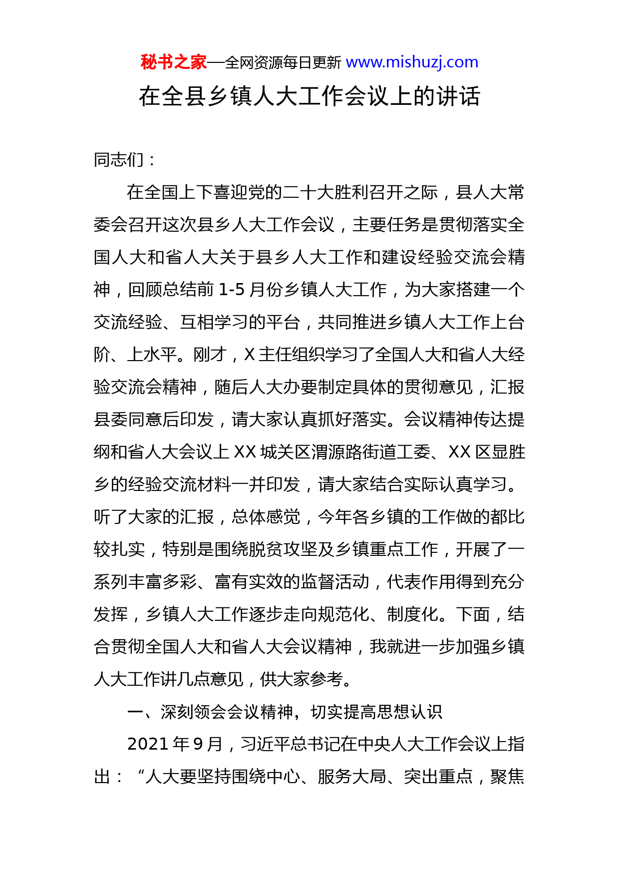 秘书之家—全网资源每日更新www.mishuzj.com在全县乡镇人大工作会议上的讲话同志们:在全国上下喜迎党的二十大胜利召开之际,县人大常委会召开这次县乡人大工作会议,主要任务是贯彻落实全国人大和省人大关于县乡人大工作和建设经验交流会精神,回顾总结前1-5月份乡镇人大工作,为大家搭建一个交流经验、互相学习的平台,共同推进乡镇人大工作上台阶、上水平。刚才,X主任组织学习了全国人大和省人大经验交流会精神,随后人大办要制定具体的贯彻意见,汇报县委同意后印发,请大家认真抓好落实。会议精神传达提纲和省人大会议上XX城关区渭源路街道工委、XX区显胜乡的经验交流材料一并印发,请大家结合实际认真学习。听了大家的汇报,总体感觉,今年各乡镇的工作做的都比较扎实,特别是围绕脱贫攻坚及乡镇重点工作,开展了一系列丰富多彩、富有实效的监督活动,代表作用得到充分发挥,乡镇人大工作逐步走向规范化、制度化。下面,结合贯彻全国人大和省人大会议精神,我就进一步加强乡镇人大工作讲几点意见,供大家参考。一、深刻领会会议精神,切实提高思想认识2021年9月,习近平总书记在中央人大工作会议上指出:“人大要坚持围绕中心、服务大局、突出重点,聚焦秘书之家—全网资源每日更新www.mishuzj.com党中央重大决策部署,聚焦人民群众所思所盼所愿,推动解决制约经济社会发展的突出矛盾和问题。”去年9月,全省贯彻落实省委人大工作会议精神暨XX试点工作推进会在渭源召开,会议总结推广了XX经验,并对进一步贯彻落实好《中共XX省委关于加强和改进人大工作的意见》作出具体安排。今年5月19日,全国人大又召开推进县乡人大工作和建设经验交流会,在总结成绩、交流经验、改进工作的基础上,进一步细化落实党中央决策部署,推动县乡人大工作和建设再上新台阶。5月29日,省人大常委会召开全省县乡人大工作和建设经验交流会,省委书记、省人大常委会主任XX出席会议并作重要讲话,他充分肯定了我省在推进县乡人大工作和建设中取得的成绩与经验,从坚持党的领导、加强和改进监督工作、依法行使重大事项决定权和人事任免权、做好县乡人大代表工作、加强县乡人大自身建设五个方面,对县乡人大工作提出了新的更高要求。从刚才传达的会议精神中我们可以看出,这两次会议规格非常高、影响非常大,栗战书委员长、XX书记分别出席会议并作重要讲话,各省、市、县、乡人大都有代表参加,充分体现了中央和省委对人大工作的高度重视,也彰显了各级人大积极主动作为,认真贯彻落实习近平总书记系列讲话精神和中央的决策部署,在加强县乡人大工作和秘书之家—全网资源每日更新www.mishuzj.com建设上取得的巨大成就。面对新的形势和任务要求,大家一定要增强责任感和使命感,坚持问题导向,认真学习中共中央转发的《若干意见》和栗战书委员长、XX书记在经验交流会上的重要讲话精神,深刻领会精髓要义,紧密结合工作实际,进一步拓宽思路举措,扎扎实实地把我们的工作做实做细。要及时向乡镇党委汇报传达好本次会议精神,争取党委的支持;要切实抓好乡镇人大规范化建设,积极组织人大代表开展监督工作,规范“人大代表之家”日常运行管理,丰富代表活动形式和内容,以卓有成效的工作向广大人民群众交一份满意的答卷。二、贯彻落实有关要求,依法行使监督职权人大是国家权力机关,担负着宪法和法律赋予的各项职权,其中监督权是人大工作的重中之重,也是我们工作中相对薄弱的环节。从平时掌握和大家的汇报可以看出,在履行监督职责方面,今年各乡镇都做了一些工作,但监督内容是否合理、方式是否得当、程序是否规范、效果是否明显,可能要打一个问号。栗战书委员长、XX书记在讲话中对监督工作特别做了强调,这里,我就乡镇人大监督工作中监督什么、谁来监督、怎么监督的问题,提几点要求:一要明确监督内容。这是搞好乡镇人大监督工作的基本前提。归纳起来主要有四个方面:一是对“法”的监秘书之家—全网资源每日更新www.mishuzj.com督。加强对法律法规在本行政区域内贯彻执行情况的监督,重点监督与本区域经济社会发展和民生事业息息相关的法律法规的实施情况,找准法律法规实施中存在的问题和原因,开展执法检查,促进政府依法行政,督促法律法规在本区域的贯彻实施。今年,市人大制定出台了《XX市禁牧条例》,已于6月1日开始施行,随后各乡镇要对该部法规的实施进行检查,也要对群众普遍关注的农村环境保护、水资源保护等相关法律实施情况开展执法检查,督促其有效贯彻实施。二是对“事”的监督。加强对乡镇政府履职行权情况的监督,重点监督政府对各级党委决策部署的贯彻落实情况,执行本级人民代表大会决议决定的情况,执行本行政区域内的经济和社会发展计划情况,管理本行政区域内的经济、教育、科学、文化、卫生、体育事业和民政、公安、司法行政、计划生育等行政工作情况,推动解决事关人民群众切身利益的热点难点问题情况等。三是对“人”的监督。加强对本级人民代表大会选举的乡镇长、副乡镇长和乡属相关站所负责人履职情况的监督,适时开展工作评议,组织视察,督促问题解决,促进依法行政、依法办事。四是对“钱”的监督。加强对乡镇财政支出,以及乡村振兴、社会救助等资金