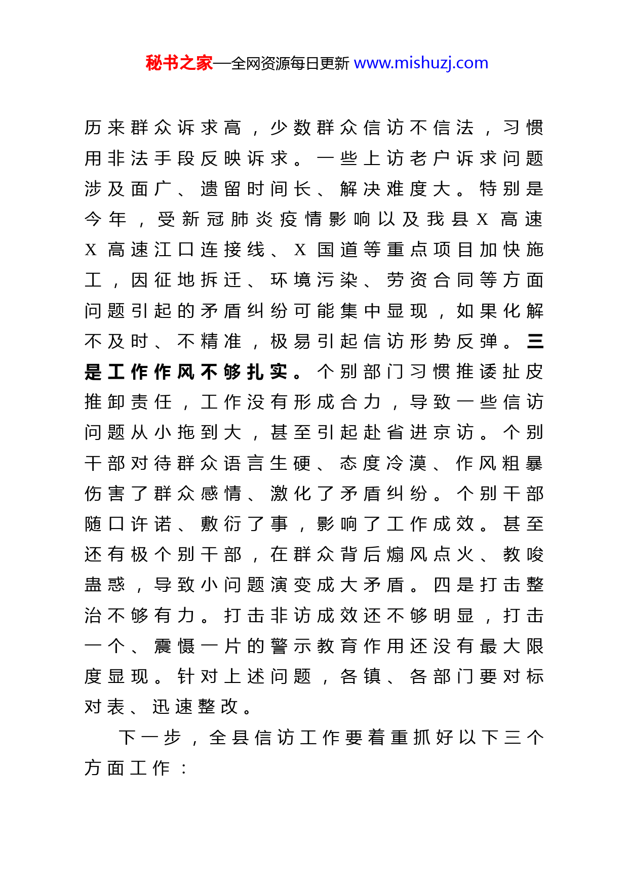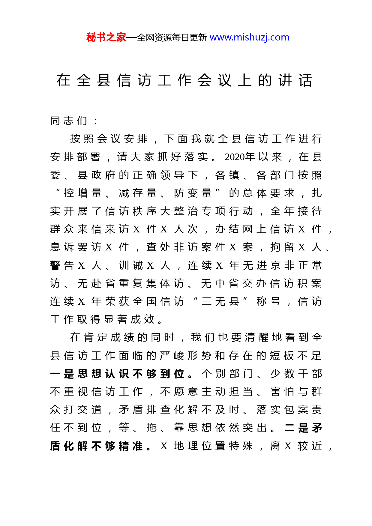 秘书之家—全网资源每日更新www.mishuzj.com在全县信访工作会议上的讲话同志们:按照会议安排,下面我就全县信访工作进行安排部署,请大家抓好落实。2020年以来,在县委、县政府的正确领导下,各镇、各部门按照“控增量、减存量、防变量”的总体要求,扎实开展了信访秩序大整治专项行动,全年接待群众来信来访X件X人次,办结网上信访X件,息诉罢访X件,查处非访案件X案,拘留X人、警告X人、训诫X人,连续X年无进京非正常访、无赴省重复集体访、无中省交办信访积案连续X年荣获全国信访“三无县”称号,信访工作取得显著成效。在肯定成绩的同时,我们也要清醒地看到全县信访工作面临的严峻形势和存在的短板不足一是思想认识不够到位。个别部门、少数干部不重视信访工作,不愿意主动担当、害怕与群众打交道,矛盾排查化解不及时、落实包案责任不到位,等、拖、靠思想依然突出。二是矛盾化解不够精准。X地理位置特殊,离X较近,秘书之家—全网资源每日更新www.mishuzj.com历来群众诉求高,少数群众信访不信法,习惯用非法手段反映诉求。一些上访老户诉求问题涉及面广、遗留时间长、解决难度大。特别是今年,受新冠肺炎疫情影响以及我县X高速X高速江口连接线、X国道等重点项目加快施工,因征地拆迁、环境污染、劳资合同等方面问题引起的矛盾纠纷可能集中显现,如果化解不及时、不精准,极易引起信访形势反弹。三是工作作风不够扎实。个别部门习惯推诿扯皮推卸责任,工作没有形成合力,导致一些信访问题从小拖到大,甚至引起赴省进京访。个别干部对待群众语言生硬、态度冷漠、作风粗暴伤害了群众感情、激化了矛盾纠纷。个别干部随口许诺、敷衍了事,影响了工作成效。甚至还有极个别干部,在群众背后煽风点火、教唆蛊惑,导致小问题演变成大矛盾。四是打击整治不够有力。打击非访成效还不够明显,打击一个、震慑一片的警示教育作用还没有最大限度显现。针对上述问题,各镇、各部门要对标对表、迅速整改。下一步,全县信访工作要着重抓好以下三个方面工作:秘书之家—全网资源每日更新www.mishuzj.com一要坚持问题导向,努力化解一批信访积案。各镇、各部门要围绕征地拆迁、脱贫攻坚、环境保护等领域,开展地毯式滚动排查,对摸排的隐患问题登记造册、建立台账,确保主要矛盾找得准、细小隐患不遗漏。要围绕本辖区、本领域、本行业突出信访问题,严格落实“一起信访案件、一名包案领导、一套工作专班、一个化解方案”的工作原则,及时跟进处理,促进“案结事了、息诉罢访”;司法部门要综合运用法律引导、思想教育等多种手段,向群众宣讲法律政策,防止群众用非法手段反映合法诉求;信访部门要发挥牵头总揽的作用,协调各部门综合运用听证评议、复查复核、信访疑难专项资金、第三方调解、律师参与化解等有效措施,多措并举、精准施策,推动信访问题及时解决。二要坚持底线思维,努力稳控一批突出问题。各镇、各部门要继续将重大社会稳定风险防范化解专项行动作为常规性工作,实行“领导包案、挂牌督办”机制,严密落实稳控责任和措施,实时关注信访人员轨迹动向,坚决做到盯死看牢,严防发生到市赴省进京非访等神不知秘书之家—全网资源每日更新www.mishuzj.com鬼不觉问题;公安机关要综合运用各种技术手段,加大重点关注人员管控,重点信息核查,一旦发现异常苗头,必须立即向有关部门通报防止出现管控“真空”;民政等部门要主动作为,对确因历史遗留等原因,难以有效化解的信访问题,通过社会帮扶、政策帮助等途径稳控处理。在这里特别要强调的是,各镇、各部门要认真落实“属地管理责任”,对一时难以化解的信访问题,必须从源头压实稳控责任。今年,县信联办将对每一起信访案件下发提醒函,各镇、各部门必须严格按照要求,抓好源头稳控和矛盾化解,凡因管控不到位引起赴省进京非访的,一律严肃追究有关领导和相关人员责任。三要坚持依法处置,严厉打击一批非访行为。公安机关要发挥职能作用,对蓄意滋事、挑头串联、闹访缠访等非访人员,必须坚决依法予以打击,狠刹以访牟利、扰乱社会秩序的歪风起到打击一个、震慑一片的效果,切实净化信访秩序;各镇、各部门要严格按照“诉求合理的解决到位、诉求无理的思想教育到位、生活困难的救助到位、行为违法的依法处置到位”秘书之家—全网资源每日更新www.mishuzj.com要求,对信访矛盾化解过程中出现的非法行为及时移交公安机关处理,真正形成化解、打击一体化工作合力。需要强调的是,信访工作事关社会稳定、事关经济社会发展大局。各镇、各部门务必提高思想认识,压实责任、细化措施,坚持把信访工作作为一项重要任务,与部门业务同安排、同部署、同推进。今后,凡是群众到县委、县政府上访,属地镇和责任部门必须第一时间派人接访。凡出现X人以上群访的,责任部门一把手和属地镇党委书记必须第一时间到场接访,这是请示书记、县长后批示的。凡不按规定到场接访的,将纳入差错登记按月通报。造成严重影响的,将依据《信访工作责任追究办法》严肃问责。同时,县信联办将每月组织县委政府督查室、纪委监委、公检法、相关镇和责任部门召开联席研判会议,研究相关工作、下发专题通报,纳入年度考核。