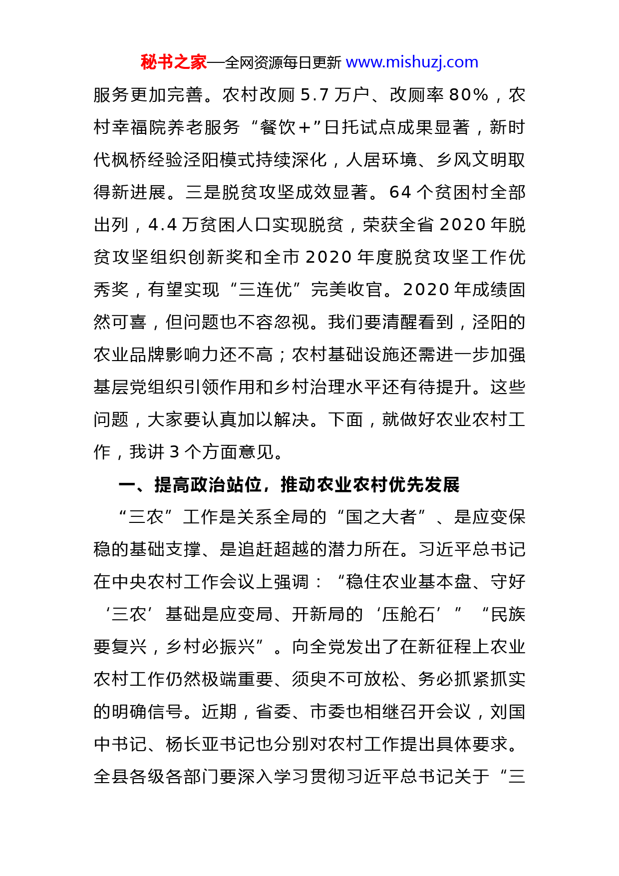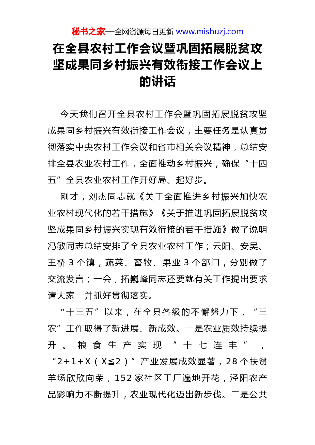 秘书之家—全网资源每日更新www.mishuzj.com在全县农村工作会议暨巩固拓展脱贫攻坚成果同乡村振兴有效衔接工作会议上的讲话今天我们召开全县农村工作会暨巩固拓展脱贫攻坚成果同乡村振兴有效衔接工作会议,主要任务是认真贯彻落实中央农村工作会议和省市相关会议精神,总结安排全县农业农村工作,全面推动乡村振兴,确保“十四五”全县农业农村工作开好局、起好步。刚才,刘杰同志就《关于全面推进乡村振兴加快农业农村现代化的若干措施》《关于推进巩固拓展脱贫攻坚成果同乡村振兴实现有效衔接的若干措施》做了说明冯敏同志总结安排了全县农业农村工作;云阳、安吴、王桥3个镇,蔬菜、畜牧、果业3个部门,分别做了交流发言;一会,拓巍峰同志还要就有关工作提出要求请大家一并抓好贯彻落实。“十三五”以来,在全县各级的不懈努力下,“三农”工作取得了新进展、新成效。一是农业质效持续提升。粮食生产实现“十七连丰”,“2+1+X(X≦2)”产业发展成效显著,28个扶贫羊场欣欣向荣,152家社区工厂遍地开花,泾阳农产品影响力不断提升,农业现代化迈出新步伐。二是公共秘书之家—全网资源每日更新www.mishuzj.com服务更加完善。农村改厕5.7万户、改厕率80%,农村幸福院养老服务“餐饮+”日托试点成果显著,新时代枫桥经验泾阳模式持续深化,人居环境、乡风文明取得新进展。三是脱贫攻坚成效显著。64个贫困村全部出列,4.4万贫困人口实现脱贫,荣获全省2020年脱贫攻坚组织创新奖和全市2020年度脱贫攻坚工作优秀奖,有望实现“三连优”完美收官。2020年成绩固然可喜,但问题也不容忽视。我们要清醒看到,泾阳的农业品牌影响力还不高;农村基础设施还需进一步加强基层党组织引领作用和乡村治理水平还有待提升。这些问题,大家要认真加以解决。下面,就做好农业农村工作,我讲3个方面意见。一、提高政治站位,推动农业农村优先发展“三农”工作是关系全局的“国之大者”、是应变保稳的基础支撑、是追赶超越的潜力所在。习近平总书记在中央农村工作会议上强调:“稳住农业基本盘、守好‘三农’基础是应变局、开新局的‘压舱石’”“民族要复兴,乡村必振兴”。向全党发出了在新征程上农业农村工作仍然极端重要、须臾不可放松、务必抓紧抓实的明确信号。近期,省委、市委也相继召开会议,刘国中书记、杨长亚书记也分别对农村工作提出具体要求。全县各级各部门要深入学习贯彻习近平总书记关于“三秘书之家—全网资源每日更新www.mishuzj.com农”工作的重要论述,进一步增强思想自觉、政治自觉行动自觉,不断提高政治判断力、政治领悟力、政治执行力,以实际行动落实好中央和省委、市委的各项决策部署。二、明确目标任务,开创“三农”工作崭新局面要坚持把解决好“三农”问题作为工作的重中之重抓好产业、人才、文化、生态、组织5个振兴,推动农业高质高效、乡村宜居宜业、农民富裕富足。一是聚焦“促衔接”,着力“固成果”。实现巩固拓展脱贫攻坚成果同乡村振兴有效衔接,是“十四五”时期一项重点工作。要落实“45431”工作措施。特别是要严格落实“四个不摘”要求,建立健全线上线下返贫致贫风险监测和核查机制,确保工作不留空档、政策不留空白,坚决守住不发生规模性返贫这条底线。要常态化落实驻村帮扶制度,加强新选派驻村干部、新提拔镇村干部、村“两委”班子成员政策业务培训,切实提高帮扶质量。要加强中央和省、市专项扶持资金倾斜支持,实现由集中资源支持脱贫攻坚向全面推进乡村振兴的平稳过渡。二是聚焦“强产业”,着力“提质效”。产业兴旺是乡村振兴和农业农村工作发展的首要任务。要围绕粮食安全,扛起政治责任,开展绿色高效“吨粮田”建设秘书之家—全网资源每日更新www.mishuzj.com一手抓面积落实,一手抓高产创建,力争今年“吨粮田”面积达到13万亩,总产稳定在16万吨以上,真正“端好自己的饭碗”。要大力培育“百万元合作组织”,以“产业强社、能人兴社、改革优社、政策扶社”四大举措,发展年收入100万元和50万元以上的专业合作组织各10家,不断壮大新型农业经营主体和村集体经济。要围绕品牌创建,实施“四色产业”强链升级工程,茯茶产业要建立和完善茯茶生产技术标准加快茯茶产业科技示范园企业入驻,实现集群抱团发展畜牧产业要按照“2+4个一”思路,着力扩能、提质、增效,尤其是奶山羊产业要持续拓展“雅泰模式”,加快15个乡村振兴羊场建设;果业要围绕“六项行动”,实施“万元果”增收计划,建设大型果品“后整理”中心,延伸产业链、提升价值链;蔬菜产业要提高棚栽蔬菜集约化、规模化水平,推出更多像“奋斗柿”、泾河甜柿、屈家香菜等特色优势品牌,唱响“番茄万千、泾阳领鲜”,打造“陕西西红柿第一县”和“中国西部蔬菜之乡”。三是聚焦“高品质”,着力“强保障”。乡村建设是乡村振兴的重要任务,是补齐农村现代化短板的重要抓手。要科学编制村庄建设规划,积极推进“多规合一”,扎实做好王桥社树、桥底刘孟等4个村庄试点秘书之家—全网资源每日更新www.mishuzj.com工作。要实施好“乡村建设十大项目”,构建“五纵、六横、一环”交通路网,推进数字乡村建设,不断提升农村基础设施水平。要推进基本公共服务向农村延伸,扩