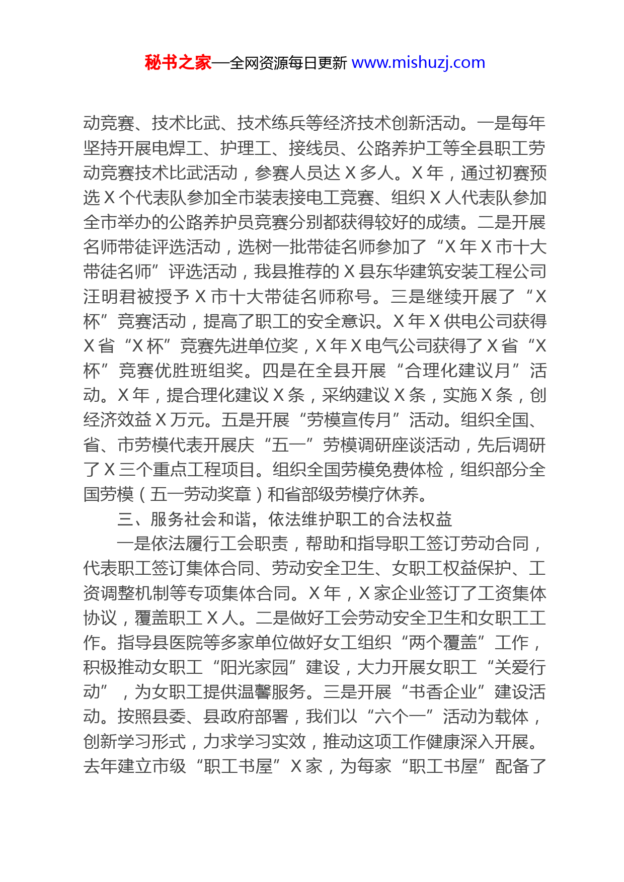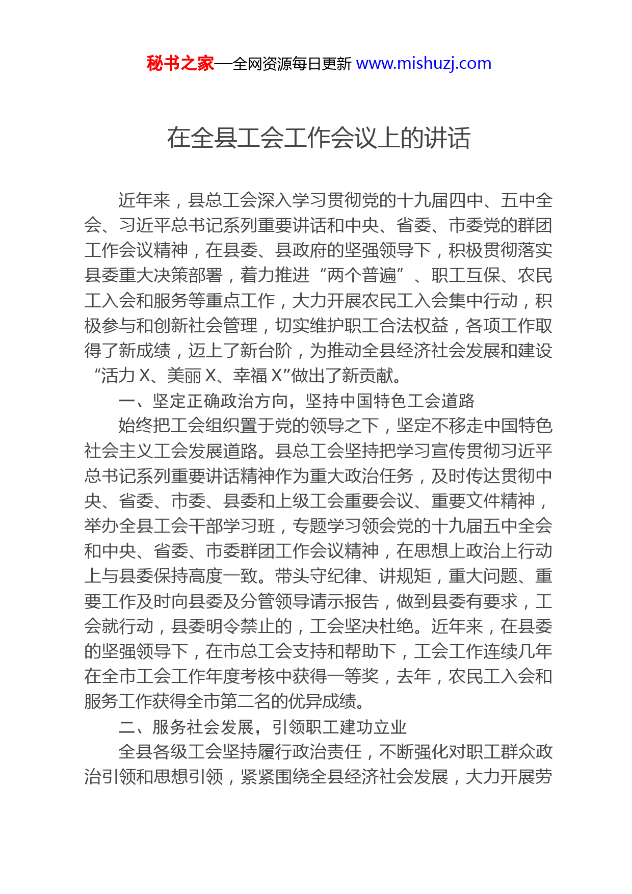 秘书之家—全网资源每日更新www.mishuzj.com在全县工会工作会议上的讲话近年来,县总工会深入学习贯彻党的十九届四中、五中全会、习近平总书记系列重要讲话和中央、省委、市委党的群团工作会议精神,在县委、县政府的坚强领导下,积极贯彻落实县委重大决策部署,着力推进“两个普遍”、职工互保、农民工入会和服务等重点工作,大力开展农民工入会集中行动,积极参与和创新社会管理,切实维护职工合法权益,各项工作取得了新成绩,迈上了新台阶,为推动全县经济社会发展和建设“活力X、美丽X、幸福X”做出了新贡献。一、坚定正确政治方向,坚持中国特色工会道路始终把工会组织置于党的领导之下,坚定不移走中国特色社会主义工会发展道路。县总工会坚持把学习宣传贯彻习近平总书记系列重要讲话精神作为重大政治任务,及时传达贯彻中央、省委、市委、县委和上级工会重要会议、重要文件精神,举办全县工会干部学习班,专题学习领会党的十九届五中全会和中央、省委、市委群团工作会议精神,在思想上政治上行动上与县委保持高度一致。带头守纪律、讲规矩,重大问题、重要工作及时向县委及分管领导请示报告,做到县委有要求,工会就行动,县委明令禁止的,工会坚决杜绝。近年来,在县委的坚强领导下,在市总工会支持和帮助下,工会工作连续几年在全市工会工作年度考核中获得一等奖,去年,农民工入会和服务工作获得全市第二名的优异成绩。二、服务社会发展,引领职工建功立业全县各级工会坚持履行政治责任,不断强化对职工群众政治引领和思想引领,紧紧围绕全县经济社会发展,大力开展劳秘书之家—全网资源每日更新www.mishuzj.com动竞赛、技术比武、技术练兵等经济技术创新活动。一是每年坚持开展电焊工、护理工、接线员、公路养护工等全县职工劳动竞赛技术比武活动,参赛人员达X多人。X年,通过初赛预选X个代表队参加全市装表接电工竞赛、组织X人代表队参加全市举办的公路养护员竞赛分别都获得较好的成绩。二是开展名师带徒评选活动,选树一批带徒名师参加了“X年X市十大带徒名师”评选活动,我县推荐的X县东华建筑安装工程公司汪明君被授予X市十大带徒名师称号。三是继续开展了“X杯”竞赛活动,提高了职工的安全意识。X年X供电公司获得X省“X杯”竞赛先进单位奖,X年X电气公司获得了X省“X杯”竞赛优胜班组奖。四是在全县开展“合理化建议月”活动。X年,提合理化建议X条,采纳建议X条,实施X条,创经济效益X万元。五是开展“劳模宣传月”活动。组织全国、省、市劳模代表开展庆“五一”劳模调研座谈活动,先后调研了X三个重点工程项目。组织全国劳模免费体检,组织部分全国劳模(五一劳动奖章)和省部级劳模疗休养。三、服务社会和谐,依法维护职工的合法权益一是依法履行工会职责,帮助和指导职工签订劳动合同,代表职工签订集体合同、劳动安全卫生、女职工权益保护、工资调整机制等专项集体合同。X年,X家企业签订了工资集体协议,覆盖职工X人。二是做好工会劳动安全卫生和女职工工作。指导县医院等多家单位做好女工组织“两个覆盖”工作,积极推动女职工“阳光家园”建设,大力开展女职工“关爱行动”,为女职工提供温馨服务。三是开展“书香企业”建设活动。按照县委、县政府部署,我们以“六个一”活动为载体,创新学习形式,力求学习实效,推动这项工作健康深入开展。去年建立市级“职工书屋”X家,为每家“职工书屋”配备了秘书之家—全网资源每日更新www.mishuzj.com价值X万多元的图书。四是开展法治宣传教育活动。继续开展“八五”普法宣传和“X”法治宣传活动,每年发放《宪法》、《工会法》、《劳动合同法》、《劳动争议调解仲裁法》、《社会保险法》和《X省集体合同条例》等法律法规宣传资料共计约X份。去年X月X日在供电公司举办了X县总工会“普法进园区”劳动法知识讲座,园区非公企业、供电公司等单位X多人参加了劳动法知识讲座。四、服务职工群众,为职工群众排忧解难一是积极开展“四送”活动。近几年,在“春送岗位”活动中,县总工会会同县人社局、县工业园区等单位在春节期间举办了多场次专场招聘会,每年帮助X多人找到了工作岗位。去年X月份,县总工会积极参与了市总工会举办的首次大型公益性“校企对接”用工招聘会,组织我县X多家企业参加了招聘,提供了X多个就业岗位。“夏送清凉”活动中,筹集资金X万多元,慰问一线职工和农民工X人。“秋送助学”活动中,筹集助学资金X万多元,资助X名困难职工和农民工子女圆了大学梦,使职工感受到党和政府的温暖。“冬送温暖”期间,走访慰问救助困难职工(困难农民工)X户,发放救助金X多万元。发放困难劳模“三金”X多万元。二是开展日常帮扶工作。对X名困难职工进行了大病救助,发放救助款X万多元。筹集央财专项资金X万元、省财专项资金X万元,对X名单亲困难女职工进行生活救助;筹集央财X万元,对X名困难职工进行生活救助。三是积极开展职工素质教育。X年举办了X期职工素质教育培训班,培训职工达到X多人次。举办各类农民工专业技能培训班X期,培训职工X多人次。四是推进职工互助保障工作。去年全县共办理职工互助保障的单位X家,参保X人次,金额X万多元;出险X人,理赔X万元,助学X秘书之家—全网资源
