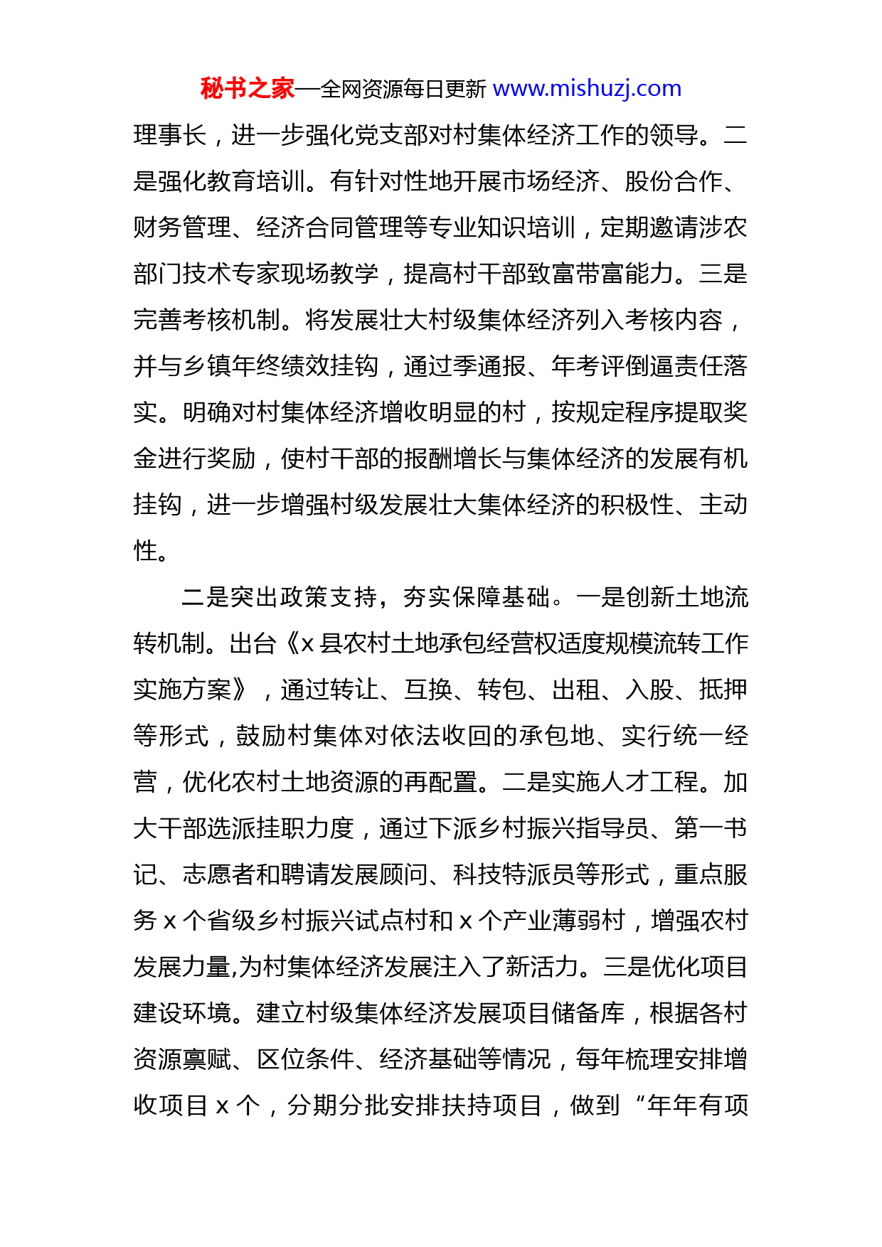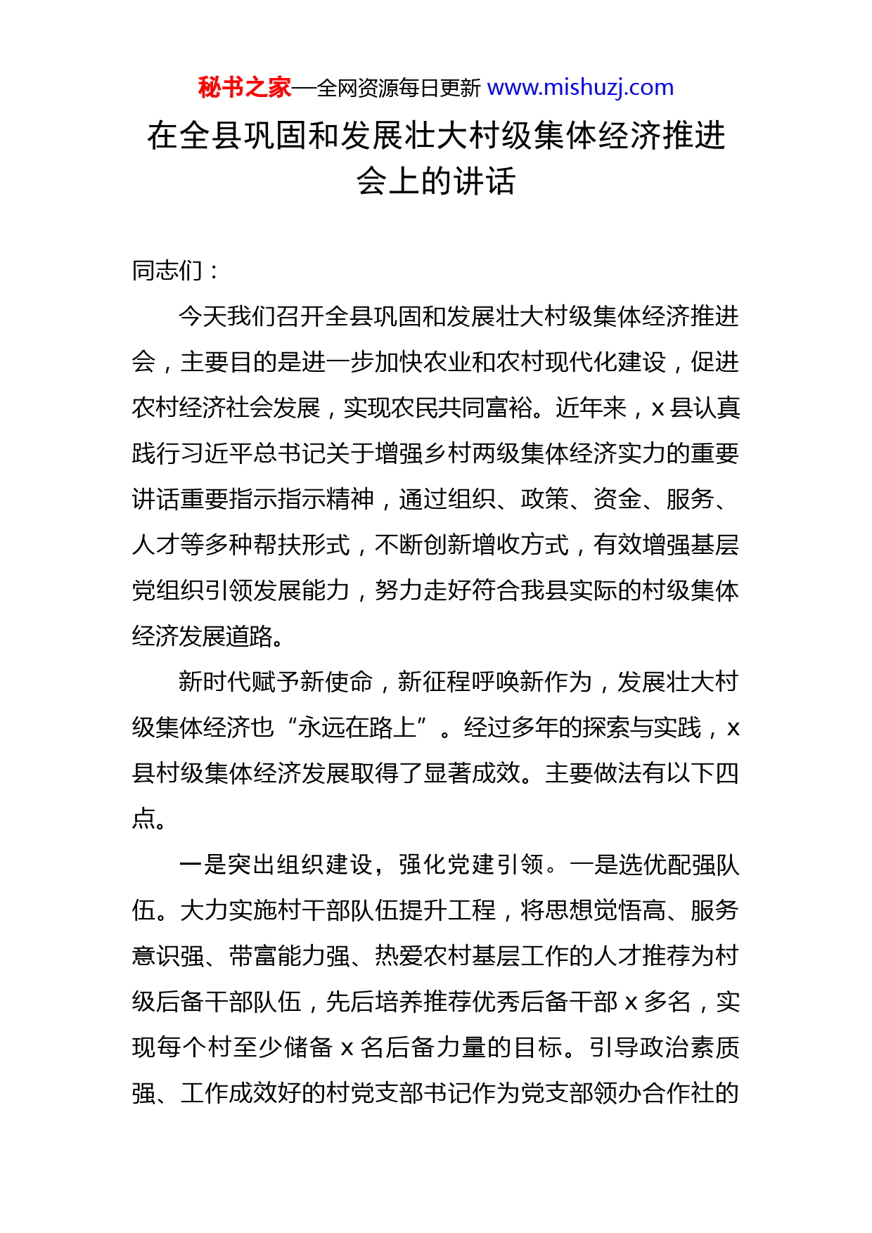 秘书之家—全网资源每日更新www.mishuzj.com在全县巩固和发展壮大村级集体经济推进会上的讲话同志们:今天我们召开全县巩固和发展壮大村级集体经济推进会,主要目的是进一步加快农业和农村现代化建设,促进农村经济社会发展,实现农民共同富裕。近年来,x县认真践行习近平总书记关于增强乡村两级集体经济实力的重要讲话重要指示指示精神,通过组织、政策、资金、服务、人才等多种帮扶形式,不断创新增收方式,有效增强基层党组织引领发展能力,努力走好符合我县实际的村级集体经济发展道路。新时代赋予新使命,新征程呼唤新作为,发展壮大村级集体经济也“永远在路上”。经过多年的探索与实践,x县村级集体经济发展取得了显著成效。主要做法有以下四点。一是突出组织建设,强化党建引领。一是选优配强队伍。大力实施村干部队伍提升工程,将思想觉悟高、服务意识强、带富能力强、热爱农村基层工作的人才推荐为村级后备干部队伍,先后培养推荐优秀后备干部x多名,实现每个村至少储备x名后备力量的目标。引导政治素质强、工作成效好的村党支部书记作为党支部领办合作社的秘书之家—全网资源每日更新www.mishuzj.com理事长,进一步强化党支部对村集体经济工作的领导。二是强化教育培训。有针对性地开展市场经济、股份合作、财务管理、经济合同管理等专业知识培训,定期邀请涉农部门技术专家现场教学,提高村干部致富带富能力。三是完善考核机制。将发展壮大村级集体经济列入考核内容,并与乡镇年终绩效挂钩,通过季通报、年考评倒逼责任落实。明确对村集体经济增收明显的村,按规定程序提取奖金进行奖励,使村干部的报酬增长与集体经济的发展有机挂钩,进一步增强村级发展壮大集体经济的积极性、主动性。二是突出政策支持,夯实保障基础。一是创新土地流转机制。出台《x县农村土地承包经营权适度规模流转工作实施方案》,通过转让、互换、转包、出租、入股、抵押等形式,鼓励村集体对依法收回的承包地、实行统一经营,优化农村土地资源的再配置。二是实施人才工程。加大干部选派挂职力度,通过下派乡村振兴指导员、第一书记、志愿者和聘请发展顾问、科技特派员等形式,重点服务x个省级乡村振兴试点村和x个产业薄弱村,增强农村发展力量,为村集体经济发展注入了新活力。三是优化项目建设环境。建立村级集体经济发展项目储备库,根据各村资源禀赋、区位条件、经济基础等情况,每年梳理安排增收项目x个,分期分批安排扶持项目,做到“年年有项秘书之家—全网资源每日更新www.mishuzj.com目、村村有项目”。同时,简化项目建设审批手续,降低项目建设成本,增加村集体收益。三是突出载体创新,扩宽增收渠道。一是实施统筹项目。借助省市大力发展村集体经济的有利契机,县里统筹资金x元入股x乡村经济发展项目,用于扶持x个村财收入未达x元的“相对薄弱村”,全力消除“相对薄弱村”。二是推行抱团发展。通过“强村带弱村”或“镇+村”“村+村”等形式,实现资源或优势互补互利。据统计,2021年各乡镇(街道)共实施抱团项x个,涉及x个行政村,总投资金额约x元,增加村级集体经济收入约x元。三是推行支部领办合作社。由村党支部书记代表村集体,注册成立有法人资格的合作社,村集体以土地、资金或其他固定资产入股,组织群众以土地、资金、劳动力等入股,围绕特色产业开展经营活动,构建村集体和群众的利益共同体,初步形成自产自销、统购统销、置业发展、综合服务经营模式,促进村集体增收、村民增收。四是突出资金扶持,确保高效运作。一是加大财政投入。先后下拨专项资金x元、奖补资金x元用于扶持村集体收入“薄弱村”和“相对薄弱村”;统筹安排支部领办合作社专项资金x元、奖励金x元,对试点村进行重点扶持;安排x元用于扶持壮大村集体经济,策划生成村财发展项目x个,预计每年可增村集体收入x元。二是推行结秘书之家—全网资源每日更新www.mishuzj.com对帮扶。组织x个县直机关单位对口帮扶x个集体经济薄弱村、重点村,全县各部门单位共落实帮扶项目x多个、资金x元。三是实施普惠金融。不断推进村级合作社信用体系建设,建设党支部领办合作社普惠金融服务点,全县统筹专项资金x元作为普惠金融服务点保证金,为全县党支部领办合作社成员整体授信x元,有效解决发展集体经济和农民生产生活贷款抵押难、担保难等问题。经过多年努力,我县农村集体经济得到了长足的发展,但还存在一些突出问题和制约瓶颈。一是发展不平衡。由于受自然环境、区位优势、资源禀赋及村干部能力等因素影响,村集体经济发展不平衡问题日益突出,村与村之间贫富差距不断拉大,呈现两极分化趋势。二是发展后劲不足。村集体收入来源普遍存在总量较小、来源单一、收入不固定等问题。在相对偏远的农村,主要是靠土地、山林等资源承包或固定资产的转让、租赁来增加收入,生产经营性收入很少,收益率也很低,有些原先有集体经营性收入的村,因疫情、产业萧条等原因还出现“返薄”的问题。三是普遍入不敷出。当前多数村集体都面临历史债务和现实支出两大“包袱”,严重影响了村干部的积极性和主动性,制约了村级经济发展。经过一段时间的调研、座谈,我总结了两点影响制约全县农村集体经济发展
