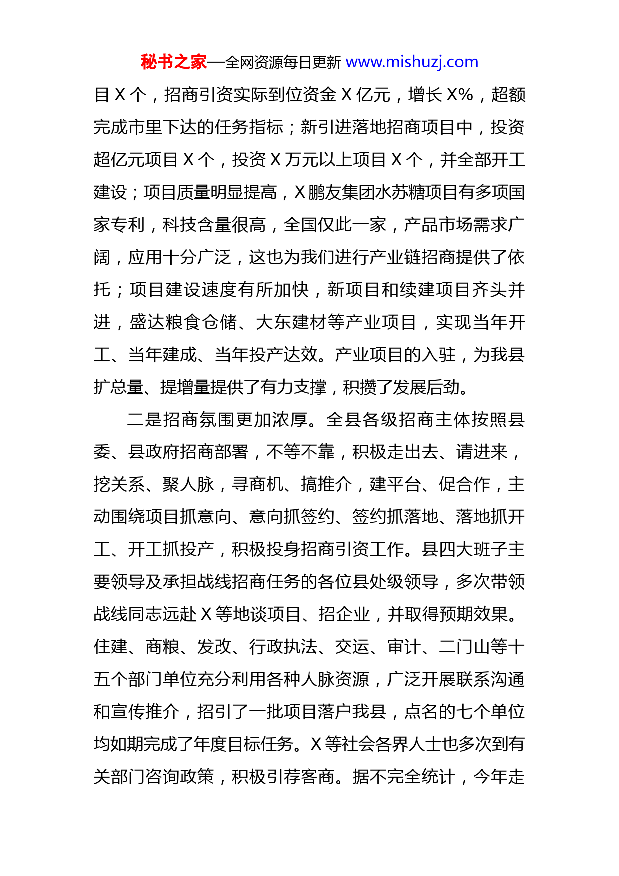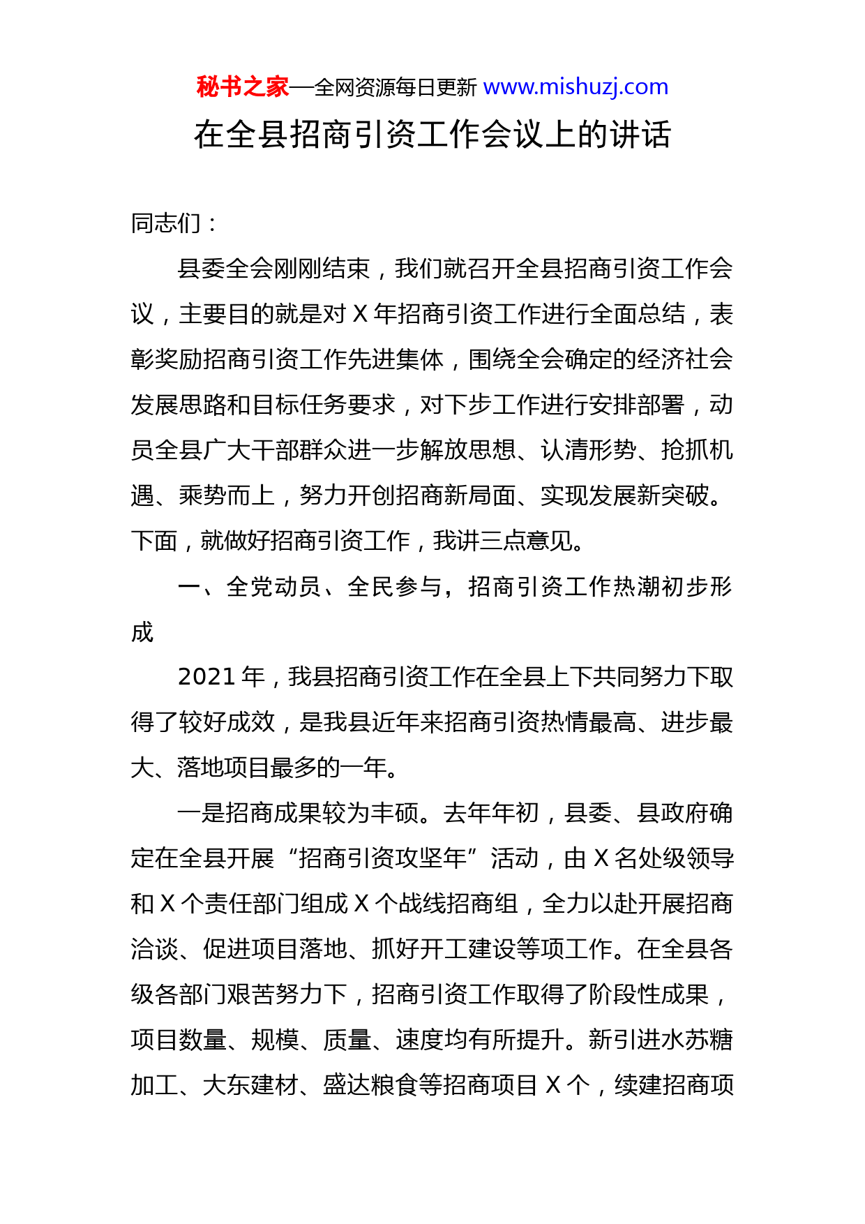 秘书之家—全网资源每日更新www.mishuzj.com在全县招商引资工作会议上的讲话同志们:县委全会刚刚结束,我们就召开全县招商引资工作会议,主要目的就是对X年招商引资工作进行全面总结,表彰奖励招商引资工作先进集体,围绕全会确定的经济社会发展思路和目标任务要求,对下步工作进行安排部署,动员全县广大干部群众进一步解放思想、认清形势、抢抓机遇、乘势而上,努力开创招商新局面、实现发展新突破。下面,就做好招商引资工作,我讲三点意见。一、全党动员、全民参与,招商引资工作热潮初步形成2021年,我县招商引资工作在全县上下共同努力下取得了较好成效,是我县近年来招商引资热情最高、进步最大、落地项目最多的一年。一是招商成果较为丰硕。去年年初,县委、县政府确定在全县开展“招商引资攻坚年”活动,由X名处级领导和X个责任部门组成X个战线招商组,全力以赴开展招商洽谈、促进项目落地、抓好开工建设等项工作。在全县各级各部门艰苦努力下,招商引资工作取得了阶段性成果,项目数量、规模、质量、速度均有所提升。新引进水苏糖加工、大东建材、盛达粮食等招商项目X个,续建招商项秘书之家—全网资源每日更新www.mishuzj.com目X个,招商引资实际到位资金X亿元,增长X%,超额完成市里下达的任务指标;新引进落地招商项目中,投资超亿元项目X个,投资X万元以上项目X个,并全部开工建设;项目质量明显提高,X鹏友集团水苏糖项目有多项国家专利,科技含量很高,全国仅此一家,产品市场需求广阔,应用十分广泛,这也为我们进行产业链招商提供了依托;项目建设速度有所加快,新项目和续建项目齐头并进,盛达粮食仓储、大东建材等产业项目,实现当年开工、当年建成、当年投产达效。产业项目的入驻,为我县扩总量、提增量提供了有力支撑,积攒了发展后劲。二是招商氛围更加浓厚。全县各级招商主体按照县委、县政府招商部署,不等不靠,积极走出去、请进来,挖关系、聚人脉,寻商机、搞推介,建平台、促合作,主动围绕项目抓意向、意向抓签约、签约抓落地、落地抓开工、开工抓投产,积极投身招商引资工作。县四大班子主要领导及承担战线招商任务的各位县处级领导,多次带领战线同志远赴X等地谈项目、招企业,并取得预期效果。住建、商粮、发改、行政执法、交运、审计、二门山等十五个部门单位充分利用各种人脉资源,广泛开展联系沟通和宣传推介,招引了一批项目落户我县,点名的七个单位均如期完成了年度目标任务。X等社会各界人士也多次到有关部门咨询政策,积极引荐客商。据不完全统计,今年走秘书之家—全网资源每日更新www.mishuzj.com出去招商引资X余人次,请进外地客商X伙X余人次,政府网站浏览量明显增加,全县上下初步形成了全党、全社会、全民抓招商的工作热潮,有效提升了X知名度,为推进做好当前和今后一个时期招商引资工作奠定了坚实基础。三是招商环境日趋优化。良好的招商引资环境,是我们招商引资工作取得成效的重要保障。年初以来,我们重新充实完善了招商引资优惠政策和奖励办法,丰富健全了招商引资包保和督查督办机制,既调动了招商主体的积极性,又增强了我县招商引资的对外吸引力。投资X万元加快园区基础建设,硬件条件逐渐具备,聚集效应初步显现。各单位、各部门高度重视招商、大力支持招商,服务意识和服务质量明显提高,国土资源和规划、生态环境、质监、市场监管、电业等部门积极参与做好招商引资服务保障工作,充分履职尽责,积极建言献策,自觉做到在办理审批手续上从简,在解决项目用地上从优,在配套设施建设上从快;健康产业园区、基地办、招商、工信、发改、住建等部门,积极协调、上下沟通,及时帮助企业解决各种难题,提供优质服务,为招商引资创造了良好软环境。四是招商能力有效提升。在招商引资过程中,各级领导干部想千方设百计,用心想事、诚心做事、尽心成事,秘书之家—全网资源每日更新www.mishuzj.com努力探索实践招商引资新的招法、硬的措施、好的成效。谋划的项目符合县情,借助中国农科院、哈工大、省农科院等高等院校科研实力,围绕我县农林、矿产和二战遗址遗迹等特色资源,谋划储备了X个招商项目,一些企业集团很感兴趣,并提出了合作意向。洽谈的招数不断增多,在充满变数的招商谈判中,不论是在大连、北京项目推介会上,还是在X项目争取中,不论是在与珍奥集团会见时,还是在招引其他企业方面,我们都尽力争取,友好磋商,努力赢得对方信任与理解,X水苏糖项目就是一个成功的例子。履约的诺言确保兑现,我们努力克服资金少、用地缺等实际困难,投资X余万元,积极与爱俐华糖业兑现了签约条件,保证了项目进度,增强了投资者信心。以往招商实践表明,一些招商项目的引进落地,固然有我们资源禀赋优势等客观因素,但更多的是靠我们深入宣传、积极争取、践诺履约和人格魅力。过去的一年,我们取得了阶段成绩,更积累了经验、锻炼了队伍、拓宽了人脉,各级领导干部抓招商、上项目能力得到了历练和提高。在肯定成绩的同时,也要正视存在的差距和不足。除客观上我县高寒偏僻、人才匮乏、经济弱小外,我们在工作中还存在重视不够到位、思想不够解放、方法不够创新、环境不够优化等问题,有些单位还没有完成招商引资工作任务,一些单位甚至