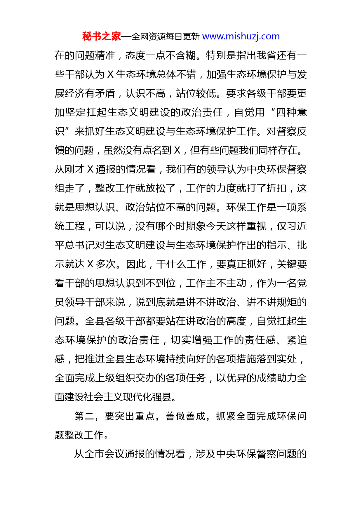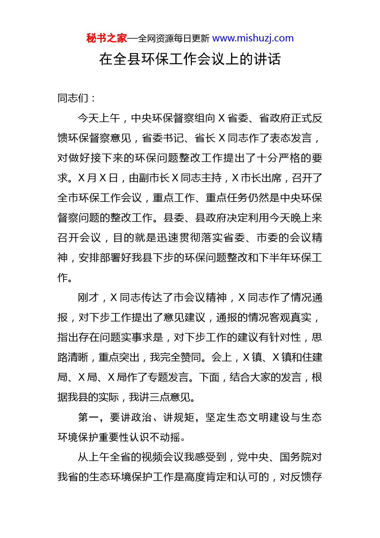 秘书之家—全网资源每日更新www.mishuzj.com在全县环保工作会议上的讲话同志们:今天上午,中央环保督察组向X省委、省政府正式反馈环保督察意见,省委书记、省长X同志作了表态发言,对做好接下来的环保问题整改工作提出了十分严格的要求。X月X日,由副市长X同志主持,X市长出席,召开了全市环保工作会议,重点工作、重点任务仍然是中央环保督察问题的整改工作。县委、县政府决定利用今天晚上来召开会议,目的就是迅速贯彻落实省委、市委的会议精神,安排部署好我县下步的环保问题整改和下半年环保工作。刚才,X同志传达了市会议精神,X同志作了情况通报,对下步工作提出了意见建议,通报的情况客观真实,指出存在问题实事求是,对下步工作的建议有针对性,思路清晰,重点突出,我完全赞同。会上,X镇、X镇和住建局、X局、X局作了专题发言。下面,结合大家的发言,根据我县的实际,我讲三点意见。第一,要讲政治、讲规矩,坚定生态文明建设与生态环境保护重要性认识不动摇。从上午全省的视频会议我感受到,党中央、国务院对我省的生态环境保护工作是高度肯定和认可的,对反馈存秘书之家—全网资源每日更新www.mishuzj.com在的问题精准,态度一点不含糊。特别是指出我省还有一些干部认为X生态环境总体不错,加强生态环境保护与发展经济有矛盾,认识不高,站位较低。要求各级干部要更加坚定扛起生态文明建设的政治责任,自觉用“四种意识”来抓好生态文明建设与生态环境保护工作。对督察反馈的问题,虽然没有点名到X,但有些问题我们同样存在。从刚才X通报的情况看,我们有的领导认为中央环保督察组走了,整改工作就放松了,工作的力度就打了折扣,这就是思想认识、政治站位不高的问题。环保工作是一项系统工程,可以说,没有哪个时期象今天这样重视,仅习近平总书记对生态文明建设与生态环境保护作出的指示、批示就达X多次。因此,干什么工作,要真正抓好,关键要看干部的思想认识到不到位,工作主不主动,作为一名党员领导干部来说,说到底就是讲不讲政治、讲不讲规矩的问题。全县各级干部都要站在讲政治的高度,自觉扛起生态环境保护的政治责任,切实增强工作的责任感、紧迫感,把推进全县生态环境持续向好的各项措施落到实处,全面完成上级组织交办的各项任务,以优异的成绩助力全面建设社会主义现代化强县。第二,要突出重点,善做善成,抓紧全面完成环保问题整改工作。从全市会议通报的情况看,涉及中央环保督察问题的秘书之家—全网资源每日更新www.mishuzj.com整改我们走在了前面,但尚未解决的两个问题需要逐一攻坚,抓紧推进。下来后,请牵头的领导和责任部门立即调度,分析问题原因,围绕规定时间倒排工期,进一步细化责任,一抓到底。对于全县面上存在的突出问题,按照X同志刚才通报的情况,由各责任领导召集相关部门逐一制定整改方案,明确整改时限和工作要求,由县环保问题整改领导小组办公室汇总后报县委、县政府集体研究审定,各个问题的整改方案必须在X月X日前完成并上报。对于X山国家级自然保护区、X省级自然保护区存在问题的整改,要先措清底数,查明原因,本着对历史负责、对干部负责、对后人负责的原则,实事求是、因地制宜,不搞一刀切,先易后难,逐步解决。在这里我要强调的是,对于环保问题的敏感区域、重点部位,各级各部门领导一定要有法制思维和法律意识,绝不能雷池法律法规红线半步,切不要为一时的发展、群众的期盼而突破生态的红线。今后,对于县政府明令禁止的生态环境行为,哪个地方违背,要严肃进行追究问责,绝不姑息迁就。对于X水质改善工作,各相关乡镇、街道和县直部门务必从保护母亲河、守护我们家园的高度来推进各项工作。从全市的情况看,纳入国家“水十条”水质考核的X个断面,上半年仅有我们X达到考核要求,其他3个涉及的……均未达到,按照省对市生态环境考核,将面临被“一秘书之家—全网资源每日更新www.mishuzj.com票否决”的危险。但从刚才X分析的情况,下半年要继续稳定在考核标准下压力很大,涉及氨氮指标超限的问题要引起足够重视,相关单位要按照方案着力推进,不容半点闪失,环保部门要加强监管监测,出现重大问题要及时报告。对于县城区环境空气质量、饮用水源地保护等重点工作,既要巩固好前期工作取得的成果,又要看到问题可能反弹的艰巨,县相关领导要加强调度,环保部门要当好参谋,督查督办局要加强督促检查,对工作不力、推进迟缓、效果极差的启动问责。第三,要统筹兼顾、说干就干,全面推进我县生态环境持续向好。上半年工作已经收官,环保工作取得成绩值得充分肯定,这是大家共同努力的结果。下半年,全县各项目标任务繁重,工作节奏、工作压力持续加大,统筹做好下半经济社会发展各项工作是对各级干部的挑战和考验。下半年,环保工作重点要抓好中央环保督察意见反馈问题的整改、迎接国家有关部委对自然保护区、县级以上集中式饮用水源专项督察、全省土壤污染详查、全市环境模范城市创建验收以及完成生态环境建设目标任务各项工作,应该说,环保部门承担的任务很重。全县各级各有关部门要协同作战,加强沟通,联动发力,形成合力,扎实推进各项环保工作任务的落实。要增强主动工作、主动作为的意秘书之家—全网资源每日更新www.mishuzj.
