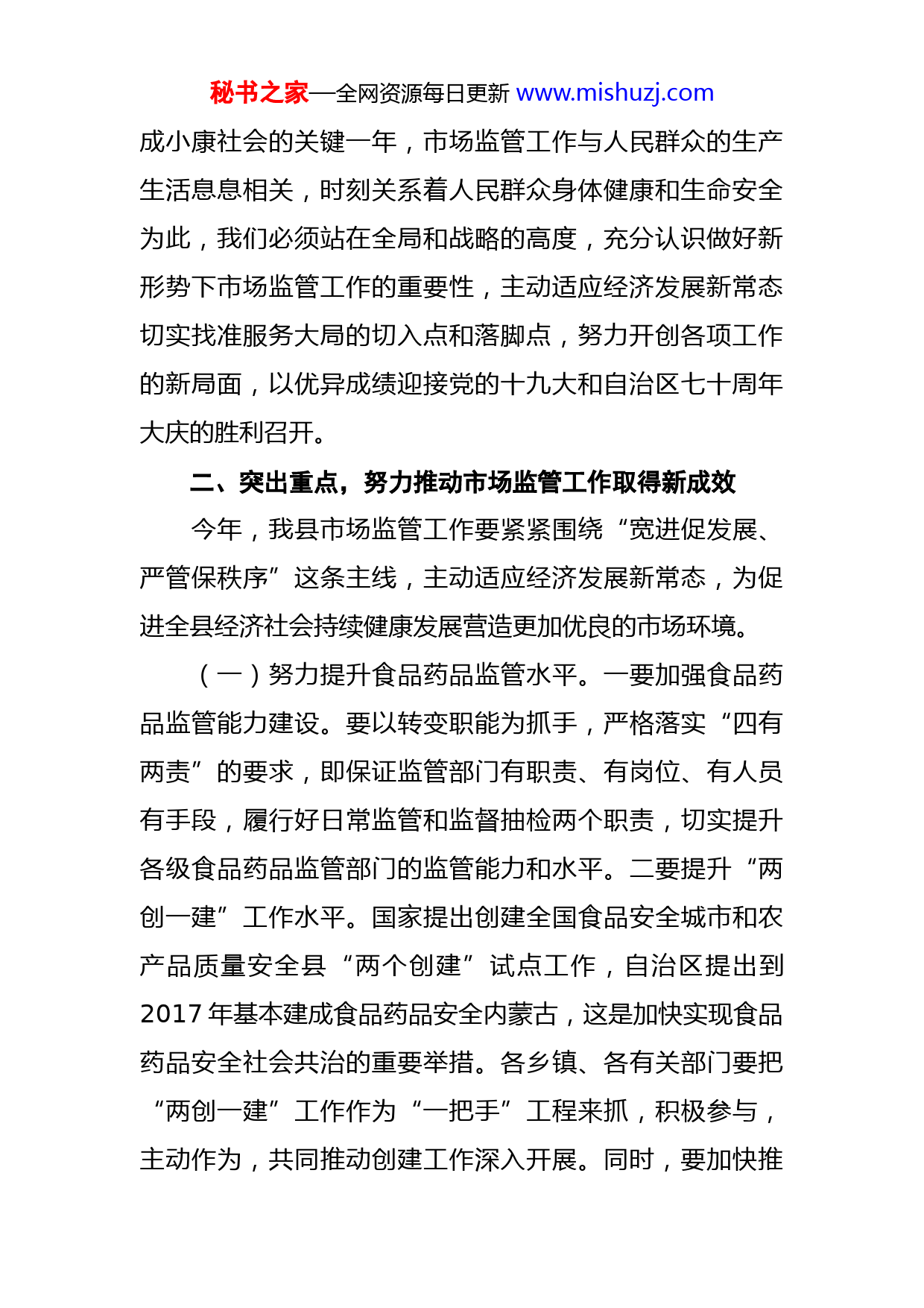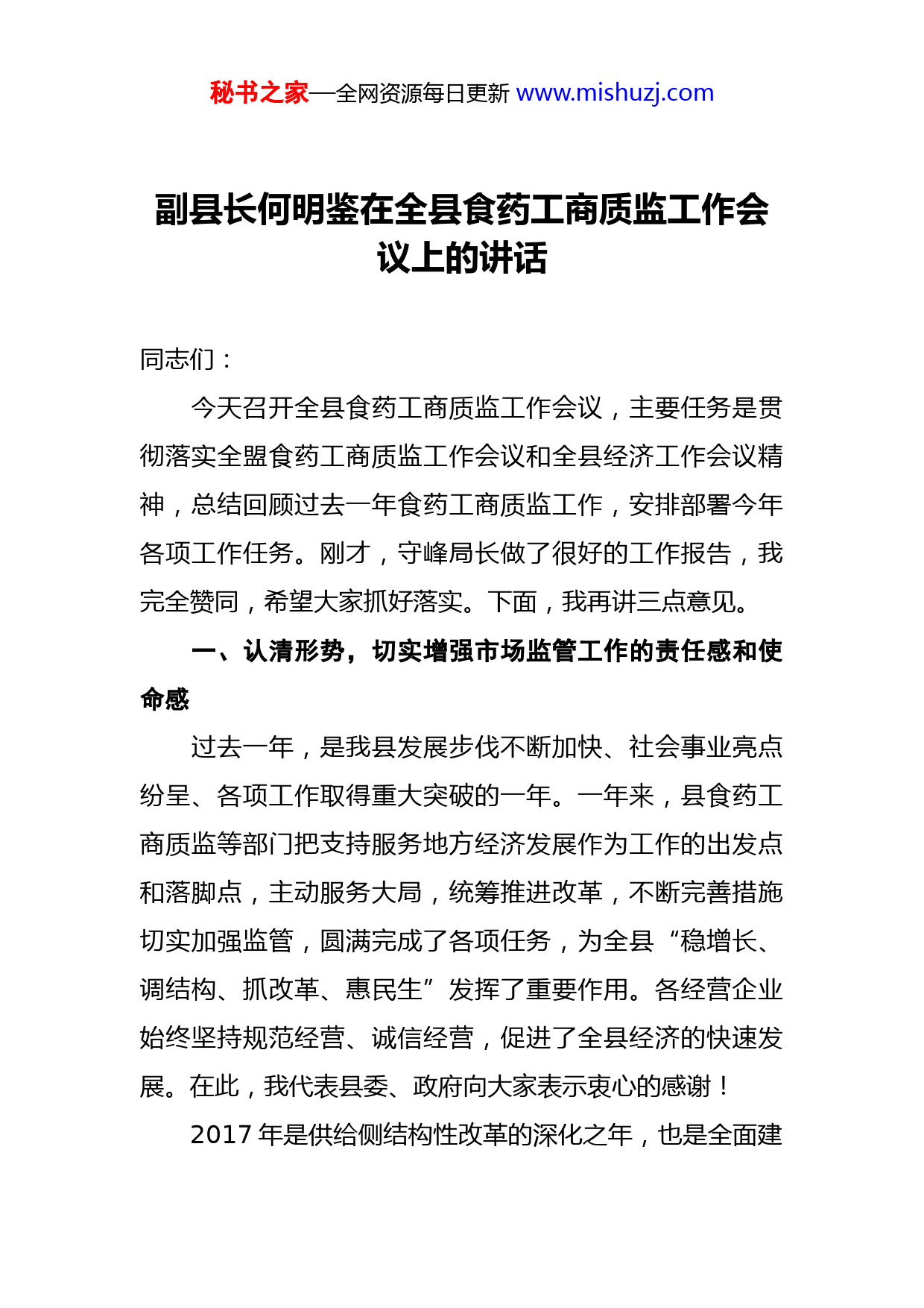 秘书之家—全网资源每日更新www.mishuzj.com副县长何明鉴在全县食药工商质监工作会议上的讲话同志们:今天召开全县食药工商质监工作会议,主要任务是贯彻落实全盟食药工商质监工作会议和全县经济工作会议精神,总结回顾过去一年食药工商质监工作,安排部署今年各项工作任务。刚才,守峰局长做了很好的工作报告,我完全赞同,希望大家抓好落实。下面,我再讲三点意见。一、认清形势,切实增强市场监管工作的责任感和使命感过去一年,是我县发展步伐不断加快、社会事业亮点纷呈、各项工作取得重大突破的一年。一年来,县食药工商质监等部门把支持服务地方经济发展作为工作的出发点和落脚点,主动服务大局,统筹推进改革,不断完善措施切实加强监管,圆满完成了各项任务,为全县“稳增长、调结构、抓改革、惠民生”发挥了重要作用。各经营企业始终坚持规范经营、诚信经营,促进了全县经济的快速发展。在此,我代表县委、政府向大家表示衷心的感谢!2017年是供给侧结构性改革的深化之年,也是全面建秘书之家—全网资源每日更新www.mishuzj.com成小康社会的关键一年,市场监管工作与人民群众的生产生活息息相关,时刻关系着人民群众身体健康和生命安全为此,我们必须站在全局和战略的高度,充分认识做好新形势下市场监管工作的重要性,主动适应经济发展新常态切实找准服务大局的切入点和落脚点,努力开创各项工作的新局面,以优异成绩迎接党的十九大和自治区七十周年大庆的胜利召开。二、突出重点,努力推动市场监管工作取得新成效今年,我县市场监管工作要紧紧围绕“宽进促发展、严管保秩序”这条主线,主动适应经济发展新常态,为促进全县经济社会持续健康发展营造更加优良的市场环境。(一)努力提升食品药品监管水平。一要加强食品药品监管能力建设。要以转变职能为抓手,严格落实“四有两责”的要求,即保证监管部门有职责、有岗位、有人员有手段,履行好日常监管和监督抽检两个职责,切实提升各级食品药品监管部门的监管能力和水平。二要提升“两创一建”工作水平。国家提出创建全国食品安全城市和农产品质量安全县“两个创建”试点工作,自治区提出到2017年基本建成食品药品安全内蒙古,这是加快实现食品药品安全社会共治的重要举措。各乡镇、各有关部门要把“两创一建”工作作为“一把手”工程来抓,积极参与,主动作为,共同推动创建工作深入开展。同时,要加快推秘书之家—全网资源每日更新www.mishuzj.com进全县农贸市场、食品加工小作坊园区、餐厨垃圾废弃物处理厂项目建设,全面提升我县食品药品安全总体水平。三要提升重点领域安全监管水平。深入开展食品综合治理行动,强化对食品生产、加工、流通和消费各环节的监督管理,确保食品安全。重点围绕“病死肉”、“地沟油”“非法添加”等问题,集中开展隐患大排查,加大对各类非法生产经营行为打击力度,守住不发生区域性、系统性安全事件的底线。要加大对药品安全监管力度,坚决打击使用假劣药品、违法配制制剂等行为,确保广大人民群众用药安全。要利用信息化手段,切实抓好牛羊肉、白酒等追溯体系建设,努力实现食品药品来源可追溯、去向可查证、责任可追究。(二)全力抓好工商行政管理。一要深入推进商事制度改革。要以深化改革为动力,积极转变监管理念和方式强化联动协作,努力推动形成大众创业、万众创新的良好局面。一方面要继续加快推进工商注册便利化、市场准入管理模式创新、工商注册全程电子化等工作,根据改革任务调整充实一线“窗口”力量,建立关联部门同步审批制度,切实提高工商服务质量和效率。另一方面要统筹抓好“管”和“放”的关系,既要同步也要均衡,减化了审批手续,就要加强过程监管,建立完善企业经营异常名录制度,规范企业信用信息发布制度,把创业主体信用与市场秘书之家—全网资源每日更新www.mishuzj.com准入、享受优惠政策挂钩,完善以信用管理为基础的监管模式,营造良好的市场氛围。二要大力实施品牌商标战略要始终高度重视品牌建设,深入推进品牌战略建设质量强县,积极申请专利、注册商标,争创驰名、著名商标,带动地方经济发展。三要强化工商监管执法。要始终对商品质量、广告宣传、农资经营、网络交易、传销直销等领域突出问题保持高压整治态势,着力强化假冒侵权、非法集资等领域的执法办案力度,确保不出问题。同时,要努力提升消费维权效能,推动建立消费维权多元共治的新机制不仅要让市场上的产品更丰富,而且要让产品的质量更可靠、群众更放心。(三)大力促进质量技术监督工作开展。一要强化质量监督管理。要切实加强产品质量安全监管,进一步建立健全各项安全管理制度,确保特种设备、主要工业产品、重要生产生活物品质量安全。要以关系国计民生、健康安全的产品为重点,强化质量监督抽查工作,扩大抽查覆盖面,及时发现和处理产品质量安全隐患。同时,要结合自治区玛瑙监督检验中心和自治区玛瑙玉石标准化技术委员会建设,抓好玛瑙市场的规范管理,为玛瑙产业和全域旅游发展奠定良好基础。二要抓好标准化建设。按照标准化示范项目建设计划,重点抓好多伦县国家级旅游服务标准化试点年内验收工作,以标准化为手段,健全旅游标准体秘书之家—全网