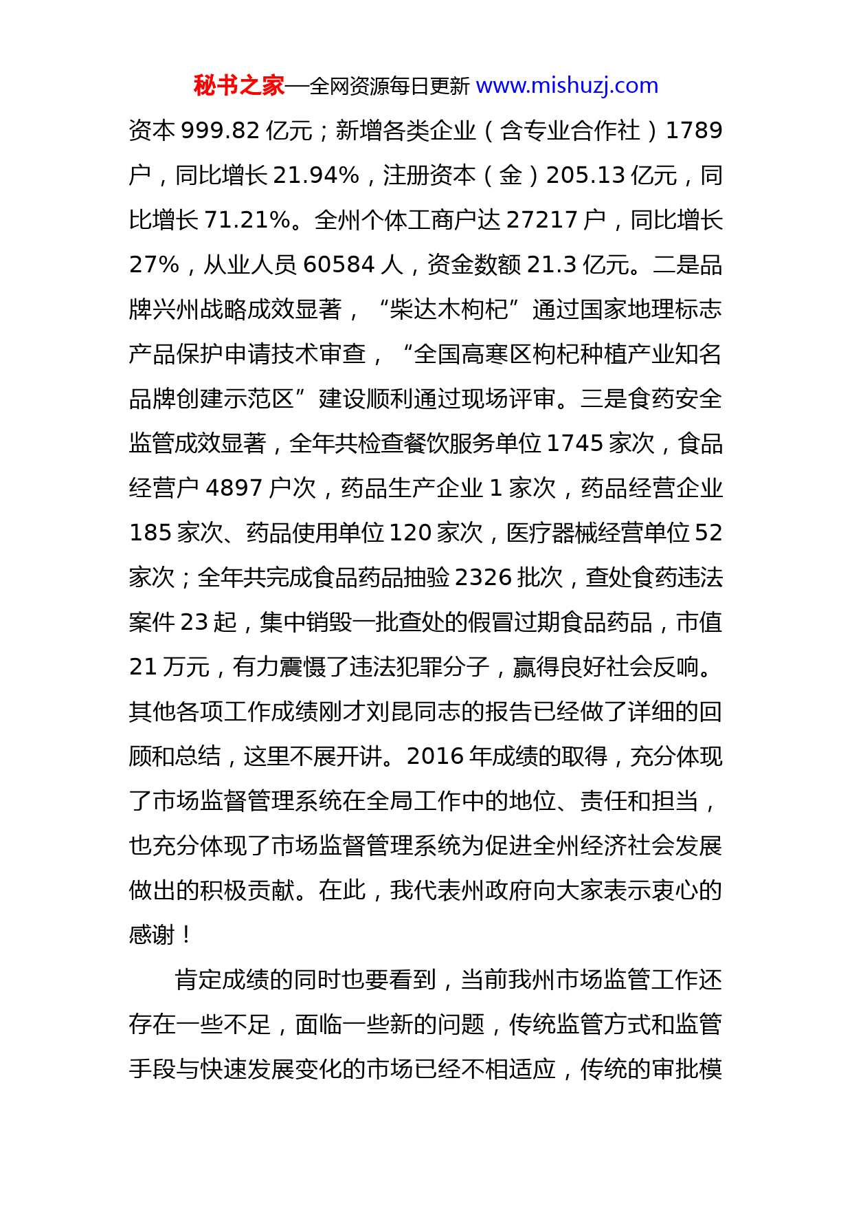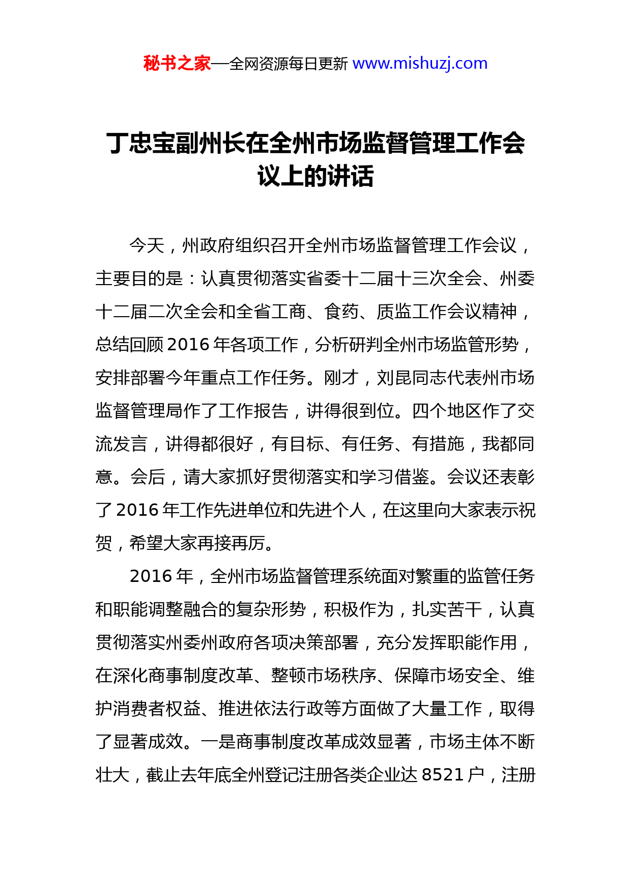 秘书之家—全网资源每日更新www.mishuzj.com丁忠宝副州长在全州市场监督管理工作会议上的讲话今天,州政府组织召开全州市场监督管理工作会议,主要目的是:认真贯彻落实省委十二届十三次全会、州委十二届二次全会和全省工商、食药、质监工作会议精神,总结回顾2016年各项工作,分析研判全州市场监管形势,安排部署今年重点工作任务。刚才,刘昆同志代表州市场监督管理局作了工作报告,讲得很到位。四个地区作了交流发言,讲得都很好,有目标、有任务、有措施,我都同意。会后,请大家抓好贯彻落实和学习借鉴。会议还表彰了2016年工作先进单位和先进个人,在这里向大家表示祝贺,希望大家再接再厉。2016年,全州市场监督管理系统面对繁重的监管任务和职能调整融合的复杂形势,积极作为,扎实苦干,认真贯彻落实州委州政府各项决策部署,充分发挥职能作用,在深化商事制度改革、整顿市场秩序、保障市场安全、维护消费者权益、推进依法行政等方面做了大量工作,取得了显著成效。一是商事制度改革成效显著,市场主体不断壮大,截止去年底全州登记注册各类企业达8521户,注册秘书之家—全网资源每日更新www.mishuzj.com资本999.82亿元;新增各类企业(含专业合作社)1789户,同比增长21.94%,注册资本(金)205.13亿元,同比增长71.21%。全州个体工商户达27217户,同比增长27%,从业人员60584人,资金数额21.3亿元。二是品牌兴州战略成效显著,“柴达木枸杞”通过国家地理标志产品保护申请技术审查,“全国高寒区枸杞种植产业知名品牌创建示范区”建设顺利通过现场评审。三是食药安全监管成效显著,全年共检查餐饮服务单位1745家次,食品经营户4897户次,药品生产企业1家次,药品经营企业185家次、药品使用单位120家次,医疗器械经营单位52家次;全年共完成食品药品抽验2326批次,查处食药违法案件23起,集中销毁一批查处的假冒过期食品药品,市值21万元,有力震慑了违法犯罪分子,赢得良好社会反响。其他各项工作成绩刚才刘昆同志的报告已经做了详细的回顾和总结,这里不展开讲。2016年成绩的取得,充分体现了市场监督管理系统在全局工作中的地位、责任和担当,也充分体现了市场监督管理系统为促进全州经济社会发展做出的积极贡献。在此,我代表州政府向大家表示衷心的感谢!肯定成绩的同时也要看到,当前我州市场监管工作还存在一些不足,面临一些新的问题,传统监管方式和监管手段与快速发展变化的市场已经不相适应,传统的审批模秘书之家—全网资源每日更新www.mishuzj.com式、传统的监管规则、传统的行业监管已经不适应产业融合、跨界发展的趋势,约束新产业、新业态的创新。解决这些问题,关键要解放思想、更新观念,推进市场监管改革与创新,提高市场监管的科学性和有效性。下面,就如何做好新形势下的市场监管工作,我给大家提三点具体要求:一、把握形势,科学分析,正确认识市场监管工作新要求实践证明,市场越发展,经济总量越大,消费市场越活跃,市场监管的责任就越大,要求就越高,任务就越重。目前,市场中还存在不正当竞争和限制竞争、制售假冒伪劣商品、虚假广告误导消费等情况,市场主体事中事后监管措施尚未完全落实到位,制约了规范有序市场秩序的形成。同时,市场监管部门正处在体制调整的“转型期”,科学研判和准确把握面临的形势,突出问题导向和引领作用,对于我们做好新形势下的市场监管工作意义重大。特别是商事制度改革,最大限度释放了“宽进”红利“严管”的责任就显得越重要和紧迫。岁末年初召开的州委十二届二次全体会议以及全省工商、食药、质监工作会议,对加强市场监管工作提出了新的要求。州委十二届二次全体会议中指出,深化商事制度改革,实施“五证合一、一照一码”,全面推行“双随机秘书之家—全网资源每日更新www.mishuzj.com一公开”监督,完善事中事后监管制度;全省工商和市场监管工作会议上提出要全面落实《“十三五”市场监管现代化规划》,以深化商事制度改革为主线,加强事中事后监管,加大消费维权力度,推进市场监管现代化,努力营造良好的市场准入环境、市场竞争环境和市场消费环境,持续释放改革红利,为“大众创业,万众创新”提供新的活力,促进经济平稳健康发展和社会和谐稳定;全省食药工作会议上提出要全面带动和提升食品监管的能力和安全保障水平,要把解决当前问题和建立长效机制结合起来,把加强监管“硬件”建设和提升监管“软件”结合起来,把政府主导和发挥市场作用结合起来,进一步加强组织领导,统筹推进;全省质监工作会议上提出要聚焦与人民群众生产生活息息相关的重点领域和关键环节,创新监管方式和手段,强化质量管理责任,深入开展“质检利剑”等专项质量整治行动,有力打击质量违法行为,在特种设备领域持续开展专项整治。以上要求,既给今年工作指明了方向,同时也是今年工作的主要目标,希望大家认真学习领会,抓好贯彻落实。二、聚焦重点、精准发力,有效扩大市场监管工作新成果做好今年市场监管工作,要坚持稳中求进工作总基调在稳和进上下功夫。稳,就是要巩固和扩大商事制度改革的宏观效应,降秘书之家—全网资源每日更新www.mishuzj.com低市场准入制度性成本,进一步激发市场活力和创造力,保持新设市场主体较快增长、繁荣发展的势头;进,就是要积极