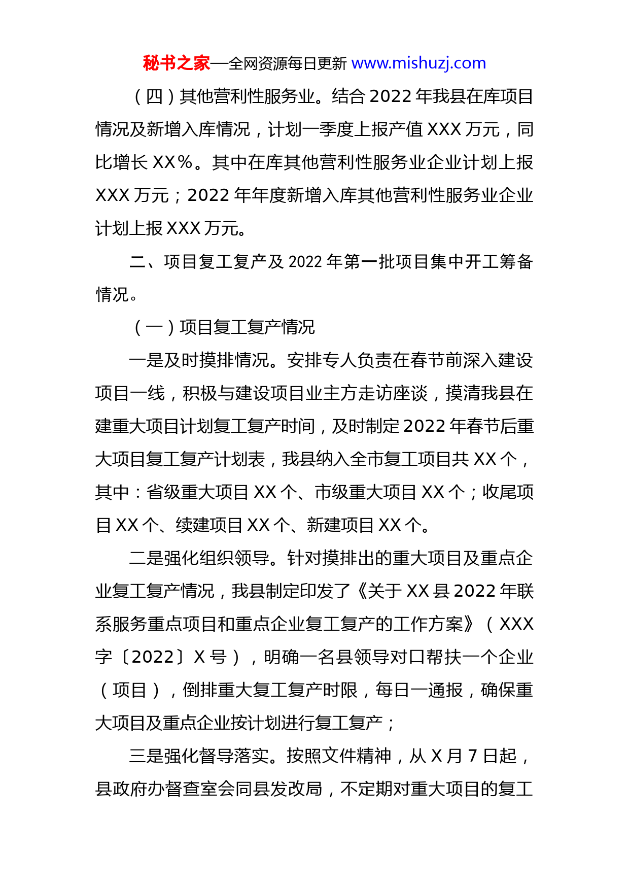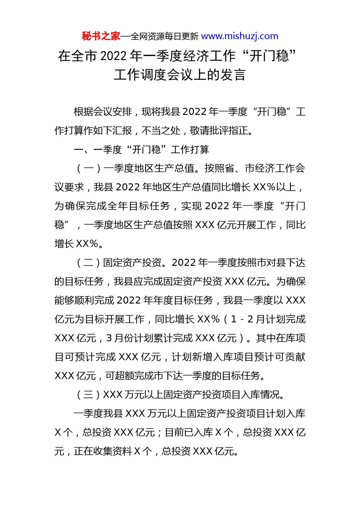 秘书之家—全网资源每日更新www.mishuzj.com在全市2022年一季度经济工作“开门稳”工作调度会议上的发言根据会议安排,现将我县2022年一季度“开门稳”工作打算作如下汇报,不当之处,敬请批评指正。一、一季度“开门稳”工作打算(一)一季度地区生产总值。按照省、市经济工作会议要求,我县2022年地区生产总值同比增长XX%以上,为确保完成全年目标任务,实现2022年一季度“开门稳”,一季度地区生产总值按照XXX亿元开展工作,同比增长XX%。(二)固定资产投资。2022年一季度按照市对县下达的目标任务,我县应完成固定资产投资XXX亿元。为确保能够顺利完成2022年年度目标任务,我县一季度以XXX亿元为目标开展工作,同比增长XX%(1-2月计划完成XXX亿元,3月份计划累计完成XXX亿元)。其中在库项目可预计完成XXX亿元,计划新增入库项目预计可贡献XXX亿元,可超额完成市下达一季度的目标任务。(三)XXX万元以上固定资产投资项目入库情况。一季度我县XXX万元以上固定资产投资项目计划入库X个,总投资XXX亿元;目前已入库X个,总投资XXX亿元,正在收集资料X个,总投资XXX亿元。秘书之家—全网资源每日更新www.mishuzj.com(四)其他营利性服务业。结合2022年我县在库项目情况及新增入库情况,计划一季度上报产值XXX万元,同比增长XX%。其中在库其他营利性服务业企业计划上报XXX万元;2022年年度新增入库其他营利性服务业企业计划上报XXX万元。二、项目复工复产及2022年第一批项目集中开工筹备情况。(一)项目复工复产情况一是及时摸排情况。安排专人负责在春节前深入建设项目一线,积极与建设项目业主方走访座谈,摸清我县在建重大项目计划复工复产时间,及时制定2022年春节后重大项目复工复产计划表,我县纳入全市复工项目共XX个,其中:省级重大项目XX个、市级重大项目XX个;收尾项目XX个、续建项目XX个、新建项目XX个。二是强化组织领导。针对摸排出的重大项目及重点企业复工复产情况,我县制定印发了《关于XX县2022年联系服务重点项目和重点企业复工复产的工作方案》(XXX字〔2022〕X号),明确一名县领导对口帮扶一个企业(项目),倒排重大复工复产时限,每日一通报,确保重大项目及重点企业按计划进行复工复产;三是强化督导落实。按照文件精神,从X月7日起,县政府办督查室会同县发改局,不定期对重大项目的复工秘书之家—全网资源每日更新www.mishuzj.com情况进行督察,对督察发现问题及时跟踪协调解决。要求项目单位(企业)复工复产全面做好常态化疫情防控机制,落实好“外放输入、内防反弹”的工作要求,在组织复工复产过程中做好健康监测、员工防护、工作场所通风、清洁消毒等防控措施,为复工复产营造良好的工作环境。截止X月XX日,我县计划复工的的XX个项目已实现100%复工,其中:X月X日复工X个,X月X日复工XX个,X月XX日复工X个,X月XX日复工XX个,X月XX日复工X个。(二)2022年第一批项目集中开工准备情况。我县拟计划2022年第一批项目集中开工项目X个,总投资XXX亿元,目前项目前期工作均已完成,预计能够按计划进行开工。三、存在问题一是在库项目剩余投资少,投资后劲不足。2022年,我县接转在库项目共XX个总投资XXX亿元(其中房开项目X个总投资XXX亿元,非房开项目XX个总投资XXX亿元),剩余投资XXX亿元(其中房开项目XXX亿元,非房开项目XXX亿元),且由于部分项目均剩设备采购及前期工作费用,项目企业无法提供相关发票,实际剩余可报投资XXX亿元,严重影响投资报数;秘书之家—全网资源每日更新www.mishuzj.com二是新增入库项目少。一季度计划新增入库项目X个,总投资XXX亿元;目前我县在建项目达到入库条件的项目少,且投资在XXX万元以上的只有X个项目,即XX县XX万吨锂离子电池负极材料石墨化加工项目、XX县2021年重点流域农业面源污染治理项目。其中XX县XX万吨锂离子电池负极材料石墨化加工项目有XX个亿的投资,占入库项目总投资XX%以上,且是还在加快进度进行施工,若入库不成功,将严重影响项目入库的投资。三是部分在库项目推进较慢,严重影响投资。受融资政策影响,资金渠道收紧,部分基础设施建设及社会投资项目不同程度受到影响,存在边推进项目边筹措资金的情况,导致项目推进缓慢,个别项目甚至停工多日,严重影响投资报数。如:XX县香山悦景综合体建设项目、XX县年产XXX万平方米铝单板、彩瓷板等新型建材项目等。四、下一步工作打算(一)紧盯目标任务,强化责任落实。紧盯2022年省、市下达的目标任务,结合我县实际,根据2022年在库项目(企业)实际情况,科学的将目标任务数分解到项目、到时间节点,按照一个项目、一名领导、一套推进工作组的方式,强化要素保障,齐抓共管,形成合力,确保完成一季度“开门红”目标任务。(二)狠抓项目服务,强化项目推进。秘书之家—全网资源每日更新www.mishuzj.com一是狠抓复工项目的建设推进。加大与企业(项目)复工复产后续跟踪服务力度,全力补齐生产建设过程中的弱项短板,在交通运输、原材料供给等要素保障方面加大支持协调力度,使企业(项目)尽早实现投产达产。进一步深入企业(项目现场),了解生产建设过程中用工需求,协调推动企业(项目)的人员尽快返岗,加快项目建设进度,解决企业(项目)用工难题,加快推进项目建设、企业生产,尽快形成更多的实物工作量和固定资产投资增量。二是狠抓项目建设生产保障服务。认真摸排