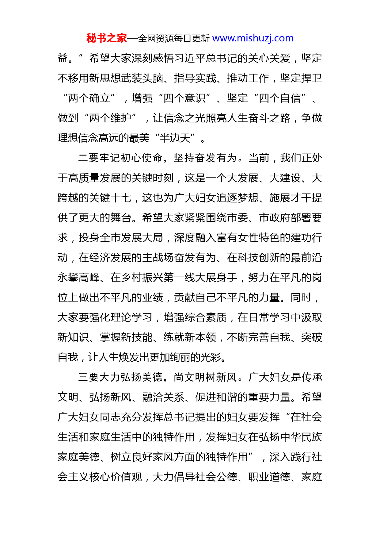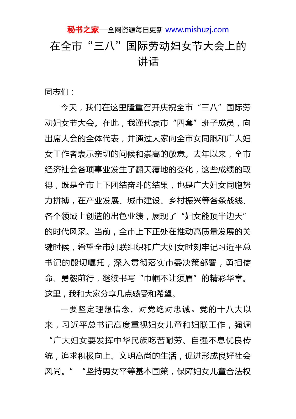 秘书之家—全网资源每日更新www.mishuzj.com在全市“三八”国际劳动妇女节大会上的讲话同志们:今天,我们在这里隆重召开庆祝全市“三八”国际劳动妇女节大会。在此,我谨代表市“四套”班子成员,向出席大会的全体代表,并通过大家向全市女同胞和广大妇女工作者表示亲切的问候和崇高的敬意。去年以来,全市经济社会各项事业发生了翻天覆地的变化,这些成绩的取得,既是全市上下团结奋斗的结果,也是广大妇女同胞努力拼搏,在产业发展、城市建设、乡村振兴等各条战线、各个领域上创造的出色业绩,展现了“妇女能顶半边天”的时代风采。当前,全市上下正处在推动高质量发展的关键时候,希望全市妇联组织和广大妇女时刻牢记习近平总书记的殷切嘱托,深入贯彻落实市委决策部署,勇担使命、勇毅前行,继续书写“巾帼不让须眉”的精彩华章。这里,我和大家分享几点感受和希望。一要坚定理想信念,对党绝对忠诚。党的十八大以来,习近平总书记高度重视妇女儿童和妇联工作,强调“广大妇女要发挥中华民族吃苦耐劳、自强不息优良传统,追求积极向上、文明高尚的生活,促进形成良好社会风尚。”“坚持男女平等基本国策,保障妇女儿童合法权秘书之家—全网资源每日更新www.mishuzj.com益。”希望大家深刻感悟习近平总书记的关心关爱,坚定不移用新思想武装头脑、指导实践、推动工作,坚定捍卫“两个确立”,增强“四个意识”、坚定“四个自信”、做到“两个维护”,让信念之光照亮人生奋斗之路,争做理想信念高远的最美“半边天”。二要牢记初心使命,坚持奋发有为。当前,我们正处于高质量发展的关键时刻,这是一个大发展、大建设、大跨越的关键十七,这也为广大妇女追逐梦想、施展才干提供了更大的舞台。希望大家紧紧围绕市委、市政府部署要求,投身全市发展大局,深度融入富有女性特色的建功行动,在经济发展的主战场奋发有为、在科技创新的最前沿永攀高峰、在乡村振兴第一线大展身手,努力在平凡的岗位上做出不平凡的业绩,贡献自己不平凡的力量。同时,大家要强化理论学习,增强综合素质,在日常学习中汲取新知识、掌握新技能、练就新本领,不断完善自我、突破自我,让人生焕发出更加绚丽的光彩。三要大力弘扬美德,尚文明树新风。广大妇女是传承文明、弘扬新风、融洽关系、促进和谐的重要力量。希望广大妇女同志充分发挥总书记提出的妇女要发挥“在社会生活和家庭生活中的独特作用,发挥妇女在弘扬中华民族家庭美德、树立良好家风方面的独特作用”,深入践行社会主义核心价值观,大力倡导社会公德、职业道德、家庭秘书之家—全网资源每日更新www.mishuzj.com美德、个人品德,在尊老爱幼、邻里团结等方面当好表率,着力建设好家庭、涵养好家教、培育好家风,推动传统美德代代传承。要从自身做起、从点滴做起,当好巾帼志愿者,做文明风尚的传播者、文明行为的践行者。要发挥女性亲和力强、感召力大的优势,积极参与基层治理、矛盾化解、平安建设等工作,帮助群众解难题、纾困难,促进社会大局和谐稳定。四要强化组织领导,凝聚工作合力。妇联作为党领导下的妇女群众组织,是党和政府联系妇女群众的桥梁和纽带,妇女工作是党的群众工作的重要组成部分。各级妇联组织要旗帜鲜明的代表和维护妇女权益,为妇女在维权服务、心里关爱、困难帮扶等方面提供帮助,最大限度解决妇女的烦心事、忧心事,最大限度调动妇女群众的积极性、主动性和创造性,要不断加强自身建设,把妇联组织建设成为妇女信得过、靠得住、离不开的“娘家人”。各级党委、政府要切实加强和改进对妇女工作的领导,及时研究解决妇女工作中的困难问题,全力支持妇联组织依法依章开展工作,努力为广大妇女建功立业、实现人生理想创造有力条件。同时,要切实加强广大妇联干部队伍建设,及时发现储备一批女干部,加大对优秀女干部的培养力度,加大培训教育,突出政治历练、思想淬炼、实践锻炼、专业训练,为更多优秀妇女人才脱颖而出提供更加宽秘书之家—全网资源每日更新www.mishuzj.com广的舞台。