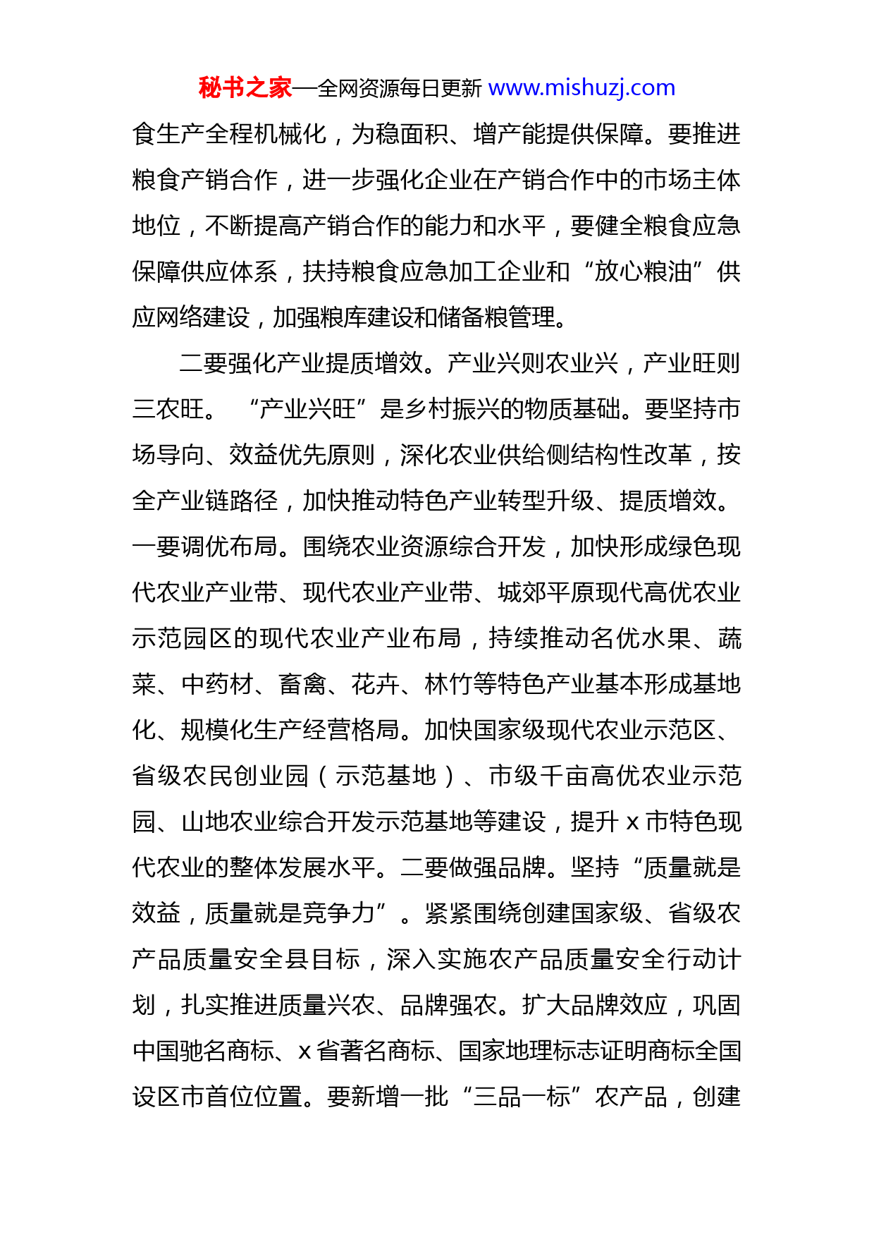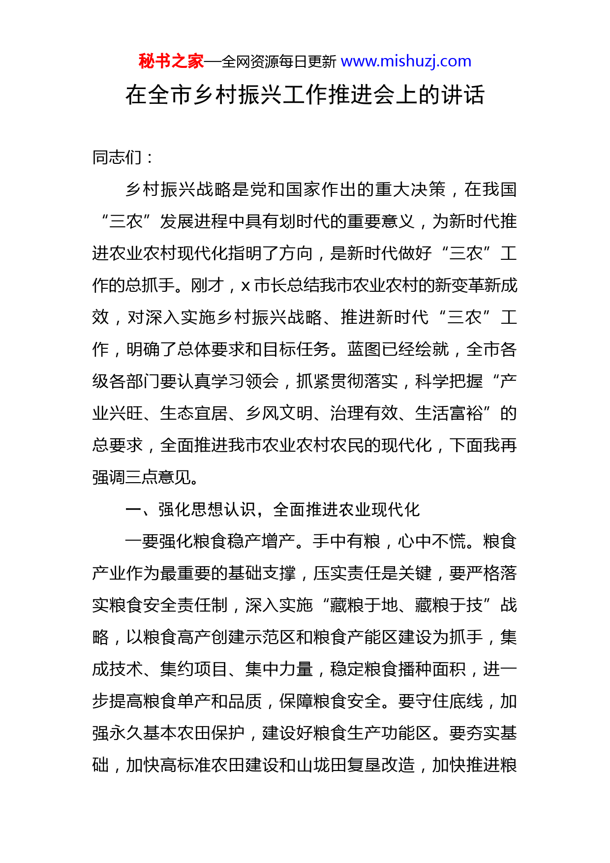 秘书之家—全网资源每日更新www.mishuzj.com在全市乡村振兴工作推进会上的讲话同志们:乡村振兴战略是党和国家作出的重大决策,在我国“三农”发展进程中具有划时代的重要意义,为新时代推进农业农村现代化指明了方向,是新时代做好“三农”工作的总抓手。刚才,x市长总结我市农业农村的新变革新成效,对深入实施乡村振兴战略、推进新时代“三农”工作,明确了总体要求和目标任务。蓝图已经绘就,全市各级各部门要认真学习领会,抓紧贯彻落实,科学把握“产业兴旺、生态宜居、乡风文明、治理有效、生活富裕”的总要求,全面推进我市农业农村农民的现代化,下面我再强调三点意见。一、强化思想认识,全面推进农业现代化一要强化粮食稳产增产。手中有粮,心中不慌。粮食产业作为最重要的基础支撑,压实责任是关键,要严格落实粮食安全责任制,深入实施“藏粮于地、藏粮于技”战略,以粮食高产创建示范区和粮食产能区建设为抓手,集成技术、集约项目、集中力量,稳定粮食播种面积,进一步提高粮食单产和品质,保障粮食安全。要守住底线,加强永久基本农田保护,建设好粮食生产功能区。要夯实基础,加快高标准农田建设和山垅田复垦改造,加快推进粮秘书之家—全网资源每日更新www.mishuzj.com食生产全程机械化,为稳面积、增产能提供保障。要推进粮食产销合作,进一步强化企业在产销合作中的市场主体地位,不断提高产销合作的能力和水平,要健全粮食应急保障供应体系,扶持粮食应急加工企业和“放心粮油”供应网络建设,加强粮库建设和储备粮管理。二要强化产业提质增效。产业兴则农业兴,产业旺则三农旺。“产业兴旺”是乡村振兴的物质基础。要坚持市场导向、效益优先原则,深化农业供给侧结构性改革,按全产业链路径,加快推动特色产业转型升级、提质增效。一要调优布局。围绕农业资源综合开发,加快形成绿色现代农业产业带、现代农业产业带、城郊平原现代高优农业示范园区的现代农业产业布局,持续推动名优水果、蔬菜、中药材、畜禽、花卉、林竹等特色产业基本形成基地化、规模化生产经营格局。加快国家级现代农业示范区、省级农民创业园(示范基地)、市级千亩高优农业示范园、山地农业综合开发示范基地等建设,提升x市特色现代农业的整体发展水平。二要做强品牌。坚持“质量就是效益,质量就是竞争力”。紧紧围绕创建国家级、省级农产品质量安全县目标,深入实施农产品质量安全行动计划,扎实推进质量兴农、品牌强农。扩大品牌效应,巩固中国驰名商标、x省著名商标、国家地理标志证明商标全国设区市首位位置。要新增一批“三品一标”农产品,创建秘书之家—全网资源每日更新www.mishuzj.com一批农产品区域公用品牌,认定一批x名牌农产品,打造一批出口农产品自主品牌,培育一批综合实力强的品牌农业企业,支持各地争创全国知名区域公用品牌和名牌农产品。三要壮大产业。围绕特色产业集聚发展目标,坚持以绿项目带动、龙头牵引、产业集聚、农民增收为基本原则,支持发展“一村一品”,培育发展“一县一业”。进一步延伸农业产业链条,全面提升主导产业和特色产业的发展水平和竞争力,使我市形成主导产业更加突出、特色产业更加鲜明、一二三产更加融合、全产业链更加完整的特色现代农业发展新格局。四要搞活流通。重视发展农产品加工,推动产品精深加工,农产品加工转化率提高到80%以上。加大龙头企业培育和支持力度,引导与合作社、农户建立更为紧密的利益联结机制,带动发展产业化规模化经营。同时,要通过建立产销联盟,强化产销对接,支持发展定制配送、直供直销等流通新模式,推进农超对接、农批对接,发展农村电商,让农产品卖得更好、卖出好价钱。三要强化生态绿色发展。推进农业绿色发展是农业发展观的一场深刻革命。要把绿色发展导向贯穿农业发展全过程,逐步形成与资源环境承载力相匹配、与生产生活生态相协调的生态农业发展格局。一要创新业态。充分发挥生态优势,依托绿水青山、田园风光、乡土文化等独特资秘书之家—全网资源每日更新www.mishuzj.com源,大力发展休闲农业等新产业新业态,支持创建农村一二三产业融合发展试点县,建设一批特色农业小镇,培育一批休闲农业示范基地,将特色产业、生态资源与旅游、文化、康养等深度融合,通过多种方式把农业农村生态文化价值转化为经济效益。二要建立机制。遵循“减量化、再利用、资源化”的原则,推广农业环保技术,改善农业生态环境,提高农业资源利用率,发展生态循环农业,推动农业产业进入可持续发展的良性循环轨道。继续开展化肥农药使用量零增长减量化行动,大力发展节水农业;巩固生猪养殖污染防治成果,严格控制生猪养殖总量;全面推进农业废弃物资源化利用,建立健全农业废弃物资源化利用制度;注重生态富硒富锌产业开发,生产优质生态富硒、富锌农产品。三要完善体系。实施重要生态系统保护和修复工程,严守生态保护红线。落实永久基本农田和城镇开发边界控制,加快创建国家森林城市,加强湿地、天然林等生态保护修复,持续实施造林绿化和开展水土流失治理。二、建立健机制,全面推进农村现代化一是坚持新型城镇化建设。加强城乡结合部和特色乡镇建设,提升综合承载能力,促进城乡一体化