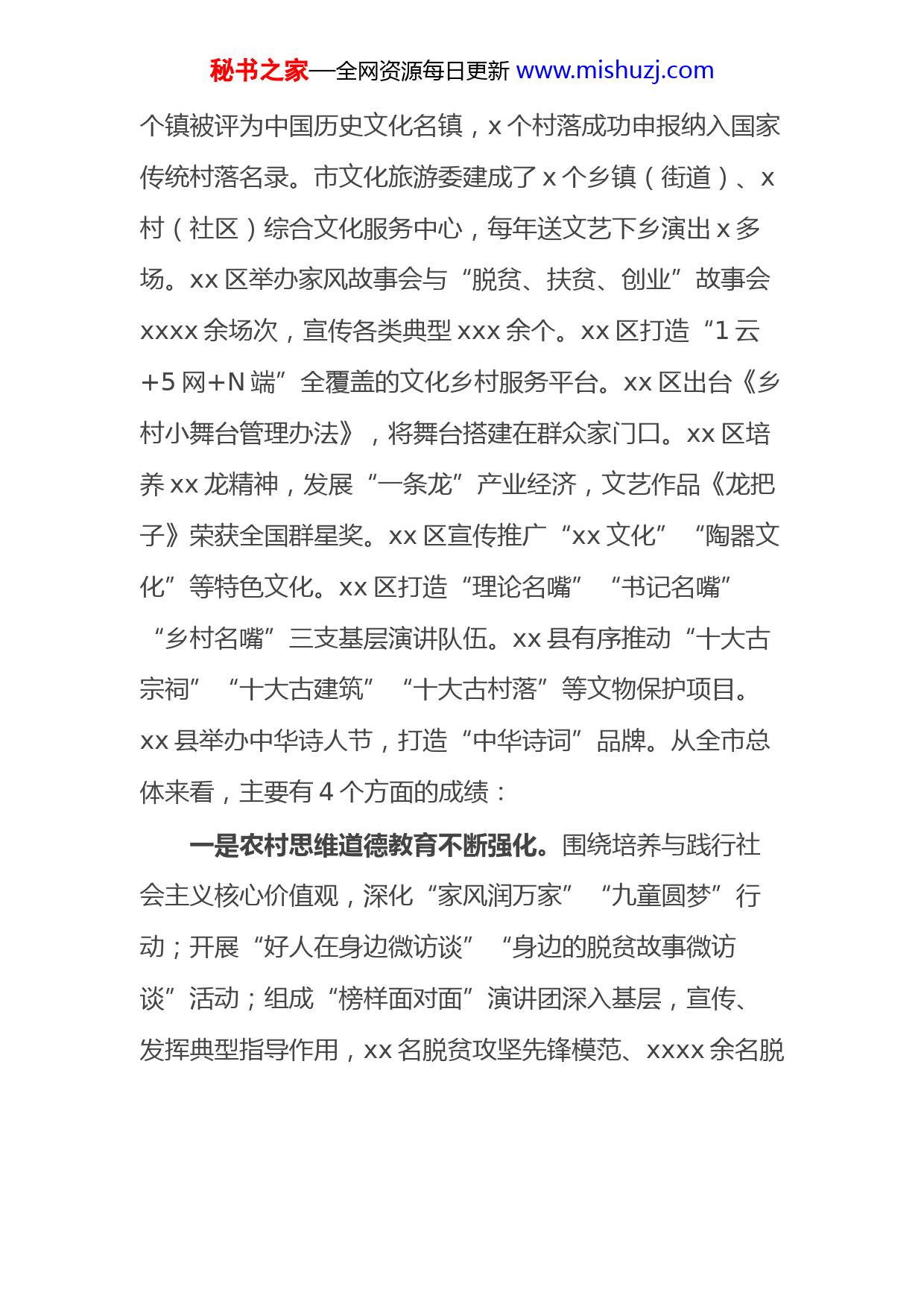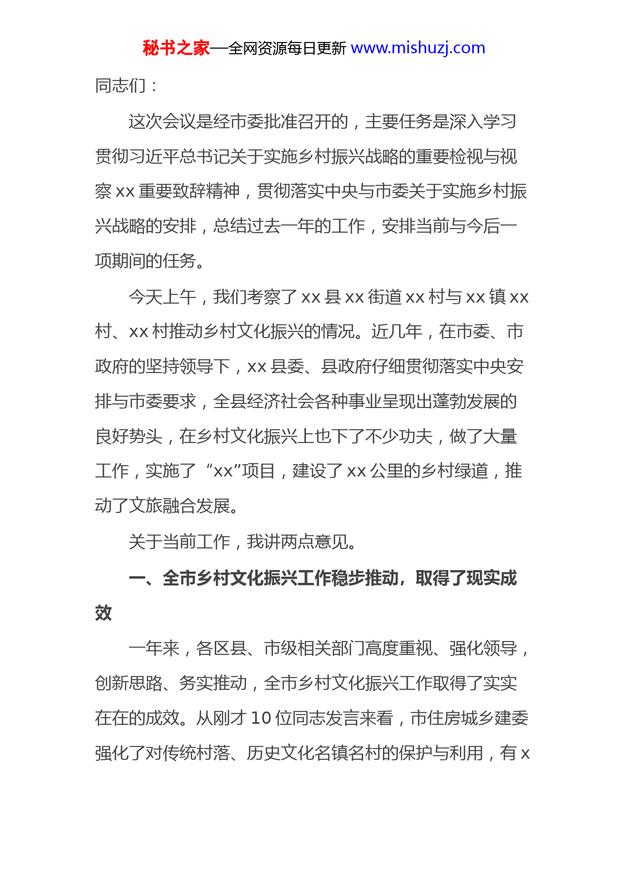 秘书之家—全网资源每日更新www.mishuzj.com同志们:这次会议是经市委批准召开的,主要任务是深入学习贯彻习近平总书记关于实施乡村振兴战略的重要检视与视察xx重要致辞精神,贯彻落实中央与市委关于实施乡村振兴战略的安排,总结过去一年的工作,安排当前与今后一项期间的任务。今天上午,我们考察了xx县xx街道xx村与xx镇xx村、xx村推动乡村文化振兴的情况。近几年,在市委、市政府的坚持领导下,xx县委、县政府仔细贯彻落实中央安排与市委要求,全县经济社会各种事业呈现出蓬勃发展的良好势头,在乡村文化振兴上也下了不少功夫,做了大量工作,实施了“xx”项目,建设了xx公里的乡村绿道,推动了文旅融合发展。关于当前工作,我讲两点意见。一、全市乡村文化振兴工作稳步推动,取得了现实成效一年来,各区县、市级相关部门高度重视、强化领导,创新思路、务实推动,全市乡村文化振兴工作取得了实实在在的成效。从刚才10位同志发言来看,市住房城乡建委强化了对传统村落、历史文化名镇名村的保护与利用,有x秘书之家—全网资源每日更新www.mishuzj.com个镇被评为中国历史文化名镇,x个村落成功申报纳入国家传统村落名录。市文化旅游委建成了x个乡镇(街道)、x村(社区)综合文化服务中心,每年送文艺下乡演出x多场。xx区举办家风故事会与“脱贫、扶贫、创业”故事会xxxx余场次,宣传各类典型xxx余个。xx区打造“1云+5网+N端”全覆盖的文化乡村服务平台。xx区出台《乡村小舞台管理办法》,将舞台搭建在群众家门口。xx区培养xx龙精神,发展“一条龙”产业经济,文艺作品《龙把子》荣获全国群星奖。xx区宣传推广“xx文化”“陶器文化”等特色文化。xx区打造“理论名嘴”“书记名嘴”“乡村名嘴”三支基层演讲队伍。xx县有序推动“十大古宗祠”“十大古建筑”“十大古村落”等文物保护项目。xx县举办中华诗人节,打造“中华诗词”品牌。从全市总体来看,主要有4个方面的成绩:一是农村思维道德教育不断强化。围绕培养与践行社会主义核心价值观,深化“家风润万家”“九童圆梦”行动;开展“好人在身边微访谈”“身边的脱贫故事微访谈”活动;组成“榜样面对面”演讲团深入基层,宣传、发挥典型指导作用,xx名脱贫攻坚先锋模范、xxxx余名脱秘书之家—全网资源每日更新www.mishuzj.com贫攻坚身边榜样,累计演讲xxxx场次,直接受众近xx万人次。二是乡村移风易俗治理切实有效。开展移风易俗“十抵制十提倡”,推动婚丧礼俗整理、乡村环境美化、封建迷信治理、敬老孝老等系列主题行动,举办“新农村新生活”培训,开展生活本领。大赛、文明礼仪竞赛,编发“文明习惯养成”手册,开展“清洁户”评选。大力开展“孝善xx”主题活动,调解、处理不孝父母案件数百起,劝阻大操大办、违规敛财婚丧礼俗等行为千余起,无事办酒、大操大办等突出问题得到有效遏制。三是乡村文化供给逐步优化。着眼打通公共文化服务“最后一公里”,强化乡村文化供给升级,提高了一批综合文化服务中心,新建了一批农村电影室内固定放映厅,创作了一批农村题材文艺节目,开展了一批文化进基层活动,群众文化获得感不断增强。同时,创新推进基层“互联网+文化”,xx文旅云上线,公共数字文化新增家庭用户xxx多万,“科普文化云”覆盖全市xx个区县xxx个服务点位,“群众文化云”新开通xxxx多个镇街基层文化中心服务平台,实现和市内外相关公共文化单位对接,访问量xxxx多万次。秘书之家—全网资源每日更新www.mishuzj.com四是优秀乡土文化保护利用取得实效。开展乡村不可移动资源调查,推动深度贫困乡镇文物保护,命名了一批市级非遗生产性保护示范基地,打造了一批乡村文化乐园,实施了一批乡村文旅融合工程,乡土文化活力逐步焕发。看到成绩的同时,我们也要清醒地看到仍存在不少问题,主要体如今这几个方面:一是群众的主体作用不强,存在“政府干、群众看”的现象;二是综合文化服务中心尚未实现全覆盖,还有x个乡镇街道、x个村社区没有建设;三是乡村人才队伍缺失,一些乡镇文化站运行与发挥作用欠佳;四是乡村文化振兴投入渠道比较单一,缺口比较大;五是文化产品供给比较单一,群众文化生活的获得感欠缺。在今后的工作当中,要坚强问题导向,切实解决好这些问题。二、坚强求实创新,推进乡村文化振兴实现更高质量发展推进乡村文化振兴,总的要求是要深入学习贯彻习近平总书记关于实施乡村振兴战略的重要检视与视察xx重要致辞精神,落实市委实施乡村振兴战略工作领导小组会议与陈敏尔书记的致辞精神,立足xx高质量发展的新起点、秘书之家—全网资源每日更新www.mishuzj.com新要求,坚定文化自信、增强文化自觉,着力实施乡村文化振兴“四大行动”,奋力推进乡村焕发乡风文明新气象。(一)切实丰富农民群众的精神文化生活,不断提高基层群众的文化获得感、精神幸福感。推进乡村文化振兴的着力点与根本点,就是不断满足农民群众对精神文化生活的新需求,这是坚强以人民为中心的发展思维的具体体现。一要大力推动文化下乡。习近平总书记指出,走中国特色社会主义乡村振兴公路,必须重塑城乡关系,走城乡融合发展之路,坚强以工补农、以城带乡。要学习乌兰牧骑精神,组织文艺小分队,采取“轻骑兵”方式,精心排练杂技、歌曲、小型舞蹈、曲艺