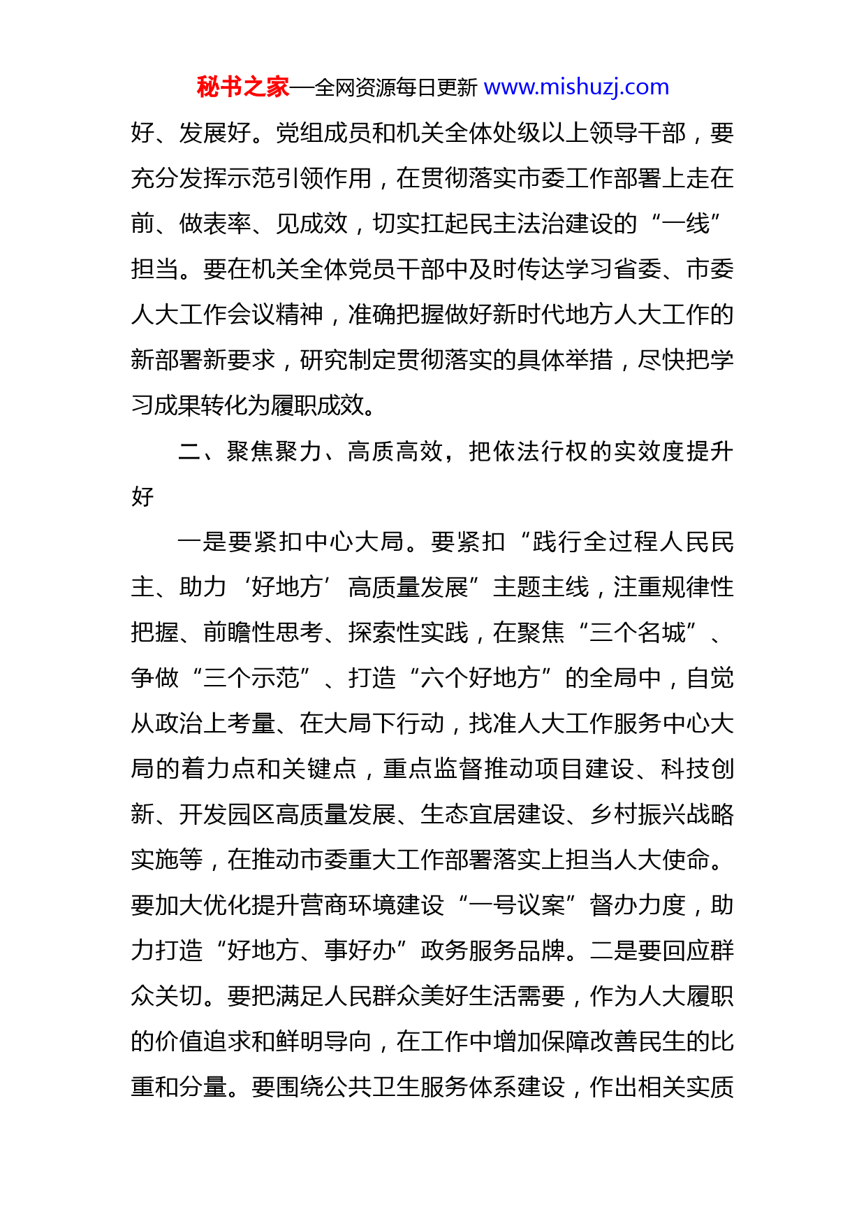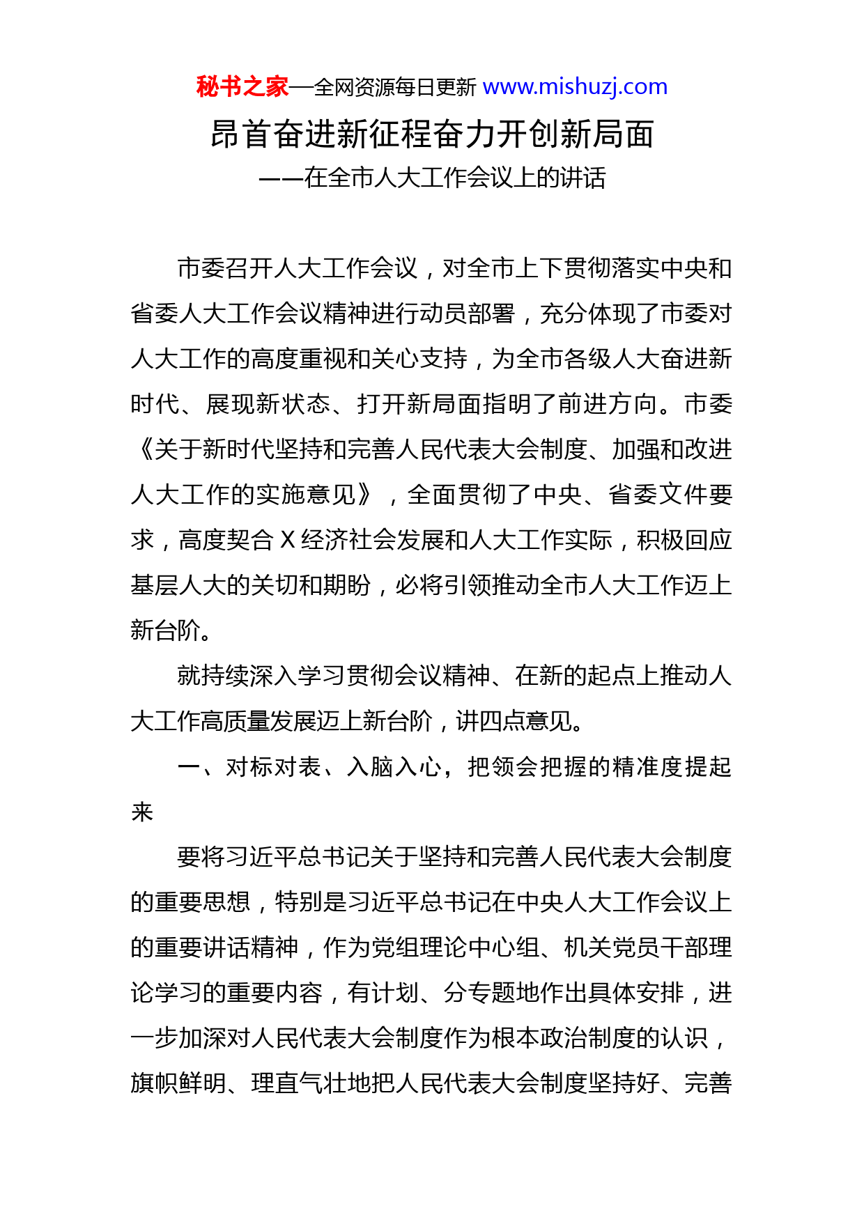 秘书之家—全网资源每日更新www.mishuzj.com昂首奋进新征程奋力开创新局面——在全市人大工作会议上的讲话市委召开人大工作会议,对全市上下贯彻落实中央和省委人大工作会议精神进行动员部署,充分体现了市委对人大工作的高度重视和关心支持,为全市各级人大奋进新时代、展现新状态、打开新局面指明了前进方向。市委《关于新时代坚持和完善人民代表大会制度、加强和改进人大工作的实施意见》,全面贯彻了中央、省委文件要求,高度契合X经济社会发展和人大工作实际,积极回应基层人大的关切和期盼,必将引领推动全市人大工作迈上新台阶。就持续深入学习贯彻会议精神、在新的起点上推动人大工作高质量发展迈上新台阶,讲四点意见。一、对标对表、入脑入心,把领会把握的精准度提起来要将习近平总书记关于坚持和完善人民代表大会制度的重要思想,特别是习近平总书记在中央人大工作会议上的重要讲话精神,作为党组理论中心组、机关党员干部理论学习的重要内容,有计划、分专题地作出具体安排,进一步加深对人民代表大会制度作为根本政治制度的认识,旗帜鲜明、理直气壮地把人民代表大会制度坚持好、完善秘书之家—全网资源每日更新www.mishuzj.com好、发展好。党组成员和机关全体处级以上领导干部,要充分发挥示范引领作用,在贯彻落实市委工作部署上走在前、做表率、见成效,切实扛起民主法治建设的“一线”担当。要在机关全体党员干部中及时传达学习省委、市委人大工作会议精神,准确把握做好新时代地方人大工作的新部署新要求,研究制定贯彻落实的具体举措,尽快把学习成果转化为履职成效。二、聚焦聚力、高质高效,把依法行权的实效度提升好一是要紧扣中心大局。要紧扣“践行全过程人民民主、助力‘好地方’高质量发展”主题主线,注重规律性把握、前瞻性思考、探索性实践,在聚焦“三个名城”、争做“三个示范”、打造“六个好地方”的全局中,自觉从政治上考量、在大局下行动,找准人大工作服务中心大局的着力点和关键点,重点监督推动项目建设、科技创新、开发园区高质量发展、生态宜居建设、乡村振兴战略实施等,在推动市委重大工作部署落实上担当人大使命。要加大优化提升营商环境建设“一号议案”督办力度,助力打造“好地方、事好办”政务服务品牌。二是要回应群众关切。要把满足人民群众美好生活需要,作为人大履职的价值追求和鲜明导向,在工作中增加保障改善民生的比重和分量。要围绕公共卫生服务体系建设,作出相关实质秘书之家—全网资源每日更新www.mishuzj.com性决议,以法治方式夯实疫情防控底板底线,保障人民群众身体健康和生命安全。要深化政府民生实事项目实施情况工作评议,高质量推进“15分钟养老服务圈”建设、农村住房条件改善、促进就业工作等专题调研,切实推动解决人民群众的操心事、烦心事、揪心事。三是要助推法治建设。要坚持科学立法、民主立法、依法立法,有序推进城市书房条例、扬尘污染防治条例、大运河X段文化遗产保护条例等制定工作,认真做好农贸市场管理条例、河道管理条例修改工作,努力为高质量发展提供有效制度供给。要进一步深化执法检查工作,既紧扣法律条文找问题提建议,又对照问题清单促整改求实效,充分发挥“法律巡视”监督利剑作用。要切实加强对“一府一委两院”依法行政、依法监察、公正司法的监督检查,确保行政权、监察权、审判权、检察权依法正确行使。三、创新创优、务实靠实,把积极工作的精气神鼓起来一是要推动重大理念落地生根。要以工作举措和工作机制的优化创新,把践行全过程人民民主重大理念,以项目化、案例化方式具体地、现实地贯穿落实到人大工作的全过程、各方面。立法工作中,要积极运用基层立法联系点、立法征集意见平台等,直接听取人民群众的意见建议,健全完善意见采纳反馈机制,努力寻求立法“最大公秘书之家—全网资源每日更新www.mishuzj.com约数”;监督工作中,要扩大代表和群众对执法检查、调研、审议、询问、评议等工作的参与度,健全吸纳民意、汇集民智工作机制;代表工作中,要深化拓展人大代表与选民“统一见面日”活动,进一步提升人大代表“家、站、点”运行质效,不断丰富人大代表联系人民群众的内容和形式,搭建更多民主民意表达平台载体。二是要提高地方立法质量效率。要充分发挥人大主导作用,严格实施立法公开征集意见工作办法、立法专家顾问工作办法等,以制度机制保障提升立法质效。要发挥地方立法对经济社会发展的引领推动作用,落实“小快灵”立法要求,打造更多如公园管理条例一样具有原创性、引领性、标志性的立法成果,着力彰显X特色、确保务实管用。三是要增强监督工作刚性实效。要围绕民生保障、产业建设、乡村振兴、生态保护、文旅共兴等重点工作,精心组织开展专项审议、工作评议、履职评议、专题询问、执法检查等,清单式、项目化交办督办审议(评议)意见,并对落实情况开展满意度测评,在实施正确监督、有效监督、依法监督中,提升监督工作的质效。要加强对人大选举和任命人员的监督,有序实施员额法官、员额检察官履职评议,督促依法履职、公正司法。要强化经济监督、预算审查监督、政府债务审查监督、审计查出问题