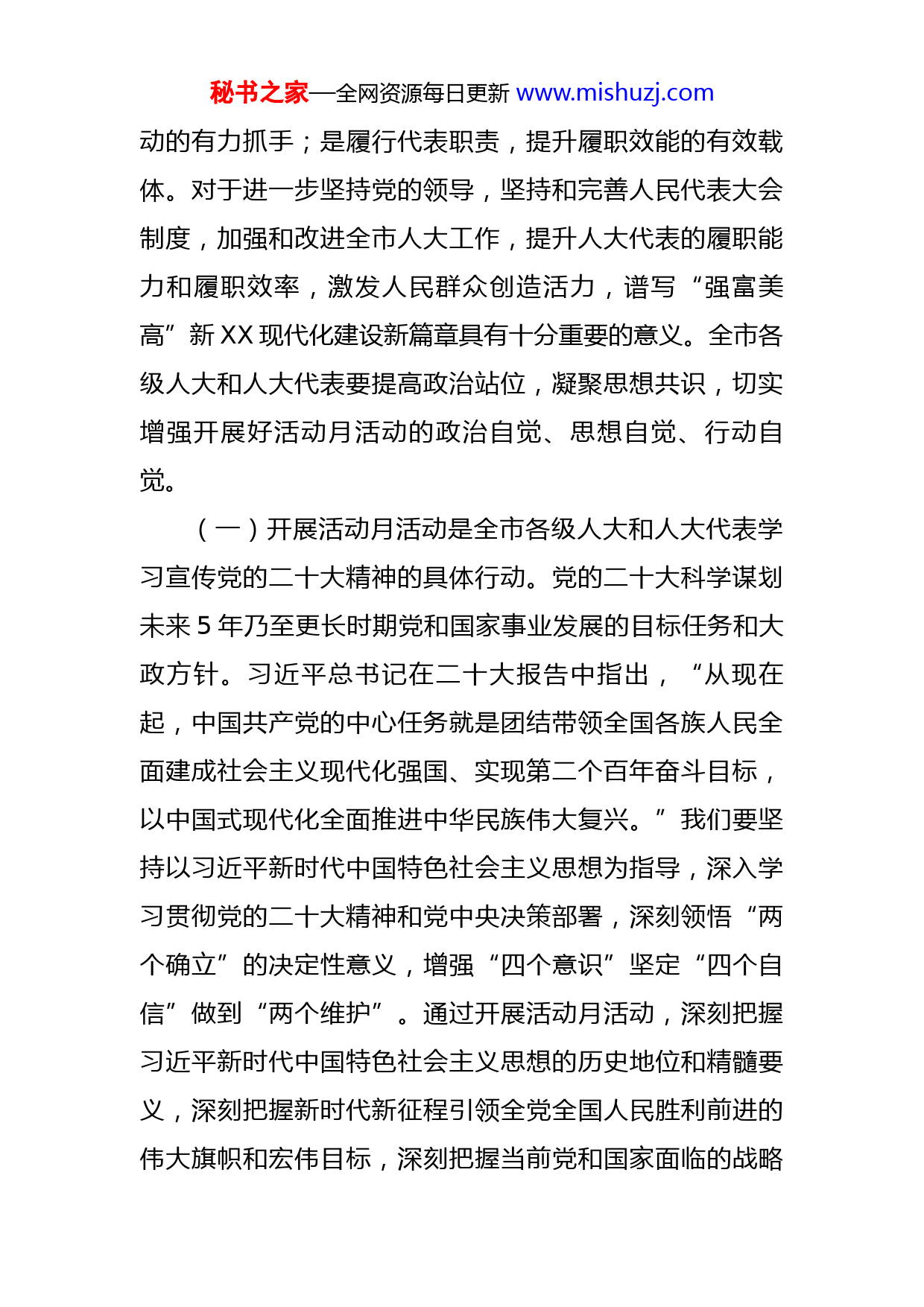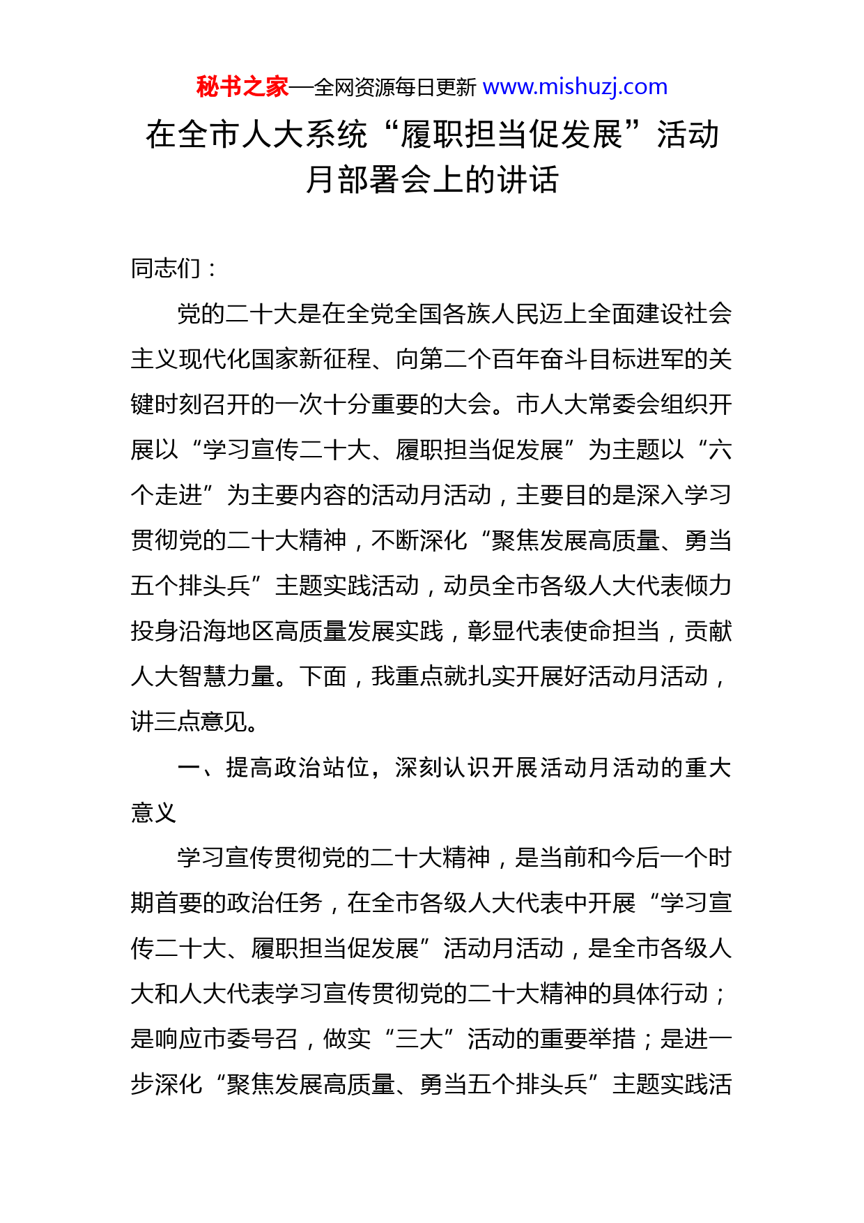 秘书之家—全网资源每日更新www.mishuzj.com在全市人大系统“履职担当促发展”活动月部署会上的讲话同志们:党的二十大是在全党全国各族人民迈上全面建设社会主义现代化国家新征程、向第二个百年奋斗目标进军的关键时刻召开的一次十分重要的大会。市人大常委会组织开展以“学习宣传二十大、履职担当促发展”为主题以“六个走进”为主要内容的活动月活动,主要目的是深入学习贯彻党的二十大精神,不断深化“聚焦发展高质量、勇当五个排头兵”主题实践活动,动员全市各级人大代表倾力投身沿海地区高质量发展实践,彰显代表使命担当,贡献人大智慧力量。下面,我重点就扎实开展好活动月活动,讲三点意见。一、提高政治站位,深刻认识开展活动月活动的重大意义学习宣传贯彻党的二十大精神,是当前和今后一个时期首要的政治任务,在全市各级人大代表中开展“学习宣传二十大、履职担当促发展”活动月活动,是全市各级人大和人大代表学习宣传贯彻党的二十大精神的具体行动;是响应市委号召,做实“三大”活动的重要举措;是进一步深化“聚焦发展高质量、勇当五个排头兵”主题实践活秘书之家—全网资源每日更新www.mishuzj.com动的有力抓手;是履行代表职责,提升履职效能的有效载体。对于进一步坚持党的领导,坚持和完善人民代表大会制度,加强和改进全市人大工作,提升人大代表的履职能力和履职效率,激发人民群众创造活力,谱写“强富美高”新XX现代化建设新篇章具有十分重要的意义。全市各级人大和人大代表要提高政治站位,凝聚思想共识,切实增强开展好活动月活动的政治自觉、思想自觉、行动自觉。(一)开展活动月活动是全市各级人大和人大代表学习宣传党的二十大精神的具体行动。党的二十大科学谋划未来5年乃至更长时期党和国家事业发展的目标任务和大政方针。习近平总书记在二十大报告中指出,“从现在起,中国共产党的中心任务就是团结带领全国各族人民全面建成社会主义现代化强国、实现第二个百年奋斗目标,以中国式现代化全面推进中华民族伟大复兴。”我们要坚持以习近平新时代中国特色社会主义思想为指导,深入学习贯彻党的二十大精神和党中央决策部署,深刻领悟“两个确立”的决定性意义,增强“四个意识”坚定“四个自信”做到“两个维护”。通过开展活动月活动,深刻把握习近平新时代中国特色社会主义思想的历史地位和精髓要义,深刻把握新时代新征程引领全党全国人民胜利前进的伟大旗帜和宏伟目标,深刻把握当前党和国家面临的战略秘书之家—全网资源每日更新www.mishuzj.com机遇和风险挑战,深刻把握过去5年取得的重大成就和新时代10年的伟大变革。活动月活动启动后,迅速掀起学习宣传贯彻党的二十大精神的热潮,把思想和行动统一到实现党的二十大确定的各项目标任务上来,按照中央和省市委统一部署,坚决扛起政治责任,扎实有序推进落实,确保党的二十大精神在全市人大系统和人大代表中得到充分体现和贯彻落实。(二)开展活动月活动是紧扣市委中心工作服务高质量发展大局的重要举措。省委对XX工作提出了勇当沿海地区高质量发展排头兵的明确要求,市委八届三次全会确定了打造“国际湿地、沿海绿城”,建设绿色生态之城、绿色制造之城、绿色能源之城、绿色宜居之城的发展目标,市委部署在全市开展“企业大走访、项目大推进、产业大招商”活动。开展活动月活动,将进一步科学认识、精准把握人大在助力勇当沿海地区高质量发展排头兵的目标定位和实现路径,在全市大局中思考谋划人大工作,更好发挥人大职能作用,切实增强人大履职实效。同时发挥人大优势,结合代表自身情况,开展“三大活动”,紧扣工业经济、绿色低碳、改革开放、城乡融合、安全发展、民生改善等重点领域,找准人大工作的切入点、着力点和结合点,动员全市各级人大代表坚持一线站位、锚定一流标准、争创一流业绩,积极履职尽责,投身宏伟实践,在助秘书之家—全网资源每日更新www.mishuzj.com力经济社会高质量发展和改革攻坚任务中担当作为,建功立业。(三)开展活动月活动是进一步深化“聚焦发展高质量勇当五个排头兵”主题实践活动的有力抓手。市人大常委会围绕省委对XX“勇当沿海地区高质量发展排头兵”的工作定位,在全市五级人大代表中开展“聚焦发展高质量、勇当五个排头兵”主题实践活动动员和组织各级人大代表积极投身宏伟实践,勇当推动绿色发展排头兵、法治XX建设排头兵、爱岗敬业奉献排头兵、密切联系群众排头兵、引领道德风尚排头兵。活动开展以来,广大代表立足自身岗位,在各条战线上争先锋作表率,充分彰显了人大代表的责任担当,主题实践活动取得了明显成效,得到了全国人大有关部门、省人大常委会和市委的充分肯定,在全社会引起了积极反响。我们开展“学习宣传二十大、履职担当促发展”活动月活动,立足站稳继往开来的时代方位,对标党的二十大精神,对标省委赋予XX的责任使命,对标市委全会确定的目标任务,以更实举措动员组织全市各级人大代表投身改革发展的深度实践,凝聚激发各方面积极性主动性创造性,推进法治XX建设,增进人民群众福祉,助力全市经济社会高质量发展,持续推动“五个排头兵”主题实践活动走深走实。(四)开展活动月活动是提高代