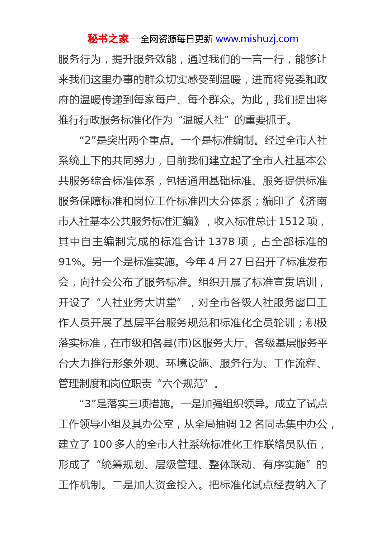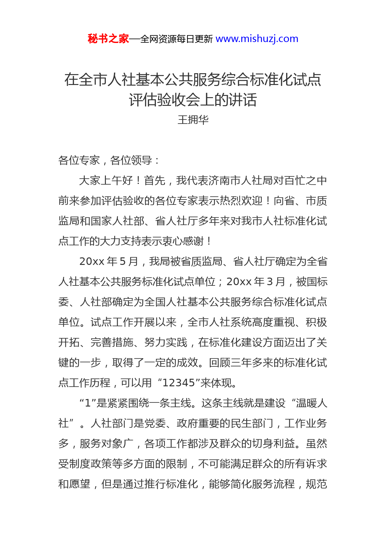 秘书之家—全网资源每日更新www.mishuzj.com在全市人社基本公共服务综合标准化试点评估验收会上的讲话王拥华各位专家,各位领导:大家上午好!首先,我代表济南市人社局对百忙之中前来参加评估验收的各位专家表示热烈欢迎!向省、市质监局和国家人社部、省人社厅多年来对我市人社标准化试点工作的大力支持表示衷心感谢!20xx年5月,我局被省质监局、省人社厅确定为全省人社基本公共服务标准化试点单位;20xx年3月,被国标委、人社部确定为全国人社基本公共服务综合标准化试点单位。试点工作开展以来,全市人社系统高度重视、积极开拓、完善措施、努力实践,在标准化建设方面迈出了关键的一步,取得了一定的成效。回顾三年多来的标准化试点工作历程,可以用“12345”来体现。“1”是紧紧围绕一条主线。这条主线就是建设“温暖人社”。人社部门是党委、政府重要的民生部门,工作业务多,服务对象广,各项工作都涉及群众的切身利益。虽然受制度政策等多方面的限制,不可能满足群众的所有诉求和愿望,但是通过推行标准化,能够简化服务流程,规范秘书之家—全网资源每日更新www.mishuzj.com服务行为,提升服务效能,通过我们的一言一行,能够让来我们这里办事的群众切实感受到温暖,进而将党委和政府的温暖传递到每家每户、每个群众。为此,我们提出将推行行政服务标准化作为“温暖人社”的重要抓手。“2”是突出两个重点。一个是标准编制。经过全市人社系统上下的共同努力,目前我们建立起了全市人社基本公共服务综合标准体系,包括通用基础标准、服务提供标准服务保障标准和岗位工作标准四大分体系;编印了《济南市人社基本公共服务标准汇编》,收入标准总计1512项,其中自主编制完成的标准合计1378项,占全部标准的91%。另一个是标准实施。今年4月27日召开了标准发布会,向社会公布了服务标准。组织开展了标准宣贯培训,开设了“人社业务大讲堂”,对全市各级人社服务窗口工作人员开展了基层平台服务规范和标准化全员轮训;积极落实标准,在市级和各县(市)区服务大厅、各级基层服务平台大力推行形象外观、环境设施、服务行为、工作流程、管理制度和岗位职责“六个规范”。“3”是落实三项措施。一是加强组织领导。成立了试点工作领导小组及其办公室,从全局抽调12名同志集中办公,建立了100多人的全市人社系统标准化工作联络员队伍,形成了“统筹规划、层级管理、整体联动、有序实施”的工作机制。二是加大资金投入。把标准化试点经费纳入了秘书之家—全网资源每日更新www.mishuzj.com年度财政预算,其中标准化试点工作经费750万元,基层平台规范化考核经费1200万元,三年来共投入3000多万元。三是严格检查考核。印发了《考核意见(试行)》,建立了考核机制,定期不定期进行督促检查,特别加强了对基本公共服务情况和群众满意度等内容的考核,起到了很好的杠杆作用。“4”是体现了四个特点。一是业务全覆盖,体现了综合性。标准化试点涵盖了公共就业、社会保险、人才队伍、人事管理、劳动关系协调等全部人社业务。二是四级联动体现了系统性。将市、县(市)区、乡镇(街道)和村居四级贯通,各项标准由各级人社部门统一采用,实现了制度统一标准统一、管理统一、执行统一。三是三化融合,体现了创新性。走出了以标准化为基础、信息化为支撑、思想文化为引领的试点工作新路子。四是全员参与,体现了实践性。按照“写我所干、干我所写”原则,组织系统全体人员编制实施标准,整个过程实行逐人逐级签字,一级对一级负责,确保人人参与、人人践行。“5”是取得五点成效。一是优化了服务环境。通过试点统一规范了各级服务窗口的形象外观和环境设施,为百姓办事营造了温暖的氛围,工作人员精神面貌焕然一新,管理服务更加规范有序,群众办事更加方便快捷。二是提升了服务效能。通过试点,规范了办事流程,压缩了办事时秘书之家—全网资源每日更新www.mishuzj.com限、精简了办事环节、减少了办事手续、创新了办事手段特别对46项业务进行了最大限度的提速,平均办理时限缩短了近40%,部分业务实现了即时办结。三是转变了服务方式。服务标准就像“尺子”、“模具”一样,把每一项业务的办理流程“框”起来、固定下来,减少或避免了过去服务工作的随意性和盲目性,实现了由经验型服务向标准化服务、由人治管理到法治管理的转变。四是打造了专业化队伍。系统上下按标准履职、按标准办事、按标准服务的自觉性和主动性有了很大提高,培养了一批高素质的标准化专业人才,造就了一支精干稳定的标准化工作队伍五是探索了服务型政府建设路径。标准化试点工作不仅优化了服务流程,提高了服务效率,更重要的是推进了政府服务的制度创新,为建设服务型政府做出了有益探索。对此,国标委、人社部和市委市政府主要领导、分管领导给予了肯定。今年春节后的第一个工作日,省委常委、市委书记王文涛到市社保服务大厅视察,提出“温暖、简便、规范”三个要求,从规范的角度要求把标准化搞好。10月22日,国务院参事张纲、国标委副主任崔钢来济调研,认为:济南市人力资源社会保障局作为一个部门,以标准化为基础,以信息化为支撑,以思想文化为引领,深化“温暖人社”建设,是落实党的十八届三中全会有