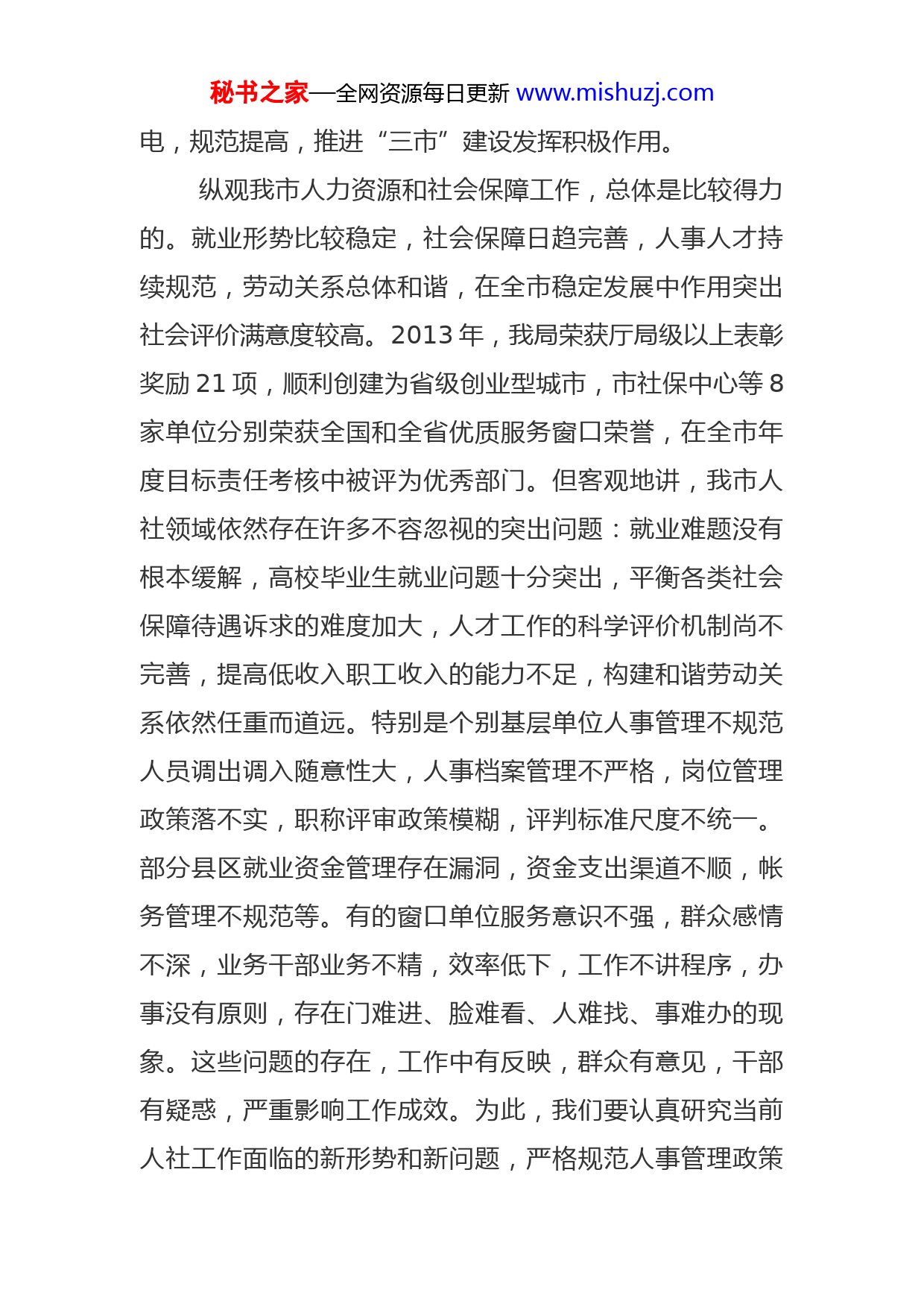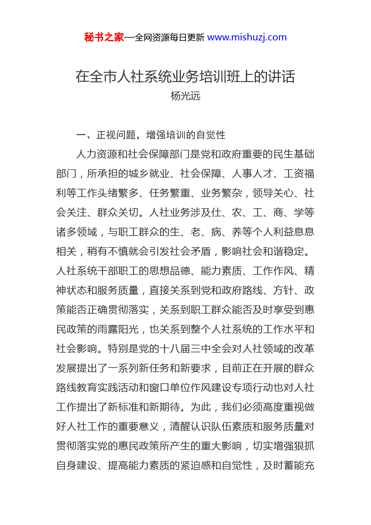 秘书之家—全网资源每日更新www.mishuzj.com在全市人社系统业务培训班上的讲话杨光远一、正视问题,增强培训的自觉性人力资源和社会保障部门是党和政府重要的民生基础部门,所承担的城乡就业、社会保障、人事人才、工资福利等工作头绪繁多、任务繁重、业务繁杂,领导关心、社会关注、群众关切。人社业务涉及仕、农、工、商、学等诸多领域,与职工群众的生、老、病、养等个人利益息息相关,稍有不慎就会引发社会矛盾,影响社会和谐稳定。人社系统干部职工的思想品德、能力素质、工作作风、精神状态和服务质量,直接关系到党和政府路线、方针、政策能否正确贯彻落实,关系到职工群众能否及时享受到惠民政策的雨露阳光,也关系到整个人社系统的工作水平和社会影响。特别是党的十八届三中全会对人社领域的改革发展提出了一系列新任务和新要求,目前正在开展的群众路线教育实践活动和窗口单位作风建设专项行动也对人社工作提出了新标准和新期待。为此,我们必须高度重视做好人社工作的重要意义,清醒认识队伍素质和服务质量对贯彻落实党的惠民政策所产生的重大影响,切实增强狠抓自身建设、提高能力素质的紧迫感和自觉性,及时蓄能充秘书之家—全网资源每日更新www.mishuzj.com电,规范提高,推进“三市”建设发挥积极作用。纵观我市人力资源和社会保障工作,总体是比较得力的。就业形势比较稳定,社会保障日趋完善,人事人才持续规范,劳动关系总体和谐,在全市稳定发展中作用突出社会评价满意度较高。2013年,我局荣获厅局级以上表彰奖励21项,顺利创建为省级创业型城市,市社保中心等8家单位分别荣获全国和全省优质服务窗口荣誉,在全市年度目标责任考核中被评为优秀部门。但客观地讲,我市人社领域依然存在许多不容忽视的突出问题:就业难题没有根本缓解,高校毕业生就业问题十分突出,平衡各类社会保障待遇诉求的难度加大,人才工作的科学评价机制尚不完善,提高低收入职工收入的能力不足,构建和谐劳动关系依然任重而道远。特别是个别基层单位人事管理不规范人员调出调入随意性大,人事档案管理不严格,岗位管理政策落不实,职称评审政策模糊,评判标准尺度不统一。部分县区就业资金管理存在漏洞,资金支出渠道不顺,帐务管理不规范等。有的窗口单位服务意识不强,群众感情不深,业务干部业务不精,效率低下,工作不讲程序,办事没有原则,存在门难进、脸难看、人难找、事难办的现象。这些问题的存在,工作中有反映,群众有意见,干部有疑惑,严重影响工作成效。为此,我们要认真研究当前人社工作面临的新形势和新问题,严格规范人事管理政策秘书之家—全网资源每日更新www.mishuzj.com全面落实公开招聘制度,加快推进事业单位改革步伐,建立健全岗位动态管理机制,狠抓专业人才队伍建设,深化分类职称制度改革,推进引智成果共享体系建设,努力营造干部充满活力、人才不断涌现、创新智慧竞相迸发的生动局面。为搞好本次培训,局党组多次进行专题研究,组织相关科室和单位进行了精心筹备,授课人员针对存在问题精心准备了课程课件,力争通过言传身教为大家释疑解惑,提供可靠可用的工作指导。希望大家端正学习态度,珍惜学习机会,全身心投入培训学习,把相关政策、精神领会好、贯彻好、落实好,把讲授的内容学习好、消化好吸收好。二、严格管理,确保学有所获本次培训时间虽短,但内容丰富,安排紧凑。培训内容涉及《公务员法》相关知识,中省人事宏观管理政策,干部日常管理考核和工资福利等规定,还要针对人事管理中的热点难点问题开展讨论,培训的针对性、实用性和操作性都很强。市委党校为培训班提供了良好的学习环境和生活条件,我们也制定了严密的培训制度和管理措施。希望大家严格遵守组织纪律和校纪班规,正确处理工学矛盾以良好的精神状态投入到培训中来,确保学有所获,达到预期效果。这里,我要强调三项纪律要求。一要珍惜学习机会。人社干部作为惠民政策的落实者、秘书之家—全网资源每日更新www.mishuzj.com人事纪律的执行者和公平正义的维护者,工作要求和社会期待都非常高。我市人社系统干部队伍总体素质较好,长期坚持扎实工作、默默奉献,各方评价较高。但也普遍存在工作忙、培训少的情况,“知识透支”现象比较严重。加之这些年干部不断交流,一些年轻同志调整充实到人事管理岗位,特别是2010年政府机构改革重新组建人社局以后,县区和部门分管人事工作的领导和干部调整较多,因此及时进行干部人事政策培训和人事纪律的强调就显得尤为迫切。我们此次培训,有针对性地重点安排了人事管理业务专题,随后,还将陆续开展就业、社保方面的专题培训,以提高人社系统干部和人事工作岗位的整体素质。二要注重学用结合。要坚持理论联系实际的学风,把学习内容和工作实际紧密结合起来,带着问题学、带着任务学、带着压力学,通过学习,想一想培训内容对实际工作有哪些指导,典型经验对具体实践有哪些启示,所负责的工作与先进对比有哪些差距,反思自己的行为有没有突破底线、触及红线。努力把所学知识转化为开展工作的具体思路和办法,达到吃透上情、摸清下情、借鉴别人的、形成自己的。三要遵守培训纪律。当前各项工作任务很重,能排出时间专门安排集中学