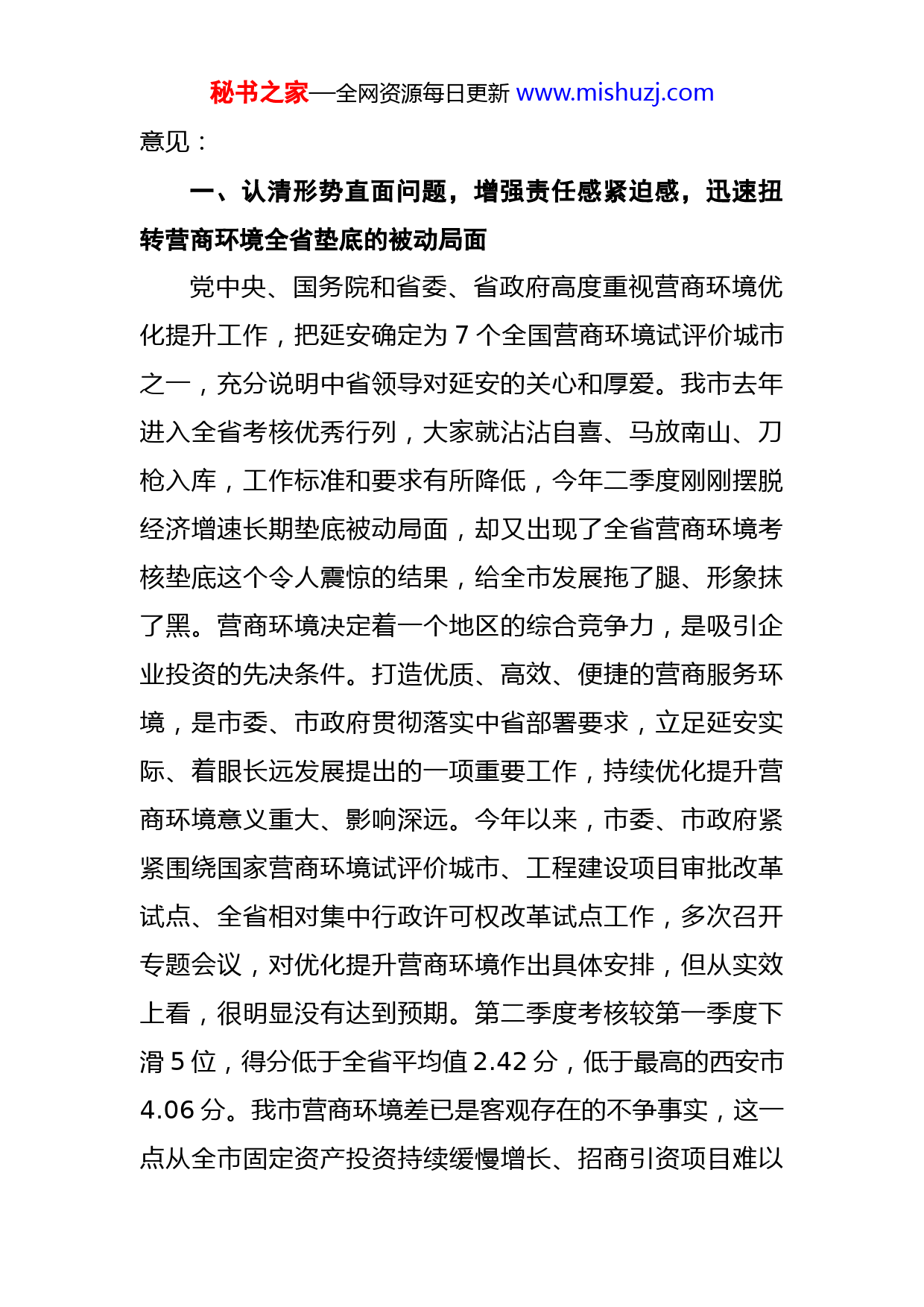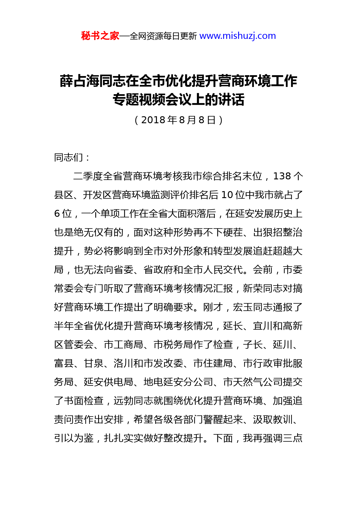 秘书之家—全网资源每日更新www.mishuzj.com薛占海同志在全市优化提升营商环境工作专题视频会议上的讲话(2018年8月8日)同志们:二季度全省营商环境考核我市综合排名末位,138个县区、开发区营商环境监测评价排名后10位中我市就占了6位,一个单项工作在全省大面积落后,在延安发展历史上也是绝无仅有的,面对这种形势再不下硬茬、出狠招整治提升,势必将影响到全市对外形象和转型发展追赶超越大局,也无法向省委、省政府和全市人民交代。会前,市委常委会专门听取了营商环境考核情况汇报,新荣同志对搞好营商环境工作提出了明确要求。刚才,宏玉同志通报了半年全省优化提升营商环境考核情况,延长、宜川和高新区管委会、市工商局、市税务局作了检查,子长、延川、富县、甘泉、洛川和市发改委、市住建局、市行政审批服务局、延安供电局、地电延安分公司、市天然气公司提交了书面检查,远勃同志就围绕优化提升营商环境、加强追责问责作出安排,希望各级各部门警醒起来、汲取教训、引以为鉴,扎扎实实做好整改提升。下面,我再强调三点秘书之家—全网资源每日更新www.mishuzj.com意见:一、认清形势直面问题,增强责任感紧迫感,迅速扭转营商环境全省垫底的被动局面党中央、国务院和省委、省政府高度重视营商环境优化提升工作,把延安确定为7个全国营商环境试评价城市之一,充分说明中省领导对延安的关心和厚爱。我市去年进入全省考核优秀行列,大家就沾沾自喜、马放南山、刀枪入库,工作标准和要求有所降低,今年二季度刚刚摆脱经济增速长期垫底被动局面,却又出现了全省营商环境考核垫底这个令人震惊的结果,给全市发展拖了腿、形象抹了黑。营商环境决定着一个地区的综合竞争力,是吸引企业投资的先决条件。打造优质、高效、便捷的营商服务环境,是市委、市政府贯彻落实中省部署要求,立足延安实际、着眼长远发展提出的一项重要工作,持续优化提升营商环境意义重大、影响深远。今年以来,市委、市政府紧紧围绕国家营商环境试评价城市、工程建设项目审批改革试点、全省相对集中行政许可权改革试点工作,多次召开专题会议,对优化提升营商环境作出具体安排,但从实效上看,很明显没有达到预期。第二季度考核较第一季度下滑5位,得分低于全省平均值2.42分,低于最高的西安市4.06分。我市营商环境差已是客观存在的不争事实,这一点从全市固定资产投资持续缓慢增长、招商引资项目难以秘书之家—全网资源每日更新www.mishuzj.com落地、投资企业怨声载道、民营企业发展缓慢等多个方面得到印证。这次教训极其深刻,给我们敲响了警钟,当务之急是要找准问题的根本。从表象上看,问题似乎出在基层,但根源还是在上面,在市县两级政府和相关部门,与各级各部门重视不够、领导不力、措施不实、作风不硬有很大关系,与主要领导亲自过问少、深入研究少、协调解决少、督促检查少也有直接关系。这不仅是工作问题,更是政治问题,反映出各级干部“四个意识”不强,对高质量发展认识不足。从具体工作中看,我市在企业开办、降低企业成本、纳税办理、施工许可证办理、获得电力等方面还存在许多突出问题。比如企业开办我市需4.8个工作日,韩城仅需1个工作日;申贷费用我市需4865元,比全省平均水平高出2471元;窗口纳税我市需3.25小时,咸阳仅需0.13小时;办理施工许可我市需134个工作日,全省平均仅75.4个工作日;获得电力我市需5.6个环节,榆林仅需2.8个环节。从作风上看,近年来我们锲而不舍推动干部作风转变,收到了一定成效,但是目前“大环境”虽然形成、“小气候”依然存在,部门保权守利、本位主义思想严重,简政放权明放暗不放,一些部门对行政审批制度改革等待观望,存在规避心理,甚至有撒手不管现象;在项目审批时,办事人员慵懒散慢,不给好处不办事、给了好处乱办事,有熟人好办事、没熟人办不成事,秘书之家—全网资源每日更新www.mishuzj.com甚至吃拿卡要;项目一旦落地,企业又成了“唐僧肉”,恶意阻工、强买强卖、轮番检查、雁过拔毛等现象普遍存在,我们的一些部门也习惯于做“老好人”,在解决具体问题过程中,常常睁一只眼闭一只眼,不管不闻不问。这些现象既有老问题、也有新表现,务必引起高度重视。同志们,我们一定要清醒认识到落后的原因,承认我们是全省最差,要敢于直面问题和矛盾,知耻而后勇,形成思想共识,迅速行动起来,坚定务必摆脱垫底的信心与决心,切实增强优化提升营商环境的责任感和紧迫感,牢固树立“不抓营商环境就是失职、抓不好营商环境就是不称职”的观念,把优化提升营商环境作为经济发展的生命线,作为革命圣地的“第一信誉、第一品牌”,一项一项抓好落实,努力做到服务客商“零距离”、办事效率“零延误”、项目入驻“零障碍”、生产经营“零干扰”,打一场优化提升营商环境攻坚战。二、聚焦关键环节,扎实补短板固底板,全力推动营商环境持续优化提升优化营商环境是一项系统工程,各级各部门必须从全局发展的高度出发,坚持目标导向,突出问题导向,强化结果导向,在改善“硬环境”的同时不断优化“软环境”全面建设“审批最少、流程最优、机制最活、效率最高、服务最好”的营商环境。秘书之家—全网资源每日更新www.mishuzj.com(一)大力精简规范行政审批事项。深