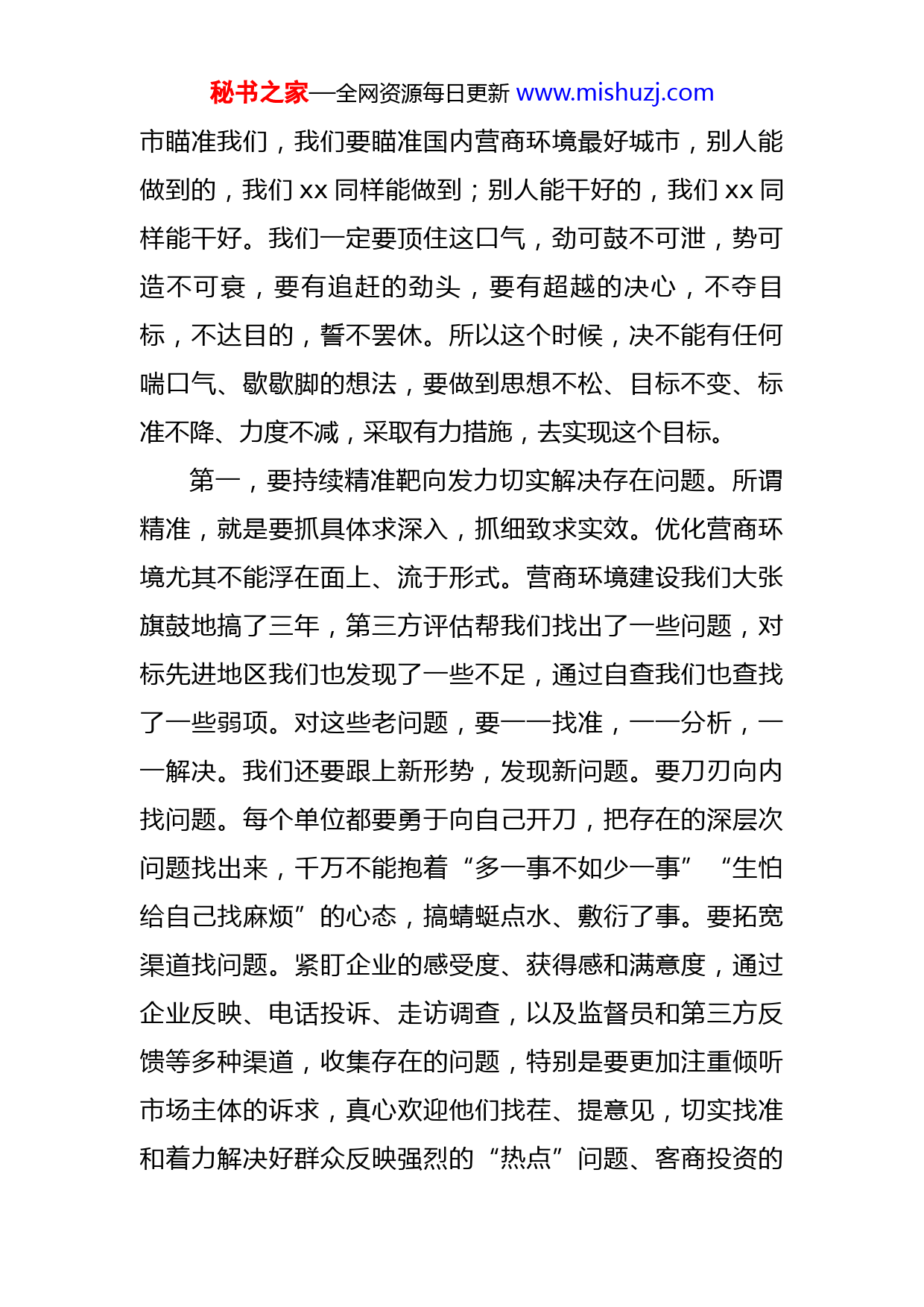 秘书之家—全网资源每日更新www.mishuzj.com在全市优化营商环境工作大会上的讲话一、坚持把优化营商环境摆在突出的位置抓紧抓好良好的营商环境是推动高质量发展和可持续发展的重要保证,是一个地方、一座城市核心竞争力的重要体现。近年来,从中央到地方对优化营商环境都极其重视。国家和xx省相继出台了优化营商环境条例,将营商环境上升到法律制度的层面。X在20xx年x月召开的全省深化改革优化营商环境大会上,明确提出了优化营商环境“xx”的目标要求。全市各级各部门要站在政治、全局、战略的高度,充分认识优化营商环境的极端重要性和紧迫性,认真落实中央及省委的决策部署,把优化营商环境作为推动高质量发展的重要突破口和着力点,不断打造一流营商环境,为推动xx高质量发展提供良好发展环境。二、突出重点持续发力争创全国一流营商环境去年我们在“四重任务叠加”的情况下,取得了不错的成绩,特别是第一次代表xx参加国考,表现非常突出。今年我们还会继续参加国考,省里也会继续开展营商环境评估,我们实现了“x连冠”,自然而然成为了全省追赶超越的目标。对于今年营商环境建设,我们的目标很明确,就是“全省保第一、全国走前列”。我们一定要有勇气立下这样的目标,也要有志气夺下这样的目标。省内兄弟城秘书之家—全网资源每日更新www.mishuzj.com市瞄准我们,我们要瞄准国内营商环境最好城市,别人能做到的,我们xx同样能做到;别人能干好的,我们xx同样能干好。我们一定要顶住这口气,劲可鼓不可泄,势可造不可衰,要有追赶的劲头,要有超越的决心,不夺目标,不达目的,誓不罢休。所以这个时候,决不能有任何喘口气、歇歇脚的想法,要做到思想不松、目标不变、标准不降、力度不减,采取有力措施,去实现这个目标。第一,要持续精准靶向发力切实解决存在问题。所谓精准,就是要抓具体求深入,抓细致求实效。优化营商环境尤其不能浮在面上、流于形式。营商环境建设我们大张旗鼓地搞了三年,第三方评估帮我们找出了一些问题,对标先进地区我们也发现了一些不足,通过自查我们也查找了一些弱项。对这些老问题,要一一找准,一一分析,一一解决。我们还要跟上新形势,发现新问题。要刀刃向内找问题。每个单位都要勇于向自己开刀,把存在的深层次问题找出来,千万不能抱着“多一事不如少一事”“生怕给自己找麻烦”的心态,搞蜻蜓点水、敷衍了事。要拓宽渠道找问题。紧盯企业的感受度、获得感和满意度,通过企业反映、电话投诉、走访调查,以及监督员和第三方反馈等多种渠道,收集存在的问题,特别是要更加注重倾听市场主体的诉求,真心欢迎他们找茬、提意见,切实找准和着力解决好群众反映强烈的“热点”问题、客商投资的秘书之家—全网资源每日更新www.mishuzj.com“堵点”问题、企业生产经营的“痛点”问题。要对照标准找问题。聚焦世行营商环境报告的10个指标,认真对照国家营商环境评价体系中的18个一级指标,一样一样找,看看我们差在哪里、弱在哪里。对于这些问题,营商办牵头进行汇总、梳理、分类,形成问题清单,实行销号管理,督促整改落实,不整改到位要紧紧盯住、坚决不能放过。第二,要持续推进简政放权。改善营商环境的关键在于改善政府的服务方式。改善政府服务方式,首先要从提高政府办事效率也就是简政放权上面下功夫。要全面实施市场准入负面清单制度,抓紧清理多头重复审批,下决心取消不必要审批,改革创新审批方式,继续下放基层能够行使好的权力。要密切关切市场主体关心的重点领域审批,除法定必须的要求外,有序刚性减少行政审批事项和缩短审批时间。进一步降低市场准入门槛,放开资金、技术、信息、土地、劳动力、大数据、咨询管理等市场要素依法、快速流动,让企业开办经营更加便利。要依法公正加强监管,切实解决和有效防止多头执法、重复执法、“一刀切”执法等问题,努力营造公平竞争的市场环境。要精益求精搞好服务,着力加强数字政府建设,充分发挥政务大厅“一站式”服务功能,加强诚信政府建设,以服务型政府建设为抓手,在提升服务质效上不遗余力做“加秘书之家—全网资源每日更新www.mishuzj.com法”。要千方百计降低成本,严格落实国家更大规模减税降费政策,着力解决好融资难融资贵问题,加快补齐基础设施和配套服务短板,让企业得到真金白银的实惠。第三,要持续完善服务标准示范。向改革要动力、要活力,在完善涉企服务机制上下功夫,为各类市场主体营造良好营商环境,增强发展信心。扎实推进行政审批标准化工作,构建统一规范的标准化办事事项和办事指南体系,不断优化行政审批流程,以标准化引领行政服务效能提升,逐步构建方便快捷、公平普惠、优质高效的政务服务体系。要有效促进各部门业务系统整合,统一各部门的数据编码、处理、共享和交换标准,在确保政务数据安全的前提下,实现跨部门、跨区域、跨层级的互联互通、协同共享,确保“只进一扇门,办完所有事”。要完善涉企服务机制,运用好大数据、云计算、智能化,完善企业问政平台建设,减少内部审核环节、减免不必要成本,推行提前介入、超前服务,最大限度地为市场主体提供便利条件和精准化服务。对于优化营商环境这项工作,全国各地都在做,都在简政放权、都在提高