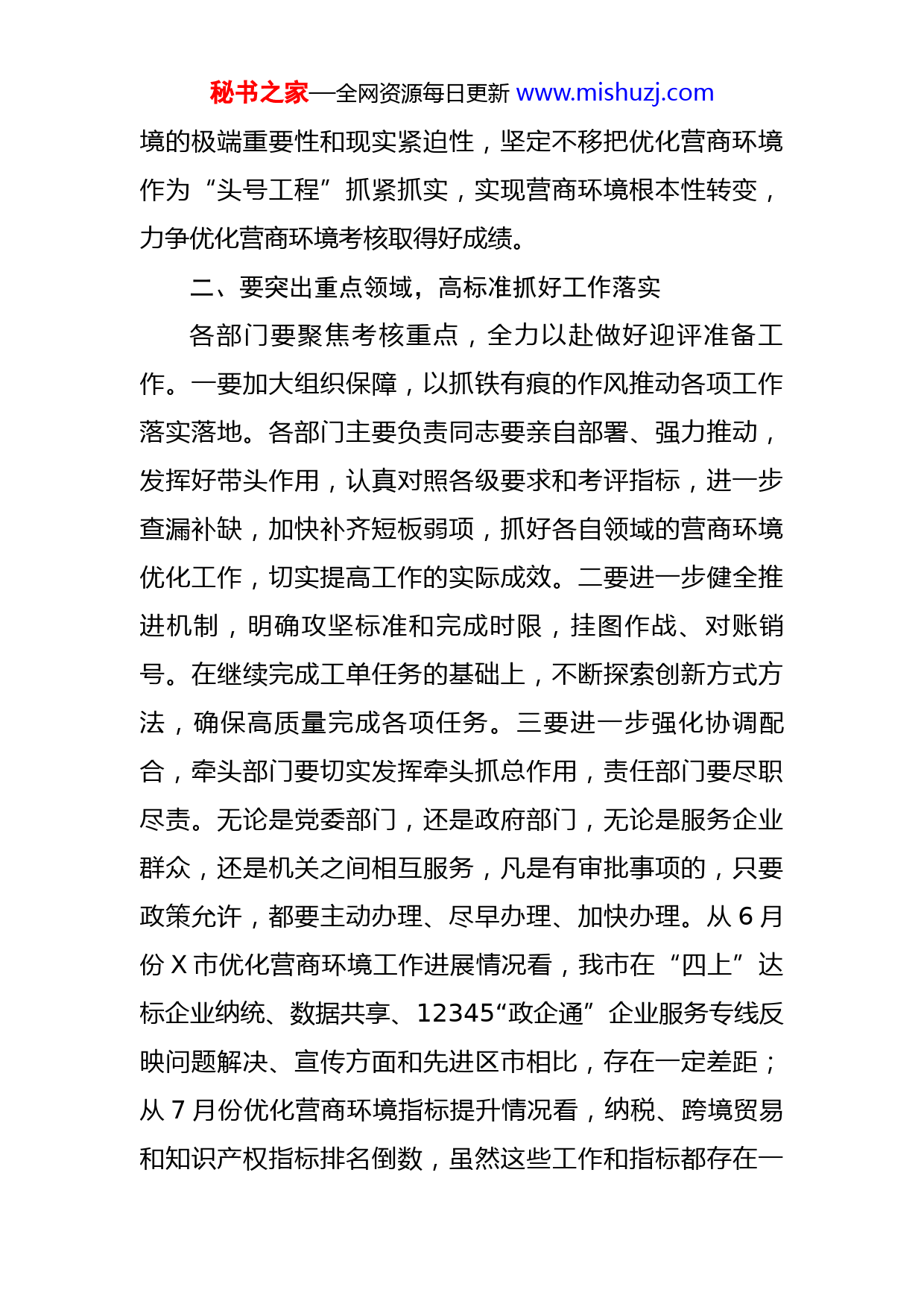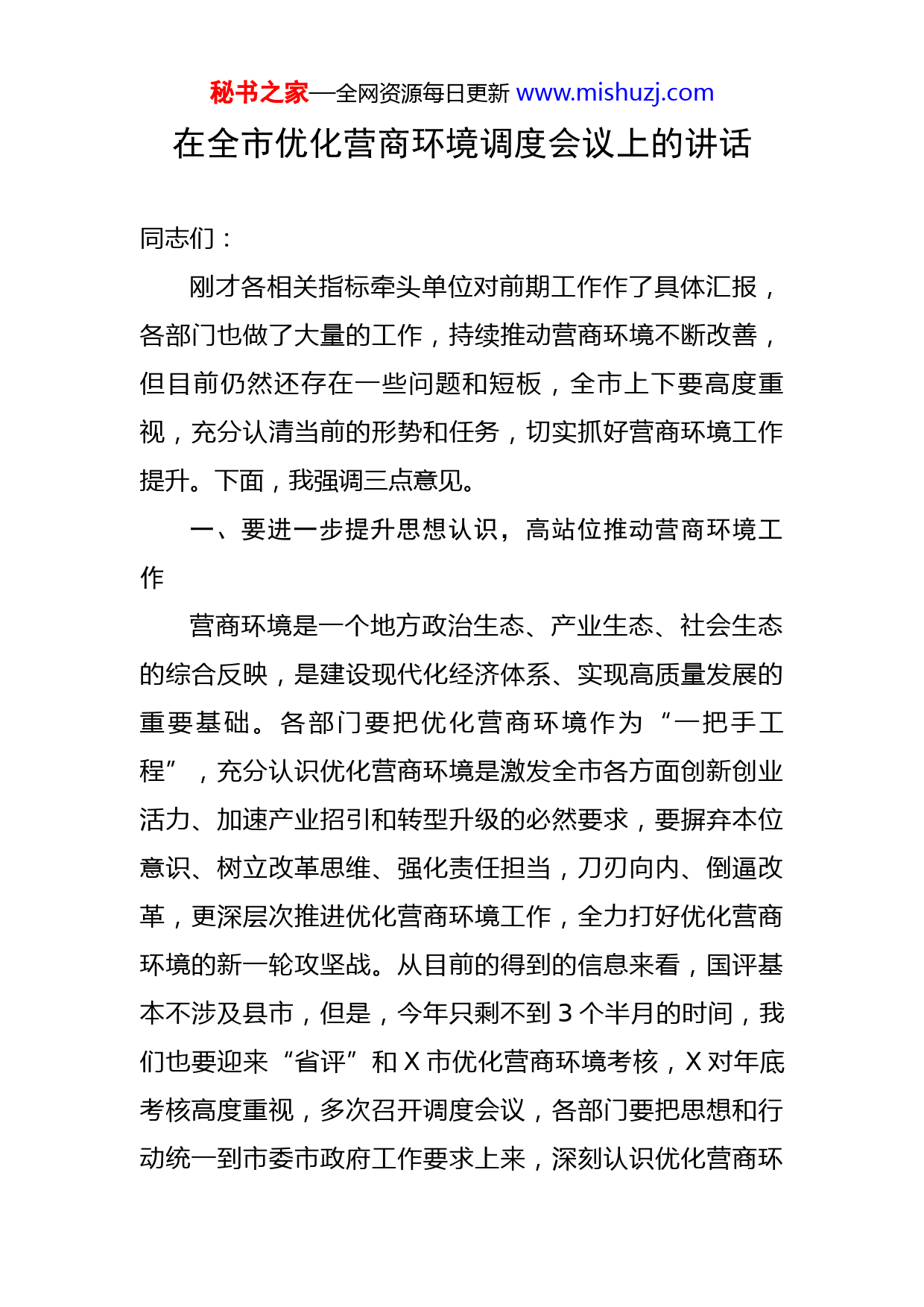 秘书之家—全网资源每日更新www.mishuzj.com在全市优化营商环境调度会议上的讲话同志们:刚才各相关指标牵头单位对前期工作作了具体汇报,各部门也做了大量的工作,持续推动营商环境不断改善,但目前仍然还存在一些问题和短板,全市上下要高度重视,充分认清当前的形势和任务,切实抓好营商环境工作提升。下面,我强调三点意见。一、要进一步提升思想认识,高站位推动营商环境工作营商环境是一个地方政治生态、产业生态、社会生态的综合反映,是建设现代化经济体系、实现高质量发展的重要基础。各部门要把优化营商环境作为“一把手工程”,充分认识优化营商环境是激发全市各方面创新创业活力、加速产业招引和转型升级的必然要求,要摒弃本位意识、树立改革思维、强化责任担当,刀刃向内、倒逼改革,更深层次推进优化营商环境工作,全力打好优化营商环境的新一轮攻坚战。从目前的得到的信息来看,国评基本不涉及县市,但是,今年只剩不到3个半月的时间,我们也要迎来“省评”和X市优化营商环境考核,X对年底考核高度重视,多次召开调度会议,各部门要把思想和行动统一到市委市政府工作要求上来,深刻认识优化营商环秘书之家—全网资源每日更新www.mishuzj.com境的极端重要性和现实紧迫性,坚定不移把优化营商环境作为“头号工程”抓紧抓实,实现营商环境根本性转变,力争优化营商环境考核取得好成绩。二、要突出重点领域,高标准抓好工作落实各部门要聚焦考核重点,全力以赴做好迎评准备工作。一要加大组织保障,以抓铁有痕的作风推动各项工作落实落地。各部门主要负责同志要亲自部署、强力推动,发挥好带头作用,认真对照各级要求和考评指标,进一步查漏补缺,加快补齐短板弱项,抓好各自领域的营商环境优化工作,切实提高工作的实际成效。二要进一步健全推进机制,明确攻坚标准和完成时限,挂图作战、对账销号。在继续完成工单任务的基础上,不断探索创新方式方法,确保高质量完成各项任务。三要进一步强化协调配合,牵头部门要切实发挥牵头抓总作用,责任部门要尽职尽责。无论是党委部门,还是政府部门,无论是服务企业群众,还是机关之间相互服务,凡是有审批事项的,只要政策允许,都要主动办理、尽早办理、加快办理。从6月份X市优化营商环境工作进展情况看,我市在“四上”达标企业纳统、数据共享、12345“政企通”企业服务专线反映问题解决、宣传方面和先进区市相比,存在一定差距;从7月份优化营商环境指标提升情况看,纳税、跨境贸易和知识产权指标排名倒数,虽然这些工作和指标都存在一秘书之家—全网资源每日更新www.mishuzj.com定客观上的原因,但是相关牵头单位要会同责任部门克服困难,想方设法提高工作标准,细化工作措施,全力做好整改提升工作。三、要夯实长效机制,高质量营造良好营商氛围相关部门要抓好涉企政策兑现,认真倾听企业诉求,真心为企业办实事、解难题。要以市场主体满意度为标尺,向企业多靠近一点、多关心一点,建立企业走访长效机制和常态化沟通交流机制,营造尊商、重商、爱商的浓厚社会氛围。从两次X市企业走访工作抽查情况通报看,我市联系企业工作做得还不够扎实,部门企业联络员履行职责不到位,走访企业没有做到全覆盖,下一步,各部门要重视提升干部高水平服务市场主体素养,树立“人人都是营商环境”的理念,加快提升干部市场化、专业化水平,增强政务服务能力,倡导创新精神,构建亲清政商关系,更好提高企业的满意度和获得感。同时,要注重亮点工作和典型案例的提炼总结,加大在各级媒体宣传推介力度,营造铺天盖地的新闻舆论共识,宣传企业对我市改善营商环境,落实惠企政策的热烈反响,群众对解决热点难点问题的切身体会等鲜活实例,全面呈现我市优化营商环境的工作成效。从近两个月的宣传情况通报看,我市发稿媒体层级较低,在国家和省级媒体发稿数量较少,各指标牵头单位和责任单位一定要提供一些高质量的素材给宣传秘书之家—全网资源每日更新www.mishuzj.com组,提升发稿层次,也要利用自身的渠道将我们的做法经验推出去,要充分利用一切可以利用的资源,加强部门间沟通协调,着力营造全社会共同关心、积极参与营商环境建设工作的良好氛围。同志们!行百里者半九十,年底这一个月多的时间是我们一年工作交卷的关键时间,我们要全力奔跑,奋力冲刺,为我们一年的辛勤工作交出一份满意的答卷。