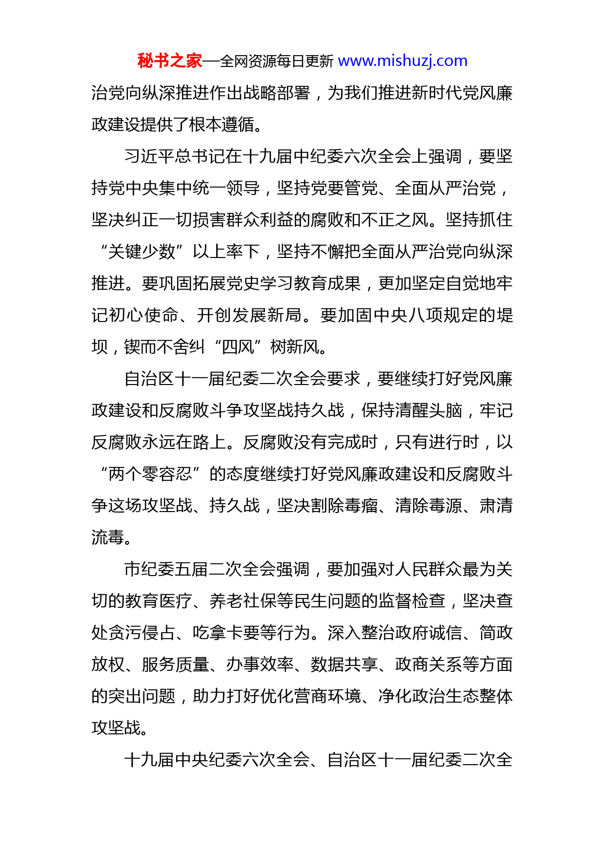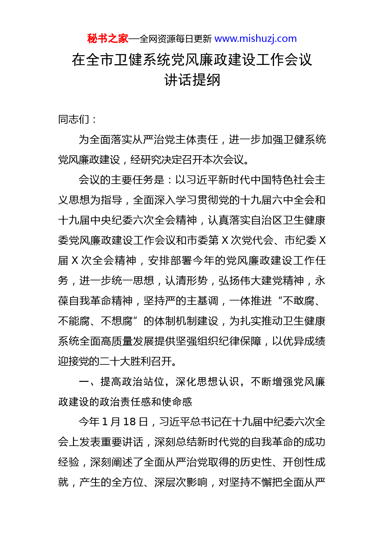 秘书之家—全网资源每日更新www.mishuzj.com在全市卫健系统党风廉政建设工作会议讲话提纲同志们:为全面落实从严治党主体责任,进一步加强卫健系统党风廉政建设,经研究决定召开本次会议。会议的主要任务是:以习近平新时代中国特色社会主义思想为指导,全面深入学习贯彻党的十九届六中全会和十九届中央纪委六次全会精神,认真落实自治区卫生健康委党风廉政建设工作会议和市委第X次党代会、市纪委X届X次全会精神,安排部署今年的党风廉政建设工作任务,进一步统一思想,认清形势,弘扬伟大建党精神,永葆自我革命精神,坚持严的主基调,一体推进“不敢腐、不能腐、不想腐”的体制机制建设,为扎实推动卫生健康系统全面高质量发展提供坚强组织纪律保障,以优异成绩迎接党的二十大胜利召开。一、提高政治站位,深化思想认识,不断增强党风廉政建设的政治责任感和使命感今年1月18日,习近平总书记在十九届中纪委六次全会上发表重要讲话,深刻总结新时代党的自我革命的成功经验,深刻阐述了全面从严治党取得的历史性、开创性成就,产生的全方位、深层次影响,对坚持不懈把全面从严秘书之家—全网资源每日更新www.mishuzj.com治党向纵深推进作出战略部署,为我们推进新时代党风廉政建设提供了根本遵循。习近平总书记在十九届中纪委六次全会上强调,要坚持党中央集中统一领导,坚持党要管党、全面从严治党,坚决纠正一切损害群众利益的腐败和不正之风。坚持抓住“关键少数”以上率下,坚持不懈把全面从严治党向纵深推进。要巩固拓展党史学习教育成果,更加坚定自觉地牢记初心使命、开创发展新局。要加固中央八项规定的堤坝,锲而不舍纠“四风”树新风。自治区十一届纪委二次全会要求,要继续打好党风廉政建设和反腐败斗争攻坚战持久战,保持清醒头脑,牢记反腐败永远在路上。反腐败没有完成时,只有进行时,以“两个零容忍”的态度继续打好党风廉政建设和反腐败斗争这场攻坚战、持久战,坚决割除毒瘤、清除毒源、肃清流毒。市纪委五届二次全会强调,要加强对人民群众最为关切的教育医疗、养老社保等民生问题的监督检查,坚决查处贪污侵占、吃拿卡要等行为。深入整治政府诚信、简政放权、服务质量、办事效率、数据共享、政商关系等方面的突出问题,助力打好优化营商环境、净化政治生态整体攻坚战。十九届中央纪委六次全会、自治区十一届纪委二次全秘书之家—全网资源每日更新www.mishuzj.com会以及市纪委五届二次全会,对全面从严治党工作提出了明确要求、作出了系统部署,我们要始终把思想行动统一到全会精神上来,准确把握自我革命的重要要求,切实增强“四个意识”、坚定“四个自信”、做到“两个维护”,不断提高“政治三力”。要不折不扣贯彻落实党中央、自治区党委和市委的决策部署,扛牢压实党风廉政建设主体责任,让求真务实、清正廉洁的新风正气不断充盈,为高质量发展提供坚强政治保证。二、勇于正视问题,坚持自我革命,清醒认识卫生健康系统党风廉政建设面临的严峻形势2021年,全市卫健系统在市委的坚强领导下,坚持将管党治党作为首要政治责任牢牢扛在肩上,把全面从严治党与业务工作深度融合,相互促进,以廉促勤,以优良的作风为保障,不断推动工作创新发展。一是旗帜鲜明讲政治,坚决筑牢“两个维护”的思想根基。党组始终把带头做到“两个维护”作为党的建设首要任务,认真执行“第一议题”制度。扎实开展党史学习教育,各级党组织和广大党员学出了新高度。二是坚持大抓党支部,强化党组织政治功能和党员作用发挥。全面深化最强党支部创建工作,大力夯实基层基础,市直卫健系统XX%的党支部创成“最强党支部”,各级党员干部坚守疫情防控第一线,积极支援XXX、XXXX等地疫情防控,充分展示了卫健系统秘书之家—全网资源每日更新www.mishuzj.com党员干部和医技人员的责任担当。三是坚持严的主基调,以永远在路上的坚韧推进党风廉政建设。坚持党风廉政建设与业务工作同部署、同推进、同考核,印发《贯彻落实全面从严治党主体责任清单》和《党风廉政建设责任清单》,市直相关医院增设了党委书记,进一步充实了党风廉政建设力量。常态化开展党风廉政教育、重要节日节前廉政提醒、廉政风险动态管理、干部廉政档案建立等措施,构筑起多角度、全方位的防范机制。四是持续树立行业新风正气,大力整治突出问题。深入推进“我为群众办实事”实践活动,如期完成20项民生实事。贯彻落实《医疗机构工作人员廉洁从业九项准则》,实施医疗机构及其工作人员廉洁从业行动计划,将全面从严治党、行风建设纳入大型医院巡查内容。一年来,全市卫健系统广大干部职工履职尽责、担当作为,取得了一定的成效。在肯定成绩的同时,我们也要正视存在的问题。习近平总书记在中央纪委六次全会上深刻指出:腐败和反腐败的较量还在激烈进行,并呈现出四个新的阶段性特征,即“四个任重道远”:防范形形色色的利益集团成伙作势、围猎腐蚀还任重道远;有效应对腐败手段隐形变异、翻新升级还任重道远;彻底铲除腐败滋生土壤、实现海晏河清还任重道远;清理系统性腐败、化解风险隐患还任重道远。这四个“任重道远”是中央对反秘书之家—全网资源每日更新www.mishuzj.com腐败形势特征做