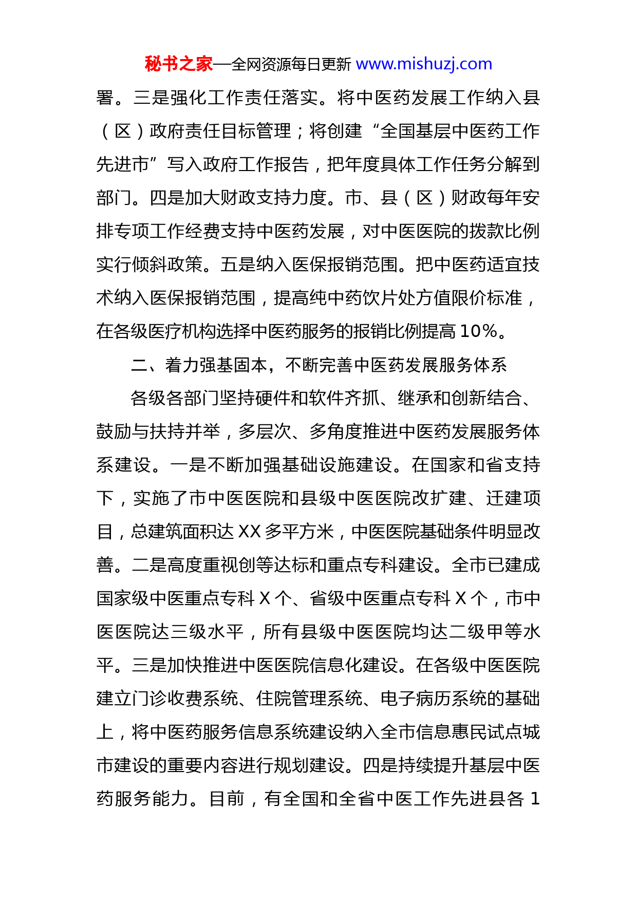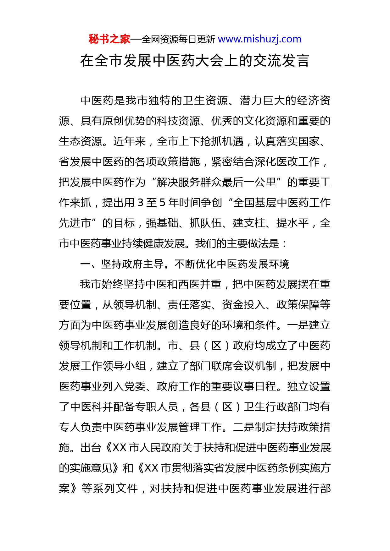 秘书之家—全网资源每日更新www.mishuzj.com在全市发展中医药大会上的交流发言中医药是我市独特的卫生资源、潜力巨大的经济资源、具有原创优势的科技资源、优秀的文化资源和重要的生态资源。近年来,全市上下抢抓机遇,认真落实国家、省发展中医药的各项政策措施,紧密结合深化医改工作,把发展中医药作为“解决服务群众最后一公里”的重要工作来抓,提出用3至5年时间争创“全国基层中医药工作先进市”的目标,强基础、抓队伍、建支柱、提水平,全市中医药事业持续健康发展。我们的主要做法是:一、坚持政府主导,不断优化中医药发展环境我市始终坚持中医和西医并重,把中医药发展摆在重要位置,从领导机制、责任落实、资金投入、政策保障等方面为中医药事业发展创造良好的环境和条件。一是建立领导机制和工作机制。市、县(区)政府均成立了中医药发展工作领导小组,建立了部门联席会议机制,把发展中医药事业列入党委、政府工作的重要议事日程。独立设置了中医科并配备专职人员,各县(区)卫生行政部门均有专人负责中医药事业发展管理工作。二是制定扶持政策措施。出台《XX市人民政府关于扶持和促进中医药事业发展的实施意见》和《XX市贯彻落实省发展中医药条例实施方案》等系列文件,对扶持和促进中医药事业发展进行部秘书之家—全网资源每日更新www.mishuzj.com署。三是强化工作责任落实。将中医药发展工作纳入县(区)政府责任目标管理;将创建“全国基层中医药工作先进市”写入政府工作报告,把年度具体工作任务分解到部门。四是加大财政支持力度。市、县(区)财政每年安排专项工作经费支持中医药发展,对中医医院的拨款比例实行倾斜政策。五是纳入医保报销范围。把中医药适宜技术纳入医保报销范围,提高纯中药饮片处方值限价标准,在各级医疗机构选择中医药服务的报销比例提高10%。二、着力强基固本,不断完善中医药发展服务体系各级各部门坚持硬件和软件齐抓、继承和创新结合、鼓励与扶持并举,多层次、多角度推进中医药发展服务体系建设。一是不断加强基础设施建设。在国家和省支持下,实施了市中医医院和县级中医医院改扩建、迁建项目,总建筑面积达XX多平方米,中医医院基础条件明显改善。二是高度重视创等达标和重点专科建设。全市已建成国家级中医重点专科X个、省级中医重点专科X个,市中医医院达三级水平,所有县级中医医院均达二级甲等水平。三是加快推进中医医院信息化建设。在各级中医医院建立门诊收费系统、住院管理系统、电子病历系统的基础上,将中医药服务信息系统建设纳入全市信息惠民试点城市建设的重要内容进行规划建设。四是持续提升基层中医药服务能力。目前,有全国和全省中医工作先进县各1秘书之家—全网资源每日更新www.mishuzj.com个、省级中医工作先进乡镇3个,全市县级以上综合医院和X%的社区卫生服务中心、X%的乡镇卫生院设有中医科,X%的社区卫生服务站和X%的村卫生室能提供中医药服务。五是积极扶持民营中医医疗机构发展。大力鼓励和支持社会资本举办民营中医医疗机构,允许符合条件的药品零售企业举办中医坐堂医诊所,支持有资质的中医专业技术人员特别是名老中医在基层开设中医诊所或个体行医。全市已批准设置中西医结合医院X家、中医诊所X家、药品零售企业中医坐堂医诊所X家。六是扎实抓好深化医改中医药预防保健服务能力建设。于XX年启动基本公共卫生服务中医药健康管理服务项目,设立项目管理办公室,严格按照服务和技术规范开展中医药服务,全市65岁以上老年人、0至3岁儿童和高血压、糖尿病患者中医健康管理率不断提高。三、抓实人才培养,不断加强中医药发展队伍中医药事业的快速发展,队伍是基础、人才是保障。全市在推进中医药工作中,始终把队伍建设和人才培养放在突出位置抓实抓好。一是加强中医药人才招录使用和专业人才培养。将中医药专业占新招录卫生专业技术人员的比例纳入县(区)政府和市直相关部门责任目标管理;依托XX中医药高大学培养本土中医药专科人才XX余人;已累计为我市招收农村订单定向免费培养中医方面本科医学秘书之家—全网资源每日更新www.mishuzj.com生XX人。目前,全市有中医类别执业医师XX人;XX名村医从事中医工作。二是加强中医药专业重点岗位人员培训。XX年以来,共培训中医临床技术骨干XX人,实施中医类别全科医师转岗培训XX人。三是加强基层卫生专业技术人员中医药技术技能培训。从XX年起,培训乡村医生XX人,力争到X年每个村卫生室至少有1名能西会中的乡村医生。四、传承中医文化,不断夯实中医药基础建设全市上下坚持正确的舆论导向,大力宣传中医药文化,普及中医药知识,提高人民群众对中医药的认识和认可度。一是积极组织开展有关技能比赛和评选活动。开展“中医药技能大赛”、召开中医药学术交流会评选出名中医X人。二是利用各类媒体进行广泛宣传。以报刊、广播、电视、网络等为平台,开辟中医药宣传专栏,开展内容丰富、形式多样的中医药文化科普宣传活动。三是加强医疗机构中医药文化建设。市、县中医医院建成了“中医药文化长廊”,各级中医医院和部分中心卫生院建成了中医馆和中草药植物园。四是推进中医药文化宣传教育基地建设。五是切实推进