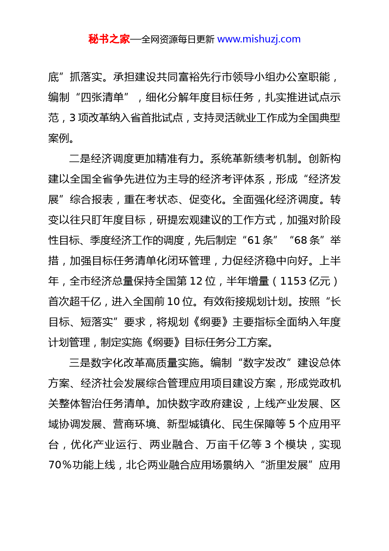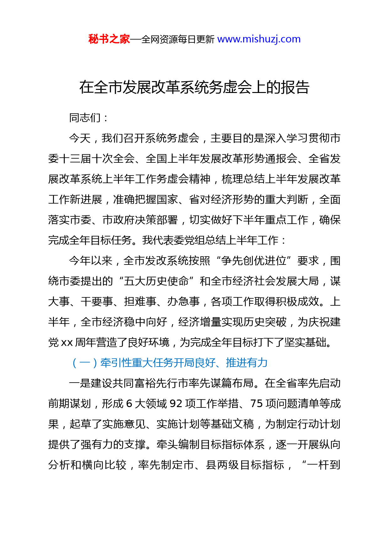 秘书之家—全网资源每日更新www.mishuzj.com在全市发展改革系统务虚会上的报告同志们:今天,我们召开系统务虚会,主要目的是深入学习贯彻市委十三届十次全会、全国上半年发展改革形势通报会、全省发展改革系统上半年工作务虚会精神,梳理总结上半年发展改革工作新进展,准确把握国家、省对经济形势的重大判断,全面落实市委、市政府决策部署,切实做好下半年重点工作,确保完成全年目标任务。我代表委党组总结上半年工作:今年以来,全市发改系统按照“争先创优进位”要求,围绕市委提出的“五大历史使命”和全市经济社会发展大局,谋大事、干要事、担难事、办急事,各项工作取得积极成效。上半年,全市经济稳中向好,经济增量实现历史突破,为庆祝建党xx周年营造了良好环境,为完成全年目标打下了坚实基础。(一)牵引性重大任务开局良好、推进有力一是建设共同富裕先行市率先谋篇布局。在全省率先启动前期谋划,形成6大领域92项工作举措、75项问题清单等成果,起草了实施意见、实施计划等基础文稿,为制定行动计划提供了强有力的支撑。牵头编制目标指标体系,逐一开展纵向分析和横向比较,率先制定市、县两级目标指标,“一杆到秘书之家—全网资源每日更新www.mishuzj.com底”抓落实。承担建设共同富裕先行市领导小组办公室职能,编制“四张清单”,细化分解年度目标任务,扎实推进试点示范,3项改革纳入省首批试点,支持灵活就业工作成为全国典型案例。二是经济调度更加精准有力。系统革新绩考机制。创新构建以全国全省争先进位为主导的经济考评体系,形成“经济发展”综合报表,重在考状态、促变化。全面强化经济调度。转变以往只盯年度目标,研提宏观建议的工作方式,加强对阶段性目标、季度经济工作的调度,先后制定“61条”“68条”举措,加强目标任务清单化闭环管理,力促经济稳中向好。上半年,全市经济总量保持全国第12位,半年增量(1153亿元)首次超千亿,进入全国前10位。有效衔接规划计划。按照“长目标、短落实”要求,将规划《纲要》主要指标全面纳入年度计划管理,制定实施《纲要》目标任务分工方案。三是数字化改革高质量实施。编制“数字发改”建设总体方案、经济社会发展综合管理应用项目建设方案,形成党政机关整体智治任务清单。加快数字政府建设,上线产业发展、区域协调发展、营商环境、新型城镇化、民生保障等5个应用平台,优化产业运行、两业融合、万亩千亿等3个模块,实现70%功能上线,北仑两业融合应用场景纳入“浙里发展”应用秘书之家—全网资源每日更新www.mishuzj.com场景改革试点。深化数字社会建设,全面梳理核心业务,迭代谋划多跨场景,高质量推进门户建设,实现16个高频应用上架,综合应用门户建设居全省首位。四是重大战略任务加快破题。锻造港口硬核力量。初步形成加快推进世界一流强港建设行动方案,全面谋划基础设施、腹地辐射带动、全球链接影响、现代航运服务等“七大硬核力量”,编制一流强港硬核力量指标体系。服务国家战略,谋划建设国家大宗商品储运基地,参与编制XX舟山铜精矿及其他重要矿石储运基地建设方案,形成基地建设初步设想。认真唱好“双城记”。制定XX行动方案和五年工作计划,形成落实杭甬合作框架协议39条任务,推动召开唱好杭甬“双城记”工作联席会议,签订落实3个专项协议,一批惠民利企事项落地。五是低碳发展进入新阶段。谋划推进碳达峰工作。初步形成碳达峰行动方案、工作实施意见等顶层设计文件,谋划覆盖顶层设计、重点领域、专项保障在内的“1+N+X”方案体系,制定碳达峰碳中和工作规则,全方位推动工作。市委、市政府多次专题听取汇报,我市整体进度走在全省前列。妥善应对能耗约束问题。兼顾经济社会发展和能耗“双控”要求,落实遏制“两高”项目任务,调减“两高”项目4个,新增能耗调减213万吨标煤;实施高耗能企业错峰生产,推进重点行业节能秘书之家—全网资源每日更新www.mishuzj.com改造,腾出用能17.7万吨标准煤。(二)各条线业务扎实推进、可圈可点投资保持快速增长:开展33个百亿重大项目“挂图作战”,探索建立要素保障问题动态梳理和督促分办机制,制定重大项目用地保障机制。上半年,协调解决15个项目45个难题,争取到第一批政府专项债券119亿元、中央预算内资金5.1亿元;全市投资增长16.4%,省市重点工程完成年度计划58%和62.6%,55个省市县长工程项目落地16个。产业发展转型提质:主导产业加快转型。镇海炼化基地项目首次实现数字工厂和物理工厂同步建设、同时交付;乙烯装置建成中交,首次实现百万吨级乙烯在芯片等分控系统的全面国产化。与吉利签订战略合作框架协议,深化纯电动汽车、智能网联汽车等21个合作事项。新兴产业较快增长。落实首轮新兴产业发展资金1.8亿元,上半年战略性新兴产业增加值增长25.2%。出台以新业态新模式引领新型消费加快发展方案。服务业提质扩量。推进商贸、物流、金融等领域100个重大项目建设,新增总部企业48家,举办会展项目180个,开展灵活用工平台试点11家。改革开放持续深化:推动开发区(园区)整合提升,形成市本级管理平台3个、区县(市)重点平台17个,管理机构和秘书之家—全网资源每日更新www.mishuzj.com人员数量分别缩减60%和30%。制定营商环境4.0政策,出台完善要素市场