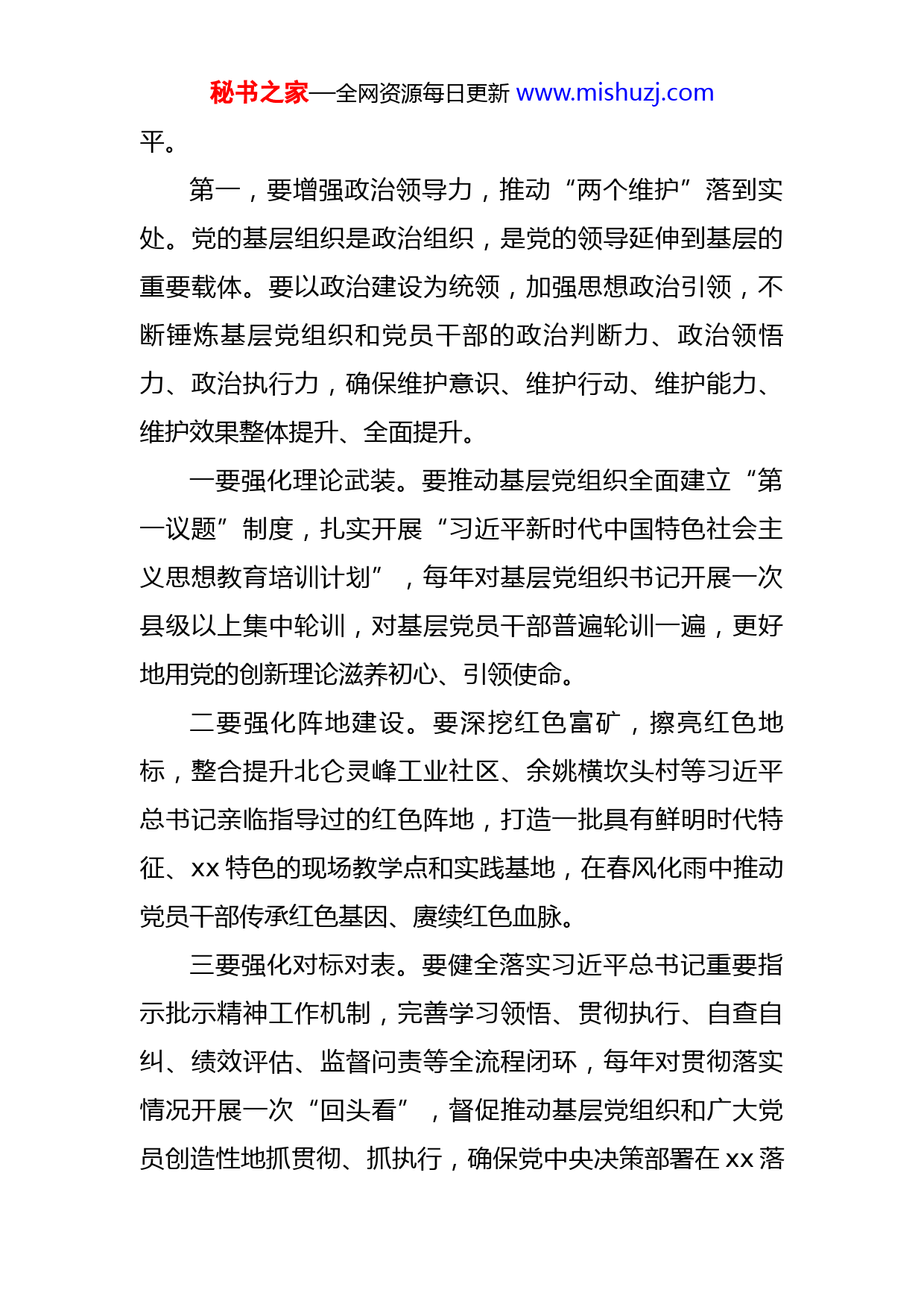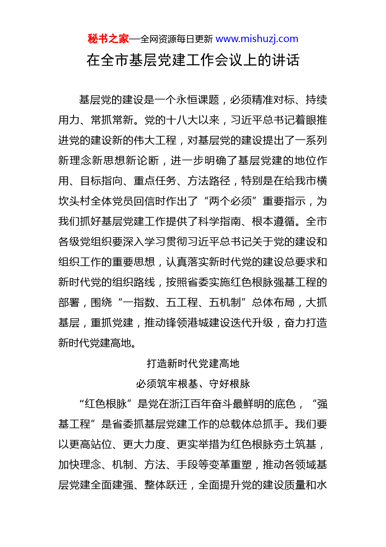 秘书之家—全网资源每日更新www.mishuzj.com在全市基层党建工作会议上的讲话基层党的建设是一个永恒课题,必须精准对标、持续用力、常抓常新。党的十八大以来,习近平总书记着眼推进党的建设新的伟大工程,对基层党的建设提出了一系列新理念新思想新论断,进一步明确了基层党建的地位作用、目标指向、重点任务、方法路径,特别是在给我市横坎头村全体党员回信时作出了“两个必须”重要指示,为我们抓好基层党建工作提供了科学指南、根本遵循。全市各级党组织要深入学习贯彻习近平总书记关于党的建设和组织工作的重要思想,认真落实新时代党的建设总要求和新时代党的组织路线,按照省委实施红色根脉强基工程的部署,围绕“一指数、五工程、五机制”总体布局,大抓基层,重抓党建,推动锋领港城建设迭代升级,奋力打造新时代党建高地。打造新时代党建高地必须筑牢根基、守好根脉“红色根脉”是党在浙江百年奋斗最鲜明的底色,“强基工程”是省委抓基层党建工作的总载体总抓手。我们要以更高站位、更大力度、更实举措为红色根脉夯土筑基,加快理念、机制、方法、手段等变革重塑,推动各领域基层党建全面建强、整体跃迁,全面提升党的建设质量和水秘书之家—全网资源每日更新www.mishuzj.com平。第一,要增强政治领导力,推动“两个维护”落到实处。党的基层组织是政治组织,是党的领导延伸到基层的重要载体。要以政治建设为统领,加强思想政治引领,不断锤炼基层党组织和党员干部的政治判断力、政治领悟力、政治执行力,确保维护意识、维护行动、维护能力、维护效果整体提升、全面提升。一要强化理论武装。要推动基层党组织全面建立“第一议题”制度,扎实开展“习近平新时代中国特色社会主义思想教育培训计划”,每年对基层党组织书记开展一次县级以上集中轮训,对基层党员干部普遍轮训一遍,更好地用党的创新理论滋养初心、引领使命。二要强化阵地建设。要深挖红色富矿,擦亮红色地标,整合提升北仑灵峰工业社区、余姚横坎头村等习近平总书记亲临指导过的红色阵地,打造一批具有鲜明时代特征、xx特色的现场教学点和实践基地,在春风化雨中推动党员干部传承红色基因、赓续红色血脉。三要强化对标对表。要健全落实习近平总书记重要指示批示精神工作机制,完善学习领悟、贯彻执行、自查自纠、绩效评估、监督问责等全流程闭环,每年对贯彻落实情况开展一次“回头看”,督促推动基层党组织和广大党员创造性地抓贯彻、抓执行,确保党中央决策部署在xx落秘书之家—全网资源每日更新www.mishuzj.com地生根、开花结果。四要强化政治功能。要根据不同领域基层党组织的功能定位,分类探索党组织发挥政治领导作用的有效机制,充分发挥基层党组织领导核心作用。城乡社区党组织要着力健全重大事项、重要问题、重要工作由党组织讨论决定机制,更好统合整合各类组织、各种资源、各方力量为发展服务。国有企事业单位党组织要深度融入治理构架,完善落实重大事项决策党组织前置研究制度,特别是高校、公立医院要落实党委领导下的校长和院长负责制,强化党组织把关定向作用。两新组织党组织要提升在企业中的话语权,推动党建工作要求写入企业章程,深化拓展党组织参与重大决策、生产经营、服务职工群众等渠道,真正把党的领导嵌入公司治理、企业发展全过程各环节。第二,要增强组织覆盖力,实现有形覆盖与有效覆盖相统一。严密的组织体系,是我们党独特而强大的优势。但组织体系不是一成不变、固定僵化的,只有适应新形势新任务,与时俱进不断优化完善,才能永葆生机和活力。要按照打造变革型组织要求,守正创新、革故鼎新,推动组织形态与发展形态、社会形态、治理形态更加耦合融合,确保各级组织上下贯通、高效协同、执行有力。一要聚焦“一肩挑”固底盘。要围绕“一肩挑”带来的村社权责关系、运行体系、组织架构的调整变化,完善秘书之家—全网资源每日更新www.mishuzj.com党组织和村委会、经合社、监委会的运行机制,构建起党组织领导下各类组织紧密协同、高效运转的基层治理格局。二要聚焦城乡基本单元促延伸。要顺应以小区为基本单元的城市治理趋势,推动城市社区党组织体系向下延伸,全面加强居民小区党建,形成社区党组织统一领导,小区党组织统领物业、业委会共建共治的新格局。要紧跟未来社区、未来乡村建设步伐,探索推动党的组织嵌入生产生活全服务链,构建党建引领新型村社建设和治理的“一统三化九场景”机制。三要聚焦新兴领域抓拓展。要切实抓好新业态、新就业群体党建工作,突出加强对互联网企业、平台经济的政治引领,建立重点互联网企业派驻政治指导员和政治建设报告制度,教育引导出资人和管理层强化政治意识、全局意识,确保新经济方向正确、健康发展。四要聚焦意识形态领域强主导。要深化抓党建促农村宗教治理,扎实推进高校“三全育人”综合改革,加强互联网生态治理,牢牢守住意识形态主阵地。第三,要增强变革创新力,锻造推进现代化建设的基层铁军。开启全面建设社会主义现代化新征程,党员干部的能力素质也必须有新的提升。要加强基层党员干部队伍的思想淬炼、政治历练、实践锻炼、专业训练,激发创造秘书之家—全网资