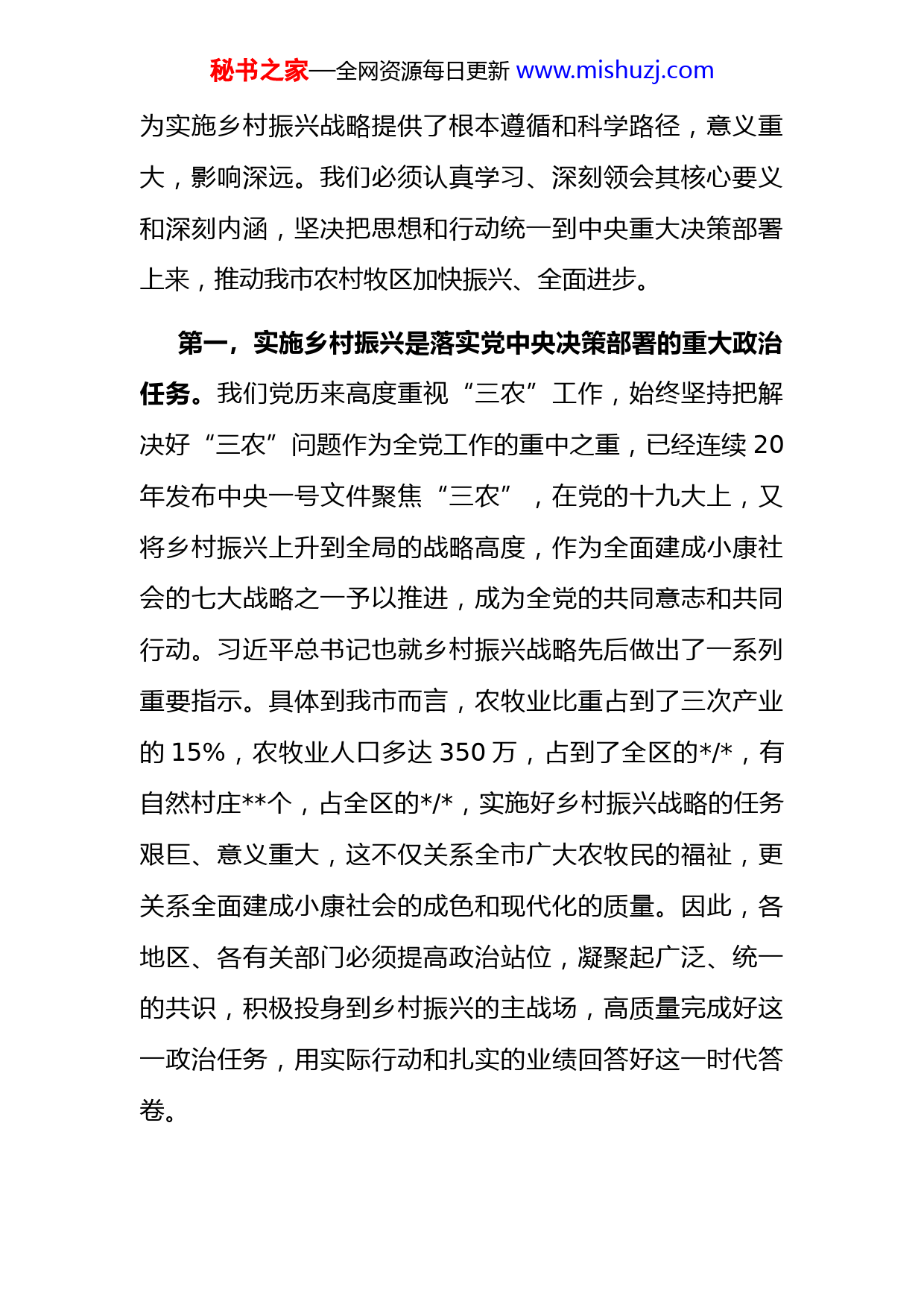 秘书之家—全网资源每日更新www.mishuzj.com同志们:今天会议的主要任务是,深入贯彻习近平总书记关于实施乡村振兴战略的重要思想,贯彻落实全国、全区实施乡村振兴战略工作推进会议精神,安排部署我市乡村振兴有关工作,不断开创“三农”工作的新局面。刚才,市直有关部门做了很好的发言,提出了一些有针对性的意见,各地区、各有关部门要有效结合各自工作实际,不折不扣地抓好贯彻落实。段书记随自治区党政考察团在浙江省学习委托我代表市委对全市乡村振兴工作进行安排部署。下面我讲三个方面的意见。一、提高政治站位,凝聚思想共识,深刻理解实施乡村振兴战略的重大意义实施乡村振兴战略,是以习近平同志为核心的党中央从党和国家事业全局出发,深刻把握现代化建设规律和城乡关系变化特征,着眼于实现“两个一百年”奋斗目标,顺应亿万农牧民对美好生活的向往作出的重大决策,是新时代“三农”工作的新旗帜和总抓手,在我国“三农”发展进程中具有划时代的里程碑意义。特别是,党的十九大以来,习近平总书记关于乡村振兴战略的一系列重要论述,科学阐释了为什么要振兴乡村、如何振兴乡村等重大问题秘书之家—全网资源每日更新www.mishuzj.com为实施乡村振兴战略提供了根本遵循和科学路径,意义重大,影响深远。我们必须认真学习、深刻领会其核心要义和深刻内涵,坚决把思想和行动统一到中央重大决策部署上来,推动我市农村牧区加快振兴、全面进步。第一,实施乡村振兴是落实党中央决策部署的重大政治任务。我们党历来高度重视“三农”工作,始终坚持把解决好“三农”问题作为全党工作的重中之重,已经连续20年发布中央一号文件聚焦“三农”,在党的十九大上,又将乡村振兴上升到全局的战略高度,作为全面建成小康社会的七大战略之一予以推进,成为全党的共同意志和共同行动。习近平总书记也就乡村振兴战略先后做出了一系列重要指示。具体到我市而言,农牧业比重占到了三次产业的15%,农牧业人口多达350万,占到了全区的/,有自然村庄个,占全区的/,实施好乡村振兴战略的任务艰巨、意义重大,这不仅关系全市广大农牧民的福祉,更关系全面建成小康社会的成色和现代化的质量。因此,各地区、各有关部门必须提高政治站位,凝聚起广泛、统一的共识,积极投身到乡村振兴的主战场,高质量完成好这一政治任务,用实际行动和扎实的业绩回答好这一时代答卷。秘书之家—全网资源每日更新www.mishuzj.com第二,实施乡村振兴是解决农村牧区主要矛盾的必由之路。党的十九大指出,我国社会的主要矛盾已经转化为人民日益增长的美好生活需要和不平衡不充分的发展之间的矛盾,这其中最大的不平衡,是城乡发展不平衡;最大的不充分,是农村牧区发展不充分。从我市目前农村牧区现状来看,仍然存在着诸多的发展短板。比如,农牧业生产方式粗放、产业化发展依然处于起步阶段,亟待培育新动能;比如,农村牧区基础设施和公共服务水平依然较低,生态宜居水平不高;比如,多数农牧民观念陈旧,缺乏一定的劳动技能,持续增收难度较大,等等。对标全面建成小康社会和开启现代化建设新征程的要求,这些都是我们必须补齐的发展短板,时间紧迫、任务繁重,我们要增强紧迫感,拿出闯关夺隘的勇气、披坚执锐的作风、只争朝夕的精神,扎扎实实地推进乡村振兴各项部署落地生根、开花结果。第三,实施乡村振兴是我们各级干部义不容辞的重大责任。进入新时代,我们比历史上任何时期都更有条件、有基础、有能力改变农村牧区面貌、造福农牧民群众,实施乡村振兴战略可以说是恰逢其时、大势所趋。特别是要清醒地认识到,对于我们这样欠发达的地区来说,国家实施秘书之家—全网资源每日更新www.mishuzj.com乡村振兴战略,为我们补齐短板、厚植优势、加快动力转换提供了重大战略机遇,是我们今后一个时期的工作主题为官一任,造福一方。我们一定要站在讲政治的高度、战略和全局的高度、对460万各族群众负责的高度,主动扛起乡村振兴的历史责任,准确把握全市“三农三牧”工作的新形势,迎难而上、担当作为,实际行动回答好这一时代课题。二、突出工作重点,坚持统筹推进,切实把乡村振兴战略的各项任务落到实处实施乡村振兴战略,是一项全局性、系统性的战略工程。中央、自治区和市委已经对这项工作进行了安排部署,目标和任务都已十分明确,关键是落实好“产业兴旺、生态宜居、乡风文明、治理有效、生活富裕”二十字精神。在年初的全市农村牧区暨脱贫攻坚工作会议上,段书记也就实施乡村振兴提出了明确要求,下发了《实施意见》,为全市实施乡村振兴战略提供了基本遵循。具体来说,在下一步的工作中,要注意做好五个方面的工作。第一,以产业兴旺为重点,推动产业集聚集中集约发展。产业兴旺的核心要义,就是要针对当前农牧业发展中产业分散、要素分散、经营分散等突出矛盾,以供给侧结构性秘书之家—全网资源每日更新www.mishuzj.com改革为主线,在集聚、集中、集约上下功夫,解决产业发展后劲不足的问题。一是在产业集聚上下功夫。持续深化农牧业供给侧结构性改革,重点抓好三方面工作:一要以市场为导向科学谋划产业布局,引导农牧民按统一模式组织生产,实现单一产品的规模化,解决农牧业产业布局分散、有产