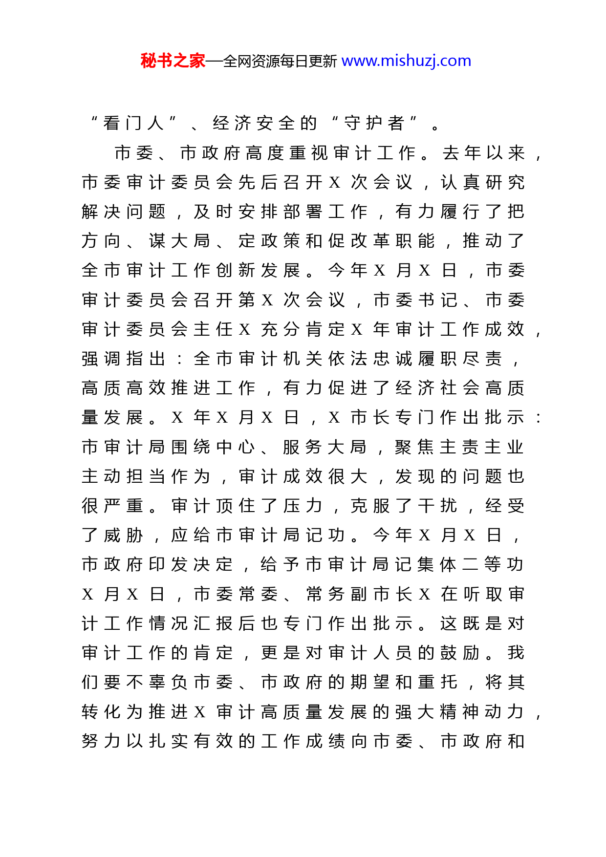 秘书之家—全网资源每日更新www.mishuzj.com依法履职尽责勇于担当作为充分发挥审计对经济社会发展运行的“探照灯”作用——在全市审计工作会上的讲话同志们:在疫情防控的特殊时期,我们采取特殊手段推动工作,今天的会议既是全市审计工作会,还是审计机关党风廉政建设会和创建全国文明单位动员大会,三会合一。这次会议的主题是以习近平新时代中国特色社会主义思想为指导深入学习贯彻习近平总书记关于审计工作的重要指示和全国审计工作会议、市委审计委员会第X次会议和X届市纪委X次全会精神,认真总结X年全市审计工作,研究部署X年工作任务,安排部署全国文明单位创建工作,表彰先进,增强信心,动员、激励审计干部依法履职尽责,勇于担当作为,既要做好“卫士”,更要当好“谋士”,充分发挥审计对经济社会发展运行的“探照灯”作用,当好国家财产的秘书之家—全网资源每日更新www.mishuzj.com“看门人”、经济安全的“守护者”。市委、市政府高度重视审计工作。去年以来,市委审计委员会先后召开X次会议,认真研究解决问题,及时安排部署工作,有力履行了把方向、谋大局、定政策和促改革职能,推动了全市审计工作创新发展。今年X月X日,市委审计委员会召开第X次会议,市委书记、市委审计委员会主任X充分肯定X年审计工作成效,强调指出:全市审计机关依法忠诚履职尽责,高质高效推进工作,有力促进了经济社会高质量发展。X年X月X日,X市长专门作出批示:市审计局围绕中心、服务大局,聚焦主责主业主动担当作为,审计成效很大,发现的问题也很严重。审计顶住了压力,克服了干扰,经受了威胁,应给市审计局记功。今年X月X日,市政府印发决定,给予市审计局记集体二等功X月X日,市委常委、常务副市长X在听取审计工作情况汇报后也专门作出批示。这既是对审计工作的肯定,更是对审计人员的鼓励。我们要不辜负市委、市政府的期望和重托,将其转化为推进X审计高质量发展的强大精神动力,努力以扎实有效的工作成绩向市委、市政府和秘书之家—全网资源每日更新www.mishuzj.com全市人民交上满意的答卷。下面,讲三点意见。一、以开展“不忘初心、牢记使命”主题教育为动力,X年全市审计工作取得明显成效全市审计机关扎实开展“不忘初心、牢记使命”主题教育,深入贯彻落实中央、省、市对审计工作的部署要求,紧扣工作中心大局,依法忠诚履职尽责,审计工作的层次和水平全面提升,在促进全市经济高质量发展上做出了新贡献。X年,全市完成审计项目X个,查出各类违规资金X亿元、损失浪费资金X亿元,促进整改落实有关问题资金X亿元;向纪检监察机关和有关部门移送处理事项X件,移送处理人员X人;核减重点建设项目投资额X亿元,较好地履行了国家财产的“看门人”和经济安全的“守护者”职责。X年,市审计局被市委、市政府表彰为综合考评一等奖(在今年全市综合考评中,市审计局获得执法部门一等奖第一名。原定大年正月初七举行全市总结表彰大会市局作为第一名由市委书记授奖牌,因为疫情防控原因会议延期举行);被表彰为全市先进党组织、全市政务信息先进单位、全市慈善捐赠先进单位;荣获省审计厅表彰的全省跟踪审秘书之家—全网资源每日更新www.mishuzj.com计、扶贫审计、地方政府性债务审计调查、基础教育专项审计等X个先进集体;同时还是在届省级文明单位(标兵)、省级卫生先进单位全市平安建设先进单位,党建“七个一”工作法得到省审计厅和市直工委的肯定与好评。全市审计机关获得全省优秀审计项目X个,其中市审计局组织实施的范县党政主要领导干部经济责任同步审计项目获得全省优秀审计项目特等奖,并被省审计厅推荐参评审计署优秀审计项目;此外,X县X年本级预算执行及其他财政收支审计项目、X县X至X年度卫生政策落实和资金绩效情况专项审计调查项目被评为全省优秀审计项目一等奖。(一)各级审计委员会有效履行职能,党的领导全面加强。X年,是市、县(区)审计委员会全面履行职责的第一年,党对审计工作的领导全面加强。市委审计委员会于X年X月X日、X月X日、X月X日和今年X月X日先后召开四次会议,研究重大审计事项,安排部署审计工作,为全市审计工作提供了强有力的政治保证。仅去年一年,市委常委会、市政府常务会议就X次专题研究审计事项,市委书记办秘书之家—全网资源每日更新www.mishuzj.com公会议、市长办公会议X次研究审计工作,X书记、X市长等领导同志先后X次对审计结果作出批示,市委、市政府对审计工作的重视和支持力度为历年之最。各县(区)委根据工作实际,先后多次召开审计委员会会议,有效发挥了总揽、统筹职能。(二)扎实开展“不忘初心、牢记使命”主题教育,理想信念更加坚定。全市审计机关按照“守初心、担使命,找差距、抓落实”的总要求,坚持将“学习教育、调查研究、检视问题、整改落实”贯穿始终。创新工作开展方式把主题教育开展到审计现场、主题教育延伸到审计一线,实现主题教育全覆盖、无盲区。领导班子以上率下,领导干部以身作则,领导小组精心组织,强化学习,强化调研,强化检视强化整改,全市审计机关政治境界、思想境界道德境界明显提升,为审计工作提供了强大动力。(三)围绕中央、省、市重大决策部署,审计项目精准实施。X年,全市审计机关坚持党委工作推进到