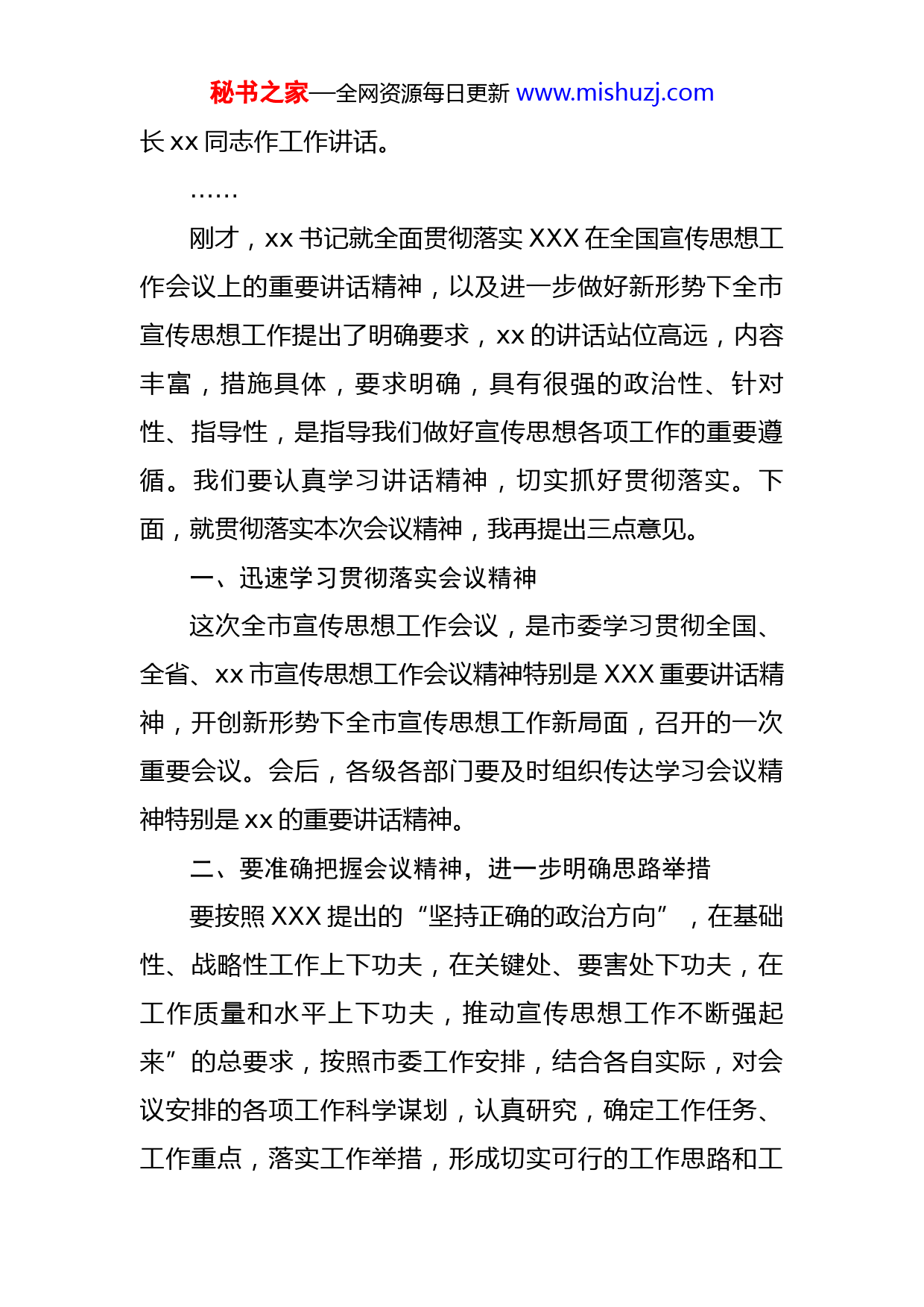 秘书之家—全网资源每日更新www.mishuzj.com在全市宣传思想工作会议上的主持词同志们:现在开会。今天市委召开全市宣传工作会议,主要任务是深入学习贯彻XXX在全国宣传工作会议上的重要讲话精神,深入学习贯彻全国xx省和xx市宣传工作会议精神,全面安排部署xx市当前和今后一个时期新时代宣传工作。出席今天会议的市领导有:市委、人大、政府、政协在家领导同志,市人民法院院长、人民检察院检察长;参加今天会议的还有:各镇(街道)党(工)委书记、宣传委员;人大办、政府办、政协办主要负责同志;市直各部门,各人民团体、企事业党委(党组)主要负责同志;市委宣传部班子成员,市宣传文化系统各单位主要负责同志。今天的会议共有两项议程:一是请市委书记xx同志作主旨讲话;二是市委常委、宣传部部长xx同志作工作讲话。下面,逐项进行首先,请市委书记xx同志作主旨讲话,大家欢迎。……下面,进行会议第二项议程,请市委常委、宣传部部秘书之家—全网资源每日更新www.mishuzj.com长xx同志作工作讲话。……刚才,xx书记就全面贯彻落实XXX在全国宣传思想工作会议上的重要讲话精神,以及进一步做好新形势下全市宣传思想工作提出了明确要求,xx的讲话站位高远,内容丰富,措施具体,要求明确,具有很强的政治性、针对性、指导性,是指导我们做好宣传思想各项工作的重要遵循。我们要认真学习讲话精神,切实抓好贯彻落实。下面,就贯彻落实本次会议精神,我再提出三点意见。一、迅速学习贯彻落实会议精神这次全市宣传思想工作会议,是市委学习贯彻全国、全省、xx市宣传思想工作会议精神特别是XXX重要讲话精神,开创新形势下全市宣传思想工作新局面,召开的一次重要会议。会后,各级各部门要及时组织传达学习会议精神特别是xx的重要讲话精神。二、要准确把握会议精神,进一步明确思路举措要按照XXX提出的“坚持正确的政治方向”,在基础性、战略性工作上下功夫,在关键处、要害处下功夫,在工作质量和水平上下功夫,推动宣传思想工作不断强起来”的总要求,按照市委工作安排,结合各自实际,对会议安排的各项工作科学谋划,认真研究,确定工作任务、工作重点,落实工作举措,形成切实可行的工作思路和工秘书之家—全网资源每日更新www.mishuzj.com作方案,推动宣传思想工作再上新台阶。三、要切实构建起大宣传工作格局宣传思想工作是一项政治性强、涉及面广、影响力大的系统工程。做好新时期的宣传思想工作,一定要整体谋划、专项策划,整合各种资源,调动各方力量,形成上下贯通、横向联通、内外互通的大宣传工作格局。宣传文化系统要充分发挥职能作用,协调配合,拧成“一股绳”,打好“组合拳”,各条战线、各个部门要积极主动参与到宣传思想工作中来,形成全社会支持宣传思想工作的浓厚氛围和强大合力,为建设绿色美丽发展xx提供思想保障、智力支持和精神动力。全市宣传思想工作会议散会!