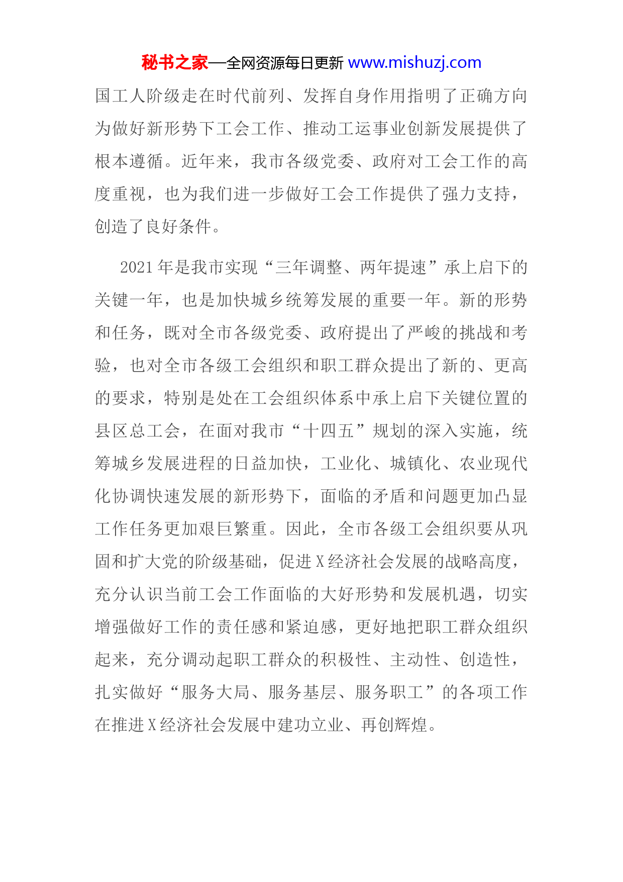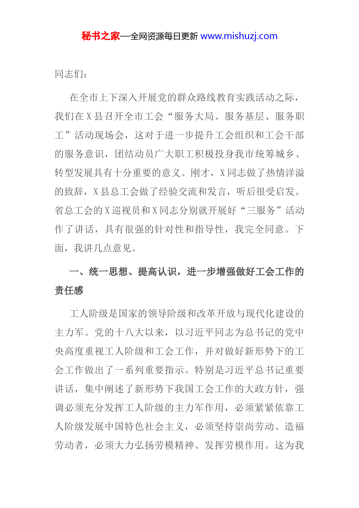 秘书之家—全网资源每日更新www.mishuzj.com同志们:在全市上下深入开展党的群众路线教育实践活动之际,我们在X县召开全市工会“服务大局、服务基层、服务职工”活动现场会,这对于进一步提升工会组织和工会干部的服务意识,团结动员广大职工积极投身我市统筹城乡、转型发展具有十分重要的意义。刚才,X同志做了热情洋溢的致辞,X县总工会做了经验交流和发言,听后很受启发。省总工会的X巡视员和X同志分别就开展好“三服务”活动作了讲话,具有很强的针对性和指导性,我完全同意。下面,我讲几点意见。一、统一思想、提高认识,进一步增强做好工会工作的责任感工人阶级是国家的领导阶级和改革开放与现代化建设的主力军。党的十八大以来,以习近平同志为总书记的党中央高度重视工人阶级和工会工作,并对做好新形势下的工会工作做出了一系列重要指示。特别是习近平总书记重要讲话,集中阐述了新形势下我国工会工作的大政方针,强调必须充分发挥工人阶级的主力军作用,必须紧紧依靠工人阶级发展中国特色社会主义,必须坚持崇尚劳动、造福劳动者,必须大力弘扬劳模精神、发挥劳模作用。这为我秘书之家—全网资源每日更新www.mishuzj.com国工人阶级走在时代前列、发挥自身作用指明了正确方向为做好新形势下工会工作、推动工运事业创新发展提供了根本遵循。近年来,我市各级党委、政府对工会工作的高度重视,也为我们进一步做好工会工作提供了强力支持,创造了良好条件。2021年是我市实现“三年调整、两年提速”承上启下的关键一年,也是加快城乡统筹发展的重要一年。新的形势和任务,既对全市各级党委、政府提出了严峻的挑战和考验,也对全市各级工会组织和职工群众提出了新的、更高的要求,特别是处在工会组织体系中承上启下关键位置的县区总工会,在面对我市“十四五”规划的深入实施,统筹城乡发展进程的日益加快,工业化、城镇化、农业现代化协调快速发展的新形势下,面临的矛盾和问题更加凸显工作任务更加艰巨繁重。因此,全市各级工会组织要从巩固和扩大党的阶级基础,促进X经济社会发展的战略高度,充分认识当前工会工作面临的大好形势和发展机遇,切实增强做好工作的责任感和紧迫感,更好地把职工群众组织起来,充分调动起职工群众的积极性、主动性、创造性,扎实做好“服务大局、服务基层、服务职工”的各项工作在推进X经济社会发展中建功立业、再创辉煌。秘书之家—全网资源每日更新www.mishuzj.com二、以开展“三服务”活动为契机,推进全市工会工作深入开展我认为,X县总工会的经验概括起来有四条:一是领导重视。县委、县政府把工会工作纳入了全县工作大局,从组织建设、班子配备、经费保障、体制机制、基础设施改善等方面给予了全方位的支持,并把工会工作纳入目标责任考核。二是工作扎实。县委、县政府主要领导定期、不定期深入县总工会和基层工会,听取工作汇报,帮助工会和职工解决具体问题。县委分管领导经常与县总工会的同志一起研究工作。县委常委会能坚持专题研究工会工作,工会与政府的联席会议也实现了规范化、制度化,全县上下形成了“县委加强领导、政府大力支持、工会真抓实干社会各界积极配合”的工会工作新格局。三是特色鲜明。X县总工会坚持将工会工作和X县的实际紧密结合,因地制宜、知难而进、千方百计,创造性地工作,形成自身特色,取得了明显成效。四是领导班子坚强有力。X县总工会一班人政治素质高,具有强烈的事业心和责任感,工作作风过硬抓落实积极有力,以工作实绩赢得了职工的信任和支持。X县总工会的做法亮点突出、富有成效。希望同志们也能从中受到启发,发挥优势、主动作为,努力推进全市工会工作。一是坚持更好服务大局,团结带领广大职工为经秘书之家—全网资源每日更新www.mishuzj.com济社会发展做贡献。全市各级工会组织要紧紧围绕“三个X”建设,在我市能源化工基地建设、农村主导产业开发、重点项目建设和生态环境建设、社会事业发展等方面发挥主力军作用,认真开展“当好主力军、建功十二五”和职业技能大赛等群众性建功立业活动,组织引导职工立足本职,服务大局,广泛开展合理化建议、岗位练兵、技术革新、劳动竞赛和创建“工人先锋号”等活动,不断激发广大职工的劳动热情和创造活力,始终站在加快X科学发展的最前列。二是坚持更好服务基层,不断增强基层工会的生机和活力。工会工作就是要做好群众工作、做实基层工作全市各级工会组织要发挥贴近基层、贴近职工的优势,不断增强服务意识,提高服务能力,创新服务手段,拓展服务领域,把更多的时间、精力和财力投向基层工会,切实加强基层工会建设,帮助其解决没人干事、没钱办事、“家不像家”的问题。要建立和完善各级工会领导干部深入基层联系点联系户制度,定期下基层调研督查抓落实,切实解决一些工会干部工作作风不实、对基层和职工群众没有感情、“不像娘家人”的问题。三是坚持更好服务职工,切实保障和维护职工权益。只有让职工群众真正感受到工会是真正的“职工之家”,工会干部是最可信赖的“娘家人”,才能团结全体职工,凝聚正能量,实现中华民族伟大复兴的中国梦。全市各级工会要围绕做好新形势秘书之家—全网资源每日更新www.