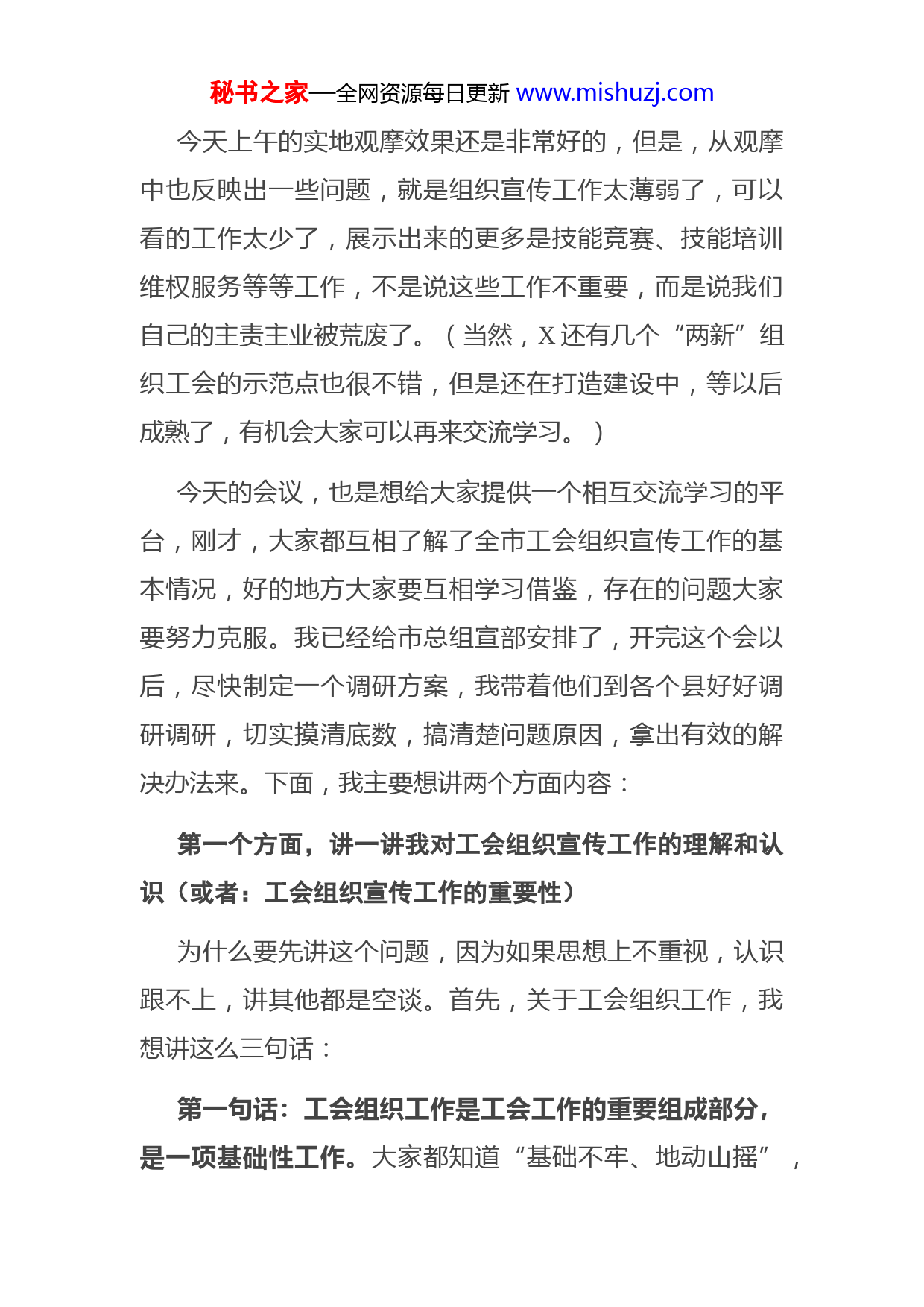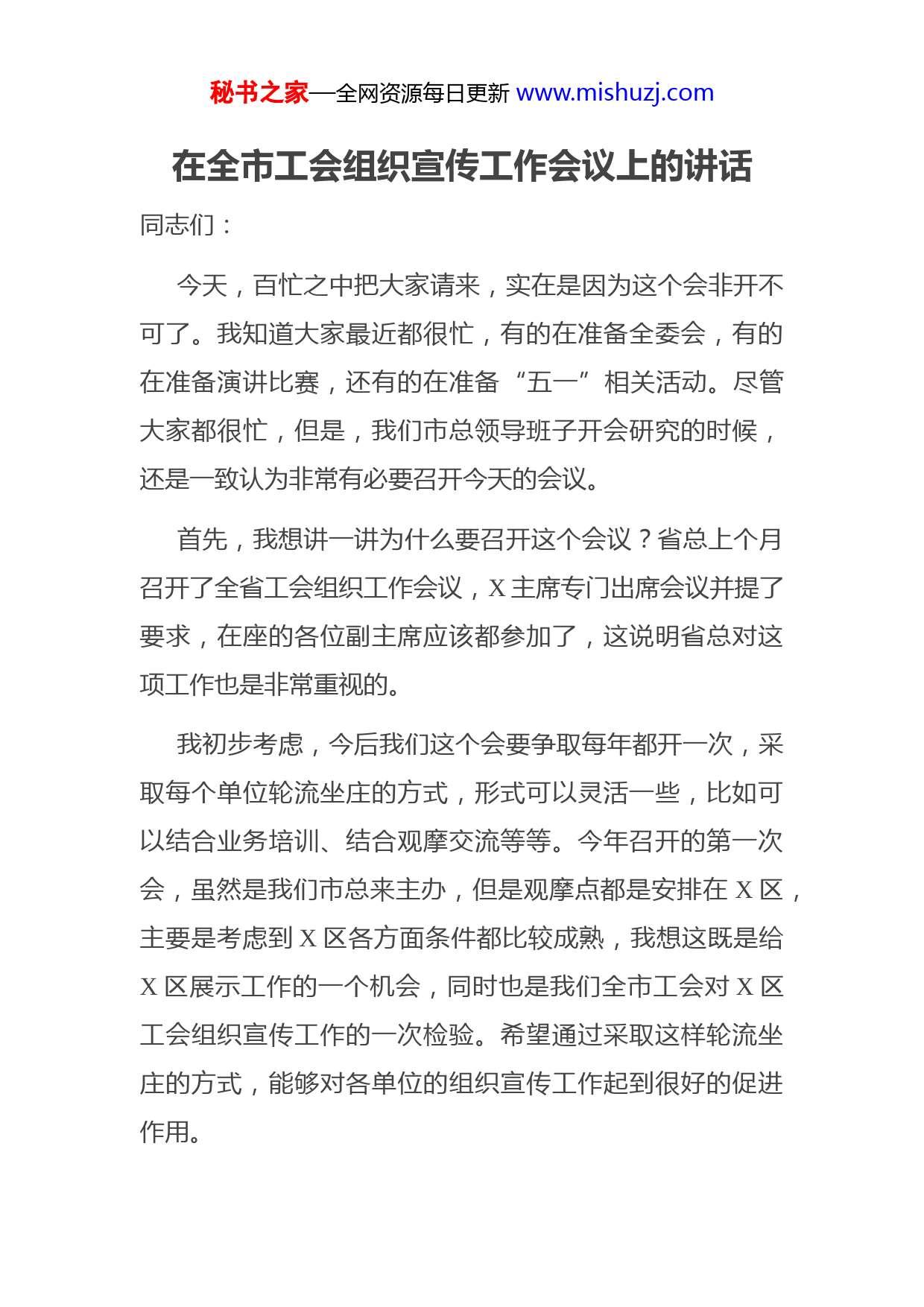秘书之家—全网资源每日更新www.mishuzj.com在全市工会组织宣传工作会议上的讲话同志们:今天,百忙之中把大家请来,实在是因为这个会非开不可了。我知道大家最近都很忙,有的在准备全委会,有的在准备演讲比赛,还有的在准备“五一”相关活动。尽管大家都很忙,但是,我们市总领导班子开会研究的时候,还是一致认为非常有必要召开今天的会议。首先,我想讲一讲为什么要召开这个会议?省总上个月召开了全省工会组织工作会议,X主席专门出席会议并提了要求,在座的各位副主席应该都参加了,这说明省总对这项工作也是非常重视的。我初步考虑,今后我们这个会要争取每年都开一次,采取每个单位轮流坐庄的方式,形式可以灵活一些,比如可以结合业务培训、结合观摩交流等等。今年召开的第一次会,虽然是我们市总来主办,但是观摩点都是安排在X区,主要是考虑到X区各方面条件都比较成熟,我想这既是给X区展示工作的一个机会,同时也是我们全市工会对X区工会组织宣传工作的一次检验。希望通过采取这样轮流坐庄的方式,能够对各单位的组织宣传工作起到很好的促进作用。秘书之家—全网资源每日更新www.mishuzj.com今天上午的实地观摩效果还是非常好的,但是,从观摩中也反映出一些问题,就是组织宣传工作太薄弱了,可以看的工作太少了,展示出来的更多是技能竞赛、技能培训维权服务等等工作,不是说这些工作不重要,而是说我们自己的主责主业被荒废了。(当然,X还有几个“两新”组织工会的示范点也很不错,但是还在打造建设中,等以后成熟了,有机会大家可以再来交流学习。)今天的会议,也是想给大家提供一个相互交流学习的平台,刚才,大家都互相了解了全市工会组织宣传工作的基本情况,好的地方大家要互相学习借鉴,存在的问题大家要努力克服。我已经给市总组宣部安排了,开完这个会以后,尽快制定一个调研方案,我带着他们到各个县好好调研调研,切实摸清底数,搞清楚问题原因,拿出有效的解决办法来。下面,我主要想讲两个方面内容:第一个方面,讲一讲我对工会组织宣传工作的理解和认识(或者:工会组织宣传工作的重要性)为什么要先讲这个问题,因为如果思想上不重视,认识跟不上,讲其他都是空谈。首先,关于工会组织工作,我想讲这么三句话:第一句话:工会组织工作是工会工作的重要组成部分,是一项基础性工作。大家都知道“基础不牢、地动山摇”,秘书之家—全网资源每日更新www.mishuzj.com按照省总开会时候的说法,组织工作甚至占到了工会工作的“半壁江山”。习近平总书记关于加强基层工会建设“三个着力”的重要批示,第一个“着力”就是要“着力扩大覆盖面”,如果没有强有力的组织工作,就不可能把广大职工凝聚在党的周围,更不可能做好其他维权服务工作。第二句话:工会组织工作是一项“慢活计”。所谓“慢”,一方面是想要在短时间内干出成绩很难,另一方面是如果大家不干,短期内也出不了多严重的问题。现在有的单位、有的人,比较急功近利,只想着快出成绩,什么工作好干就干什么,什么工作容易出成绩就干什么,都不愿意干打基础的工作,长此以往,早晚是要出问题的。第三句话:工会组织工作是一项“看人脸色”的工作(或者:是一项非常难干的工作)。每个单位都有好干的工作,也有难干的工作。比如说给人发钱、给人表彰、给人授牌这类工作相对就好干一些,不仅不需要“看人脸色”,甚至他们还会主动找上门来协调。但是,比如“两新”组织建会、“八大群体”入会、基层工会规范化建设、厂务公开民主管理等组织工作,企业本身是没有精力做、也不愿意做的,这类工作就是要“看人脸色”的工作,人秘书之家—全网资源每日更新www.mishuzj.com家不仅不会主动找我们,就算我们主动找他们协调,他们也不见得会做。总之,虽然工会组织工作不好干,但是如果干不好,必定会影响到工会的方方面面,甚至动摇工会的根基,所以大家一定要引起高度重视。下面,关于工会宣传工作,我也想讲这么三句话:第一句话:工会宣传工作是党的宣传工作的重要组成部分。我们党历来高度重视发挥宣传工作的重要作用,宣传工作也是我们党的优良传统和政治优势。工会作为党联系职工群众的桥梁和纽带,工人阶级又是我国的领导阶级,因此,工会宣传工作在党的宣传工作中具有重要的作用,在工会的各项工作中也起着重要的先导、促进和保证作用,为工会工作的创新发展提供坚强的思想保证。第二句话:工会宣传工作是工会工作的“传声筒”。做好宣传工作,离不开宣传阵地。虽然县级工会的杂志基本上都已经停办了,但是各单位也基本都有自己的官方微信公众号、微博账号等新媒体宣传阵地。强化职工思想政治引领,是工会的一项重要政治任务,这就需要我们守好、用好工会宣传阵地,讲好劳动者故事,传播工会好声音,传递工会正能量。秘书之家—全网资源每日更新www.mishuzj.com第三句话:工会宣传工作是工会工作的“倍增器”。宣传工作就像“放大镜”一样,能让工会工作取得事半功倍的效果。应该说,这些年,我们各级工会做了很多工作,干了很多服务职工的实事,但是,如果只是埋头做事,不总结提炼经验,不做好宣传报道,工作效果就会大打折扣因此,及时向党委政府、上级工会和职工群众宣传好工会工作是非常必要的。我想,这几句话,也说明了工