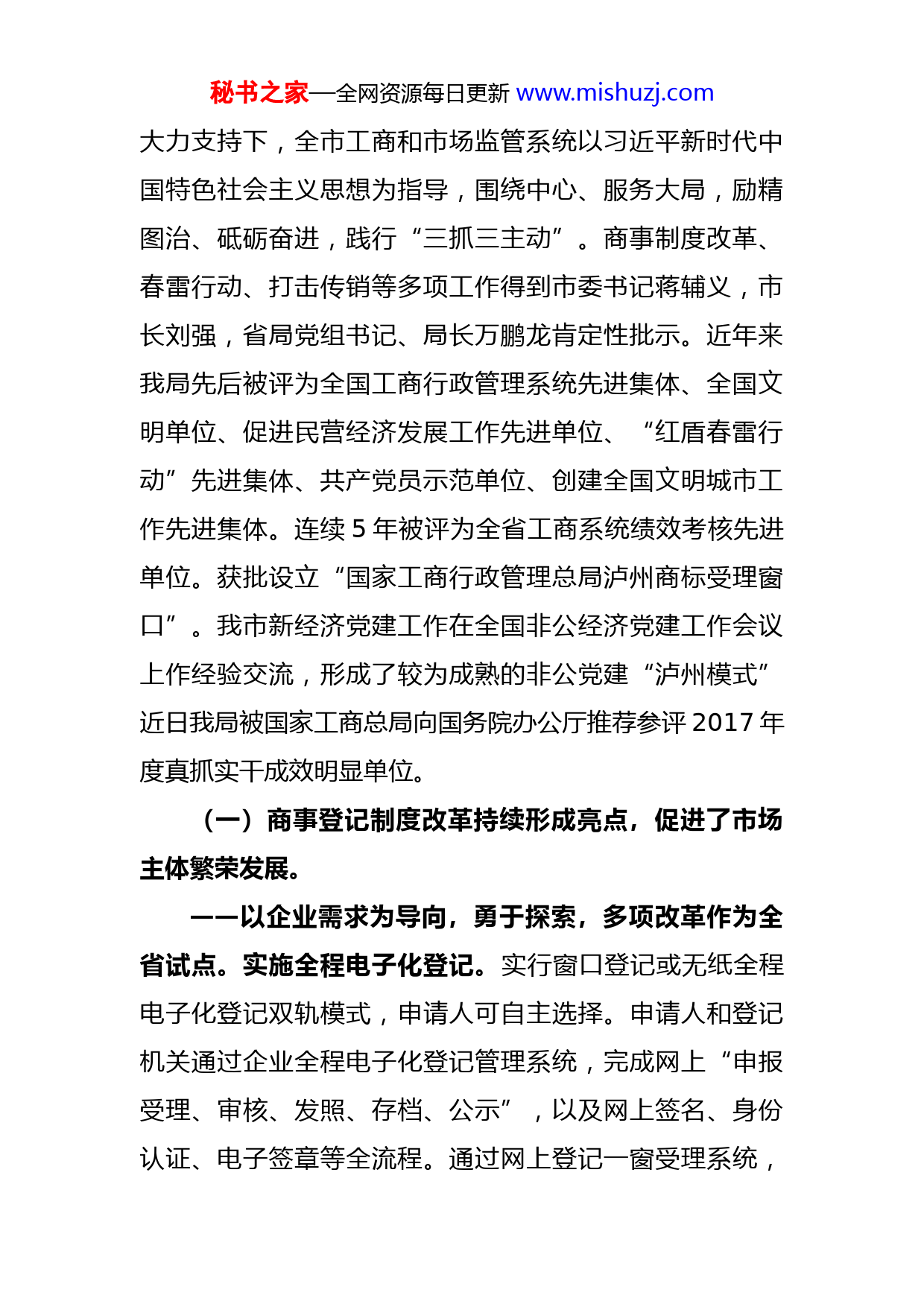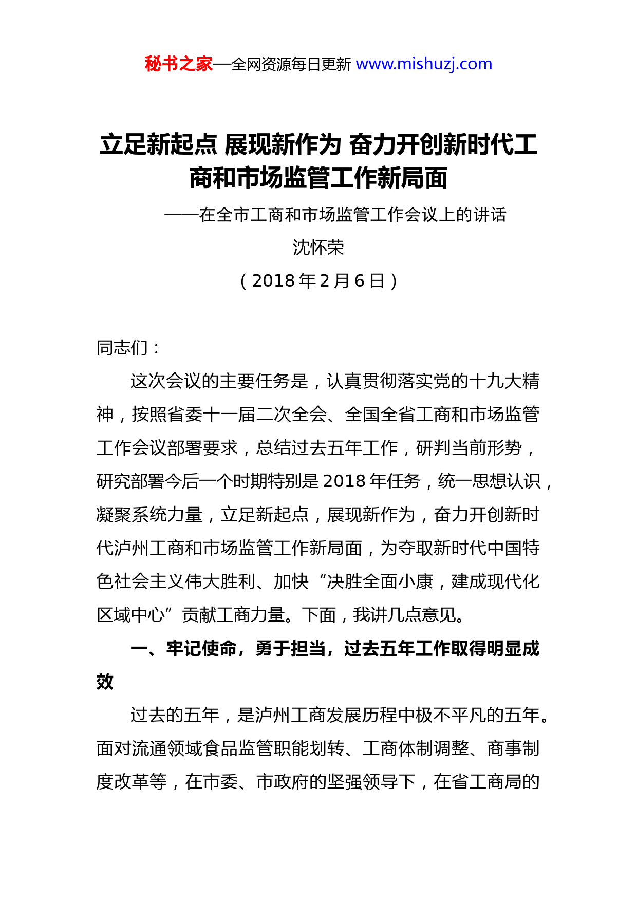 秘书之家—全网资源每日更新www.mishuzj.com立足新起点展现新作为奋力开创新时代工商和市场监管工作新局面——在全市工商和市场监管工作会议上的讲话沈怀荣(2018年2月6日)同志们:这次会议的主要任务是,认真贯彻落实党的十九大精神,按照省委十一届二次全会、全国全省工商和市场监管工作会议部署要求,总结过去五年工作,研判当前形势,研究部署今后一个时期特别是2018年任务,统一思想认识,凝聚系统力量,立足新起点,展现新作为,奋力开创新时代泸州工商和市场监管工作新局面,为夺取新时代中国特色社会主义伟大胜利、加快“决胜全面小康,建成现代化区域中心”贡献工商力量。下面,我讲几点意见。一、牢记使命,勇于担当,过去五年工作取得明显成效过去的五年,是泸州工商发展历程中极不平凡的五年。面对流通领域食品监管职能划转、工商体制调整、商事制度改革等,在市委、市政府的坚强领导下,在省工商局的秘书之家—全网资源每日更新www.mishuzj.com大力支持下,全市工商和市场监管系统以习近平新时代中国特色社会主义思想为指导,围绕中心、服务大局,励精图治、砥砺奋进,践行“三抓三主动”。商事制度改革、春雷行动、打击传销等多项工作得到市委书记蒋辅义,市长刘强,省局党组书记、局长万鹏龙肯定性批示。近年来我局先后被评为全国工商行政管理系统先进集体、全国文明单位、促进民营经济发展工作先进单位、“红盾春雷行动”先进集体、共产党员示范单位、创建全国文明城市工作先进集体。连续5年被评为全省工商系统绩效考核先进单位。获批设立“国家工商行政管理总局泸州商标受理窗口”。我市新经济党建工作在全国非公经济党建工作会议上作经验交流,形成了较为成熟的非公党建“泸州模式”近日我局被国家工商总局向国务院办公厅推荐参评2017年度真抓实干成效明显单位。(一)商事登记制度改革持续形成亮点,促进了市场主体繁荣发展。——以企业需求为导向,勇于探索,多项改革作为全省试点。实施全程电子化登记。实行窗口登记或无纸全程电子化登记双轨模式,申请人可自主选择。申请人和登记机关通过企业全程电子化登记管理系统,完成网上“申报受理、审核、发照、存档、公示”,以及网上签名、身份认证、电子签章等全流程。通过网上登记一窗受理系统,秘书之家—全网资源每日更新www.mishuzj.com在网上即可全程完成工商登记、海关备案、公安刻章、银行授信等业务,从而提高市场主体登记管理的信息化、便利化、规范化水平。截止12月25日,全市通过系统申请企业注册登记939件,已核准809件。研发了泸州市个体全程电子化登记系统,开通手机微信登记功能,个体户通过微信进行个体申报、实名认证、在线电子签名,实现全程通过手机办理个体营业执照。深化名称登记改革试点。深入实施放宽名称文字使用、登记、行业表述条件、允许企业名称延长核准有限期限等举措。实行企业名称自主申报、自主查重、自主选用制,并授权自贸区川南临港片区核准市辖区名称与市行区划连用以及冠市级行政区划的企业名称等。通过改革,进一步释放名称资源,拓展名称登记范畴,提升名称登记效能,2016-2017年度,全市办理企业名称预先核准登记15189户,较2014-2015年度同期增长61.99%。深化住所(经营场所)登记改革试点。简化住所(经营场所)提交材料与流程,负面清单外实行住所(经营场所)信息申报承诺制,登记机关对申请人提交的住所使用证明材料、住所信息申报材料实行形式审查申请人对其提交的材料的真实性、合法性负责。探索开展异地登记注册,允许“一照多址”“一址多照”,最大限度的放宽企业住所(经营场所)登记条件与限制,有序释放场地资源。改革至今,办理“一址多照”4087户,受理秘书之家—全网资源每日更新www.mishuzj.com住所信息承诺申报制登记444户。推行企业简易注销登记改革。2017年3月起,在全市全面推行企业简易注销登记改革,在“宽进”的同时,让企业“快退”。降低市场主体退出成本。目前,全市准备进行简易注销的企业已自主公示1023户,已核准497户,不予核准注销2户,不予受理83户,正在进行公告245户,撤销公告18户,公告过期170户,已收件8户。——以简政放权为导向,敢于创新,积极服务自贸区建设。开展“证照分离”改革试点。为破解企业“办照容易办证难”、“准入不准营”等突出问题,在中国(四川)自由贸易试验区川南临港片区开展“证照分离”改革试点,改革涉及51项行政许可事项。改革清理和取消了3项行政许可事项,1项行政许可事项由审批改为备案,15项行政许可事项实行告知承诺制,提高16项办理行政许可事项的透明度和可预期性,对16项涉及公共安全等特定活动加强市场准入管理。通过开展“证照分离”改革试点,为企业提供了便捷高效优质服务,有利于企业加快适应国际通行的投资贸易规则,提高市场竞争能力,形成法治化国际化、便利化的营商环境。开展“多证合一”改革试点。在“五证合一”的基础上增加了《印章入网证》《海关报关单位注册登记证书》《出入境检验检疫报检企业备案表》《对外贸易经营者备案登记表》《外企企业设立(变秘书之家—全网资源每日更新www.mishuzj.com更)备案回执》等证照,进一步简化、规范、统一登记条件与流程,实行一个窗口办理和解答咨询,