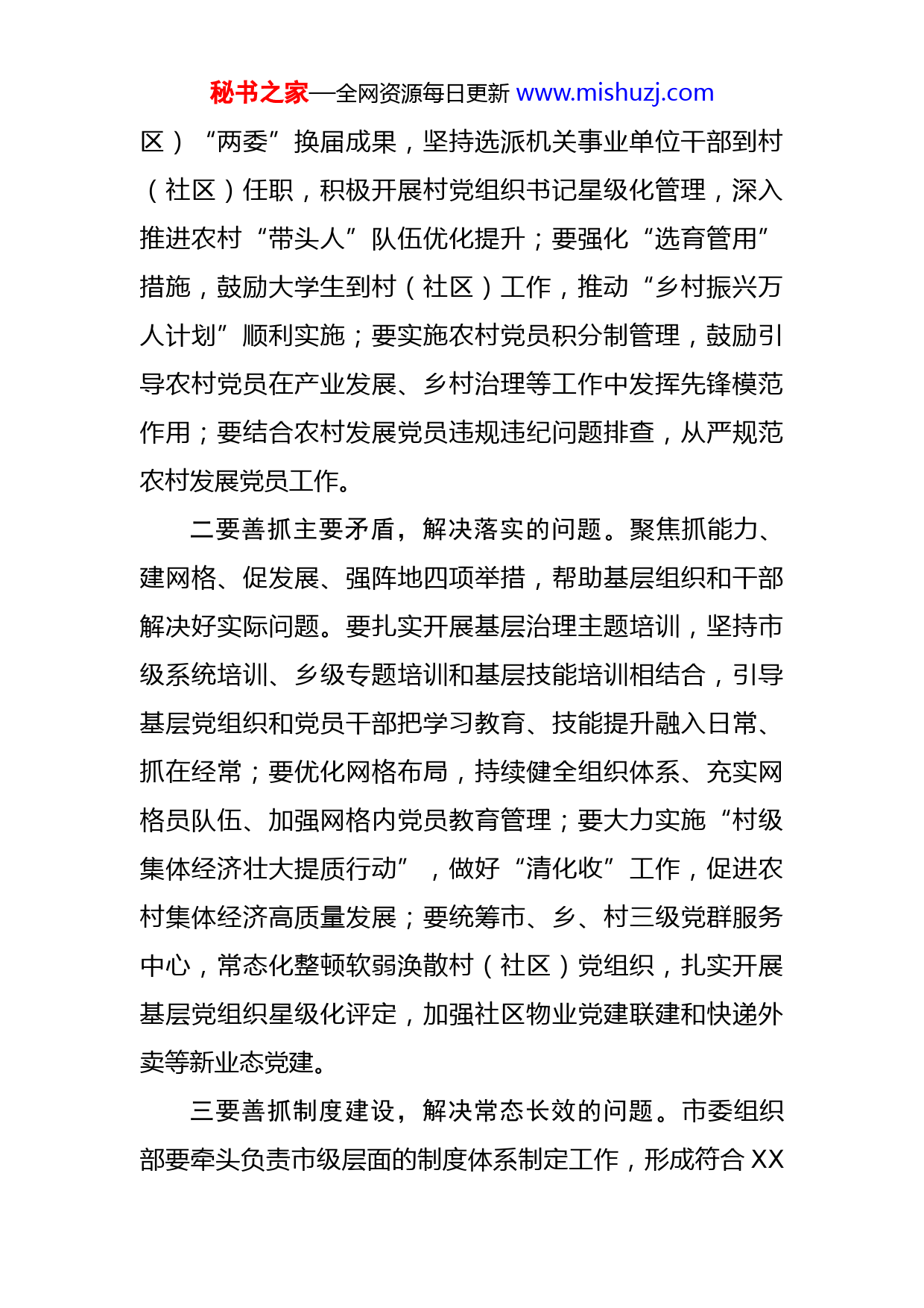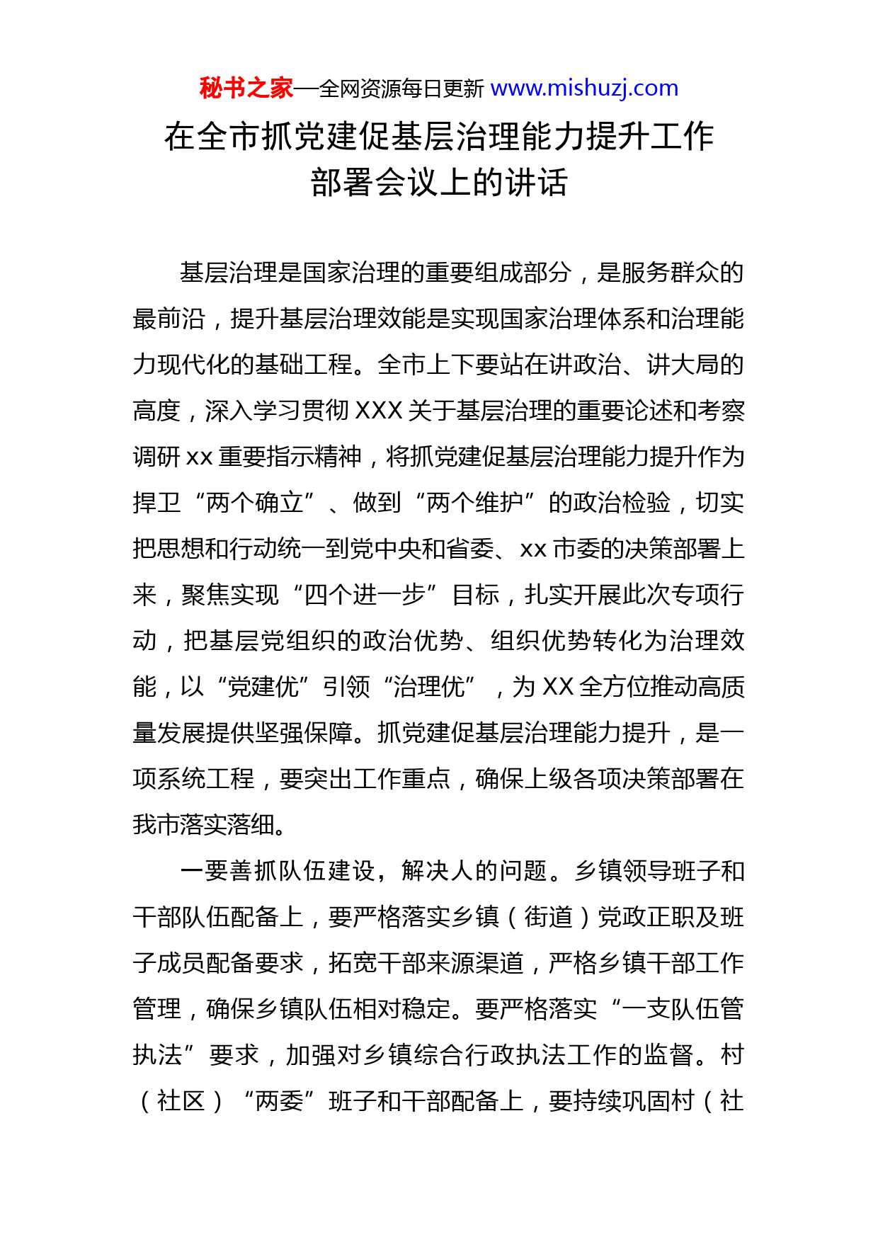 秘书之家—全网资源每日更新www.mishuzj.com在全市抓党建促基层治理能力提升工作部署会议上的讲话基层治理是国家治理的重要组成部分,是服务群众的最前沿,提升基层治理效能是实现国家治理体系和治理能力现代化的基础工程。全市上下要站在讲政治、讲大局的高度,深入学习贯彻XXX关于基层治理的重要论述和考察调研xx重要指示精神,将抓党建促基层治理能力提升作为捍卫“两个确立”、做到“两个维护”的政治检验,切实把思想和行动统一到党中央和省委、xx市委的决策部署上来,聚焦实现“四个进一步”目标,扎实开展此次专项行动,把基层党组织的政治优势、组织优势转化为治理效能,以“党建优”引领“治理优”,为XX全方位推动高质量发展提供坚强保障。抓党建促基层治理能力提升,是一项系统工程,要突出工作重点,确保上级各项决策部署在我市落实落细。一要善抓队伍建设,解决人的问题。乡镇领导班子和干部队伍配备上,要严格落实乡镇(街道)党政正职及班子成员配备要求,拓宽干部来源渠道,严格乡镇干部工作管理,确保乡镇队伍相对稳定。要严格落实“一支队伍管执法”要求,加强对乡镇综合行政执法工作的监督。村(社区)“两委”班子和干部配备上,要持续巩固村(社秘书之家—全网资源每日更新www.mishuzj.com区)“两委”换届成果,坚持选派机关事业单位干部到村(社区)任职,积极开展村党组织书记星级化管理,深入推进农村“带头人”队伍优化提升;要强化“选育管用”措施,鼓励大学生到村(社区)工作,推动“乡村振兴万人计划”顺利实施;要实施农村党员积分制管理,鼓励引导农村党员在产业发展、乡村治理等工作中发挥先锋模范作用;要结合农村发展党员违规违纪问题排查,从严规范农村发展党员工作。二要善抓主要矛盾,解决落实的问题。聚焦抓能力、建网格、促发展、强阵地四项举措,帮助基层组织和干部解决好实际问题。要扎实开展基层治理主题培训,坚持市级系统培训、乡级专题培训和基层技能培训相结合,引导基层党组织和党员干部把学习教育、技能提升融入日常、抓在经常;要优化网格布局,持续健全组织体系、充实网格员队伍、加强网格内党员教育管理;要大力实施“村级集体经济壮大提质行动”,做好“清化收”工作,促进农村集体经济高质量发展;要统筹市、乡、村三级党群服务中心,常态化整顿软弱涣散村(社区)党组织,扎实开展基层党组织星级化评定,加强社区物业党建联建和快递外卖等新业态党建。三要善抓制度建设,解决常态长效的问题。市委组织部要牵头负责市级层面的制度体系制定工作,形成符合XX秘书之家—全网资源每日更新www.mishuzj.com实际的制度体系。要建立健全市、乡、村三级定期分析研判制度、健全领导包联机制、基层治理清单报告公示和监督举报制度,严格落实市级领导包联乡镇(街道)责任制、乡街吹哨部门报到、“三级包保”和“五包一”、市级领导挂牌检查煤矿等制度,常态化开展党员到社区报到活动和“我为群众办实事”实践活动,建立起用制度管权、按制度办事、靠制度管人的良好格局。四要善抓法治建设,解决规范化的问题。要将法治思维贯穿到基层治理各领域各方面各环节,日常性开展法制宣传教育,形成“机关、企业、学校、村(社区)、家庭、个人”“六位一体”的法制宣传教育体系;要坚持以法治理念、法治精神思考问题,用法治方式、法律规则处理问题,持续营造办事依法、遇事找法、解决问题用法、化解矛盾靠法的浓厚氛围。要深化家庭文明建设,开展“星级文明户”评选,引导城乡居民崇德向善。要强化政治引领,以高质量组织保障促进基层治理水平提升。要加强组织领导。要把抓党建促乡村治理能力提升作为各级党(工)委书记抓基层党建工作述职评议的重要内容,层层压紧压实责任,市委组织部要做好上下工作协调,乡镇(街道)要迅速成立工作专班,稳步推进,各级领导班子和党员干部要深入对照检查、逐项精准施策、扎实推进整改。要落实好乡村干部相关报酬待遇,全力以秘书之家—全网资源每日更新www.mishuzj.com赴为基层减负。要强化督导考核。组织部门要与xx市委专项行动第五督导组做好对接,帮助各乡镇(街道)、村(社区)做好政策指导,制定实施细则,细化考核内容、明确分值权重。要发挥考核“指挥棒”作用,组织村(社区)党组织书记“擂台比武”,激发村支书干事积极性。要强化考核结果运用,坚持考核导向与干事指向相统一,落实“三让三不让”“四论四不唯”要求,树立起重落实、重发展、重实绩的鲜明用人导向。要着力营造氛围。宣传部门要充分发挥新闻媒体、网络平台等作用,大力宣传XXX关于加强基层党建、基层治理的重要论述,做好省、xx市和我市相关政策解读。各级党组织要发挥组织群众、发动群众、凝聚群众的战斗堡垒作用,帮助广大基层干部群众知悉了解掌握上级精神,动员群众积极参与基层治理。各级各部门要专栏发布工作动态,选树推介先进典型,在全市营造比学赶超、争先进位的良好氛围,要注重总结提升亮点特色,形成可复制可推广的“XX经验”,以点带面推动专项行动有效开展。当前,国际国内疫情形势严峻,临近清明,要抓紧抓实疫情防控、护林防火、安全生产、生态环保等各项守底线的工作。市级四大班子领导和其他xx市管干部要以“三