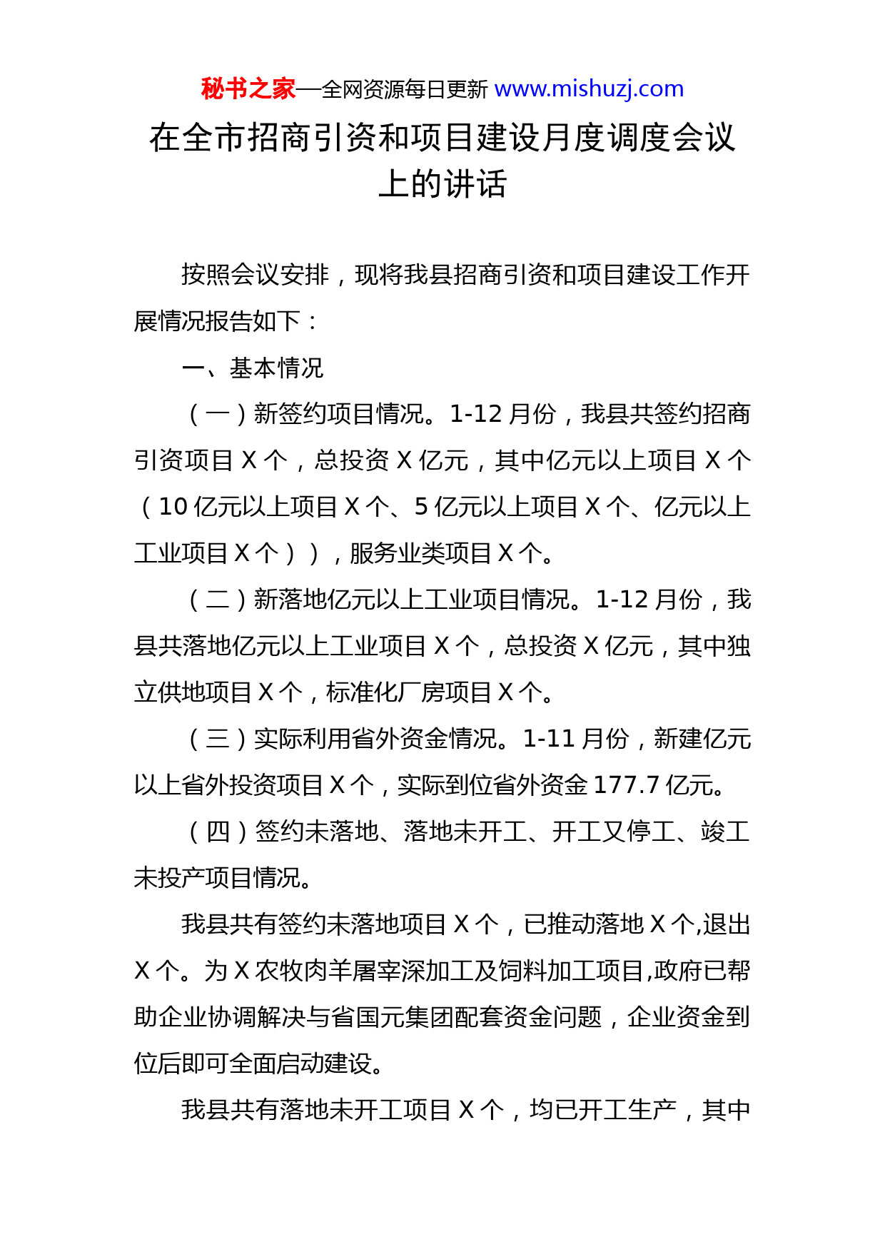 秘书之家—全网资源每日更新www.mishuzj.com在全市招商引资和项目建设月度调度会议上的讲话按照会议安排,现将我县招商引资和项目建设工作开展情况报告如下:一、基本情况(一)新签约项目情况。1-12月份,我县共签约招商引资项目X个,总投资X亿元,其中亿元以上项目X个(10亿元以上项目X个、5亿元以上项目X个、亿元以上工业项目X个)),服务业类项目X个。(二)新落地亿元以上工业项目情况。1-12月份,我县共落地亿元以上工业项目X个,总投资X亿元,其中独立供地项目X个,标准化厂房项目X个。(三)实际利用省外资金情况。1-11月份,新建亿元以上省外投资项目X个,实际到位省外资金177.7亿元。(四)签约未落地、落地未开工、开工又停工、竣工未投产项目情况。我县共有签约未落地项目X个,已推动落地X个,退出X个。为X农牧肉羊屠宰深加工及饲料加工项目,政府已帮助企业协调解决与省国元集团配套资金问题,企业资金到位后即可全面启动建设。我县共有落地未开工项目X个,均已开工生产,其中秘书之家—全网资源每日更新www.mishuzj.com启华制衣帐篷加工项目于7月中旬试生产,7月底正式投产;王员食品食品加工项目于8月底试生产,9月上旬正式投产;上海精奕电气管道生产项目设备于9月中旬正式投产。我县无开工又停工项目。我县无竣工未投产项目。二、存在问题一是为企服务不到位。帮助企业办理前期手续不够快速高效,特别是独立供地项目,用地手续办理周期长,影响新签约项目落地。二是基础设施不完善。工业园区供水、供暖、环保、通讯等生产要素保障、基础设施建设尚有一定程度的欠缺,导致企业缺乏必要的建设运营条件,最终影响项目建设进度及正常生产。西阳、高炉等工业园区原有标准化厂房满足不了部分新签约企业发展需求,新建标准化厂房周期长,影响玻璃制品及特色工艺品企业等项目不能及时落地建设。三、下步工作措施下一步,我县将根据本次会议安排,针对项目落地建设存在问题,拿出切实可行的措施,做好以下几个方面工作。一是提高服务效率。完善产业招商项目落地工作机秘书之家—全网资源每日更新www.mishuzj.com制,按照“一个项目、一名领导、一套班子”的要求,实施专人专班帮办代办服务,全面优化审批流程,提高行政服务效率,为项目落地提供全程化绿色通道,特别是企业用地突出问题,成立工作专班,排出行事历,安排专人盯办,确保所有签约项目投资到位、服务到位。二是完善基础设施建设。加快基础设施配套,全力保障园区建设发展中土地、资金、技术、人才、载体、服务等要素资源配置,特别是西阳、高炉标准化厂房建设,确保园区落户项目用地优先、使用资金优先、技术引进优先、人才保障优先、服务倾斜优先,全面保障签约项目落地需求。三是精准把握政策。进一步明确招商工作定位,把准脉搏,吃透政策,找准涡阳发展实际与国家产业政策、产业布局和资金投向的结合点,最大限度地用足、用活、用好政策,帮助企业解决发展难题。建立“六个一批”项目库,有力、有序推进项目投产建设,切实提高项目的履约率、资金到位率和落地率。