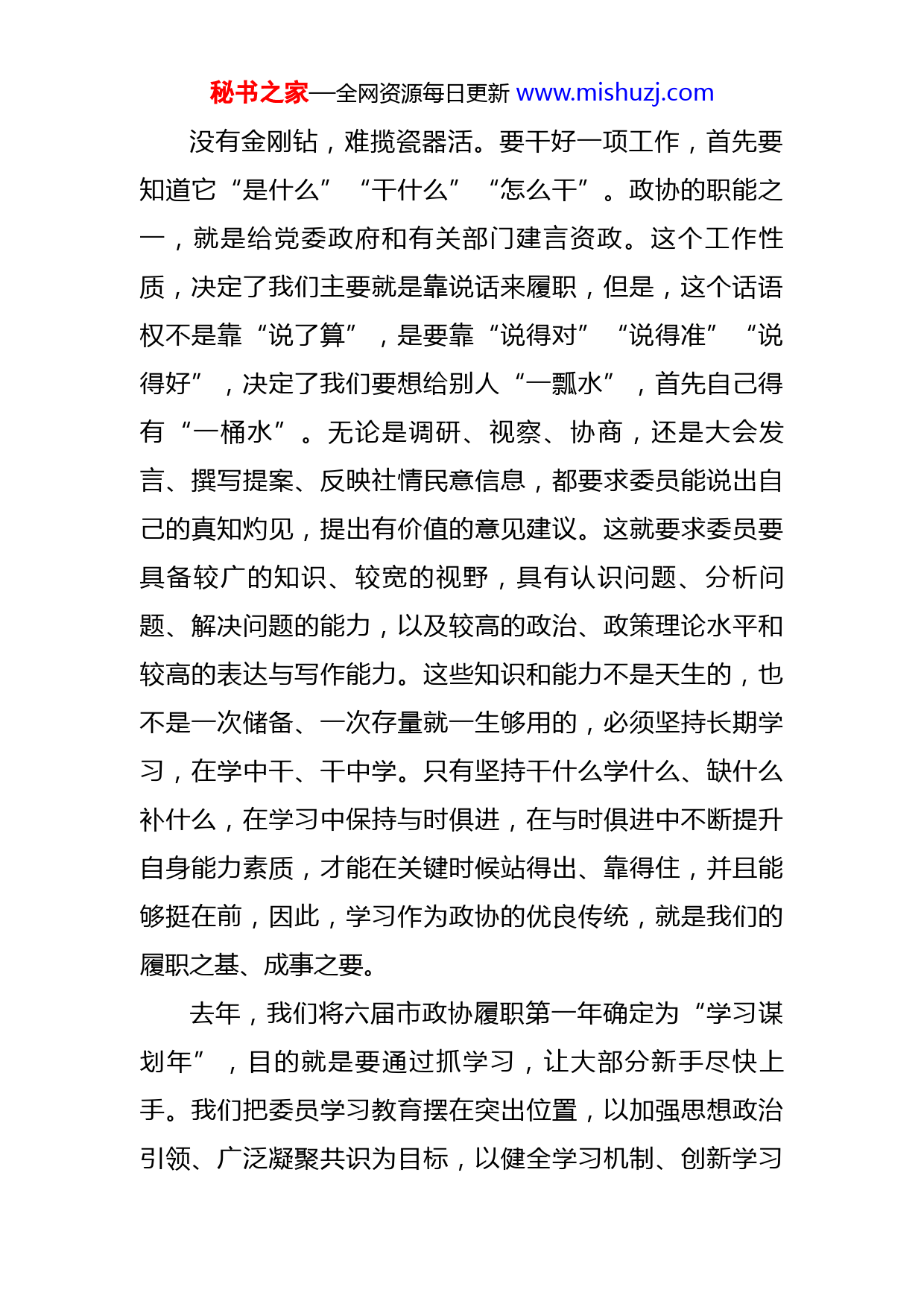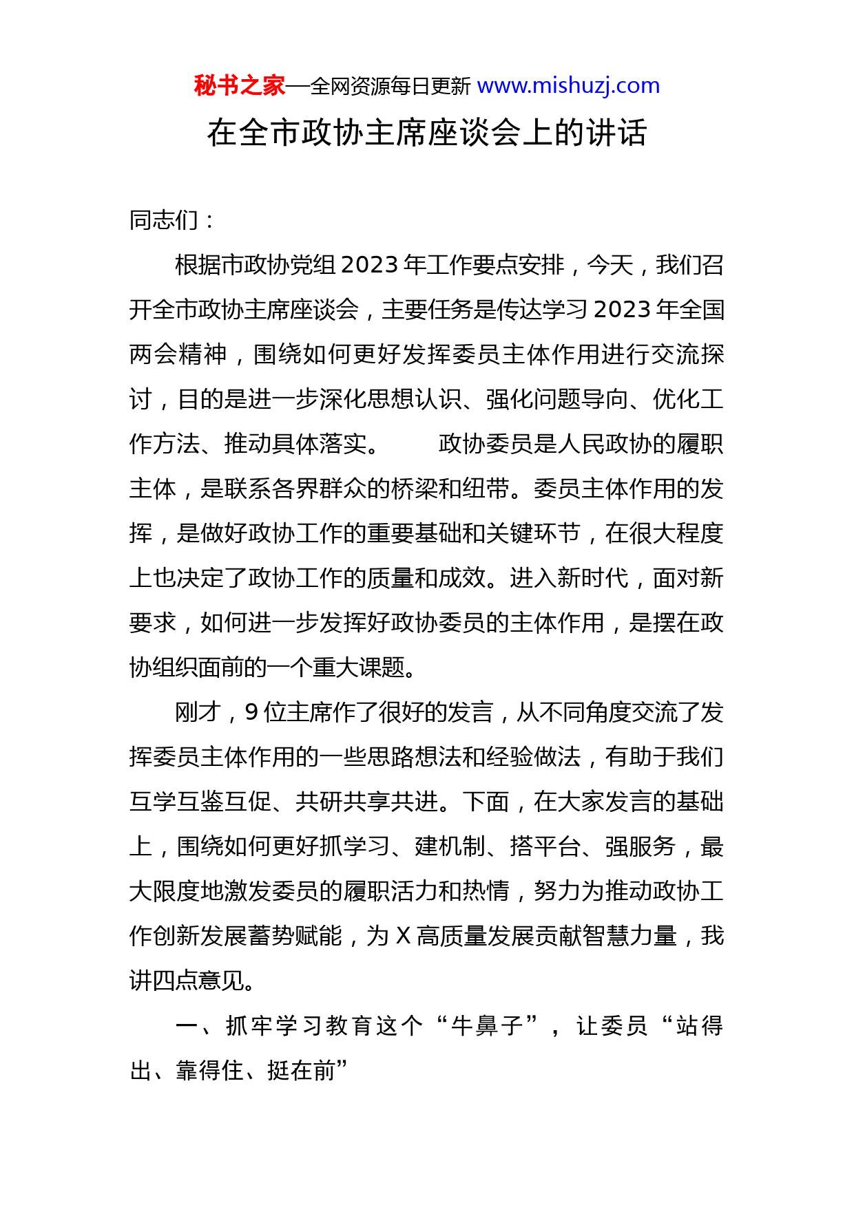 秘书之家—全网资源每日更新www.mishuzj.com在全市政协主席座谈会上的讲话同志们:根据市政协党组2023年工作要点安排,今天,我们召开全市政协主席座谈会,主要任务是传达学习2023年全国两会精神,围绕如何更好发挥委员主体作用进行交流探讨,目的是进一步深化思想认识、强化问题导向、优化工作方法、推动具体落实。政协委员是人民政协的履职主体,是联系各界群众的桥梁和纽带。委员主体作用的发挥,是做好政协工作的重要基础和关键环节,在很大程度上也决定了政协工作的质量和成效。进入新时代,面对新要求,如何进一步发挥好政协委员的主体作用,是摆在政协组织面前的一个重大课题。刚才,9位主席作了很好的发言,从不同角度交流了发挥委员主体作用的一些思路想法和经验做法,有助于我们互学互鉴互促、共研共享共进。下面,在大家发言的基础上,围绕如何更好抓学习、建机制、搭平台、强服务,最大限度地激发委员的履职活力和热情,努力为推动政协工作创新发展蓄势赋能,为X高质量发展贡献智慧力量,我讲四点意见。一、抓牢学习教育这个“牛鼻子”,让委员“站得出、靠得住、挺在前”秘书之家—全网资源每日更新www.mishuzj.com没有金刚钻,难揽瓷器活。要干好一项工作,首先要知道它“是什么”“干什么”“怎么干”。政协的职能之一,就是给党委政府和有关部门建言资政。这个工作性质,决定了我们主要就是靠说话来履职,但是,这个话语权不是靠“说了算”,是要靠“说得对”“说得准”“说得好”,决定了我们要想给别人“一瓢水”,首先自己得有“一桶水”。无论是调研、视察、协商,还是大会发言、撰写提案、反映社情民意信息,都要求委员能说出自己的真知灼见,提出有价值的意见建议。这就要求委员要具备较广的知识、较宽的视野,具有认识问题、分析问题、解决问题的能力,以及较高的政治、政策理论水平和较高的表达与写作能力。这些知识和能力不是天生的,也不是一次储备、一次存量就一生够用的,必须坚持长期学习,在学中干、干中学。只有坚持干什么学什么、缺什么补什么,在学习中保持与时俱进,在与时俱进中不断提升自身能力素质,才能在关键时候站得出、靠得住,并且能够挺在前,因此,学习作为政协的优良传统,就是我们的履职之基、成事之要。去年,我们将六届市政协履职第一年确定为“学习谋划年”,目的就是要通过抓学习,让大部分新手尽快上手。我们把委员学习教育摆在突出位置,以加强思想政治引领、广泛凝聚共识为目标,以健全学习机制、创新学习秘书之家—全网资源每日更新www.mishuzj.com形式为抓手,坚持专题学习和日常学习相结合,采取“走出去+请进来”的方式,抓好党组理论学习中心组专题学期学习、周一主席碰头会学习、主席会议集中学习、常委会专题培训、全市政协主席座谈交流和现场观摩学习、委员和常委培训全覆盖、“书香政协”委员读书活动、给委员发放学习资料等工作,实现了委员学习教育常态化、制度化、全员化,同时也推动了“学习+履职”深度融合、相互赋能。今年是六届市政协的“创新发展年”,但学习依然是我们的永恒主题,必须作为一项长期任务抓紧抓好。我们要继续把学习摆在首位,始终保持“本领恐慌”,避免“本领麻木”,不断完善学习制度、丰富学习形式、打造学习品牌、增强学习实效,切实把委员学习的“软任务”变成“硬约束”。要创新诸如读书会、政情通报会等学习载体,及时向委员通报信息,帮助委员了解政情、熟悉政策、把握大局,不断提升政治素养、强化政治能力、增进政治认同。要引导委员深入学习和思考,深刻领会全过程人民民主和政协协商民主的内涵要义,了解人民政协的性质、地位、作用以及新时代人民政协的新方位、新使命,通过学新理论、新政策,紧跟新方向,确保路子不走偏、步子不踩空;要学习新型政党制度、统一战线和人民政协理论,学习省内外先进政协工作经验,学习现代经济、法秘书之家—全网资源每日更新www.mishuzj.com律、社会管理等知识,通过学专业知识,懂机制运行,不断提高协商议政本领和工作专业能力;要多向专家学、多去一线学、多到基层和群众中学,立足所在界别,发挥优势专长,不断增强建言献策的针对性、科学性、可行性。二、激活制度机制这个“总引擎”,让委员“敢担当、善作为、勤履职”完善的工作制度机制是促进委员高质量履职的重要保障要素。六届市政协坚持把健全制度机制作为发挥委员主体作用、激发委员履职活力的重要举措和开展工作的首要环节,制定修订委员履职工作规则、委员活动服务管理办法、界别活动组活动实施办法、建设管理市政协委员工作室的意见等一系列规章制度,做到常委、委员和专委会、界别活动组、委员工作室不同层次、不同方位的履职要求全覆盖;建立市政协党组成员联系界别和界别党员委员、党员委员联系党外委员、重大会议或履职活动成立临时党组织等常态化制度机制,推进党组织对党员委员全覆盖、党的工作对政协委员全覆盖;建立联系走访委员机制,市政协主席会议成员走访联系界别委员,到委员工作室开展宣讲活动,听取委员思想、回应委员关切、了解工作动态;建立委员履职登记和常委述职机制,建立委员履职档案。各县市区政协在制度机制建设上也作了很多