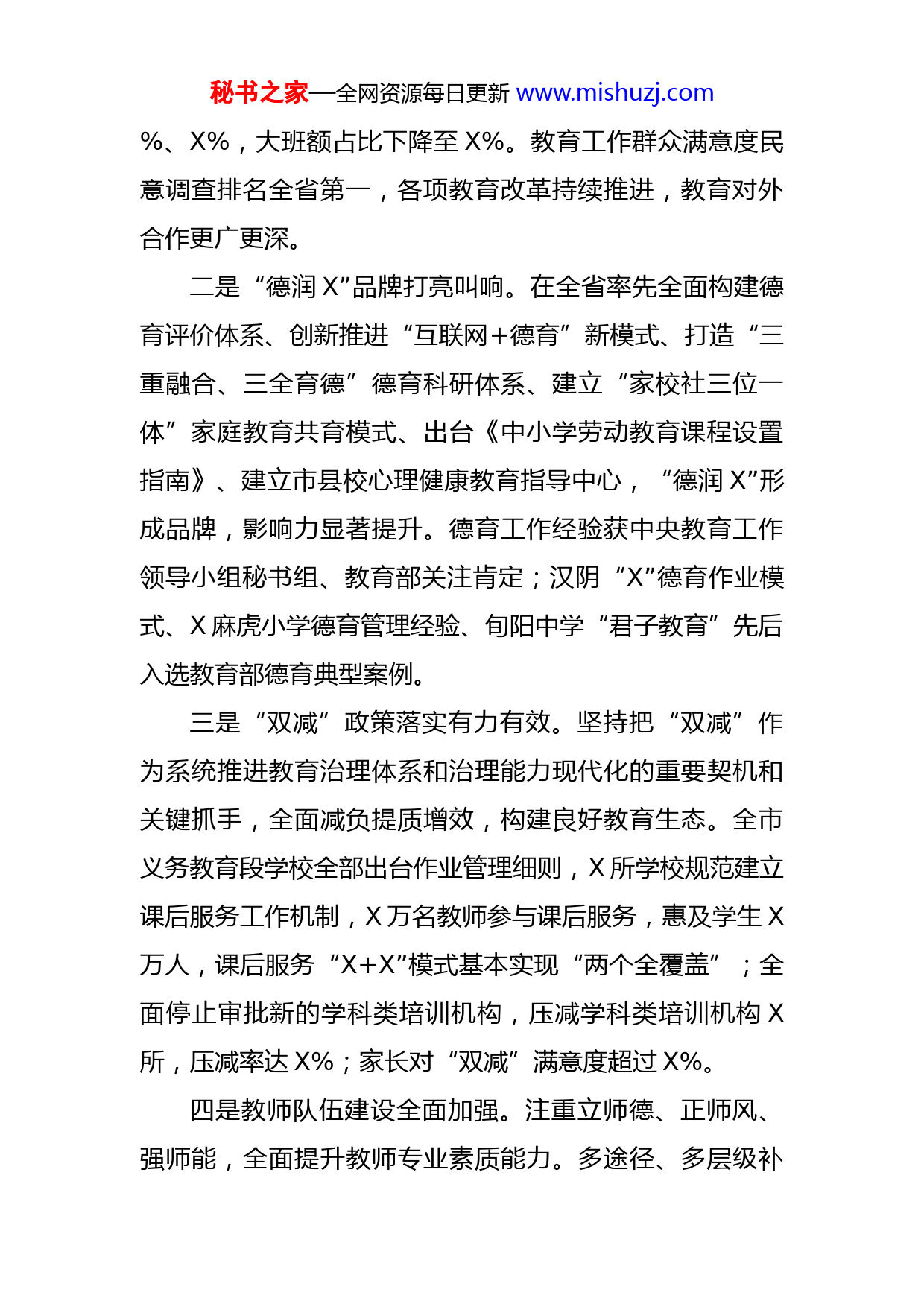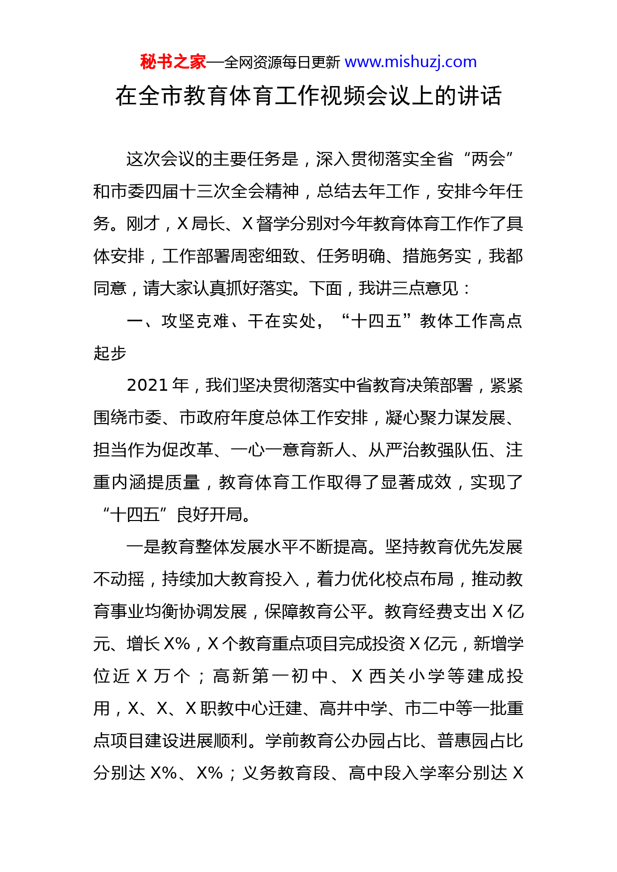 秘书之家—全网资源每日更新www.mishuzj.com在全市教育体育工作视频会议上的讲话这次会议的主要任务是,深入贯彻落实全省“两会”和市委四届十三次全会精神,总结去年工作,安排今年任务。刚才,X局长、X督学分别对今年教育体育工作作了具体安排,工作部署周密细致、任务明确、措施务实,我都同意,请大家认真抓好落实。下面,我讲三点意见:一、攻坚克难、干在实处,“十四五”教体工作高点起步2021年,我们坚决贯彻落实中省教育决策部署,紧紧围绕市委、市政府年度总体工作安排,凝心聚力谋发展、担当作为促改革、一心一意育新人、从严治教强队伍、注重内涵提质量,教育体育工作取得了显著成效,实现了“十四五”良好开局。一是教育整体发展水平不断提高。坚持教育优先发展不动摇,持续加大教育投入,着力优化校点布局,推动教育事业均衡协调发展,保障教育公平。教育经费支出X亿元、增长X%,X个教育重点项目完成投资X亿元,新增学位近X万个;高新第一初中、X西关小学等建成投用,X、X、X职教中心迁建、高井中学、市二中等一批重点项目建设进展顺利。学前教育公办园占比、普惠园占比分别达X%、X%;义务教育段、高中段入学率分别达X秘书之家—全网资源每日更新www.mishuzj.com%、X%,大班额占比下降至X%。教育工作群众满意度民意调查排名全省第一,各项教育改革持续推进,教育对外合作更广更深。二是“德润X”品牌打亮叫响。在全省率先全面构建德育评价体系、创新推进“互联网+德育”新模式、打造“三重融合、三全育德”德育科研体系、建立“家校社三位一体”家庭教育共育模式、出台《中小学劳动教育课程设置指南》、建立市县校心理健康教育指导中心,“德润X”形成品牌,影响力显著提升。德育工作经验获中央教育工作领导小组秘书组、教育部关注肯定;汉阴“X”德育作业模式、X麻虎小学德育管理经验、旬阳中学“君子教育”先后入选教育部德育典型案例。三是“双减”政策落实有力有效。坚持把“双减”作为系统推进教育治理体系和治理能力现代化的重要契机和关键抓手,全面减负提质增效,构建良好教育生态。全市义务教育段学校全部出台作业管理细则,X所学校规范建立课后服务工作机制,X万名教师参与课后服务,惠及学生X万人,课后服务“X+X”模式基本实现“两个全覆盖”;全面停止审批新的学科类培训机构,压减学科类培训机构X所,压减率达X%;家长对“双减”满意度超过X%。四是教师队伍建设全面加强。注重立师德、正师风、强师能,全面提升教师专业素质能力。多途径、多层级补秘书之家—全网资源每日更新www.mishuzj.com充教师X人,交流轮岗教师校长X人。全市统筹资金X亿元,确保了义务教育教师平均工资收入水平不低于当地公务员平均工资收入水平;协调拨付乡村教师生活补助资金X万元,惠及教师X人。深入实施“国培”“省培”“十百千万”教师校长培训工程,培训教师X万人次;培养省市级名师、学科带头人、教学能手X人;X中学教师张莎莎获得“全国最美教师”称号。五是承办十四运会精彩圆满。坚决贯彻习近平总书记关于“办一届精彩圆满的体育盛会”的重要指示精神,把筹办工作作为全市重中之重,高站位谋划工作,高标准建设场馆,高质量抓问题整改,高水平保障赛事活动。圆满完成X赛区火炬传递和马拉松游泳、武术散打项目承办任务,实现了“零问题、零失误、零疫情、零投诉、零舆情”目标,获得各级各界一致好评,被评为最佳赛区;X籍运动员在十四运会上斩获X金X银X铜。成功举办市十七届运动会,汉江龙舟节龙舟竞赛入选X中华体育文化优秀项目。事非经过不知难。这些成绩的取得,离不开市委、市政府的坚强领导,得益于部门和县区的担当实干,凝结着广大一线干部舍身奋斗、攻坚克难的智慧和汗水。在此,我代表市政府向大家表示衷心感谢!同时,我们也要看到工作中还存在着短板弱项。一是秘书之家—全网资源每日更新www.mishuzj.com教育发展不均衡,跟不上群众需求。优质教育资源、普惠性学前教育资源供给不足,“择校热”“大校额”尚未根本解决,“上公办园难”“入民办园贵”依旧存在;二是教育投入仍有不足,教学设施配套水平和现代教育信息化应用水平还比较低;三是教育改革任务繁重,一些体制机制障碍亟待破解;四是师资队伍面临总量有余、结构性不足矛盾,音体美、心理健康教师短缺,职业教育“双师型”教师匮乏;五是学生、校园安全管理还有薄弱环节,还需抓之以恒、不断提升。这些问题,要勇于面对,开拓创新,采取有效措施,努力予以解决。二、扭住关键、真抓实干,推动重点工作实现新突破2022年是党的二十大召开之年,也是X奋力谱写高质量发展新篇章的关键之年。我们要围绕市委、市政府确定的工作目标,紧扣教育均衡优质、立德树人、改革创新、提质增效等重点工作,聚焦聚力,苦干实干,推动各项工作求突破创一流。(一)坚持项目带动,优化资源配置。以项目为载体,通过实施一批项目,努力扩充教育体育资源,着力优化城镇学校、体育设施布局。一是高质量策划项目。市教体局、各县市区要深入研究国家政策导向和投资动向,认真策划包装一批教育体育重点项目,加强项目储备,做好前期工作;市发改、财政等部门要加强指导,会同教体部秘书之家—全网资源每日更新www.mishuzj.com门,加