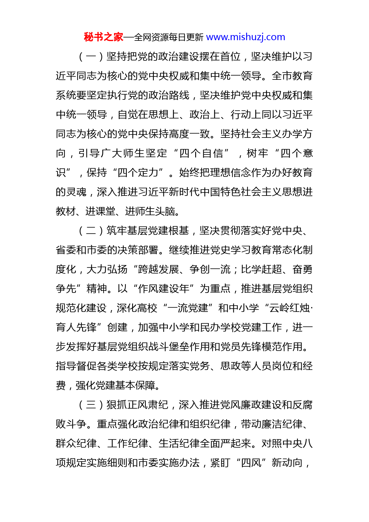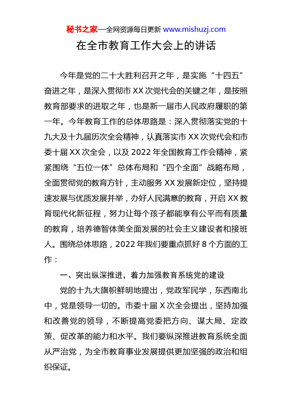 秘书之家—全网资源每日更新www.mishuzj.com在全市教育工作大会上的讲话今年是党的二十大胜利召开之年,是实施“十四五”奋进之年,是深入贯彻市XX次党代会的关键之年,是按照教育部要求的进取之年,也是新一届市人民政府履职的第一年。今年教育工作的总体思路是:深入贯彻落实党的十九大及十九届历次全会精神,认真落实市XX次党代会和市委十届XX次全会,以及2022年全国教育工作会精神,紧紧围绕“五位一体”总体布局和“四个全面”战略布局,全面贯彻党的教育方针,主动服务XX发展新定位,坚持提速发展与优质发展并举,办好人民满意的教育,开启XX教育现代化新征程,努力让每个孩子都能享有公平而有质量的教育,培养德智体美全面发展的社会主义建设者和接班人。围绕总体思路,2022年我们要重点抓好8个方面的工作:一、突出纵深推进,着力加强教育系统党的建设党的十九大旗帜鲜明地提出,党政军民学,东西南北中,党是领导一切的。市委十届X次全会提出,坚持加强和改善党的领导,不断提高党委把方向、谋大局、定政策、促改革的能力和水平。我们要纵深推进教育系统全面从严治党,为全市教育事业发展提供更加坚强的政治和组织保证。秘书之家—全网资源每日更新www.mishuzj.com(一)坚持把党的政治建设摆在首位,坚决维护以习近平同志为核心的党中央权威和集中统一领导。全市教育系统要坚定执行党的政治路线,坚决维护党中央权威和集中统一领导,自觉在思想上、政治上、行动上同以习近平同志为核心的党中央保持高度一致。坚持社会主义办学方向,引导广大师生坚定“四个自信”,树牢“四个意识”,保持“四个定力”。始终把理想信念作为办好教育的灵魂,深入推进习近平新时代中国特色社会主义思想进教材、进课堂、进师生头脑。(二)筑牢基层党建根基,坚决贯彻落实好党中央、省委和市委的决策部署。继续推进党史学习教育常态化制度化,大力弘扬“跨越发展、争创一流;比学赶超、奋勇争先”精神。以“作风建设年”为重点,推进基层党组织规范化建设,深化高校“一流党建”和中小学“云岭红烛·育人先锋”创建,加强中小学和民办学校党建工作,进一步发挥好基层党组织战斗堡垒作用和党员先锋模范作用。指导督促各类学校按规定落实党务、思政等人员岗位和经费,强化党建基本保障。(三)狠抓正风肃纪,深入推进党风廉政建设和反腐败斗争。重点强化政治纪律和组织纪律,带动廉洁纪律、群众纪律、工作纪律、生活纪律全面严起来。对照中央八项规定实施细则和市委实施办法,紧盯“四风”新动向,秘书之家—全网资源每日更新www.mishuzj.com重点整治教育领域形式主义、官僚主义。深入落实主体责任、监督责任和“一岗双责”,持续加强巡视整改落实,全力配合市委巡视高校工作。坚持挺纪在前、抓早抓小,用好“四种形态”,加大反腐败力度,严查顶风违纪和侵害群众利益行为,加强通报曝光和警示教育,构建教育系统不敢腐、不能腐、不想腐的有效机制。扎实推进校园廉政文化建设,营造学生崇尚廉洁、教师廉洁从教、干部廉洁从政的教育生态。(四)牢牢把握意识形态工作领导权,坚决巩固广大干部师生团结奋斗的共同思想基础。严格落实意识形态工作责任,加强意识形态阵地管理,正确区分政治原则问题、思想认识问题和学术观点问题。提升统战工作水平,落实高校统战工作实施意见,抓好统战对象作用发挥,促进各民族师生交往交流交融,坚决抵御利用宗教对学校进行渗透和防范校园传教工作。在这里,我特别强调一下,在今年的全国教育工作会议上,陈宝生部长专门要求,要更加注重做好教育舆论引导的工作。近年来,我市教育系统不同程度出现了负面舆情,有的因为回应不及时、不到位,造成工作被动。各地各校在下一步工作中,要更加重视舆论宣传引导工作。要做大做强自己的宣传媒介,并充分依靠主阵地传播正能量。加强教育宣传队伍建设,建立与各类媒体的沟通互动机制,不断增强教育宣传的传播秘书之家—全网资源每日更新www.mishuzj.com力、吸引力和感染力,牢牢掌握主动权,营造教育发展的良好舆论氛围。要抓住舆论主动权,完善舆情应对机制,主动及时回应社会关切,正确引导社会舆论,把负面舆情对教育工作的影响降到最低。二、突出全面发展,着力落实立德树人根本任务立德树人是教育的根本任务,是学校办学的立身之本,也是人才培养的根本要求。培养德智体美全面发展的社会主义接班人和建设者,就是要发展好素质教育,植好立德树人这个根、壮大立德树人这个本。(一)强化中小学德育工作。落实《中小学德育工作指南》,把培育和践行社会主义核心价值观融入教育教学全过程,健全全员育人、全过程育人、全方位育人的体制机制。有序推进义务教育和普通高中“三科”教材统一培训和使用。坚持把思想引导和价值观塑造融入每一门课程教学之中,充分发掘各门课程中的德育内涵,加强德育课程建设。统筹好中小学劳动教育、心理健康教育、家庭教育、影视教育和校外教育。(二)加强和改进高校思想政治工作。召开全市高校党建暨思想政治工作推进会,制定高校思想政治工作质量提升工程实施意见。加强市级重点马克思主义学院建设,创建“三全育人”示范区、示范校和示范院系,进一步发挥“三中心”(即辅导员