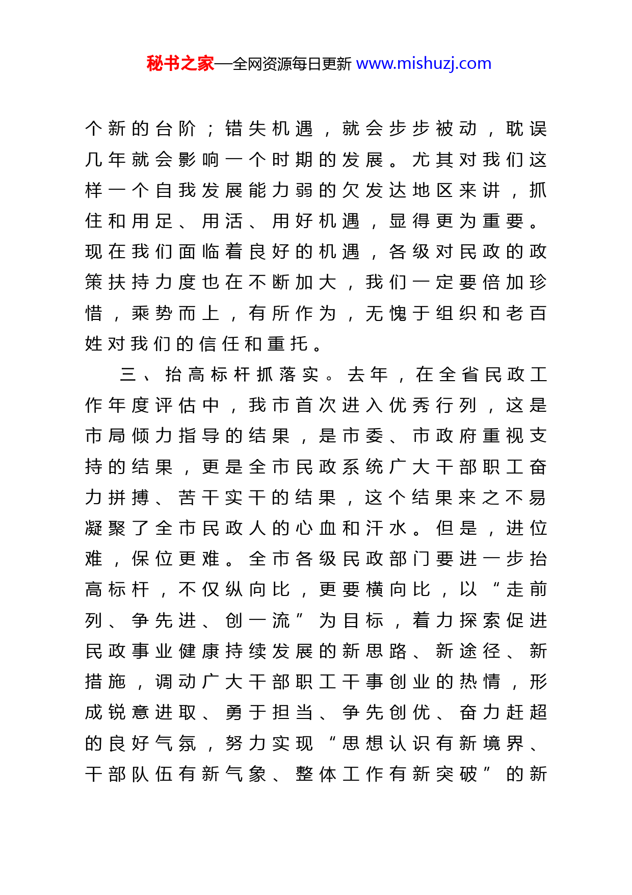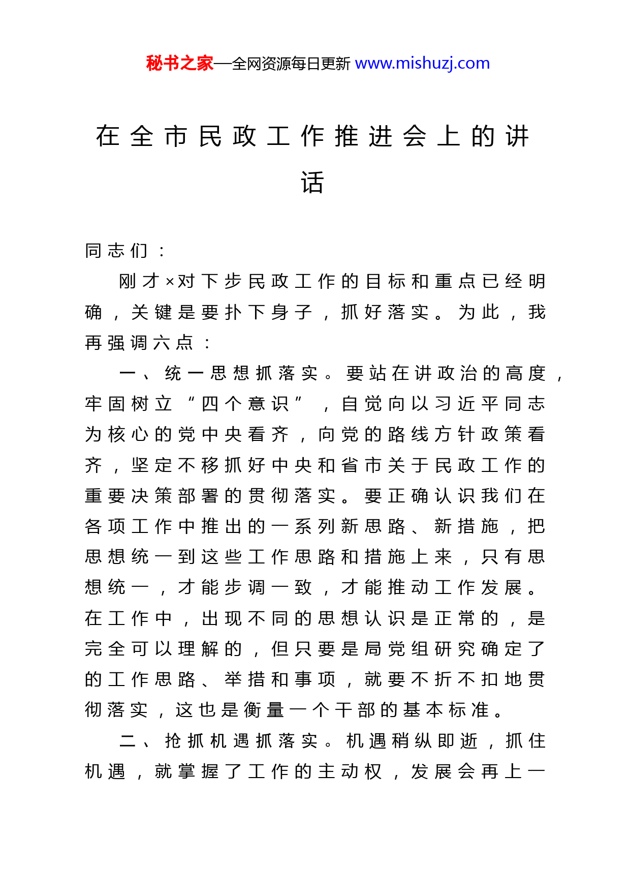 秘书之家—全网资源每日更新www.mishuzj.com在全市民政工作推进会上的讲话同志们:刚才×对下步民政工作的目标和重点已经明确,关键是要扑下身子,抓好落实。为此,我再强调六点:一、统一思想抓落实。要站在讲政治的高度,牢固树立“四个意识”,自觉向以习近平同志为核心的党中央看齐,向党的路线方针政策看齐,坚定不移抓好中央和省市关于民政工作的重要决策部署的贯彻落实。要正确认识我们在各项工作中推出的一系列新思路、新措施,把思想统一到这些工作思路和措施上来,只有思想统一,才能步调一致,才能推动工作发展。在工作中,出现不同的思想认识是正常的,是完全可以理解的,但只要是局党组研究确定了的工作思路、举措和事项,就要不折不扣地贯彻落实,这也是衡量一个干部的基本标准。二、抢抓机遇抓落实。机遇稍纵即逝,抓住机遇,就掌握了工作的主动权,发展会再上一秘书之家—全网资源每日更新www.mishuzj.com个新的台阶;错失机遇,就会步步被动,耽误几年就会影响一个时期的发展。尤其对我们这样一个自我发展能力弱的欠发达地区来讲,抓住和用足、用活、用好机遇,显得更为重要。现在我们面临着良好的机遇,各级对民政的政策扶持力度也在不断加大,我们一定要倍加珍惜,乘势而上,有所作为,无愧于组织和老百姓对我们的信任和重托。三、抬高标杆抓落实。去年,在全省民政工作年度评估中,我市首次进入优秀行列,这是市局倾力指导的结果,是市委、市政府重视支持的结果,更是全市民政系统广大干部职工奋力拼搏、苦干实干的结果,这个结果来之不易凝聚了全市民政人的心血和汗水。但是,进位难,保位更难。全市各级民政部门要进一步抬高标杆,不仅纵向比,更要横向比,以“走前列、争先进、创一流”为目标,着力探索促进民政事业健康持续发展的新思路、新途径、新措施,调动广大干部职工干事创业的热情,形成锐意进取、勇于担当、争先创优、奋力赶超的良好气氛,努力实现“思想认识有新境界、干部队伍有新气象、整体工作有新突破”的新秘书之家—全网资源每日更新www.mishuzj.com目标。四、开拓创新抓落实。民政工作面临的新情况、新问题层出不穷,只有坚持与时俱进,开拓创新,才能推动民政工作取得新的进展。要不断地解放思想、转变观念,坚持以创新的思维解决民政工作的深层次矛盾,寻求民政事业发展的新思路、新举措。要注重学习借鉴发达地区的先进理念和先进经验,积极应对现实工作中的实际问题,敢于探索,大胆试验,多做对民政制度创新具有重要启迪作用同时又符合民政事业发展规律的尝试。要敢于承担新任务迎接新挑战,敢于做开拓创新的工作,敢于做困难大、矛盾多的工作,在不断实践、创新中增强会干事、干成事的能力。五、形成合力抓落实。民政工作涉及面广,只有加强协作配合,形成合力,才能保证各项工作的圆满完成。各级民政干部要切实强化大局意识和全局观念,自觉服从服务于全市民政中心工作,切实树立协作配合的意识,既要加强横向协作配合,紧紧依靠各级党委、政府和有关部门、社会各界的支持,又要加强纵向协作配合。市局各科室、各单位要为各县区搞好秘书之家—全网资源每日更新www.mishuzj.com服务,主动协调解决困难和问题,主动加强沟通和联系,遇事主动协商研究。各县区也要进一步增强主动配合意识,凡是市局安排部署的工作或临时交办的工作,都要积极认真的去做按时完成任务,决不能出现推诿、甚至不办的现象发生。六、转变作风抓落实。要进一步增强责任感、危机感,对重点工作、难点工作,紧盯不放,一抓到底。要雷厉风行,高标准、快节奏,说干就干,干就干出个样子,坚决反对拖拖拉拉甚至推诿扯皮。要勇于担当、真抓实干,尽职尽责、主动作为,大事面前不畏难、难事面前不退缩。要创新督查工作方式,加强对市委市政府重大决策部署、民生工程、民生实事以及年度目标任务贯彻落实情况的督促检查,强化督查结果运用,切实推动难点问题得到解决。今年,市局加大了督查检查力度,专门抽调骨干力量成立了督查室,实行“五单”提示单、交办单、催办单、办结单、落实单、制度,对工作及时做好催办落实,我们也要进一步完善相关制度,进一步加大督促检查,完善工作目标责任制和考核办法,确保任务目标落到实处。秘书之家—全网资源每日更新www.mishuzj.com同志们,做好今年民政工作责任重大、任务艰巨、使命光荣。让我们在市委、市政府的坚强领导下,团结一心、振奋精神、开拓创新、锐意进取,以更加饱满的工作热情、更加务实的工作作风、更加有力的工作举措,不断开创全市民政事业的新局面,以优异成绩收官“十三五”,开启“十四五”!