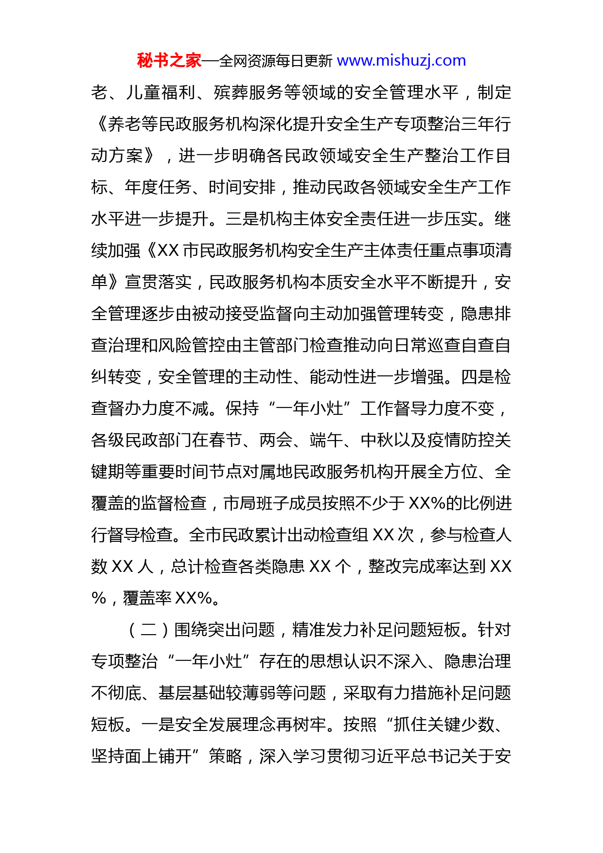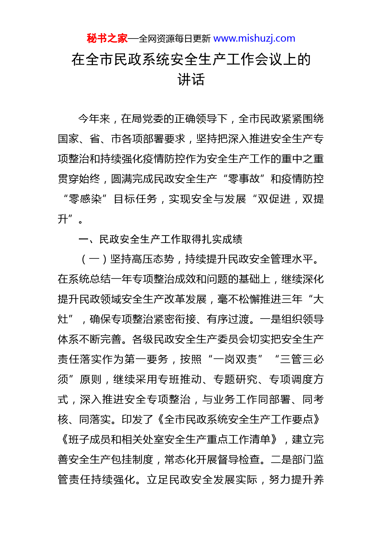 秘书之家—全网资源每日更新www.mishuzj.com在全市民政系统安全生产工作会议上的讲话今年来,在局党委的正确领导下,全市民政紧紧围绕国家、省、市各项部署要求,坚持把深入推进安全生产专项整治和持续强化疫情防控作为安全生产工作的重中之重贯穿始终,圆满完成民政安全生产“零事故”和疫情防控“零感染”目标任务,实现安全与发展“双促进,双提升”。一、民政安全生产工作取得扎实成绩(一)坚持高压态势,持续提升民政安全管理水平。在系统总结一年专项整治成效和问题的基础上,继续深化提升民政领域安全生产改革发展,毫不松懈推进三年“大灶”,确保专项整治紧密衔接、有序过渡。一是组织领导体系不断完善。各级民政安全生产委员会切实把安全生产责任落实作为第一要务,按照“一岗双责”“三管三必须”原则,继续采用专班推动、专题研究、专项调度方式,深入推进安全专项整治,与业务工作同部署、同考核、同落实。印发了《全市民政系统安全生产工作要点》《班子成员和相关处室安全生产重点工作清单》,建立完善安全生产包挂制度,常态化开展督导检查。二是部门监管责任持续强化。立足民政安全发展实际,努力提升养秘书之家—全网资源每日更新www.mishuzj.com老、儿童福利、殡葬服务等领域的安全管理水平,制定《养老等民政服务机构深化提升安全生产专项整治三年行动方案》,进一步明确各民政领域安全生产整治工作目标、年度任务、时间安排,推动民政各领域安全生产工作水平进一步提升。三是机构主体安全责任进一步压实。继续加强《XX市民政服务机构安全生产主体责任重点事项清单》宣贯落实,民政服务机构本质安全水平不断提升,安全管理逐步由被动接受监督向主动加强管理转变,隐患排查治理和风险管控由主管部门检查推动向日常巡查自查自纠转变,安全管理的主动性、能动性进一步增强。四是检查督办力度不减。保持“一年小灶”工作督导力度不变,各级民政部门在春节、两会、端午、中秋以及疫情防控关键期等重要时间节点对属地民政服务机构开展全方位、全覆盖的监督检查,市局班子成员按照不少于XX%的比例进行督导检查。全市民政累计出动检查组XX次,参与检查人数XX人,总计检查各类隐患XX个,整改完成率达到XX%,覆盖率XX%。(二)围绕突出问题,精准发力补足问题短板。针对专项整治“一年小灶”存在的思想认识不深入、隐患治理不彻底、基层基础较薄弱等问题,采取有力措施补足问题短板。一是安全发展理念再树牢。按照“抓住关键少数、坚持面上铺开”策略,深入学习贯彻习近平总书记关于安秘书之家—全网资源每日更新www.mishuzj.com全生产重要论述和对民政工作、XX工作的重要指示批示精神,纳入各种党组织会议、办公会议和全局会议内容,促进系统学习、内化于心。坚持领导干部和党员带头学、带头讲,坚持向面向基层铺开学、全员学。全市民政系统干部职进一步强化红线意识和底线思维,以如履薄冰、如临深渊的政治自觉狠抓安全生产工作。二是隐患排查治理再深入。持续在隐患排查治理上出重拳、下实招,为解决隐患整改责任落实问题,建立贯穿市、县两级的《全市民政服务机构安全生产责任制分解表》,确保每级部门、每家机构“点对点”责任人落实到位。紧盯消防、食品卫生、特种设备、建筑安全等民政安全重点领域,深入开展隐患排查治理行动,上半年累计排查整改各项问题隐患XX条,安全隐患存量大幅下降,增量显著降低。三是基层安全基础再夯实。坚持安全执法检查关口前移、机构整治重心下移,重点关注基层民政服务机构安全管理工作,尤其是安全生产不托底的民办服务机构,加大农村区域性养老服务中心建设力度,借助养老机构安全标准贯标行动、既有建筑和燃气安全专项整治等行动,进一步增强基层安全人员培训,完善安全设施设备,健全安全管理机制,提高基层民政服务机构安全管理和本质安全水平。(三)聚焦重点任务,深入推进专项治理行动。严格按照年度安全生产专项整治工作清单要求,进一步细化工秘书之家—全网资源每日更新www.mishuzj.com作方案和工作举措,扎实推进民政领域实质安全建设。一是有序推进养老机构贯标工作。根据国家《养老机构服务安全基本规范》强制性达标任务,分三阶段开展贯标工作,到今年12月底达标率要达到XX%,目前,全市共有XX家养老服务机构通过规范达标验收,达标率为XX%,剩余机构正在积极申请验收。二是加强民政安全管理系统使用。着力提升民政干部职工全员参与安全生产、全员落实安全生产责任的积极性、主动性,确保全市民政服务机构、民政部门安全监管人员全部注册上线,努力推动所有管理人员运用系统开展监督检查工作、所有机构运用系统开展机构自查、所有问题隐患上传系统并限期整改到位,明确各级民政安全管理系统联络员为本部门落实责任人。全市民政累计在XX社会服务机构安全管理系统注册上线机构XX家(养老机构XX家、婚姻登记机构XX家、救助管理机构XX家、精神卫生机构XX家、殡仪馆XX家、儿童福利机构XX家),注册民政部门安全监管人员XX人(市级XX人、县级XX人)。三是推动风险辨识上报和标准化建设工作。按照《XX市非工业企业安全生产风险报告暂行办法》相关规定,编制了《民政非工业企业(机构)行业目录》