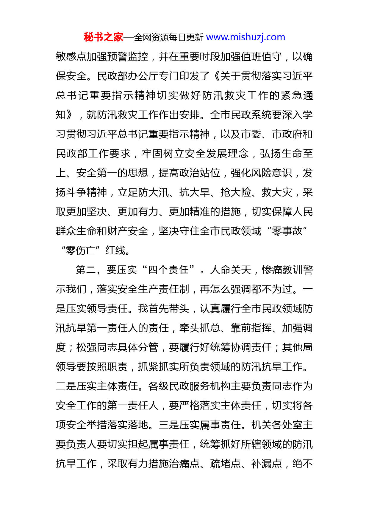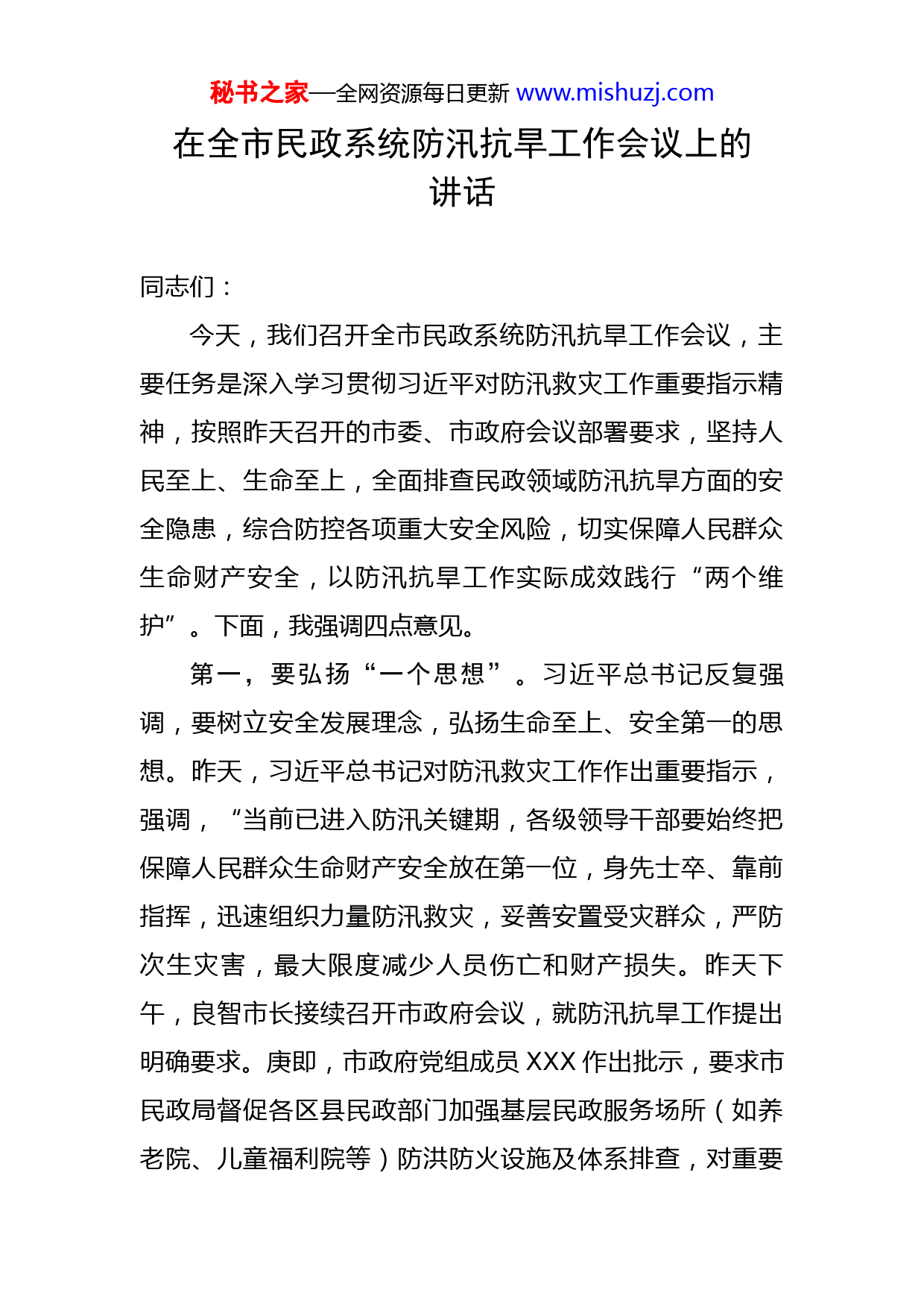 秘书之家—全网资源每日更新www.mishuzj.com在全市民政系统防汛抗旱工作会议上的讲话同志们:今天,我们召开全市民政系统防汛抗旱工作会议,主要任务是深入学习贯彻习近平对防汛救灾工作重要指示精神,按照昨天召开的市委、市政府会议部署要求,坚持人民至上、生命至上,全面排查民政领域防汛抗旱方面的安全隐患,综合防控各项重大安全风险,切实保障人民群众生命财产安全,以防汛抗旱工作实际成效践行“两个维护”。下面,我强调四点意见。第一,要弘扬“一个思想”。习近平总书记反复强调,要树立安全发展理念,弘扬生命至上、安全第一的思想。昨天,习近平总书记对防汛救灾工作作出重要指示,强调,“当前已进入防汛关键期,各级领导干部要始终把保障人民群众生命财产安全放在第一位,身先士卒、靠前指挥,迅速组织力量防汛救灾,妥善安置受灾群众,严防次生灾害,最大限度减少人员伤亡和财产损失。昨天下午,良智市长接续召开市政府会议,就防汛抗旱工作提出明确要求。庚即,市政府党组成员XXX作出批示,要求市民政局督促各区县民政部门加强基层民政服务场所(如养老院、儿童福利院等)防洪防火设施及体系排查,对重要秘书之家—全网资源每日更新www.mishuzj.com敏感点加强预警监控,并在重要时段加强值班值守,以确保安全。民政部办公厅专门印发了《关于贯彻落实习近平总书记重要指示精神切实做好防汛救灾工作的紧急通知》,就防汛救灾工作作出安排。全市民政系统要深入学习贯彻习近平总书记重要指示精神,以及市委、市政府和民政部工作要求,牢固树立安全发展理念,弘扬生命至上、安全第一的思想,提高政治站位,强化风险意识,发扬斗争精神,立足防大汛、抗大旱、抢大险、救大灾,采取更加坚决、更加有力、更加精准的措施,切实保障人民群众生命和财产安全,坚决守住全市民政领域“零事故”“零伤亡”红线。第二,要压实“四个责任”。人命关天,惨痛教训警示我们,落实安全生产责任制,再怎么强调都不为过。一是压实领导责任。我首先带头,认真履行全市民政领域防汛抗旱第一责任人的责任,牵头抓总、靠前指挥、加强调度;松强同志具体分管,要履行好统筹协调责任;其他局领导要按照职责,抓紧抓实所负责领域的防汛抗旱工作。二是压实主体责任。各级民政服务机构主要负责同志作为安全工作的第一责任人,要严格落实主体责任,切实将各项安全举措落实落地。三是压实属事责任。机关各处室主要负责人要切实担起属事责任,统筹抓好所辖领域的防汛抗旱工作,采取有力措施治痛点、疏堵点、补漏点,绝不秘书之家—全网资源每日更新www.mishuzj.com能片面强调业务工作而忽视安全稳定这个基础。四是压实属地责任。各区县民政部门要严格落实属地责任,坚决克服麻痹思想和侥幸心理,始终绷紧防汛抗旱这根弦,保持战斗状态,做到守土有责、守土负责、守土尽责。第三,要抓好“五项措施”。防汛抗旱既要“未雨绸缪”,更要“未旱先备”,做到心中有数、手中有策。一是加强隐患排查治理。各区县民政部门要对特困人员供养服务机构、精神卫生福利机构、儿童福利机构、救助管理机构、未成年人救助保护机构及各类养老服务机构建筑结构、设施设备、周边地质环境、给排水系统等方面安全隐患开展拉网式排查,对排查发现的问题,会同有关部门立即进行整治。要重点对渝东南、渝东北地区处于防洪重点区域及薄弱环节风险点的民政服务机构进行风险再评估,能治理的要尽快治理销号,短期不能销号的要针对性制定应急预案,采取设立警戒线、分流人员等临时性防范措施,严防发生安全事故。二是加强预警预防。各区县民政部门要定期组织研判汛情旱情,指导各民政服务机构进一步完善防汛应急预案,制定简便易懂的应急指南并加强应急演练,一旦发生险情,第一时间启动应急响应,第一时间转移安置服务对象,确保不发生人员伤亡。要认真做好物资储备、队伍备训等工作,确保紧急状态下物资调得出、运得快、用得秘书之家—全网资源每日更新www.mishuzj.com上,确保关键时刻队伍拉得出、扛得住、守得牢。要及时建立健全“叫应”机制,指定专人负责上传下达、沟通协调,通过电话、视频调度、QQ及微信工作群、农村应急广播、突发事件预警信息平台等方式,将雨情、水情、墒情、险情等重要信息第一时间接收、发出、传到、叫应,确保防汛抗旱工作要叫得答应,信息要喊得出去,落地要有人应答。三是加强救灾救助。各区县民政部门要加强基本生活救助与受灾人员救助政策的有效衔接,对因灾情导致基本生活出现困难的群众,要及时给予临时救助;用好、用足乡镇(街道)临时救助备用金制度,情况紧急的,可先行救助,事后补充说明;受灾人员户籍不在本地的,可由急难发生地直接实施临时救助,做到凡困必帮、有难必救。优化简化社会救助审核确认程序,加快资金发放进度。要保持社会救助热线畅通,及时受理和回应困难群众求助,确保求助有门、救助及时。要综合采取多种方式及时掌握因灾致贫返贫群众兜底保障需求,做到早发现、早救助、早帮扶,最大限度防止因灾致贫、因灾返贫。四是加强关爱保护。各区县民政部门要组织村社干部、儿童主任、社会救助协理员和基层社会力量,加强对分散供养特困人员、散居孤儿、留守老人