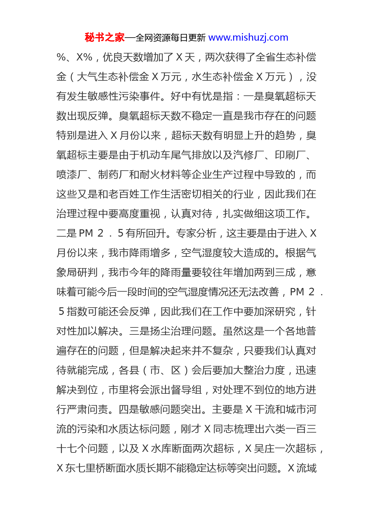 秘书之家—全网资源每日更新www.mishuzj.com在全市环境污染防治攻坚工作推进会上的讲话同志们:在全市上下坚持疫情防控常态化,统筹推进经济社会发展各项工作的紧要关口召开今天这次会议,是根据环境污染防治攻坚三年行动进入最后收官阶段的实际需要而召开的重要会议。刚才,我们一起观看了环境攻坚督察发现问题视频资料,中科院大气物理研究所研究员、博士生导师,X市“一市一策”跟踪研究负责人X同志对全市环境质量形势进行了深入分析,市场监管局、住建局、X县、X市分别作了很好的发言,其他县(市、区)和市直单位书面汇报也都印发给了大家,X同志对X年环境攻坚重点工作进行安排部署,讲得很具体、很到位,希望大家认真抓好贯彻落实。下面,就如何确保环境污染防治攻坚三年行动计划圆满收官,我再强调三点意见:一、肯定成绩,正视问题,认清形势,保持清醒,坚定打赢污染防治攻坚战的信心和决心通过刚才X同志对全年工作的回顾总结,有关部门的发言以及中科院X研究员的点评辅导,我对全年环保工作的总体感觉是“稳中向好,好中有忧”。稳中向好是指:我市PM2.5和PMX与去年同期相比,分别下降了X秘书之家—全网资源每日更新www.mishuzj.com%、X%,优良天数增加了X天,两次获得了全省生态补偿金(大气生态补偿金X万元,水生态补偿金X万元),没有发生敏感性污染事件。好中有忧是指:一是臭氧超标天数出现反弹。臭氧超标天数不稳定一直是我市存在的问题特别是进入X月份以来,超标天数有明显上升的趋势,臭氧超标主要是由于机动车尾气排放以及汽修厂、印刷厂、喷漆厂、制药厂和耐火材料等企业生产过程中导致的,而这些又是和老百姓工作生活密切相关的行业,因此我们在治理过程中要高度重视,认真对待,扎实做细这项工作。二是PM2.5有所回升。专家分析,这主要是由于进入X月份以来,我市降雨增多,空气湿度较大造成的。根据气象局研判,我市今年的降雨量要较往年增加两到三成,意味着可能今后一段时间的空气湿度情况还无法改善,PM2.5指数可能还会反弹,因此我们在工作中要加深研究,针对性加以解决。三是扬尘治理问题。虽然这是一个各地普遍存在的问题,但是解决起来并不复杂,只要我们认真对待就能完成,各县(市、区)会后要加大整治力度,迅速解决到位,市里将会派出督导组,对处理不到位的地方进行严肃问责。四是敏感问题突出。主要是X干流和城市河流的污染和水质达标问题,刚才X同志梳理出六类一百三十七个问题,以及X水库断面两次超标,X吴庄一次超标,X东七里桥断面水质长期不能稳定达标等突出问题。X流域秘书之家—全网资源每日更新www.mishuzj.com干支流的治理是X流域山水林田湖草系统治理的重要组成部分,尤其是在X流域生态保护和高质量发展上升为国家战略这个大背景下,我们工作中出现的个别问题很容易上升为敏感话题。二、聚焦重点,远近结合,坚决打好污染防治攻坚收官战刚才,X同志已经明确了今年的目标任务,对下一步工作提出了具体要求,希望大家认真对照抓好落实。近年来我市之所以出现诸多环保问题,归根结底是结构不合理造成的,主要包括产业结构、能源结构、交通运输结构和国土利用结构四个方面:一是产业结构不合理,我市是典型的资源型城市,资源粗加工产业占比较大,产品多以初加工、粗加工为主,技术水平偏低,造成高污染、高耗能、高排放问题突出,这是环境污染的源头所在。二是能源结构不合理,我市的能源消费结构中,煤炭占X%,清洁能源占X%,天然气仅占X%,能源结构不合理的问题非常突出。煤炭开采容易引起地下水污染、山体滑坡、土壤污染等环境污染问题,煤炭燃烧还会排放大量的烟尘、粉尘等,是造成大气污染的重要因素之一。三是运输结构不合理,目前在全市交通运输体系中,公路运输占X%以上,特别是X国道、X国道两条国家干道从我市穿境而过,X国道日通行量达到近X万辆,X国道达到X万辆,其中X%以上是大型货车,机动车尾气和道秘书之家—全网资源每日更新www.mishuzj.com路扬尘问题突出。四是国土利用结构不合理,虽然我市森林覆盖率达到X%,位居全省第X位,但森林资源大多数集中在X、X等深山区,中心城区(含X区)建成区绿地率X%;绿化覆盖率X%;公园绿地面积X公顷,人均公园绿地面积X平方米,在全省排名还不理想,并且城市绿地分布不均,主要集中在X公园、X公园等边缘地区,主城区绿地严重不足,对扬尘等污染因子的抑制有限。针对这些突出问题,下一步重点围绕“远近结合”这一工作思路,抓好三个方面工作:(一)大气污染防治方面,远抓结构调整,近抓精准管控。一方面,远抓结构调整。加快产业结构调整。要按照高质量发展要求,抓住新一轮科技革命和产业变革的历史机遇,抓紧发展新产业、新技术、新业态、新模式,持续在工业领域实施智能化改造、绿色化改造和企业技术改造“三大改造”,推动能源、原材料等传统产业技改升级,积极发展就业容量大、效益高、能耗低、排放少的旅游、电子商务、高成长性服务业,着力培育节能环保产业,为解决生态环境问题提供重要支撑。加快能源结构调整。要以削减煤炭消费总量和推进清洁能源替代工程为重点,加快推进“气化X”“电化X”,按照“宜气则气、宜电则电”的原则,加快推进集中供热供暖“双替代”,力争通过几年时间使我市清洁能源的使用比例明显