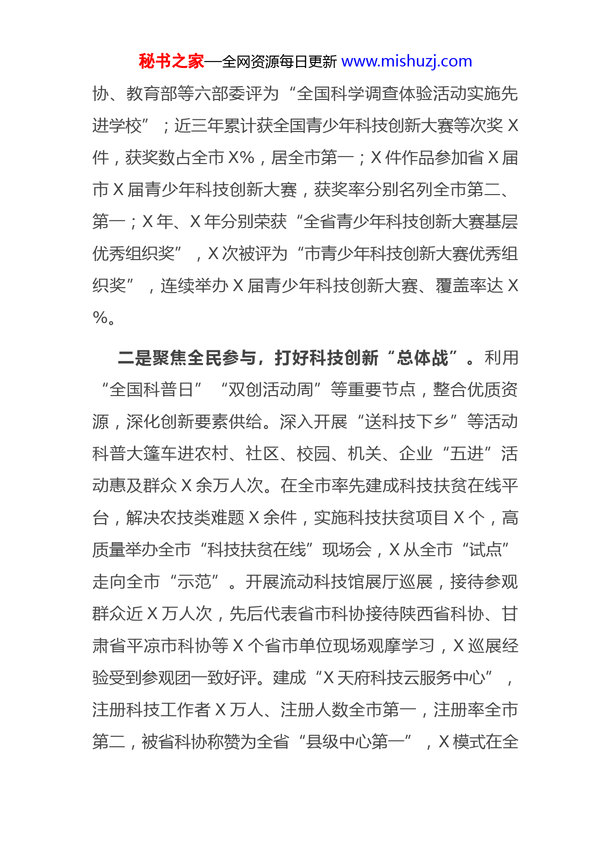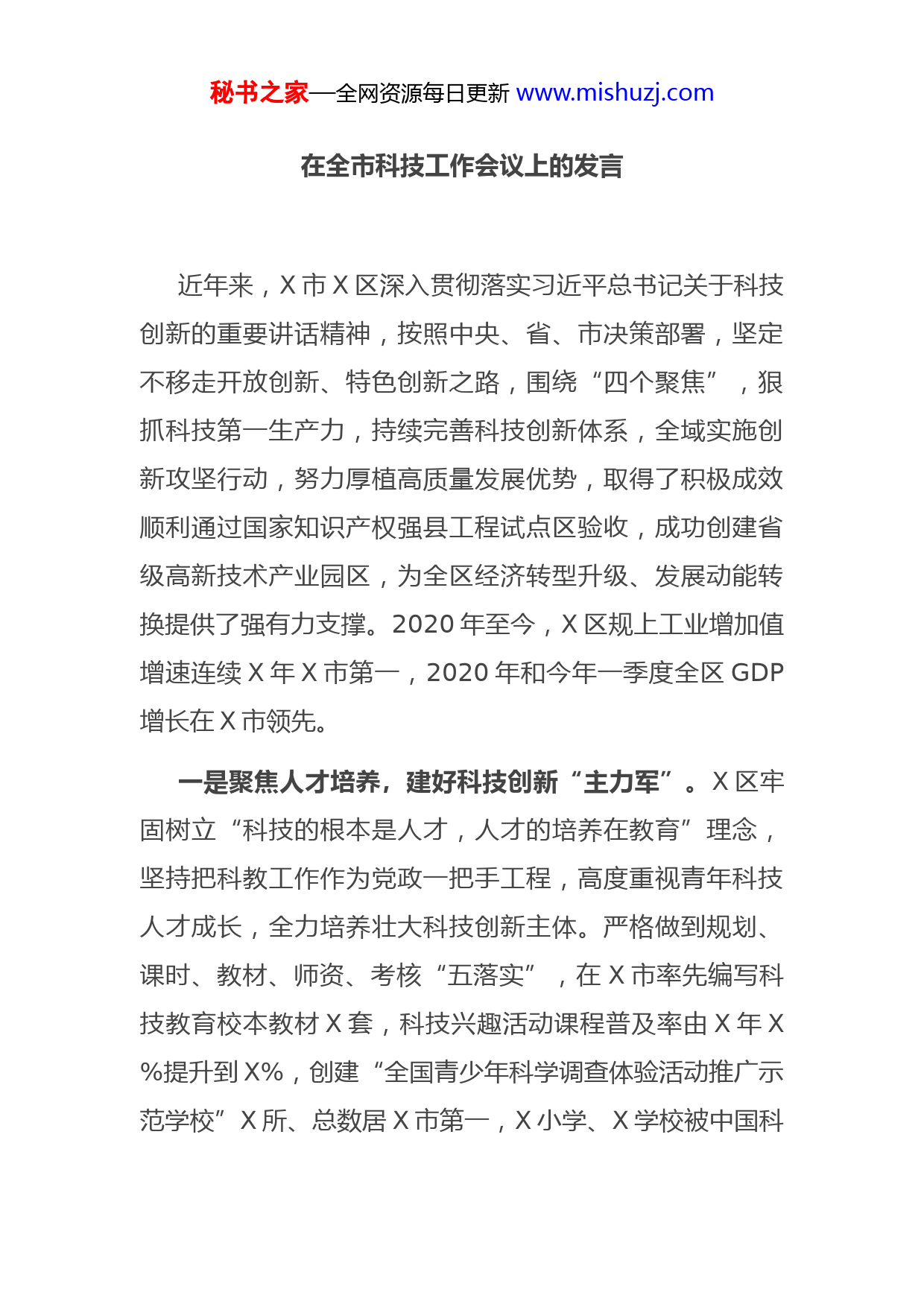 秘书之家—全网资源每日更新www.mishuzj.com在全市科技工作会议上的发言近年来,X市X区深入贯彻落实习近平总书记关于科技创新的重要讲话精神,按照中央、省、市决策部署,坚定不移走开放创新、特色创新之路,围绕“四个聚焦”,狠抓科技第一生产力,持续完善科技创新体系,全域实施创新攻坚行动,努力厚植高质量发展优势,取得了积极成效顺利通过国家知识产权强县工程试点区验收,成功创建省级高新技术产业园区,为全区经济转型升级、发展动能转换提供了强有力支撑。2020年至今,X区规上工业增加值增速连续X年X市第一,2020年和今年一季度全区GDP增长在X市领先。一是聚焦人才培养,建好科技创新“主力军”。X区牢固树立“科技的根本是人才,人才的培养在教育”理念,坚持把科教工作作为党政一把手工程,高度重视青年科技人才成长,全力培养壮大科技创新主体。严格做到规划、课时、教材、师资、考核“五落实”,在X市率先编写科技教育校本教材X套,科技兴趣活动课程普及率由X年X%提升到X%,创建“全国青少年科学调查体验活动推广示范学校”X所、总数居X市第一,X小学、X学校被中国科秘书之家—全网资源每日更新www.mishuzj.com协、教育部等六部委评为“全国科学调查体验活动实施先进学校”;近三年累计获全国青少年科技创新大赛等次奖X件,获奖数占全市X%,居全市第一;X件作品参加省X届市X届青少年科技创新大赛,获奖率分别名列全市第二、第一;X年、X年分别荣获“全省青少年科技创新大赛基层优秀组织奖”,X次被评为“市青少年科技创新大赛优秀组织奖”,连续举办X届青少年科技创新大赛、覆盖率达X%。二是聚焦全民参与,打好科技创新“总体战”。利用“全国科普日”“双创活动周”等重要节点,整合优质资源,深化创新要素供给。深入开展“送科技下乡”等活动科普大篷车进农村、社区、校园、机关、企业“五进”活动惠及群众X余万人次。在全市率先建成科技扶贫在线平台,解决农技类难题X余件,实施科技扶贫项目X个,高质量举办全市“科技扶贫在线”现场会,X从全市“试点”走向全市“示范”。开展流动科技馆展厅巡展,接待参观群众近X万人次,先后代表省市科协接待陕西省科协、甘肃省平凉市科协等X个省市单位现场观摩学习,X巡展经验受到参观团一致好评。建成“X天府科技云服务中心”,注册科技工作者X万人、注册人数全市第一,注册率全市第二,被省科协称赞为全省“县级中心第一”,X模式在全秘书之家—全网资源每日更新www.mishuzj.com省交流推广。高质量举办创客大赛X届,评选优秀项目X个,X个项目获省市奖项。累计申请专利X项,获得专利授权X项;2020年XX、X机械、X等企业实施专利转化项目X个,新增产值X亿元。三是聚焦区域协同,唱好科技创新“双城记”。坚持把科技创新作为融入×地区双城经济圈建设、打造×一体化引领区的重要抓手,抢抓承办×轴线区(市)县协同发展联盟×年年会机遇,强化区域交流合作。与×区、×县签订科技创新战略协议,达成科创大赛联办、科创品牌打造等×项合作事项,邀请×区科协观摩全区青少年科技创新大赛等活动赛事,荣获“×创×新”创业创新大赛×经济圈专项赛二等奖×个、×杯创新创业大赛等次奖×个。联合×等毗邻区县包装储备安潼未成年人关爱中心等“十四五”科创类项目×个、总投资×亿元,为推进科技创新×一体化发展打下了坚实的项目基础。四是聚焦平台建设,写好科技创新“大文章”。坚持小财政发展大科技,近三年累计投入科教经费×万元,年均增长达×%;累计整合各类项目资金×亿元,强化科创基础能力建设,建成×文化社科基地、×文化科普体验园、中国沼气科技博览园、“×”红薯科普示范园、三家大米稻渔研究院等科创基地×个。年度研发投入经费达到×万元、较上年秘书之家—全网资源每日更新www.mishuzj.com净增×万元;申报国家及省部级科技计划项目×项,获得经费支持×万元。突出企业创新主体作用,着力增强企业家创新意识,促成产学研合作项目×个,省级科技平台×家;建成省级科技孵化载体×家、市级以上研发机构×家、市级以上技术服务平台×家、院士工作站×个;培育国家高新技术企业×家。依托创新链,提升产业链,×省级高新区规模以上工业企业达到×家,实现产值×亿元。围绕“十四五”规划,精心谋划科技研发中心等“十四五”科技创新项目×个、总投资×亿元,加快构建“全域科创”大格局。下一步,×区将深入贯彻落实党的十九届五中全会精神、×省委×届×次全会精神、×市委×届×次全会精神,按照高位推动、领导抓、抓领导,上下联动、合力抓、抓合力创新驱动、结合抓、抓结合的思路,坚守初心厚植创新土壤,坚持恒心传承科技精神,坚定信心推进创新发展,全力建设×地区特色工业示范区和清洁能源示范基地、加快打造×一体化发展引领区,努力为×在×地区双城经济圈建设中实现中部崛起贡献×力量。