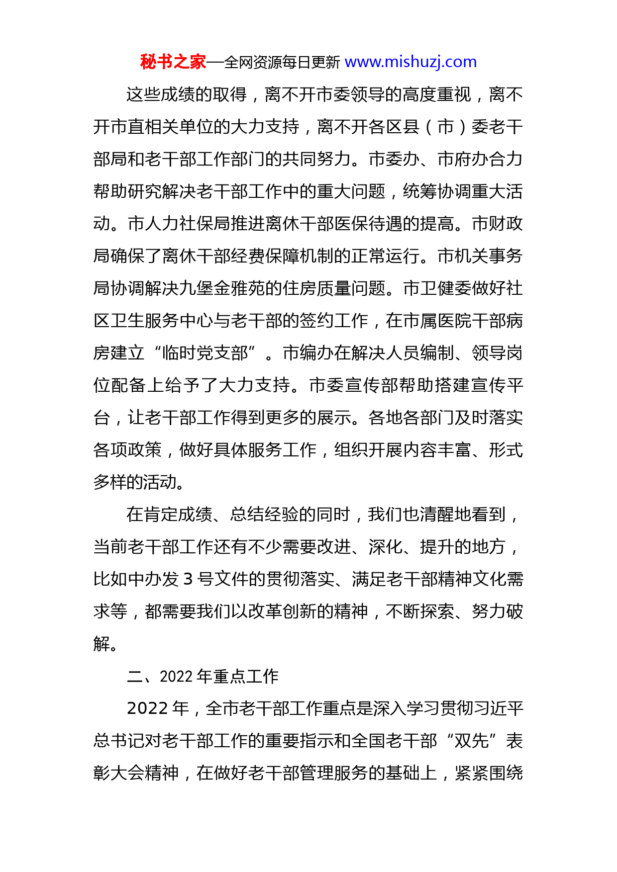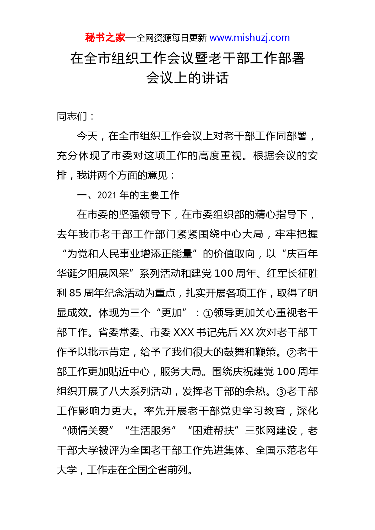 秘书之家—全网资源每日更新www.mishuzj.com在全市组织工作会议暨老干部工作部署会议上的讲话同志们:今天,在全市组织工作会议上对老干部工作同部署,充分体现了市委对这项工作的高度重视。根据会议的安排,我讲两个方面的意见:一、2021年的主要工作在市委的坚强领导下,在市委组织部的精心指导下,去年我市老干部工作部门紧紧围绕中心大局,牢牢把握“为党和人民事业增添正能量”的价值取向,以“庆百年华诞夕阳展风采”系列活动和建党100周年、红军长征胜利85周年纪念活动为重点,扎实开展各项工作,取得了明显成效。体现为三个“更加”:①领导更加关心重视老干部工作。省委常委、市委XXX书记先后XX次对老干部工作予以批示肯定,给予了我们很大的鼓舞和鞭策。②老干部工作更加贴近中心,服务大局。围绕庆祝建党100周年组织开展了八大系列活动,发挥老干部的余热。③老干部工作影响力更大。率先开展老干部党史学习教育,深化“倾情关爱”“生活服务”“困难帮扶”三张网建设,老干部大学被评为全国老干部工作先进集体、全国示范老年大学,工作走在全国全省前列。秘书之家—全网资源每日更新www.mishuzj.com这些成绩的取得,离不开市委领导的高度重视,离不开市直相关单位的大力支持,离不开各区县(市)委老干部局和老干部工作部门的共同努力。市委办、市府办合力帮助研究解决老干部工作中的重大问题,统筹协调重大活动。市人力社保局推进离休干部医保待遇的提高。市财政局确保了离休干部经费保障机制的正常运行。市机关事务局协调解决九堡金雅苑的住房质量问题。市卫健委做好社区卫生服务中心与老干部的签约工作,在市属医院干部病房建立“临时党支部”。市编办在解决人员编制、领导岗位配备上给予了大力支持。市委宣传部帮助搭建宣传平台,让老干部工作得到更多的展示。各地各部门及时落实各项政策,做好具体服务工作,组织开展内容丰富、形式多样的活动。在肯定成绩、总结经验的同时,我们也清醒地看到,当前老干部工作还有不少需要改进、深化、提升的地方,比如中办发3号文件的贯彻落实、满足老干部精神文化需求等,都需要我们以改革创新的精神,不断探索、努力破解。二、2022年重点工作2022年,全市老干部工作重点是深入学习贯彻习近平总书记对老干部工作的重要指示和全国老干部“双先”表彰大会精神,在做好老干部管理服务的基础上,紧紧围绕秘书之家—全网资源每日更新www.mishuzj.com迎接党的二十大胜利召开和助力XX加快城市国际化、建设世界名城,深化老干部正能量活动,为党和政府的中心大局工作添砖加瓦。主要体现为4个方面。一是围绕迎接党的二十大胜利召开,组织激励离退休干部持续释放正能量。根据全国“双先”表彰大会和全国老干部局长会议要求,今年将开展“畅谈十九大以来变化、展望二十大胜利召开”活动。我们要切实把活动谋划好、组织好,充分激发广大老同志强烈的爱党忧党、为党护党热情,为工作大局凝心聚力,为二十大胜利召开营造良好氛围。结合XX实际,我们将依托“走、看、促”“银色人才志愿活动”“五老讲师团”三个载体和活动中心、大学、疗休养三个阵地,设计系列活动,内容包括召开“老干部永远跟党走”系列座谈会、“建言二十大”专题调研、举办银色人才志愿行动现场推进会、组织老干部“二十大巡回宣讲”等。各地各部门要结合主题教育活动,根据实际选准重点,就近就便组织老同志参加活动,持续深化正能量品牌建设。二是深入学习贯彻党的十九届六中全会精神,进一步加强离退休干部“两项建设”。按照全面从严治党的要求,抓好离退休干部的思想引领。坚持与学习党的十九届六中全会、二十大以及市党代会精神结合起来,组织好老党员固定活动日、党史学习教育、“三会一课”。坚持与秘书之家—全网资源每日更新www.mishuzj.com深化临时党组织结合起来,做好老干部党校、活动中心、老干部大学、医院、疗养院的党组织建设和党员教育工作。坚持与老干部理论读书会、支部书记培训班等结合起来,抓好离退休干部党支部骨干队伍建设,提高“领头雁”的党建工作水平。坚持与老干部老党员社区“微心愿”认领、“银亮钱塘”志愿服务活动结合起来,组织离退休干部参与社区党的建设和志愿活动,发挥带头作用。三是遵循《意见》精神,用心抓好各项待遇和政策措施的落实。我们将组织一次全市贯彻落实3号文件的专项调研,出台我市贯彻落实3号文件的《实施意见》。各地各部门要做好自查工作,总结经验做法,找准工作短板,列出问题清单。要继续深化居家养老工作品牌建设,健全“四就近”服务平台,规范服务内容,完善评价体系;完善“三联一访”制度,加强与老干部居住社区的联系,动态掌握老干部实际情况。继续深化医疗待遇保障落实。进一步做好统一更换全市离休干部医疗证历本和提高解放战争时期参加工作的离休干部医疗待遇落实工作。继续深化离休干部困难帮扶服务。继续深化文化养老品牌建设。市级要进一步加强XX老干部大学、市老干部活动中心这两个阵地建设,老干部大学要以全国先进集体的荣誉为新起点,强化教学管理,更好地发挥辐射、示范作用。各区县(市)要针对老同志的文化精神需求与教育活动资源之间秘书之家—全