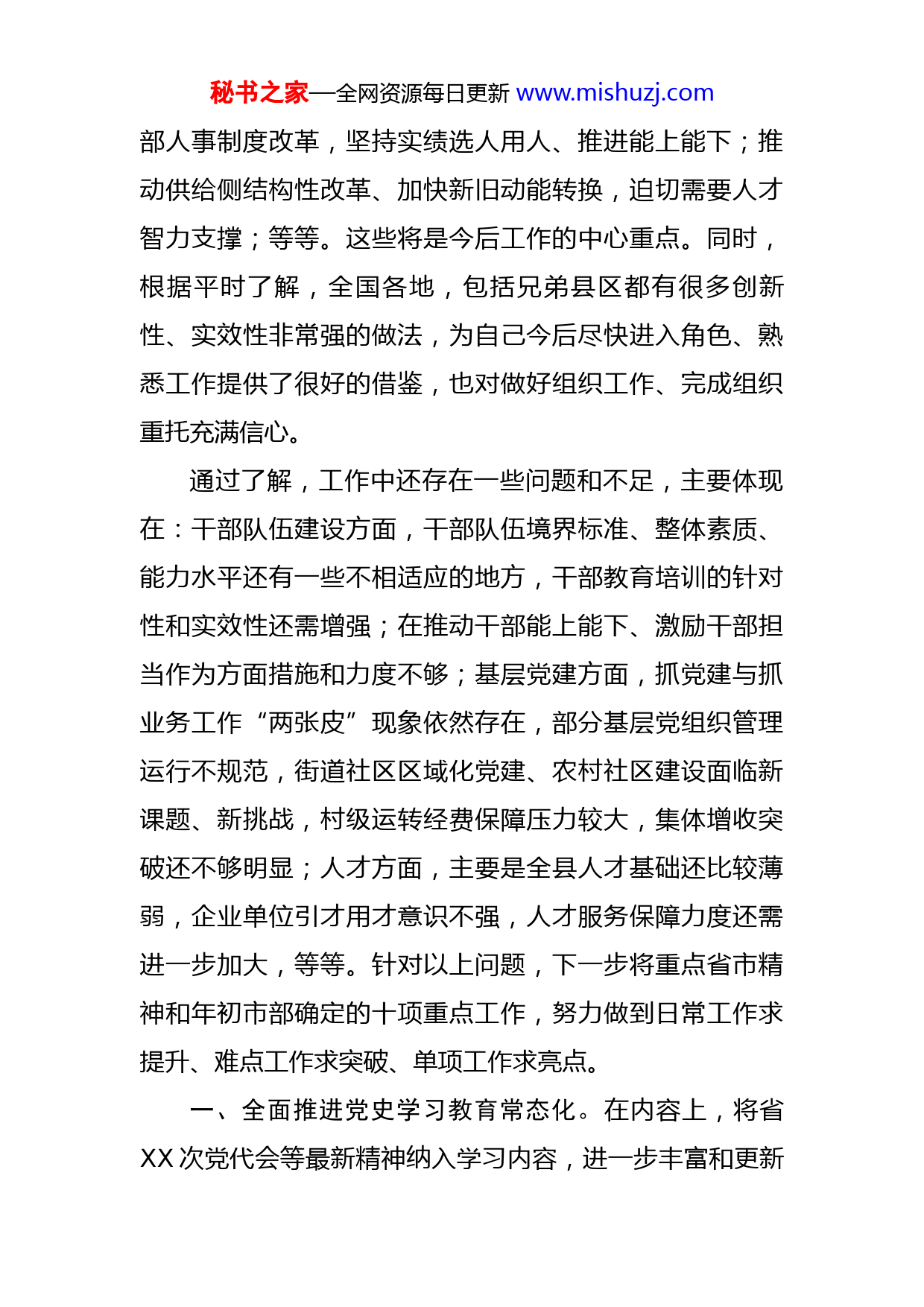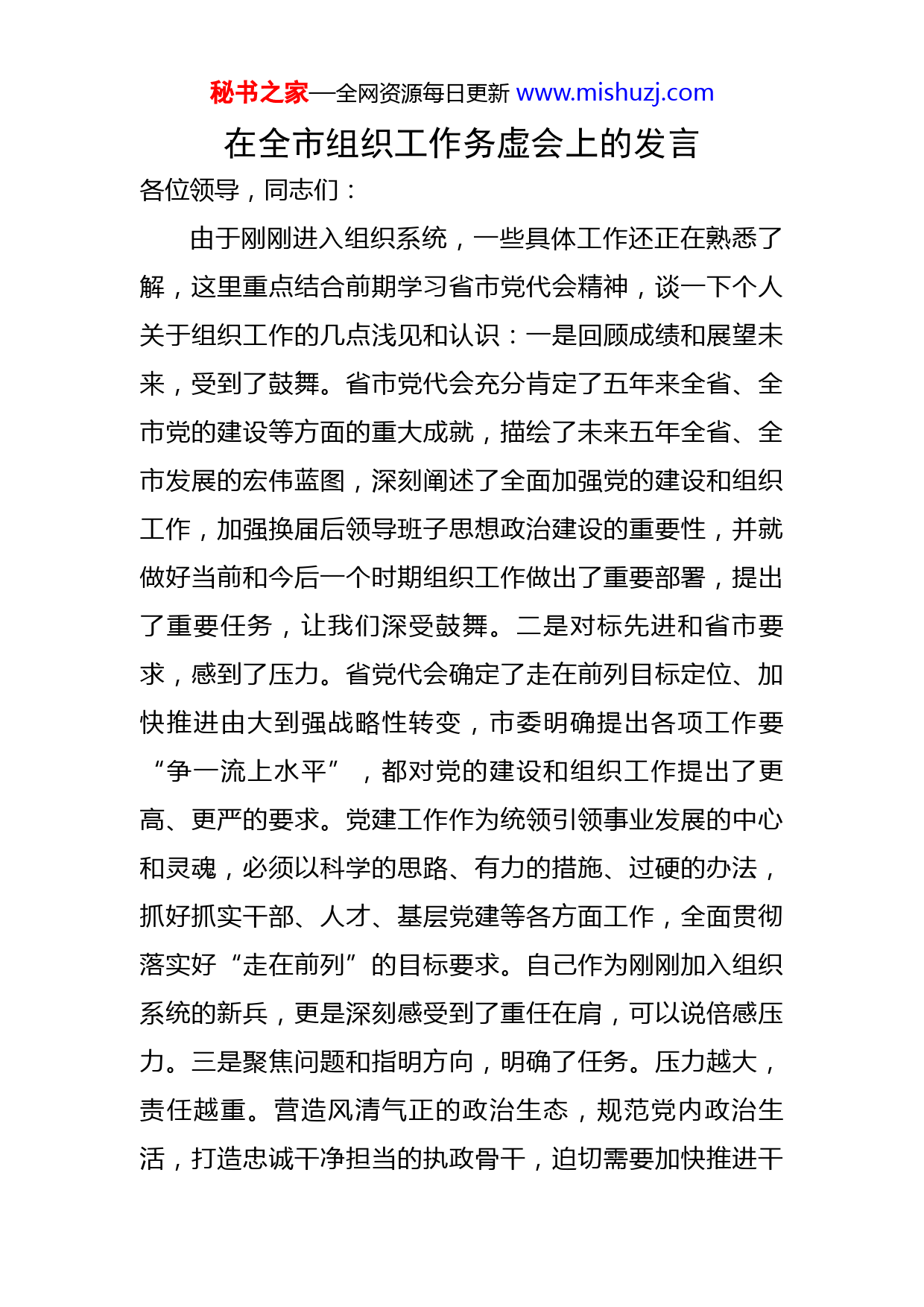 秘书之家—全网资源每日更新www.mishuzj.com在全市组织工作务虚会上的发言各位领导,同志们:由于刚刚进入组织系统,一些具体工作还正在熟悉了解,这里重点结合前期学习省市党代会精神,谈一下个人关于组织工作的几点浅见和认识:一是回顾成绩和展望未来,受到了鼓舞。省市党代会充分肯定了五年来全省、全市党的建设等方面的重大成就,描绘了未来五年全省、全市发展的宏伟蓝图,深刻阐述了全面加强党的建设和组织工作,加强换届后领导班子思想政治建设的重要性,并就做好当前和今后一个时期组织工作做出了重要部署,提出了重要任务,让我们深受鼓舞。二是对标先进和省市要求,感到了压力。省党代会确定了走在前列目标定位、加快推进由大到强战略性转变,市委明确提出各项工作要“争一流上水平”,都对党的建设和组织工作提出了更高、更严的要求。党建工作作为统领引领事业发展的中心和灵魂,必须以科学的思路、有力的措施、过硬的办法,抓好抓实干部、人才、基层党建等各方面工作,全面贯彻落实好“走在前列”的目标要求。自己作为刚刚加入组织系统的新兵,更是深刻感受到了重任在肩,可以说倍感压力。三是聚焦问题和指明方向,明确了任务。压力越大,责任越重。营造风清气正的政治生态,规范党内政治生活,打造忠诚干净担当的执政骨干,迫切需要加快推进干秘书之家—全网资源每日更新www.mishuzj.com部人事制度改革,坚持实绩选人用人、推进能上能下;推动供给侧结构性改革、加快新旧动能转换,迫切需要人才智力支撑;等等。这些将是今后工作的中心重点。同时,根据平时了解,全国各地,包括兄弟县区都有很多创新性、实效性非常强的做法,为自己今后尽快进入角色、熟悉工作提供了很好的借鉴,也对做好组织工作、完成组织重托充满信心。通过了解,工作中还存在一些问题和不足,主要体现在:干部队伍建设方面,干部队伍境界标准、整体素质、能力水平还有一些不相适应的地方,干部教育培训的针对性和实效性还需增强;在推动干部能上能下、激励干部担当作为方面措施和力度不够;基层党建方面,抓党建与抓业务工作“两张皮”现象依然存在,部分基层党组织管理运行不规范,街道社区区域化党建、农村社区建设面临新课题、新挑战,村级运转经费保障压力较大,集体增收突破还不够明显;人才方面,主要是全县人才基础还比较薄弱,企业单位引才用才意识不强,人才服务保障力度还需进一步加大,等等。针对以上问题,下一步将重点省市精神和年初市部确定的十项重点工作,努力做到日常工作求提升、难点工作求突破、单项工作求亮点。一、全面推进党史学习教育常态化。在内容上,将省XX次党代会等最新精神纳入学习内容,进一步丰富和更新秘书之家—全网资源每日更新www.mishuzj.com党性教育基地培训内容;全县统一配发村级组织规范化运行记录簿,强化痕迹管理,着力解决农村党组织开展记录不规范、内容难留存等问题。在形式上,推广部分镇办“夜间学习周”、“党建app实时监控党组织开展活动”等自选动作。开展“三亮三比”活动,落实党员挂牌、示范窗口、承诺践诺等动作,促党员作用发挥。在平台上,发挥党建频道、组工网站、微信公众号、党建手机报、《XX组工》“五位一体”党建宣传主阵地作用,开办《党史学习在身边》栏目,加大典型宣传力度;落实民主生活会整改落实“回头看”,以解决问题回应学习教育成效。在机制上,依托县级领导干部参加基层支部“主题党日”、领导干部到联系支部讲党课、县委宣讲团集中宣讲等方式,强化示范引领;加强督导检查,推动各级党组织和党员将学习教育不断引向深入。二、全面加强领导班子和领导干部队伍建设。经过换届后半年的磨合和适应,新的领导班子开始逐渐适应新的环境和岗位,今后重点在强化思想政治建设、突出实绩导向、加强日常了解、强化正向激励等方面下功夫,不断激励干部干事创业,展现新面貌、实现新作为。一是突出抓好换届后领导班子思想政治建设。结合县委“解放思想大讨论”系列活动,依托党性教育基地、XX大讲堂和各类主体培训班次,不断强化领导干部自我约束意识、规矩意秘书之家—全网资源每日更新www.mishuzj.com识,围绕“八破八立”深入开展8个专题研讨,着力提升领导干部履职能力和综合素质。二是突出实绩选人用人。创新建立领导干部干事创业实绩档案管理制度,年初明确目标立台账,季度实绩评议强落实,年终集中考核定等次。下一步,将加强实绩档案的管理和应用,起草《干部正向激励机制实施意见》,出台《XX县推进领导干部能上能下实施办法》,进一步激励干部积极作为、勇于担当。加强对挂职干部和新选派第一书记的监督考核,真正在一线发现、培养和使用干部;部班子成员在全县范围内普遍开展一轮谈心交流,深入了解换届后干部思想动态。三是突出日常监督管理。严格落实个人有关事项报告等制度,构建起管在平时、严在平时的常态化管理机制。深化巩固干部档案专项审核成果,下半年开展一次干部档案整体提升工作,保障数字化档案应用水平。三、推动基层组织建设全面过硬、全面进步。今年我们基层党建的总基调是在全面做好市委组织部确定的基层党建十项重点任务基础上,突出以“书记项目”抓责任落实、借“两委”换届