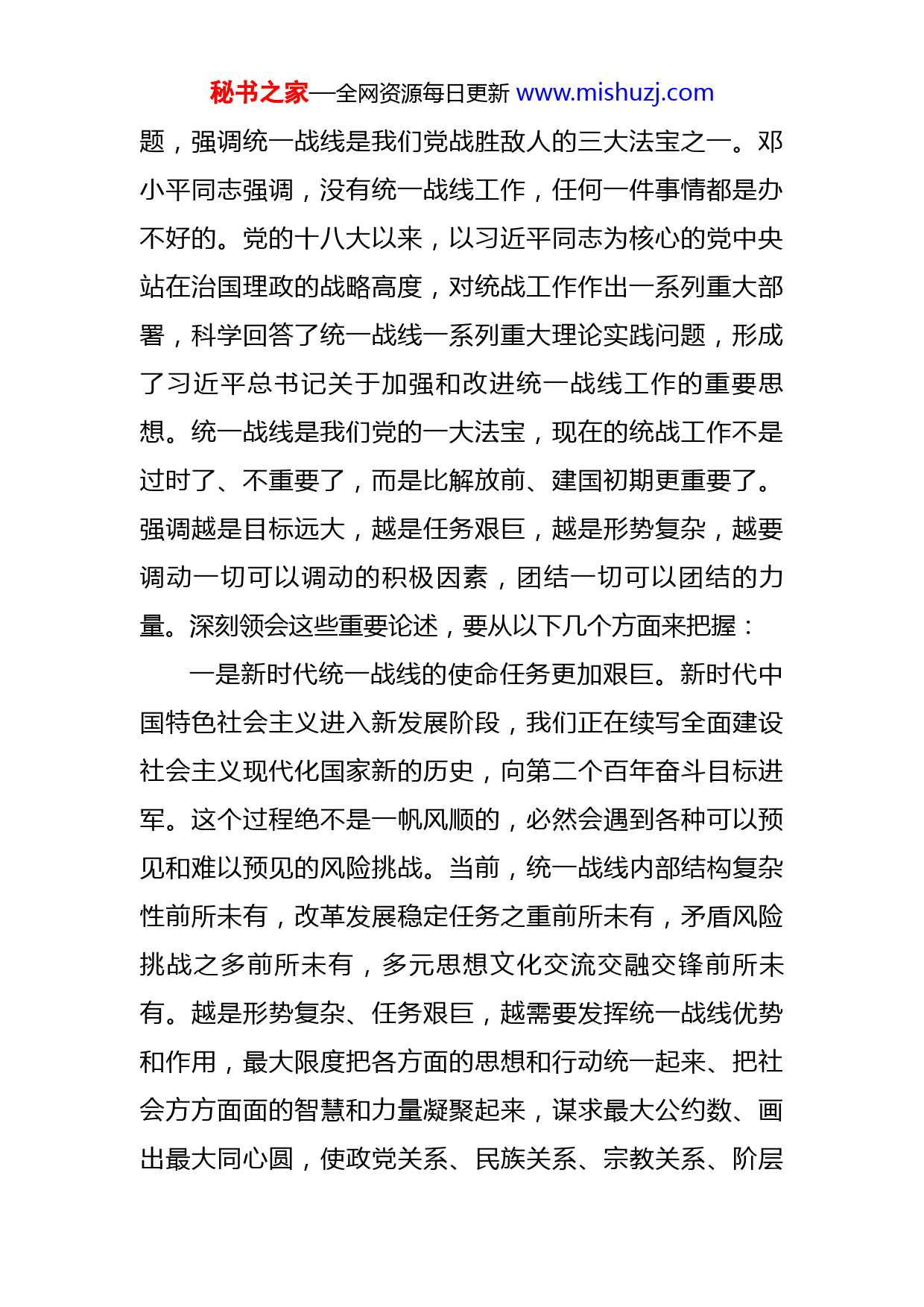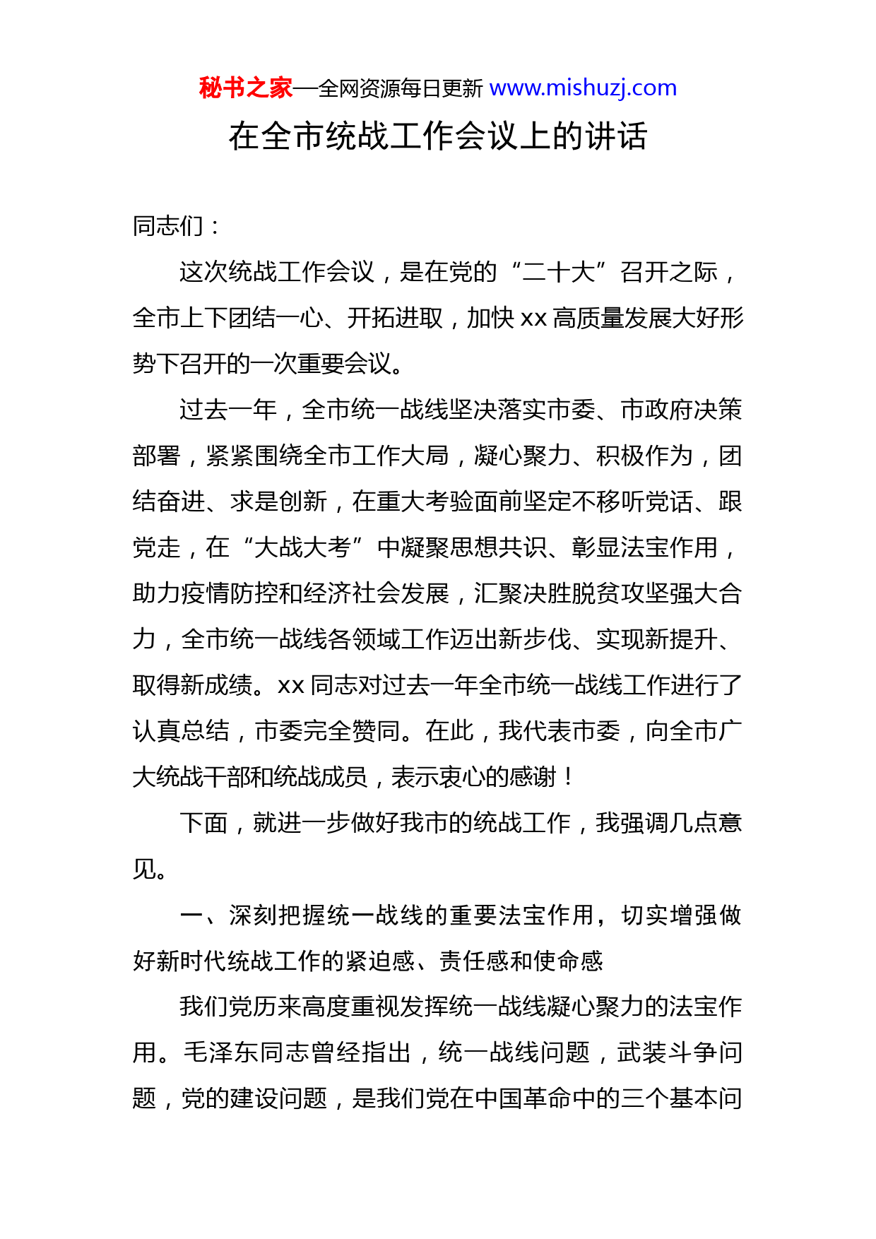 秘书之家—全网资源每日更新www.mishuzj.com在全市统战工作会议上的讲话同志们:这次统战工作会议,是在党的“二十大”召开之际,全市上下团结一心、开拓进取,加快xx高质量发展大好形势下召开的一次重要会议。过去一年,全市统一战线坚决落实市委、市政府决策部署,紧紧围绕全市工作大局,凝心聚力、积极作为,团结奋进、求是创新,在重大考验面前坚定不移听党话、跟党走,在“大战大考”中凝聚思想共识、彰显法宝作用,助力疫情防控和经济社会发展,汇聚决胜脱贫攻坚强大合力,全市统一战线各领域工作迈出新步伐、实现新提升、取得新成绩。xx同志对过去一年全市统一战线工作进行了认真总结,市委完全赞同。在此,我代表市委,向全市广大统战干部和统战成员,表示衷心的感谢!下面,就进一步做好我市的统战工作,我强调几点意见。一、深刻把握统一战线的重要法宝作用,切实增强做好新时代统战工作的紧迫感、责任感和使命感我们党历来高度重视发挥统一战线凝心聚力的法宝作用。毛泽东同志曾经指出,统一战线问题,武装斗争问题,党的建设问题,是我们党在中国革命中的三个基本问秘书之家—全网资源每日更新www.mishuzj.com题,强调统一战线是我们党战胜敌人的三大法宝之一。邓小平同志强调,没有统一战线工作,任何一件事情都是办不好的。党的十八大以来,以习近平同志为核心的党中央站在治国理政的战略高度,对统战工作作出一系列重大部署,科学回答了统一战线一系列重大理论实践问题,形成了习近平总书记关于加强和改进统一战线工作的重要思想。统一战线是我们党的一大法宝,现在的统战工作不是过时了、不重要了,而是比解放前、建国初期更重要了。强调越是目标远大,越是任务艰巨,越是形势复杂,越要调动一切可以调动的积极因素,团结一切可以团结的力量。深刻领会这些重要论述,要从以下几个方面来把握:一是新时代统一战线的使命任务更加艰巨。新时代中国特色社会主义进入新发展阶段,我们正在续写全面建设社会主义现代化国家新的历史,向第二个百年奋斗目标进军。这个过程绝不是一帆风顺的,必然会遇到各种可以预见和难以预见的风险挑战。当前,统一战线内部结构复杂性前所未有,改革发展稳定任务之重前所未有,矛盾风险挑战之多前所未有,多元思想文化交流交融交锋前所未有。越是形势复杂、任务艰巨,越需要发挥统一战线优势和作用,最大限度把各方面的思想和行动统一起来、把社会方方面面的智慧和力量凝聚起来,谋求最大公约数、画出最大同心圆,使政党关系、民族关系、宗教关系、阶层秘书之家—全网资源每日更新www.mishuzj.com关系、海内外同胞关系保持和谐稳定,努力防范和化解各类现实风险。二是新时代统战对象的结构变化更加复杂。新时代统一战线的社会基础更加广泛、工作领域更加宽广、工作内容更加丰富,呈现出空前的广泛性、巨大的包容性、鲜明的多样性和显著的社会性。过去统战对象普遍是从一而终的“单位人”,有组织有约束;现在很多是随遇而安的“社会人”,缺少组织约束,思想更加活跃多元。过去统战成员都是客观存在的“现实人”,看得见摸得着;现在很多统战成员是思想存在的“虚拟人”,底数和情况不易摸清掌握。过去党外代表人士都是知名人士,选树一个代表人士能管一二十年;现在一些代表人士是各领风骚一两年,通过“一根头发”带动“一把头发”的工作方式面临困难和挑战。过去老一辈党外人士和我们党风雨同舟一起走来,在血与火的斗争考验中深刻认识到中国共产党的伟大光荣正确,发自内心地听党话、跟着毛主席走社会主义道路;现在新一代党外代表人士生在新中国、成长在改革开放中、磨练在市场经济大潮里,认同中国共产党领导更多是基于对党执政成就的认同,有的参加统一战线还是出于个人利益考量,等等。这些都对做好新时代统战工作提出了新命题新挑战,迫切要求统战工作适应形势转变,创新方式方法,不断扩大覆盖面、增强包容性,切实把党秘书之家—全网资源每日更新www.mishuzj.com政、群团、社会组织等方方面面的资源力量充分调动起来,不断实现新时代的大团结大联合。总之,新时代的统一战线不是无足轻重,而是至关重要;统战工作决不是可有可无,而是必不可少。全市各级统战工作领导小组和统战部门要准确把握当前统战工作面临的新形势,深刻领会新时代统一战线的新要求新任务,自觉增强做好新时代统战工作的紧迫感责任感使命感,全面发挥新时代统一战线法宝作用,为推动xx高质量发展展现新作为,作出新贡献。二、坚持守正创新,不断开创新时代统战工作新局面不断推进统战工作守正创新,是立足统战工作面临的新形势新任务提出的重要要求。守正是坚持新时代统一战线工作正确政治方向的根本要求,而创新则是开创新时代统一战线工作新局面的必由之路。那么何为正?何为新?其实守正创新的源头应该是叫守正出奇,这个成语出自《孙子兵法》,“凡战者,以正合,以奇胜。故善出奇者,无穷如天地,不竭如江海。”“凡战者”就是善于打仗的人,“以正合”就是以“正”把基本面搞好;“以奇胜”就是出奇制胜。你要打胜仗,要追求稳重,要出正招;如果要真正取得胜利,就要出奇招。善出奇者是什么呢?就是他像天地一样无穷无尽,像江海一样滔滔不