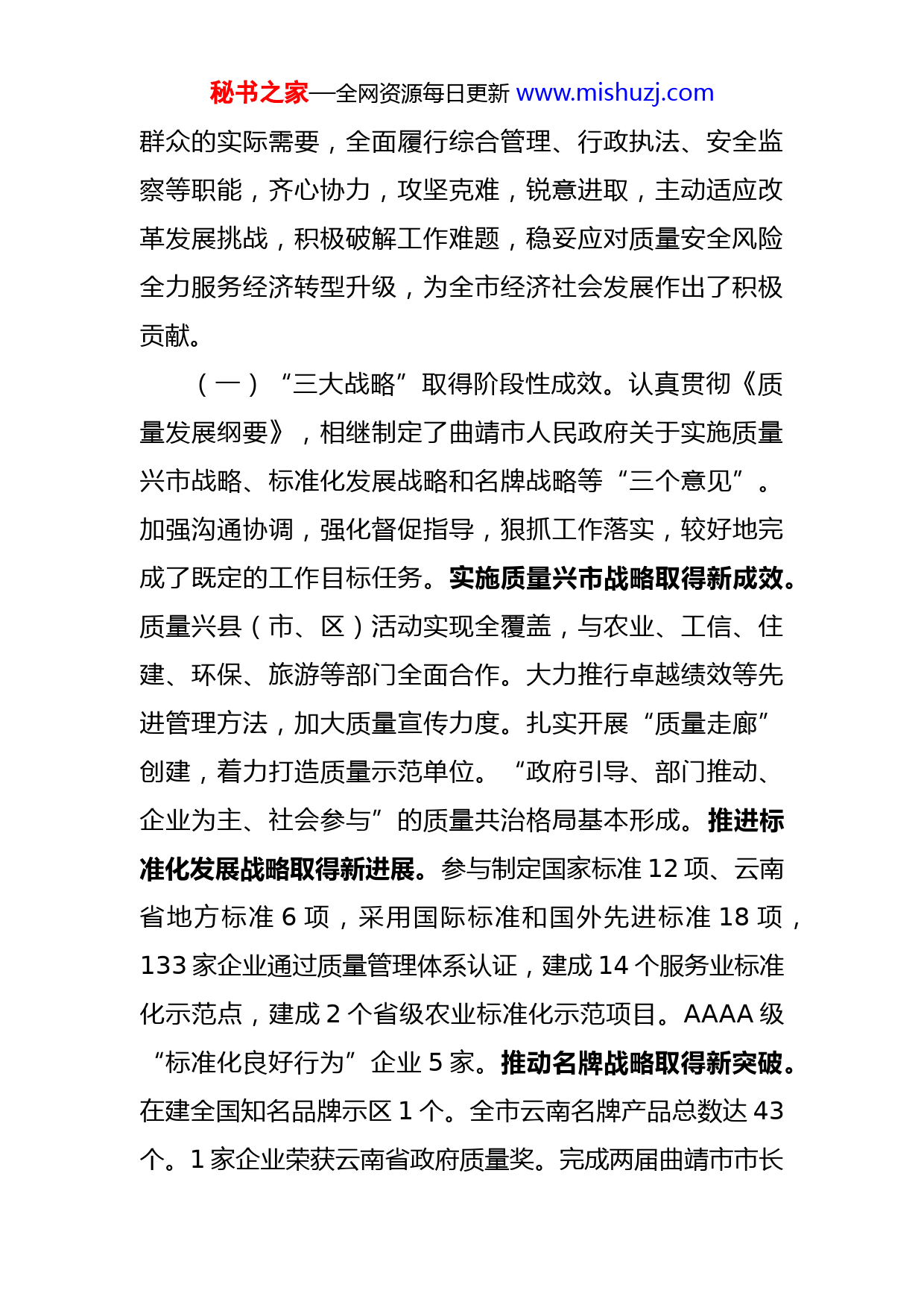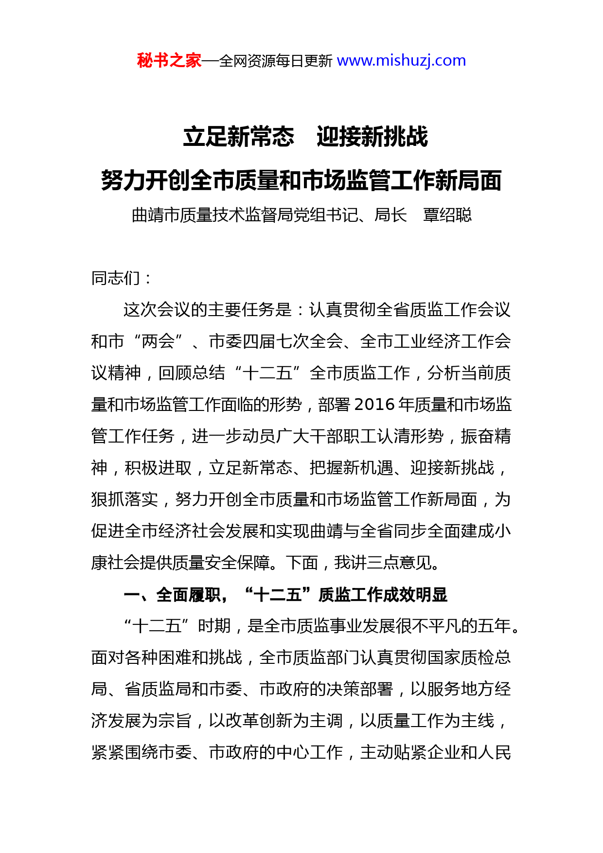 秘书之家—全网资源每日更新www.mishuzj.com立足新常态迎接新挑战努力开创全市质量和市场监管工作新局面曲靖市质量技术监督局党组书记、局长覃绍聪同志们:这次会议的主要任务是:认真贯彻全省质监工作会议和市“两会”、市委四届七次全会、全市工业经济工作会议精神,回顾总结“十二五”全市质监工作,分析当前质量和市场监管工作面临的形势,部署2016年质量和市场监管工作任务,进一步动员广大干部职工认清形势,振奋精神,积极进取,立足新常态、把握新机遇、迎接新挑战,狠抓落实,努力开创全市质量和市场监管工作新局面,为促进全市经济社会发展和实现曲靖与全省同步全面建成小康社会提供质量安全保障。下面,我讲三点意见。一、全面履职,“十二五”质监工作成效明显“十二五”时期,是全市质监事业发展很不平凡的五年。面对各种困难和挑战,全市质监部门认真贯彻国家质检总局、省质监局和市委、市政府的决策部署,以服务地方经济发展为宗旨,以改革创新为主调,以质量工作为主线,紧紧围绕市委、市政府的中心工作,主动贴紧企业和人民秘书之家—全网资源每日更新www.mishuzj.com群众的实际需要,全面履行综合管理、行政执法、安全监察等职能,齐心协力,攻坚克难,锐意进取,主动适应改革发展挑战,积极破解工作难题,稳妥应对质量安全风险全力服务经济转型升级,为全市经济社会发展作出了积极贡献。(一)“三大战略”取得阶段性成效。认真贯彻《质量发展纲要》,相继制定了曲靖市人民政府关于实施质量兴市战略、标准化发展战略和名牌战略等“三个意见”。加强沟通协调,强化督促指导,狠抓工作落实,较好地完成了既定的工作目标任务。实施质量兴市战略取得新成效。质量兴县(市、区)活动实现全覆盖,与农业、工信、住建、环保、旅游等部门全面合作。大力推行卓越绩效等先进管理方法,加大质量宣传力度。扎实开展“质量走廊”创建,着力打造质量示范单位。“政府引导、部门推动、企业为主、社会参与”的质量共治格局基本形成。推进标准化发展战略取得新进展。参与制定国家标准12项、云南省地方标准6项,采用国际标准和国外先进标准18项,133家企业通过质量管理体系认证,建成14个服务业标准化示范点,建成2个省级农业标准化示范项目。AAAA级“标准化良好行为”企业5家。推动名牌战略取得新突破。在建全国知名品牌示区1个。全市云南名牌产品总数达43个。1家企业荣获云南省政府质量奖。完成两届曲靖市市长秘书之家—全网资源每日更新www.mishuzj.com质量奖和两届曲靖名牌评选工作,8家企业获得市长质量奖和提名奖,曲靖名牌产品达20个。(二)质量监管、特种设备安全保障有力。深入开展“质量和安全年”、“质量提升”等活动,强化重要工业产品质量安全监管,以食品相关产品、日用消费品等为重点,加大监督抽查力度,加强质量安全风险预警监测,加大巡查力度,推进分类监管,全市产品质量总体水平呈现稳步提升态势。强化特种设备安全监察,针对重点环节、重点领域、重点场所、重要节日,扎实开展专项整治、“打非治违”、“六打六治”、隐患排查等专项行动,深入推进油气输送管道隐患整治攻坚战、电梯安全监管大会战和燃煤锅炉节能减排攻坚战,努力提升安全事故应急处置能力,建立完善安全监管长效机制,连续5年被评为安全生产先进单位。强化执法打假,以“双打”、“质检利剑行动”、专项整治为重点,立案查处各类违法案件2000多起,全市没有发生区域性、系统性、行业性质量安全事件。(三)质量基础工作逐步加强。认真贯彻落实国务院《计量发展规划(2013-2020年)》,加强能源计量管理,实施计量放心工程,加强对强检计量器具的监督管理,工业计量和民生计量不断推进。深入开展强制性产品和农产品认证管理,努力提升产品质量安全保障能力。秘书之家—全网资源每日更新www.mishuzj.com(四)服务企业,助推发展效果显现。积极推进简政放权,建成网上审批系统,完成权力清单和责任清单编制工作,严格执行小微企业收费优惠政策。制定并实施服务产业发展有效举措20条,深入开展“五帮”活动,进一步发挥职能作用,促进全市经济平稳健康发展。加强政务服务窗口建设,96128政务专线和12365举报处置指挥系统正常运转,广泛开展质量安全服务活动。(五)质监改革进一步深化。按时完成食品生产监管职能划转,顺利完成分级管理体制调整,配合做好县级工商、质监、食药监等部门的整合改革。主动配合做好“三证合一”、“一照一码”改革。加大统筹协调力度,强化行业监管责任,加强对基层局的指导、监督,及时研究解决体制调整后出现的新情况、新问题,努力保持质监工作的连续性、协调性和创新性。(六)自身建设进一步加强。认真落实全面从严治党要求,扎实开展创先争优、党的群众路线教育实践活动、“三严三实”和“忠诚干净担当”专题教育。认真落实党风廉政建设主体责任和监督责任,切实加大反腐倡廉力度持之以恒纠正“四风”。深入开展文明单位创建活动,积极推进扶贫工作,做好工青妇和离退休干部工作,加强信息化建设,为全市质监事业改革发展提供了有力保障。回顾五年来的质监工作,我们经历了不平凡的历程,秘书之家—全网资源每日更新www.mishuzj.com也取得了明显成绩,这是市委、市政府