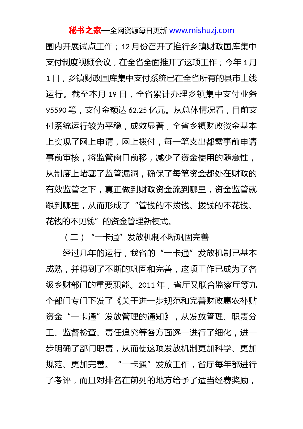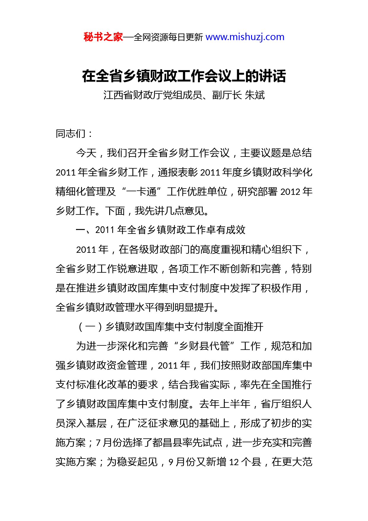 秘书之家—全网资源每日更新www.mishuzj.com在全省乡镇财政工作会议上的讲话江西省财政厅党组成员、副厅长朱斌同志们:今天,我们召开全省乡财工作会议,主要议题是总结2011年全省乡财工作,通报表彰2011年度乡镇财政科学化精细化管理及“一卡通”工作优胜单位,研究部署2012年乡财工作。下面,我先讲几点意见。一、2011年全省乡镇财政工作卓有成效2011年,在各级财政部门的高度重视和精心组织下,全省乡财工作锐意进取,各项工作不断创新和完善,特别是在推进乡镇财政国库集中支付制度中发挥了积极作用,全省乡镇财政管理水平得到明显提升。(一)乡镇财政国库集中支付制度全面推开为进一步深化和完善“乡财县代管”工作,规范和加强乡镇财政资金管理,2011年,我们按照财政部国库集中支付标准化改革的要求,结合我省实际,率先在全国推行了乡镇财政国库集中支付制度。去年上半年,省厅组织人员深入基层,在广泛征求意见的基础上,形成了初步的实施方案;7月份选择了都昌县率先试点,进一步充实和完善实施方案;为稳妥起见,9月份又新增12个县,在更大范秘书之家—全网资源每日更新www.mishuzj.com围内开展试点工作;12月份召开了推行乡镇财政国库集中支付制度视频会议,在全省全面推开了这项工作;今年1月1日,乡镇财政国库集中支付系统已在全省所有的县市上线运行。截至本月19日,全省累计办理乡镇集中支付业务95590笔,支付金额达62.25亿元。从总体情况看,目前支付系统运行较为平稳,成效显著,全省乡镇财政资金基本上实现了网上申请,网上拨付,每一笔支出都需事前申请事前审核,将监管窗口前移,减少了资金使用的随意性,从制度上堵塞了监管漏洞,确保了每笔资金都处在财政的有效监管之下,真正做到财政资金流到哪里,资金监管就跟到哪里,从而形成了“管钱的不拨钱、拨钱的不花钱、花钱的不见钱”的资金管理新模式。(二)“一卡通”发放机制不断巩固完善经过几年的运行,我省的“一卡通”发放机制已基本成熟,并得到了不断的巩固和完善,这项工作已成为了各级乡财部门的重要职能。2011年,省厅又联合监察厅等九个部门专门下发了《关于进一步规范和完善财政惠农补贴资金“一卡通”发放管理的通知》,从发放管理、职责分工、监督检查、责任追究等各方面逐一进行了细化,进一步明确了部门职责,从而使这项发放机制更加科学、更加规范、更加完善。“一卡通”发放工作,省厅每年都进行了考评,而且对排名在前列的地方给予了适当经费奖励,秘书之家—全网资源每日更新www.mishuzj.com刚才通报表彰了2011年度“一卡通”发放工作优胜单位。这个通报不仅表彰了排名前列的优胜单位,而且对全省11个设区市和100个县(市、区)进行了排名,且已抄送各级政府。各地对这项工作也高度重视,有的地方把“一卡通”发放工作作为落实国家强农惠农富农政策的重要举措纳入了政府效能考核的内容。现在大部分市、县比照省厅做法,建立了“一卡通”月报和年终考评制度,加大了督导和检查力度。2011年,全省通过“一卡通”发放的补贴项目达21大项,56小项,发放资金134亿元,资金发放率达92.4%,确保了惠农补贴资金及时足额发放到位。(三)乡镇财政“两基”建设成效显现乡镇财政“两基”建设是各级财政部门非常关注的一项工作。2010年底,胡强厅长在全省乡财工作会议上,提出用五年时间逐步推行乡镇财政所标准化建设,努力实现行为规范化、管理制度化、工作精细化、办公现代化的“五化”目标。从目前情况看,大部分地方结合当地实际和财力状况,逐步启动了这项工作,成效初步显现。峡江县在财力非常有限的情况下,专门安排资金对所有的乡镇财政所统一进行了新建或改造。浮梁县自2005年以来,不断加大对乡镇财政所基础设施建设力度,已新建和改建了9个乡镇财政所。樟树市给每个新建的乡镇财政所安排20万补助经费。2011年省厅又出台了《江西省乡镇财政科学化秘书之家—全网资源每日更新www.mishuzj.com精细化管理工作考核暂行办法》,从财务管理、资金监管基础管理和基层建设四个方面,通过细化、量化打分,科学考核评价,有效地指导和促进了各地开展“两基”建设工作。章贡区沙石镇、永修县柘林镇、上饶县湖村乡等乡镇把精细化管理同细化岗位责任有机结合,优化业务流程科学设置岗位,明确岗位职责,并制定和完善了专项资金管理、效能告诫、考核评价、过错追究等多项管理制度,使各岗位分工明确,各司其责,相互监督,实现了各工作环节的无缝对接,有力地提升了乡镇财政科学化精细化管理水平。(四)乡镇财政资金监管能力不断强化2011年,各级乡财部门充分发挥贴近基层、贴近农村的优势,在加强乡镇财政资金特别是涉农专项资金的监管方面做了大量工作。财政部去年5月份组织了全国乡镇财政资金监管工作连环套大检查。我省在这次检查中总分名列全国第一,财政部给予了高度赞扬,并在《情况反映》中全文刊登了我省乡镇财政资金监管的经验和做法。去年全省在涉农资金监管方面着重抓好了三个方面的工作。一是加强了制度建设。按照财政部的要求,各地在信息通达、公开公示、抽查巡查等方面,建立了信息联络员制度或定期会议通报制度,县级乡财部门确定了专人,具体负责政策资金信息收集和整理,并及时向下传递,乡镇财政所也秘