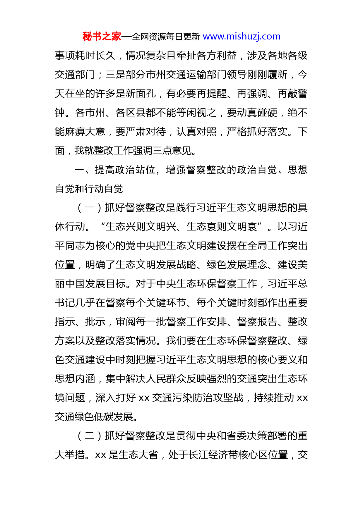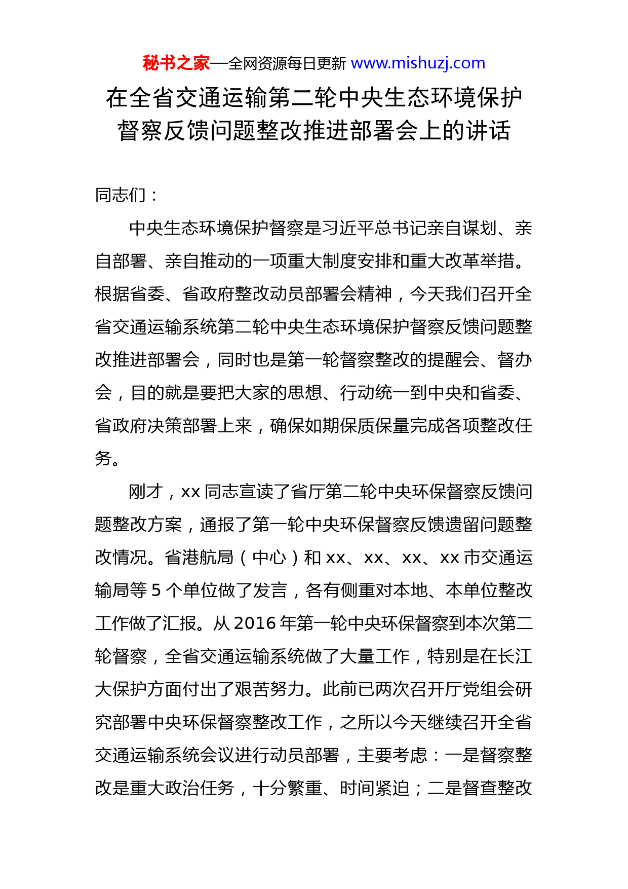 秘书之家—全网资源每日更新www.mishuzj.com在全省交通运输第二轮中央生态环境保护督察反馈问题整改推进部署会上的讲话同志们:中央生态环境保护督察是习近平总书记亲自谋划、亲自部署、亲自推动的一项重大制度安排和重大改革举措。根据省委、省政府整改动员部署会精神,今天我们召开全省交通运输系统第二轮中央生态环境保护督察反馈问题整改推进部署会,同时也是第一轮督察整改的提醒会、督办会,目的就是要把大家的思想、行动统一到中央和省委、省政府决策部署上来,确保如期保质保量完成各项整改任务。刚才,xx同志宣读了省厅第二轮中央环保督察反馈问题整改方案,通报了第一轮中央环保督察反馈遗留问题整改情况。省港航局(中心)和xx、xx、xx、xx市交通运输局等5个单位做了发言,各有侧重对本地、本单位整改工作做了汇报。从2016年第一轮中央环保督察到本次第二轮督察,全省交通运输系统做了大量工作,特别是在长江大保护方面付出了艰苦努力。此前已两次召开厅党组会研究部署中央环保督察整改工作,之所以今天继续召开全省交通运输系统会议进行动员部署,主要考虑:一是督察整改是重大政治任务,十分繁重、时间紧迫;二是督查整改秘书之家—全网资源每日更新www.mishuzj.com事项耗时长久,情况复杂且牵扯各方利益,涉及各地各级交通部门;三是部分市州交通运输部门领导刚刚履新,今天在坐的许多是新面孔,有必要再提醒、再强调、再敲警钟。各市州、各区县都不能等闲视之,要动真碰硬,绝不能麻痹大意,要严肃对待,认真对照,严格抓好落实。下面,我就整改工作强调三点意见。一、提高政治站位,增强督察整改的政治自觉、思想自觉和行动自觉(一)抓好督察整改是践行习近平生态文明思想的具体行动。“生态兴则文明兴、生态衰则文明衰”。以习近平同志为核心的党中央把生态文明建设摆在全局工作突出位置,明确了生态文明发展战略、绿色发展理念、建设美丽中国发展目标。对于中央生态环保督察工作,习近平总书记几乎在督察每个关键环节、每个关键时刻都作出重要指示、批示,审阅每一批督察工作安排、督察报告、整改方案以及整改落实情况。我们要在生态环保督察整改、绿色交通建设中时刻把握习近平生态文明思想的核心要义和思想内涵,集中解决人民群众反映强烈的交通突出生态环境问题,深入打好xx交通污染防治攻坚战,持续推动xx交通绿色低碳发展。(二)抓好督察整改是贯彻中央和省委决策部署的重大举措。xx是生态大省,处于长江经济带核心区位置,交秘书之家—全网资源每日更新www.mishuzj.com通枢纽地位突出,2013年、2018年习近平总书记两次视察xx,强调要正确把握”五个关系”,要将长江经济带建成生态文明建设先行示范带。此次中央生态环境保护督察报告在充分肯定我省生态环境保护工作近年来取得较大成效的同时,又实事求是地指出了我省生态环境保护工作中存在的问题和不足,并提出了针对性、指导性很强的整改意见。省委省政府高度重视督察整改工作,省委书记、省长亲任整改领导小组组长、实行双组长制,召开全省大会进行动员部署。全省交通系统要切实把环保督察交通事项整改作为重大政治任务、重大生态工程、重大惠民工程来抓。(三)抓好督察整改是全省交通运输系统肩负的历史责任。我们要正视xx交通九省通衢的区位优势和责任担当,以督察整改为着力点和切入口,不折不扣地推动长江大保护,有效提升交通精准防污治污水平,推进长江经济带交通运输高质量发展。省厅将强化督察整改统一领导,成立省厅督察整改工作专班。厅主要领导负总责,每项整改任务至少明确一名班子成员为第一责任人,厅机关相关处室、厅直业务单位主要负责人为具体负责人,指导督办各市州、区县交通运输局开展第二轮中央环保督察反馈问题整改工作,协同推进第一轮中央环保督察遗留问题整改。秘书之家—全网资源每日更新www.mishuzj.com各市州、区县交通运输局要对本地区交通问题整改工作负总责,一定要相应成立整改工作专班,明确责任领导和责任人员,定期督办,整改到位。二、坚持问题导向,确保督察整改工作责任压实、任务落实、取得实效(一)明确任务、清单管理。第二轮环保督察涉及交通整改事项6项;其中牵头事项1项,即船舶污染防治;责任事项5项,即提高长江大保护重视程度、磷石膏应用、化工园区认定、长江港口排污口溯源整治、修造船企业舾装码头岸线管理。此外,第一轮环保督察遗留整改事项2项,其中非法码头再清理再整治为牵头事项,xx自然保护区码头整治为责任事项。上述”6+2”整改事项是交通系统抓好整改的核心内容,须一并推进。目前,第一轮督察遗留事项正在持续整改。第二轮督察整改方案已报备并对外公布;在此基础上,省厅对第二轮督察6项整改任务一对一细化了整改措施,已印发各市州各单位具体贯彻实施。各市州、各单位要进一步梳理问题、对照落实,形成具体量化目标、问题清单、责任清单。(二)明确时限、加速办理。对照省委省政府确定的第二轮督察整改时间节点和第一轮督察整改时间要求,将涉及交通的”6+2”整改任务对号入座,具体办结时间要求秘书之家—全网资源每日更新www.mishuzj.com是:2022年10月底前完成xx自然保护区码头整治,2022年底前完成非法码头再清理再