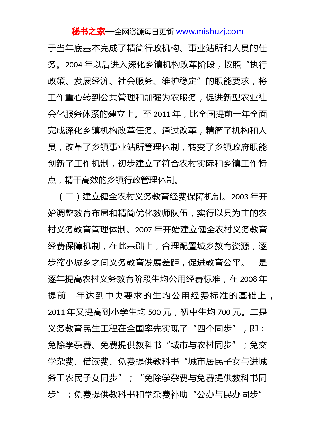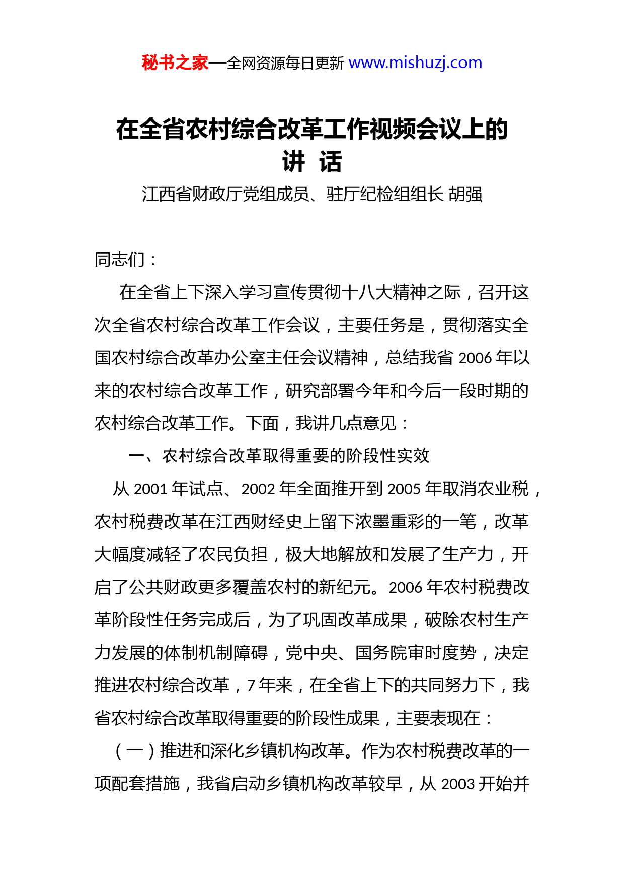 秘书之家—全网资源每日更新www.mishuzj.com在全省农村综合改革工作视频会议上的讲话江西省财政厅党组成员、驻厅纪检组组长胡强同志们:在全省上下深入学习宣传贯彻十八大精神之际,召开这次全省农村综合改革工作会议,主要任务是,贯彻落实全国农村综合改革办公室主任会议精神,总结我省2006年以来的农村综合改革工作,研究部署今年和今后一段时期的农村综合改革工作。下面,我讲几点意见:一、农村综合改革取得重要的阶段性实效从2001年试点、2002年全面推开到2005年取消农业税,农村税费改革在江西财经史上留下浓墨重彩的一笔,改革大幅度减轻了农民负担,极大地解放和发展了生产力,开启了公共财政更多覆盖农村的新纪元。2006年农村税费改革阶段性任务完成后,为了巩固改革成果,破除农村生产力发展的体制机制障碍,党中央、国务院审时度势,决定推进农村综合改革,7年来,在全省上下的共同努力下,我省农村综合改革取得重要的阶段性成果,主要表现在:(一)推进和深化乡镇机构改革。作为农村税费改革的一项配套措施,我省启动乡镇机构改革较早,从2003开始并秘书之家—全网资源每日更新www.mishuzj.com于当年底基本完成了精简行政机构、事业站所和人员的任务。2004年以后进入深化乡镇机构改革阶段,按照“执行政策、发展经济、社会服务、维护稳定”的职能要求,将工作重心转到公共管理和加强为农服务,促进新型农业社会化服务体系的建立上。至2011年,比全国提前一年全面完成深化乡镇机构改革任务。通过改革,精简了机构和人员,改革了乡镇事业站所管理体制,转变了乡镇政府职能创新了工作机制,初步建立了符合农村实际和乡镇工作特点,精干高效的乡镇行政管理体制。(二)建立健全农村义务教育经费保障机制。2003年开始调整教育布局和精简优化教师队伍,实行以县为主的农村义务教育管理体制。2007年开始建立健全农村义务教育经费保障机制,在此基础上,合理配置城乡教育资源,逐步缩小城乡之间义务教育发展差距,促进教育公平。一是逐年提高农村义务教育阶段生均公用经费标准,在2008年提前一年达到中央要求的生均公用经费标准的基础上,2011年又提高到小学生均500元,初中生均700元。二是义务教育民生工程在全国率先实现了“四个同步”,即:免除学杂费、免费提供教科书“城市与农村同步”;免交学杂费、借读费、免费提供教科书“城市居民子女与进城务工农民子女同步”;“免除学杂费与免费提供教科书同步”;免费提供教科书和学杂费补助“公办与民办同步”秘书之家—全网资源每日更新www.mishuzj.com三是建立了农村中小学校舍维修改造长效机制,支持校舍及其附属设施的日常维修、大修改造和抗震加固。四是按照不低于本地公务员的标准安排义务教育教师的绩效工资对财政困难县(市、区)义务教育绩效工资增加补助,对边远山区的教师实行特殊津贴。(三)完善县乡财政管理体制。围绕“夯实基层财力,增强保障能力”的总体要求,不断深化改革,完善县乡财政体制。一是坚持“缺口上移,财力下移”和“四个倾斜”的原则,不断完善省以下财政体制机制,大力实施公共财政政策和民生工程,加大对基层的转移支付力度,加强县乡基本财力保障,推进基本公共服务均等化。二是积极推进“省直管县”和“乡财县代管”改革试点,逐步扩大试点范围。到2008年“乡财县代管”改革覆盖所有乡镇,到2009年“省直管县”改革范围扩大到全省所有80个行政建制的县市,同时加快“村账乡代理”步伐,全面构建了县乡财政管理体制新模式。三是2012年率先在全国全面推进乡镇国库集中支付。通过改革,夯实了基层财力,进一步增强了县乡财政保障能力和活力,规范了乡镇行政行为和支出管理,管住了乡镇乱花钱、乱收费、乱举债。据统计县级财力占全省的比重从2003年的57.1%,提高到2011年的64.8%。(四)开展鄱阳湖区农民负担综合改革。自2007年底开秘书之家—全网资源每日更新www.mishuzj.com始,我省积极推进减轻鄱阳湖区12个县的农民负担综合改革,解决湖区农民负担重的问题。一是深化县乡水管体制改革,精简机构和人员;二是分清政府和农民的责任,建立鄱阳湖区堤防维护和排渍排涝费用的分担机制;三是清理和规范收费。全面取消“堤防费”、“共同生产费”、“排灌费”等专门针对湖区农民的收费。为此省财政每年安排1.81亿元,在税改减负的基础上,再为湖区农民人均减负41元。(五)深化国有农场税费改革。2007年开始我省全面推进深化国有农场税费改革,至2009年底基本完成。一是全面免除农工承担的包括“类似三提五统”在内的土地承包费;二是推行“两田制”改革;三是分离农场办社会职能四是保障农场基本运转。省财政每年安排5亿元支持深化国有农村税费改革,人均综合减负403元,亩均减负208元。通过改革,减轻了企业和农工负担,逐步形成了农场职工基本养老保险的正常缴费机制,有力地促进了农场的和谐稳定和经济发展。(六)全面完成清理化解农村义务教育债务任务。自2007年底开始,我省稳步推进农村义务教育债务的清理化解工作,至2009年底用两年时间,圆满完成了债务化解任务,全省共偿还农村义务教育债务41亿元,惠及债权人9.3万人。为支持地方化债,省财政安排补助资金24.35亿元。秘书之家—全网资源每日更新www.mishuzj.com农村义务教