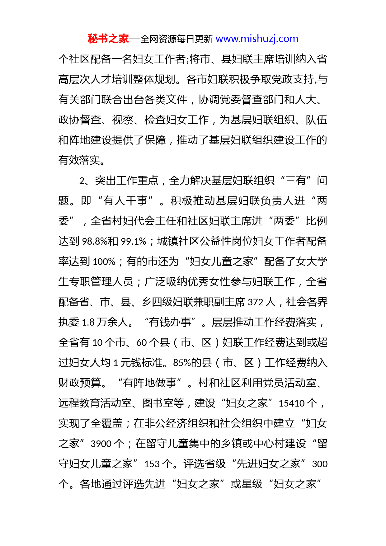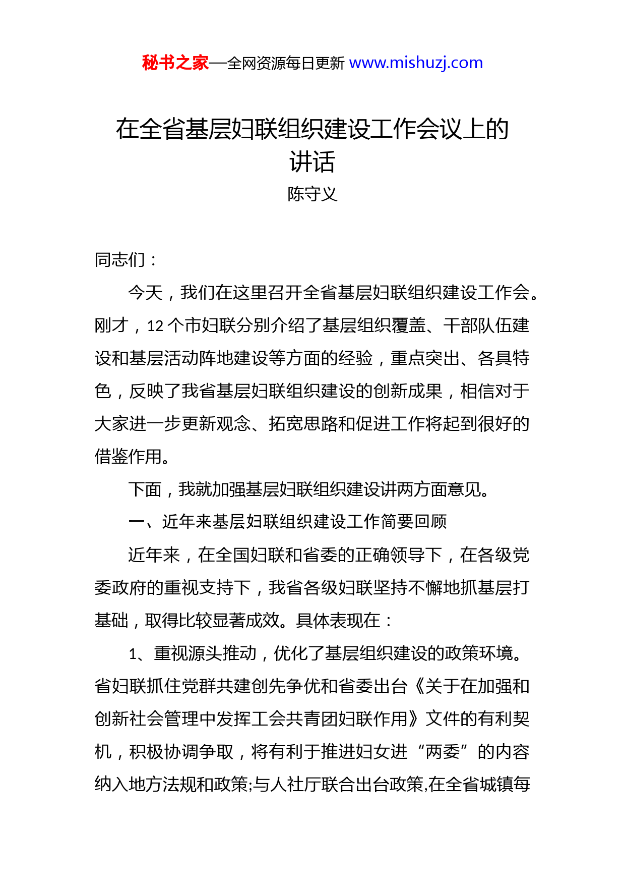 秘书之家—全网资源每日更新www.mishuzj.com在全省基层妇联组织建设工作会议上的讲话陈守义同志们:今天,我们在这里召开全省基层妇联组织建设工作会。刚才,12个市妇联分别介绍了基层组织覆盖、干部队伍建设和基层活动阵地建设等方面的经验,重点突出、各具特色,反映了我省基层妇联组织建设的创新成果,相信对于大家进一步更新观念、拓宽思路和促进工作将起到很好的借鉴作用。下面,我就加强基层妇联组织建设讲两方面意见。一、近年来基层妇联组织建设工作简要回顾近年来,在全国妇联和省委的正确领导下,在各级党委政府的重视支持下,我省各级妇联坚持不懈地抓基层打基础,取得比较显著成效。具体表现在:1、重视源头推动,优化了基层组织建设的政策环境。省妇联抓住党群共建创先争优和省委出台《关于在加强和创新社会管理中发挥工会共青团妇联作用》文件的有利契机,积极协调争取,将有利于推进妇女进“两委”的内容纳入地方法规和政策;与人社厅联合出台政策,在全省城镇每秘书之家—全网资源每日更新www.mishuzj.com个社区配备一名妇女工作者;将市、县妇联主席培训纳入省高层次人才培训整体规划。各市妇联积极争取党政支持,与有关部门联合出台各类文件,协调党委督查部门和人大、政协督查、视察、检查妇女工作,为基层妇联组织、队伍和阵地建设提供了保障,推动了基层妇联组织建设工作的有效落实。2、突出工作重点,全力解决基层妇联组织“三有”问题。即“有人干事”。积极推动基层妇联负责人进“两委”,全省村妇代会主任和社区妇联主席进“两委”比例达到98.8%和99.1%;城镇社区公益性岗位妇女工作者配备率达到100%;有的市还为“妇女儿童之家”配备了女大学生专职管理人员;广泛吸纳优秀女性参与妇联工作,全省配备省、市、县、乡四级妇联兼职副主席372人,社会各界执委1.8万余人。“有钱办事”。层层推动工作经费落实,全省有10个市、60个县(市、区)妇联工作经费达到或超过妇女人均1元钱标准。85%的县(市、区)工作经费纳入财政预算。“有阵地做事”。村和社区利用党员活动室、远程教育活动室、图书室等,建设“妇女之家”15410个,实现了全覆盖;在非公经济组织和社会组织中建立“妇女之家”3900个;在留守儿童集中的乡镇或中心村建设“留守妇女儿童之家”153个。评选省级“先进妇女之家”300个。各地通过评选先进“妇女之家”或星级“妇女之家”秘书之家—全网资源每日更新www.mishuzj.com等方式,推动“妇女之家”提档升级。3、扩大基层组织覆盖,注重提升服务能力。传统领域基层组织不断巩固,全省乡镇、街道、村、社区妇联组织组建率100%。县以上机关、事业单位妇委会建设得到长足发展,建立妇委会2796个;非公经济组织和社会组织妇女组织建设初见成效,灵活建立妇女组织7926个。积极创新工作方式,省妇联通过设计国策宣传进家、基层干部培训、妇女实用技能培训、“两癌”救助、“妇女儿童之家”、“共享蓝天﹒共筑和谐”特困儿童关爱等多个项目和开展寻找“最美家庭”活动,下拨经费,实现资金、资源向基层倾斜。各市、县(市、区)妇联积极选优树强,为乡镇街道妇联和先进“妇女之家”配备计算机、音响等办公和活动设备,为基层妇联更好地服务妇女儿童创造条件。通过省级示范培训、市级重点培训、县级普遍培训以及参观考察、送教基层和以会代训等多种形式,实现基层妇联干部全员培训目标,有效提升了基层妇联干部服务大局、服务妇女群众的能力。以上成绩的取得,是各级党委政府高度重视、大力支持的结果,是各级妇联组织上下联动、同心协力的结果,是各级妇联干部奋力争取、辛勤工作的结果。在肯定成绩的同时,我们也要清醒地看到,基层妇联组织建设还存在不容忽视的问题。一是基层妇联组织建设秘书之家—全网资源每日更新www.mishuzj.com有待加强。非公经济组织和社会组织、农村经济合作组织等领域妇女组织覆盖率不高;多数乡镇、街道、村、社区妇联和机关及事业单位妇女组织不能按时、按程序换届,基层妇联领导机构不健全。二是基层妇联干部素质需要进一步提高。存在“等靠要”思想和角色意识不强、职责不清、业务不熟、情况不明等问题;乡镇、街道妇联主席编制混杂、兼职过多,投入妇女工作的时间和精力不足,对村、社区妇女工作检查指导不到位;一些村、社区妇联干部习惯各项工作一把抓,妇联工作埋没其中,妇女群众感受不到妇联组织的存在;部分妇代会主任待遇偏低,影响了她们工作的积极性。三是基层妇联阵地建设薄弱。存在重建、轻管、使用率偏低问题,工作特色不突出,发动群众不广泛,吸引力和影响力不够强。四是基层妇联工作经费缺乏机制保障,存在投入不足,经费短缺问题。五是有的市、县(市、区)妇联对基层妇联组织建设重视不够,缺少谋划、指导、检查和必要的支持与帮助。我们必须强化问题意识,坚持问题导向,认真查找原因,积极寻找对策,锲而不舍地去研究和突破这些问题。习近平总书记在中央党的群团工作会议上强调,要切实保持和增强党的群团工作和群团组织的政治性先进性群众性。新形势下,党的群团工作只能加强,不能削弱,只能改进提高,不能停滞不前。习总书记在同全国妇联新一秘书之家—全网资源每日更新www.mishuzj.com